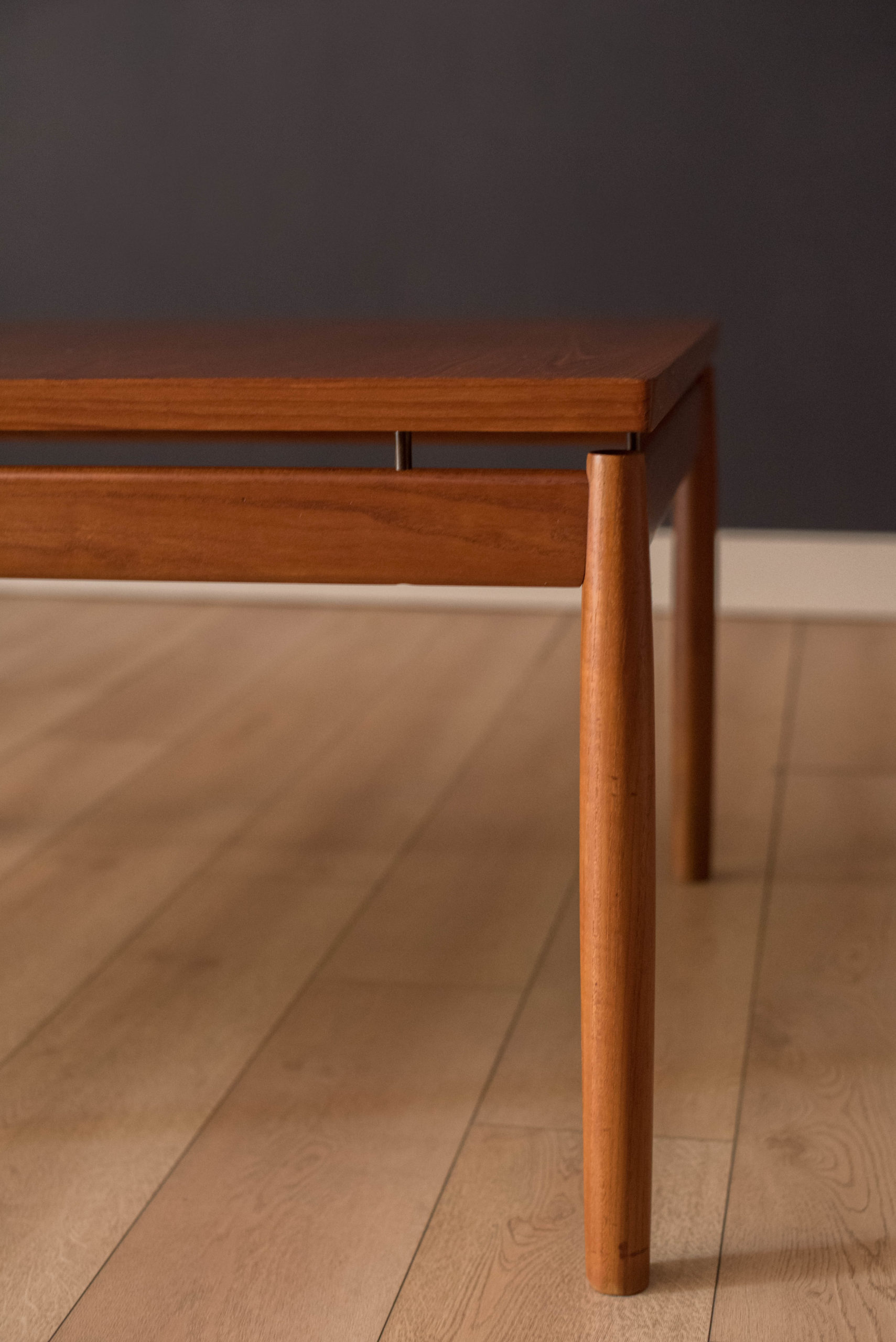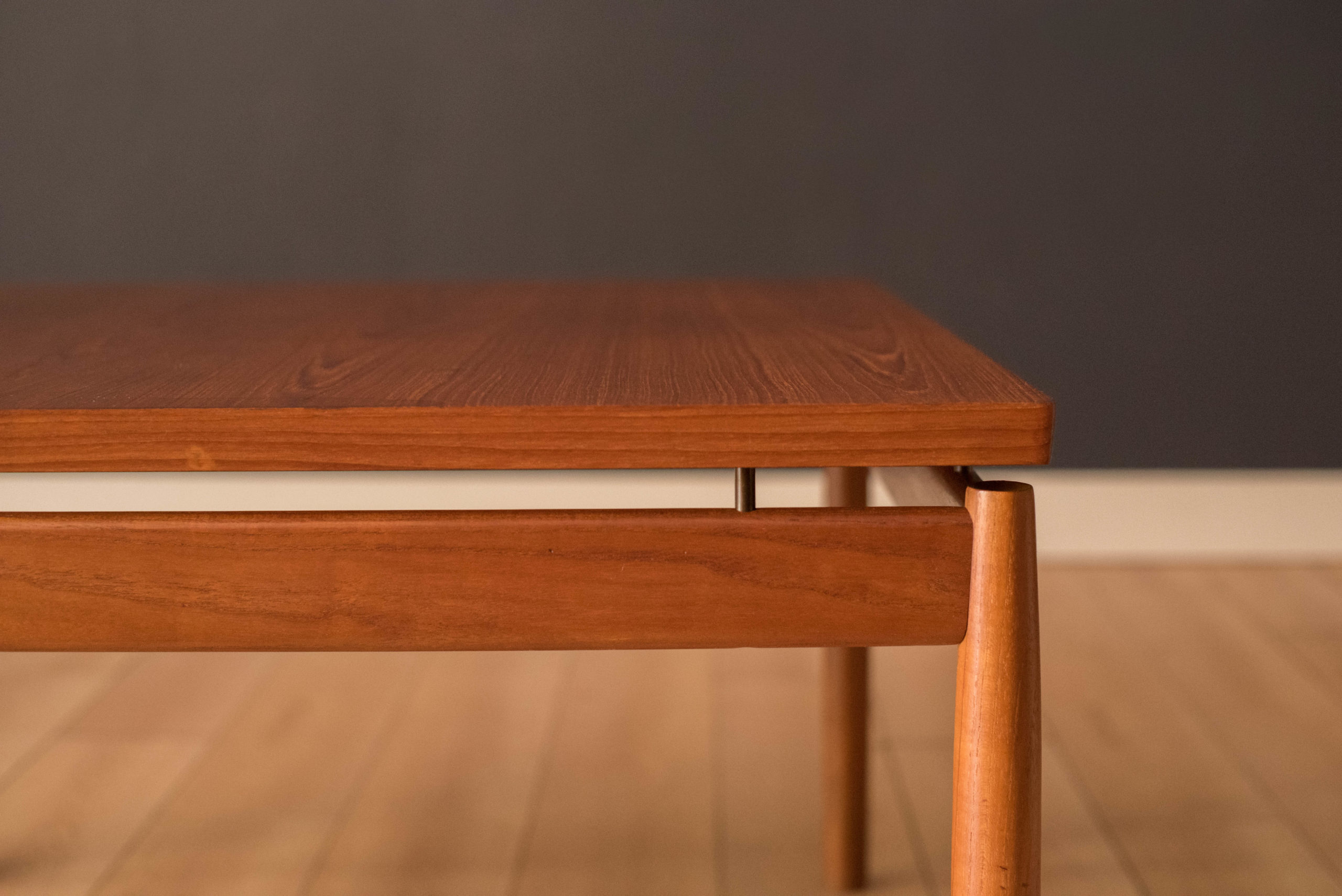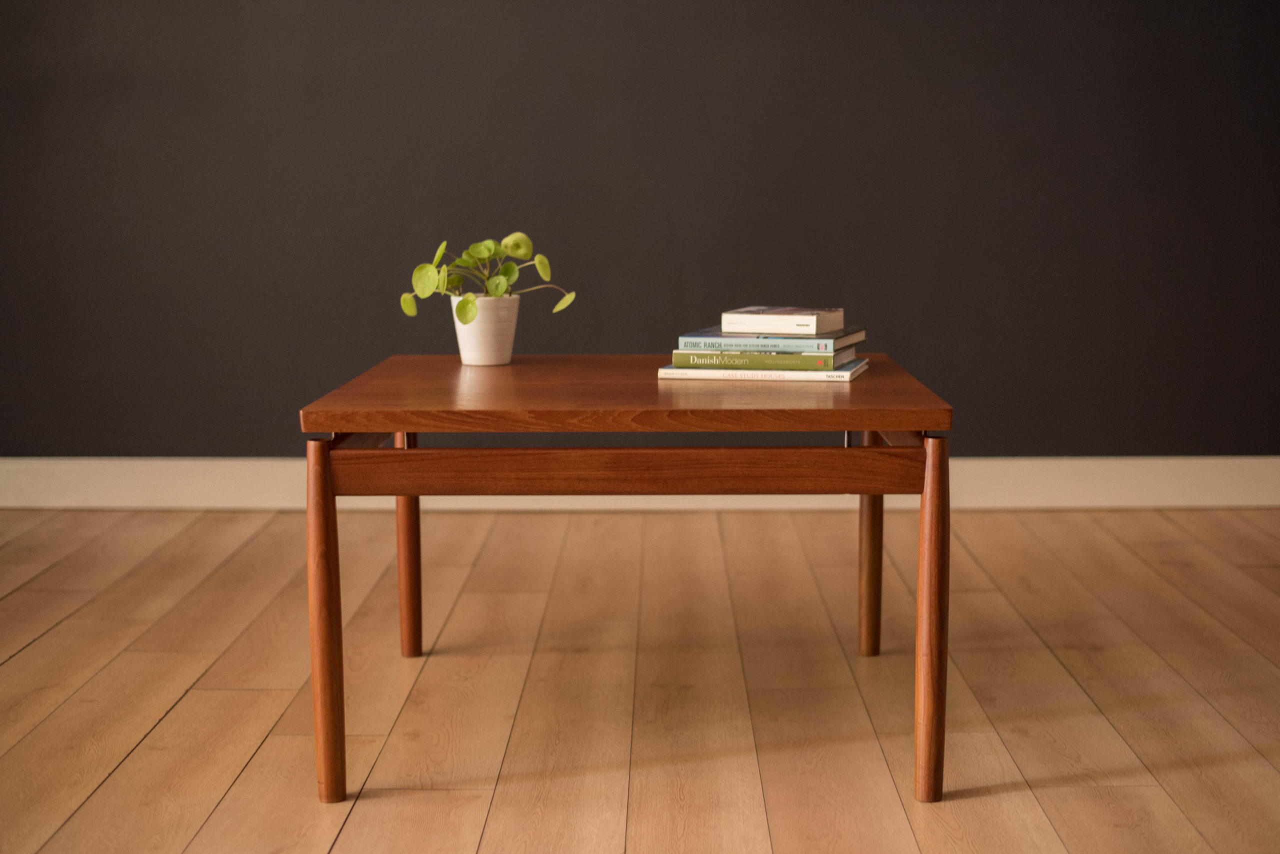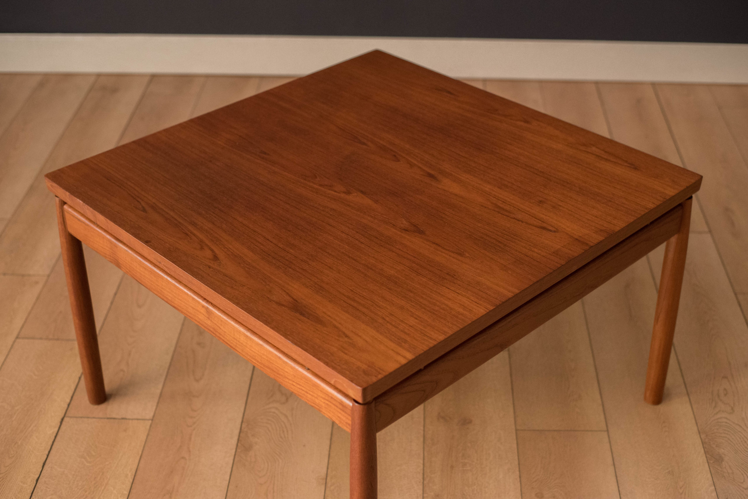 Mid century modern square coffee table designed by Grete Jalk for France & Daverkosen in teak. This timeless piece features brass accents and functions as a coffee table, occasional table, or sectional sofa end table.