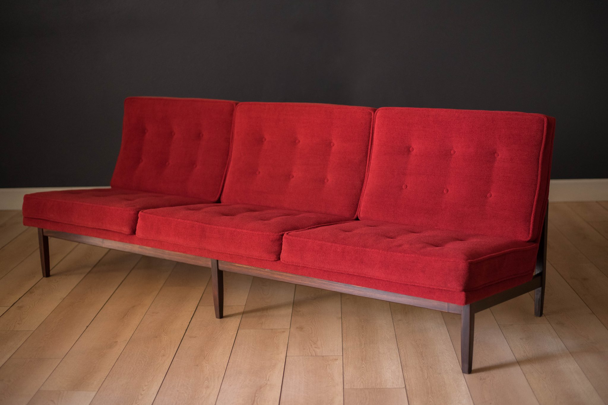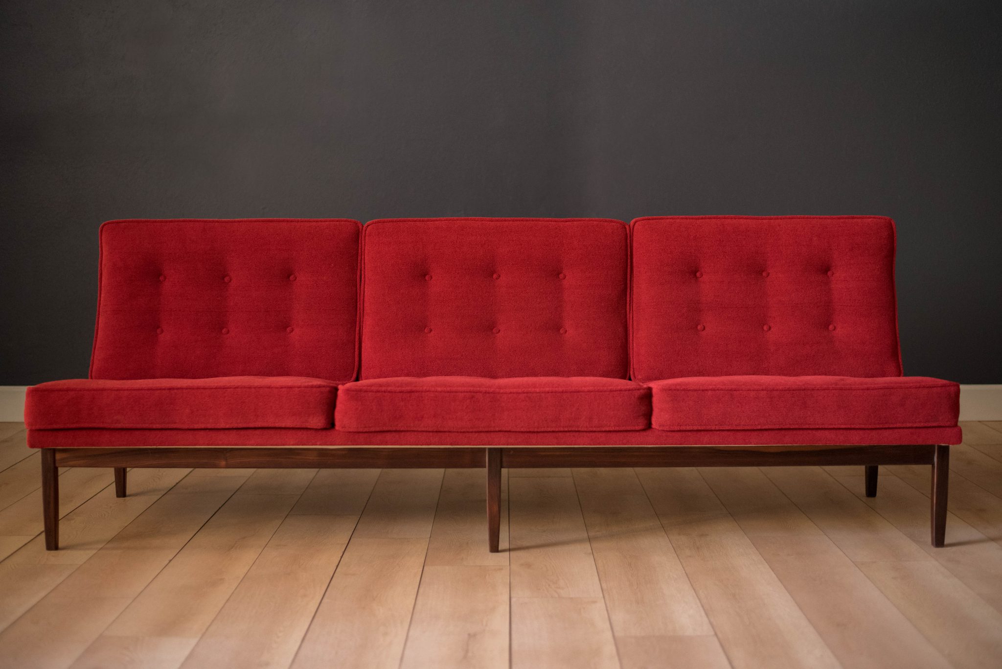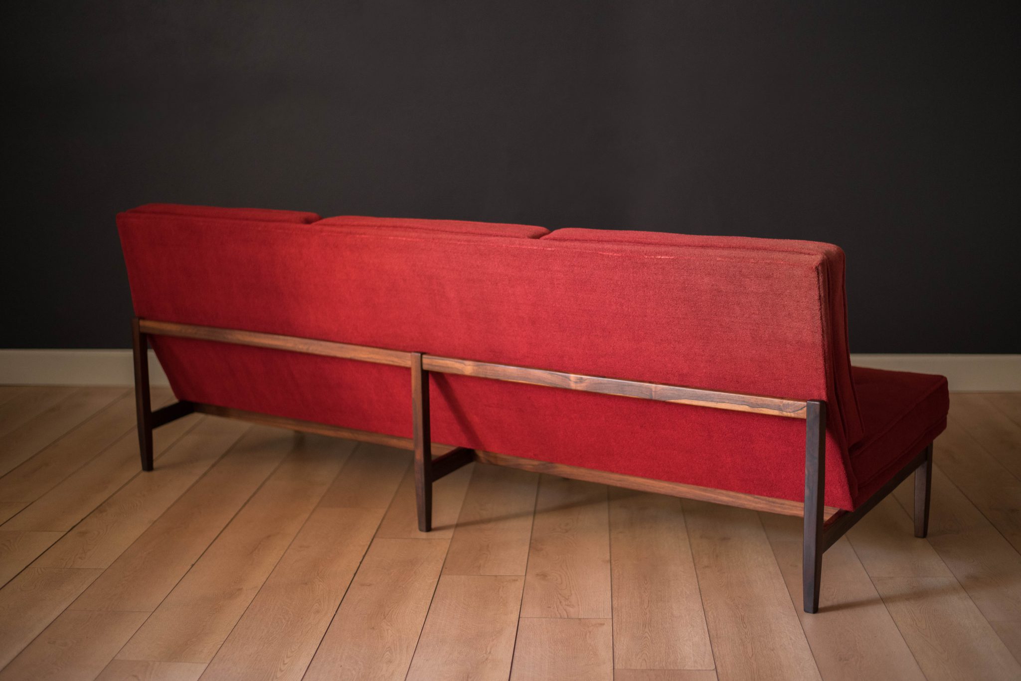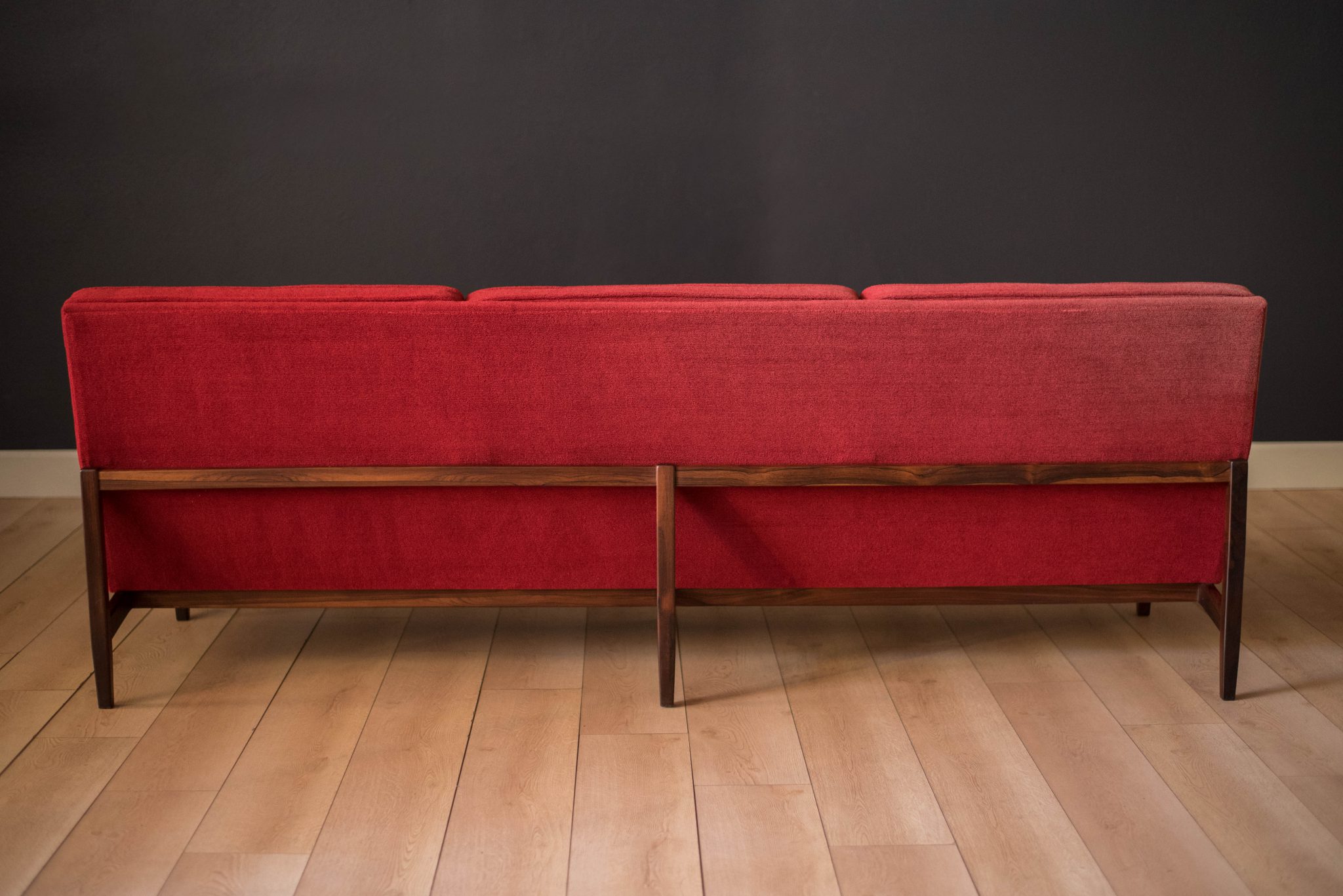 Mid-Century Modern sofa by Florence Knoll for Knoll, model 2553 RW. This piece was designed with a custom rosewood frame and original red crimson textile fabric. Seat cushions are supported by springs built to last and are hand sewn to the upholstered frame.