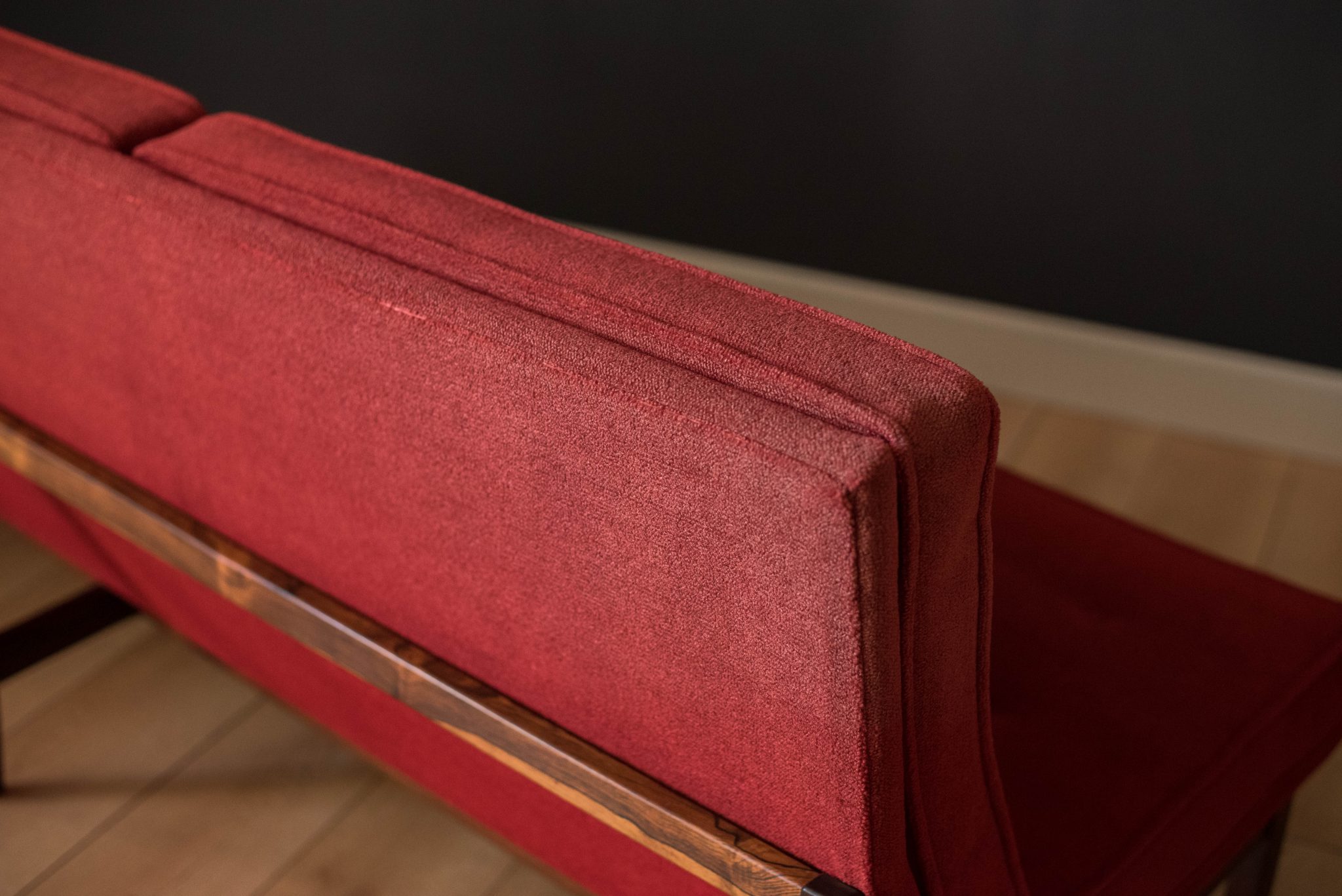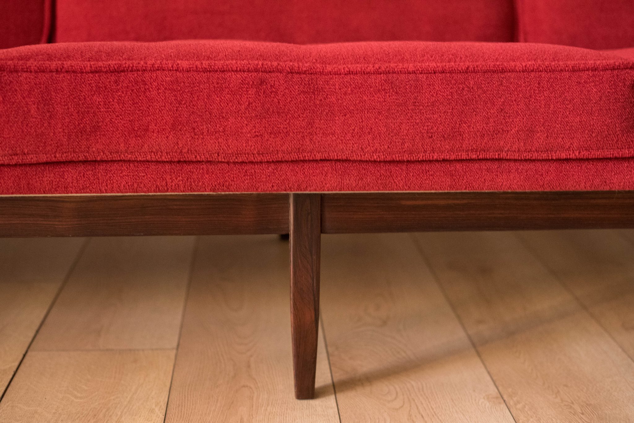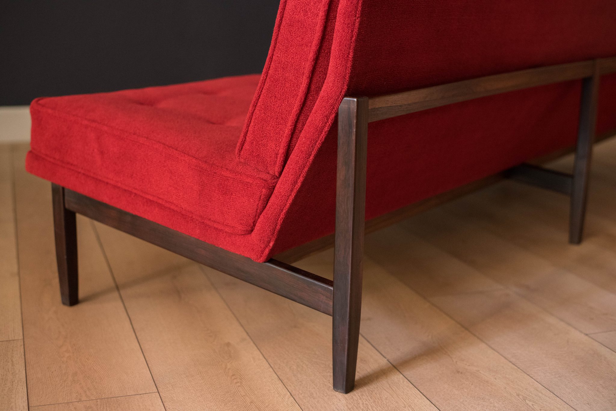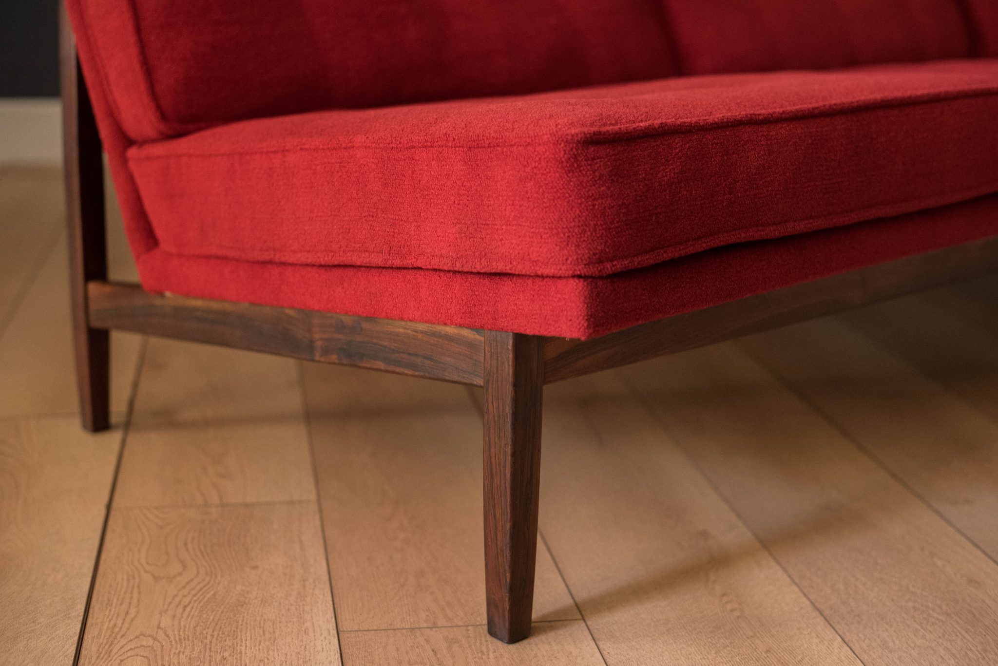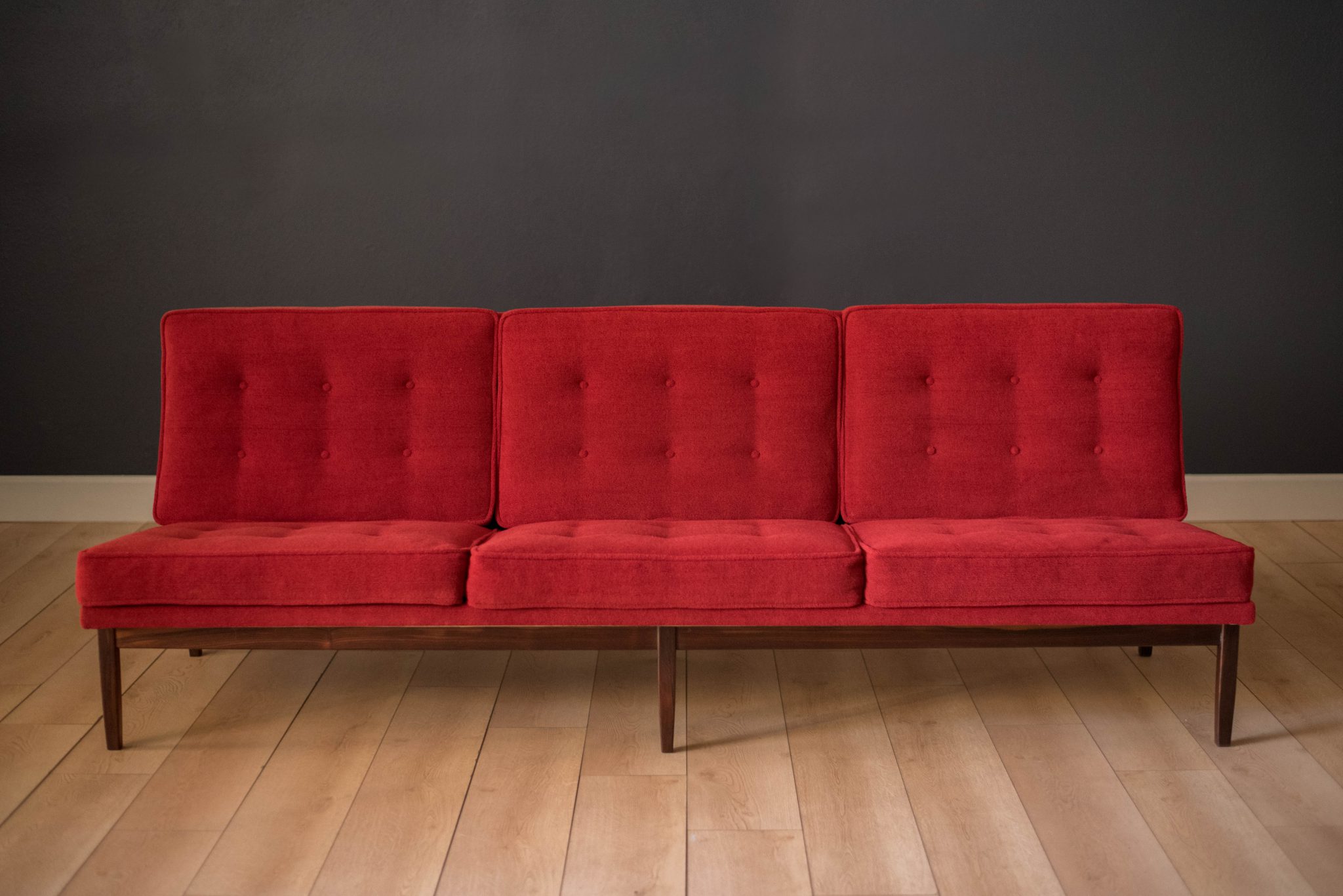 Mid-Century Modern sofa by Florence Knoll for Knoll, model 2553 RW. This piece was designed with a custom rosewood frame and original red crimson textile fabric. Seat cushions are supported by springs built to last and are hand sewn to the upholstered frame.