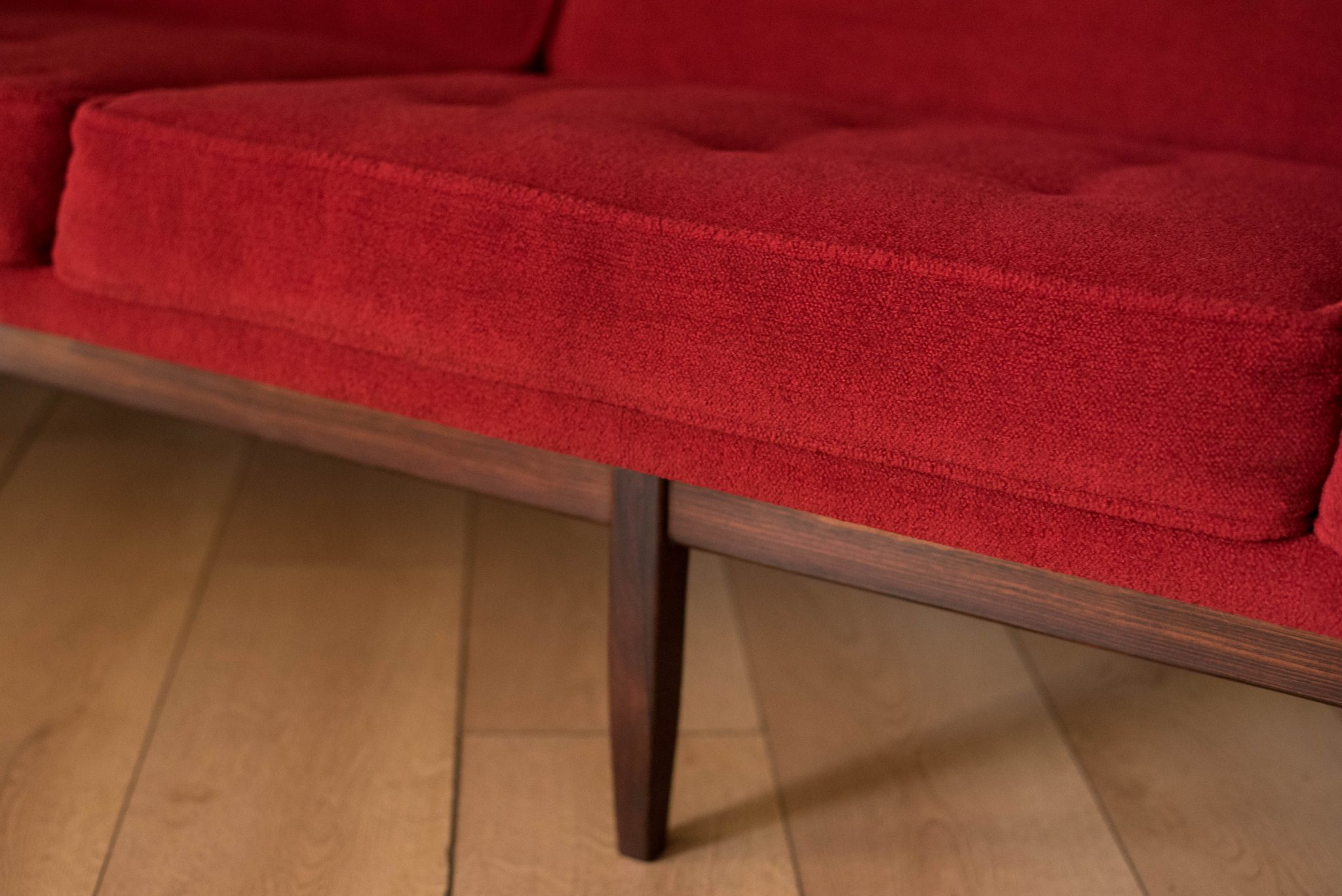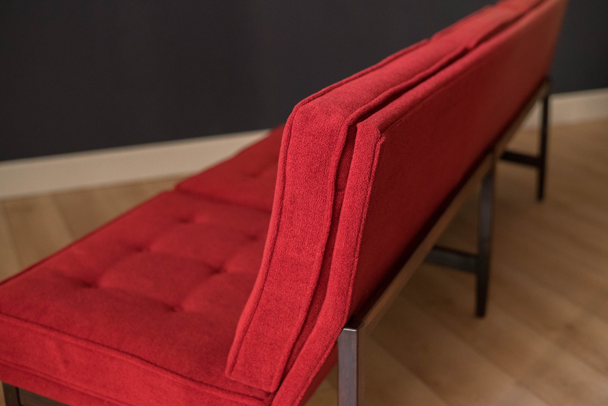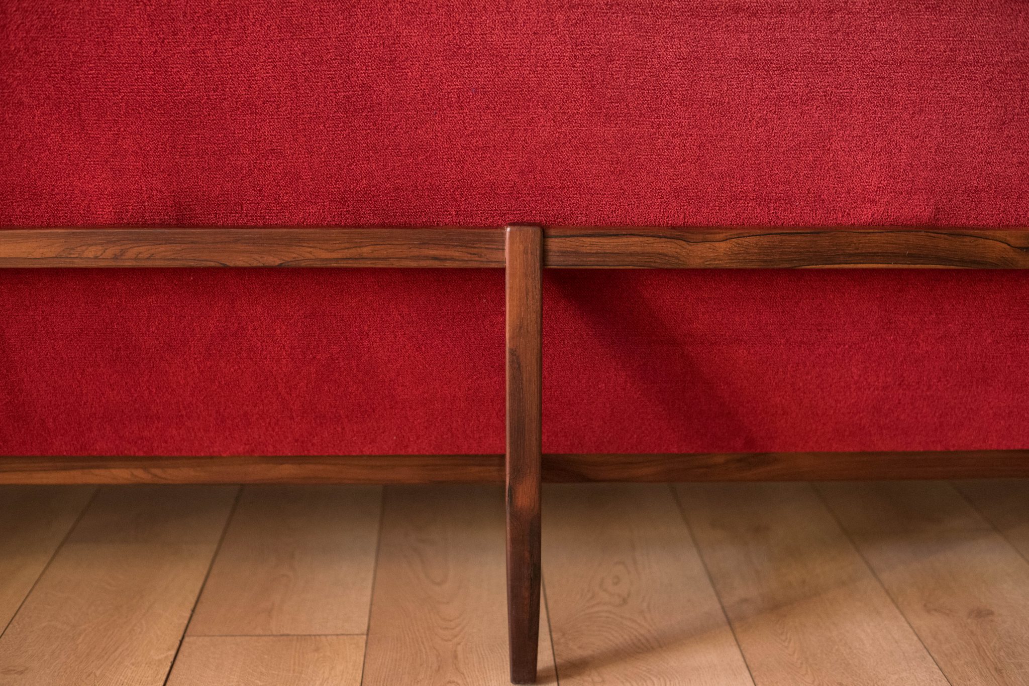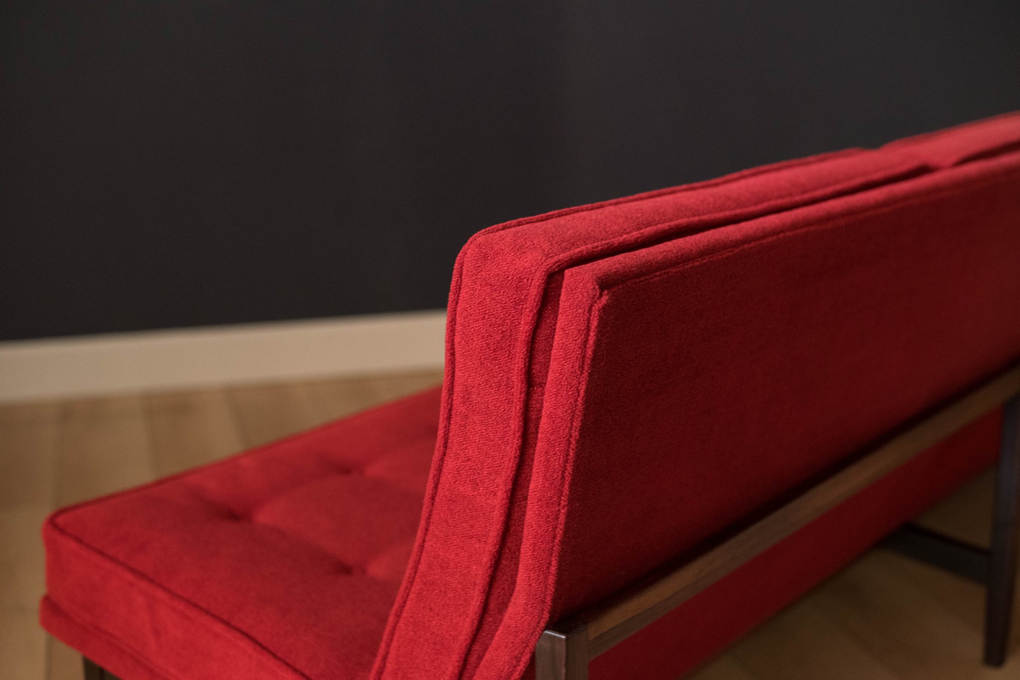 Mid-Century Modern sofa by Florence Knoll for Knoll, model 2553 RW. This piece was designed with a custom rosewood frame and original red crimson textile fabric. Seat cushions are supported by springs built to last and are hand sewn to the upholstered frame.