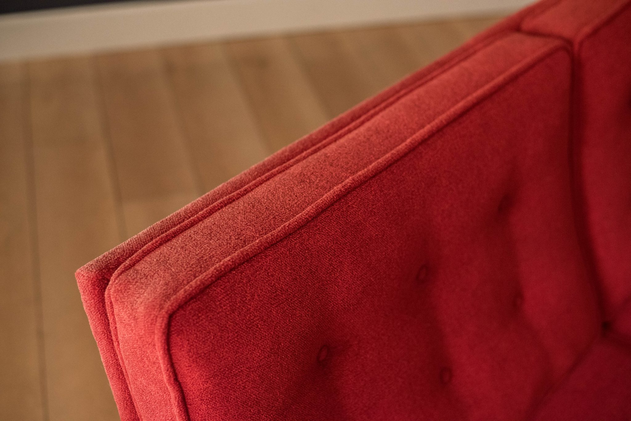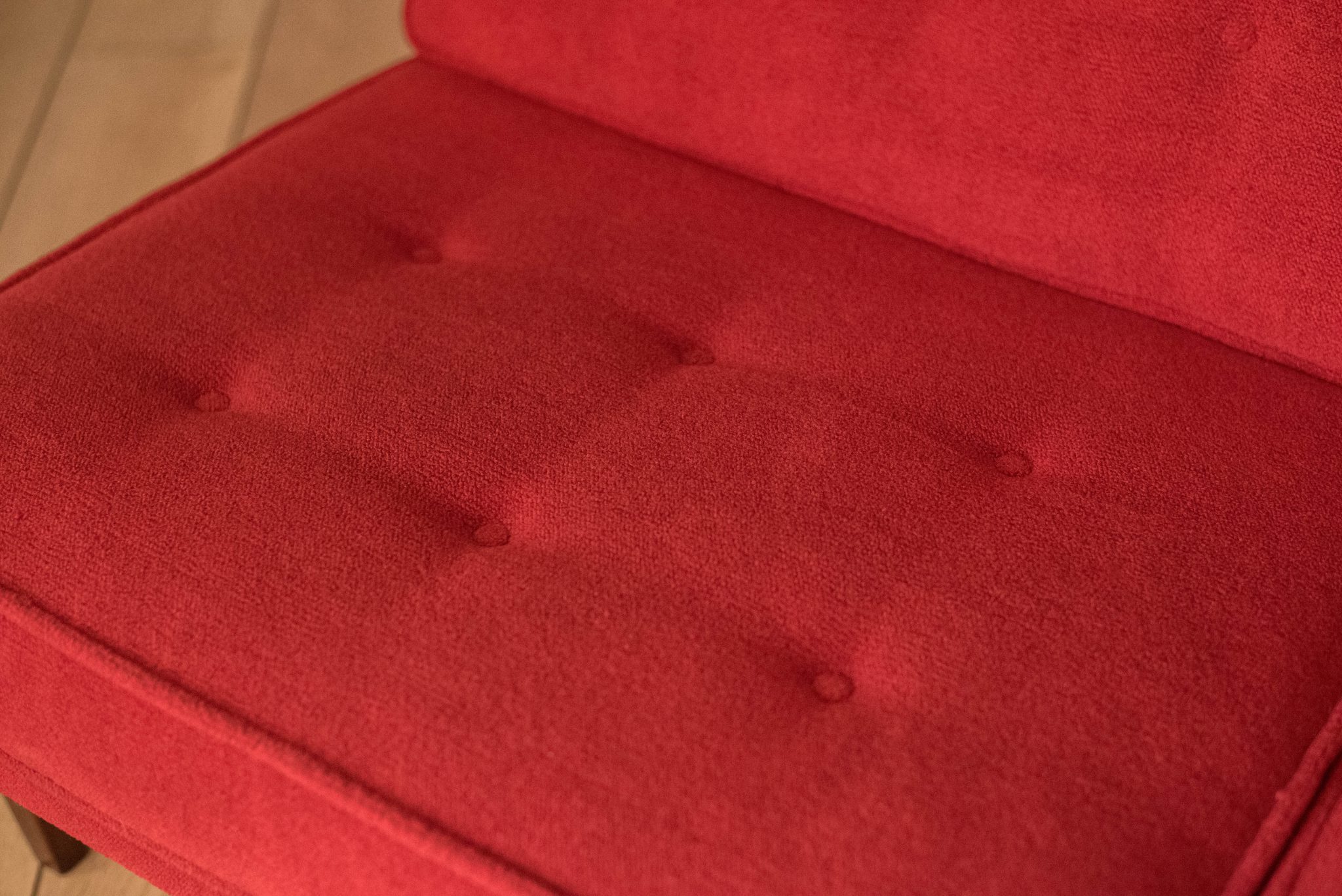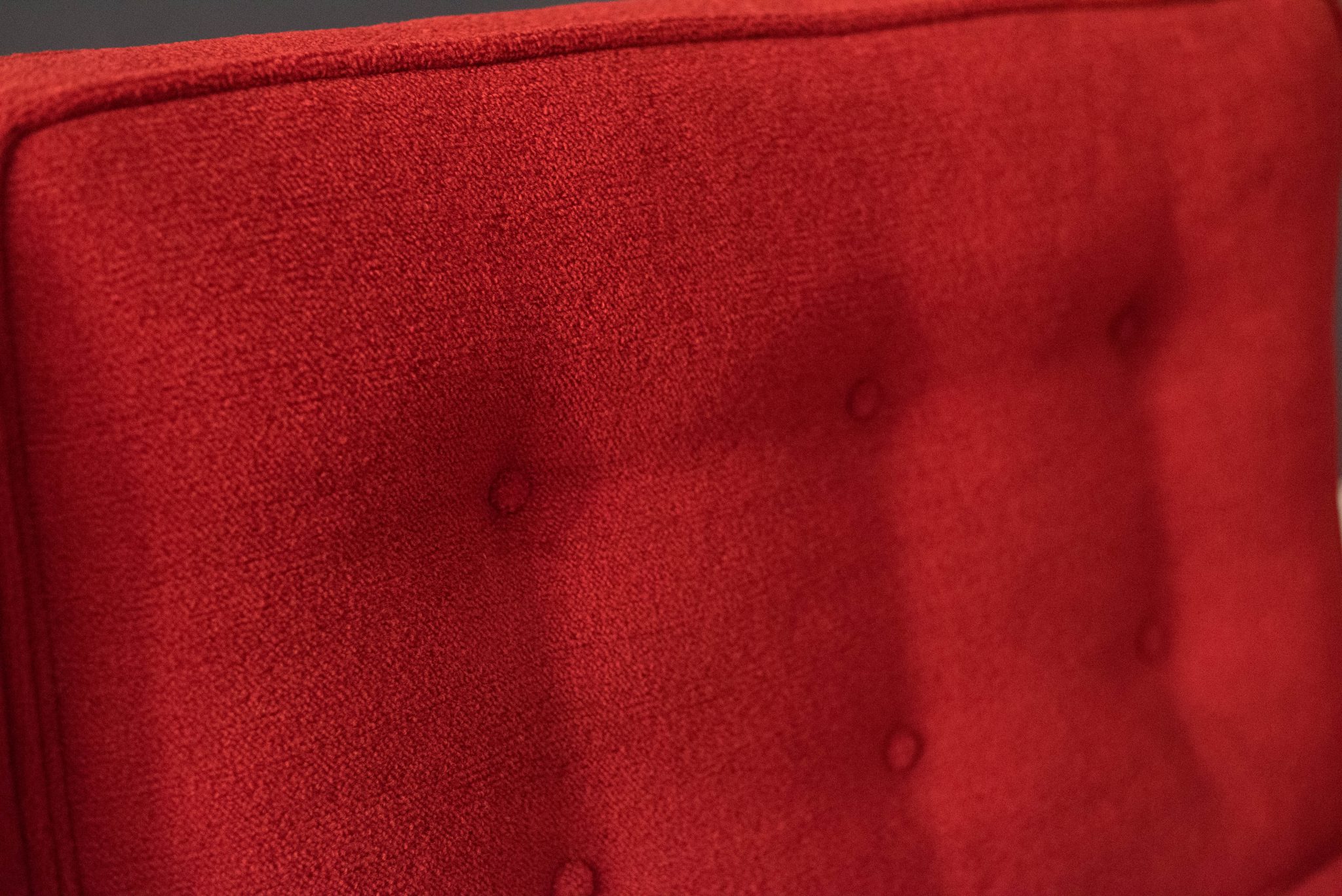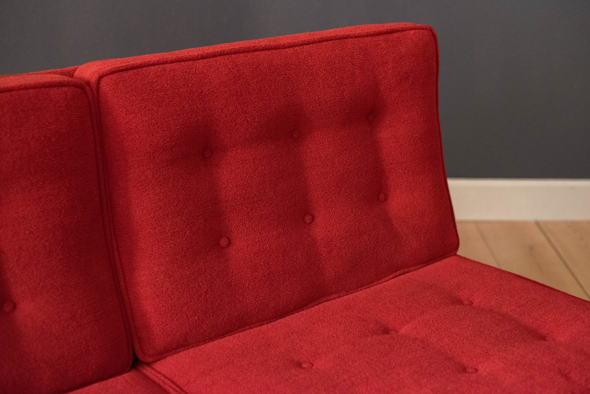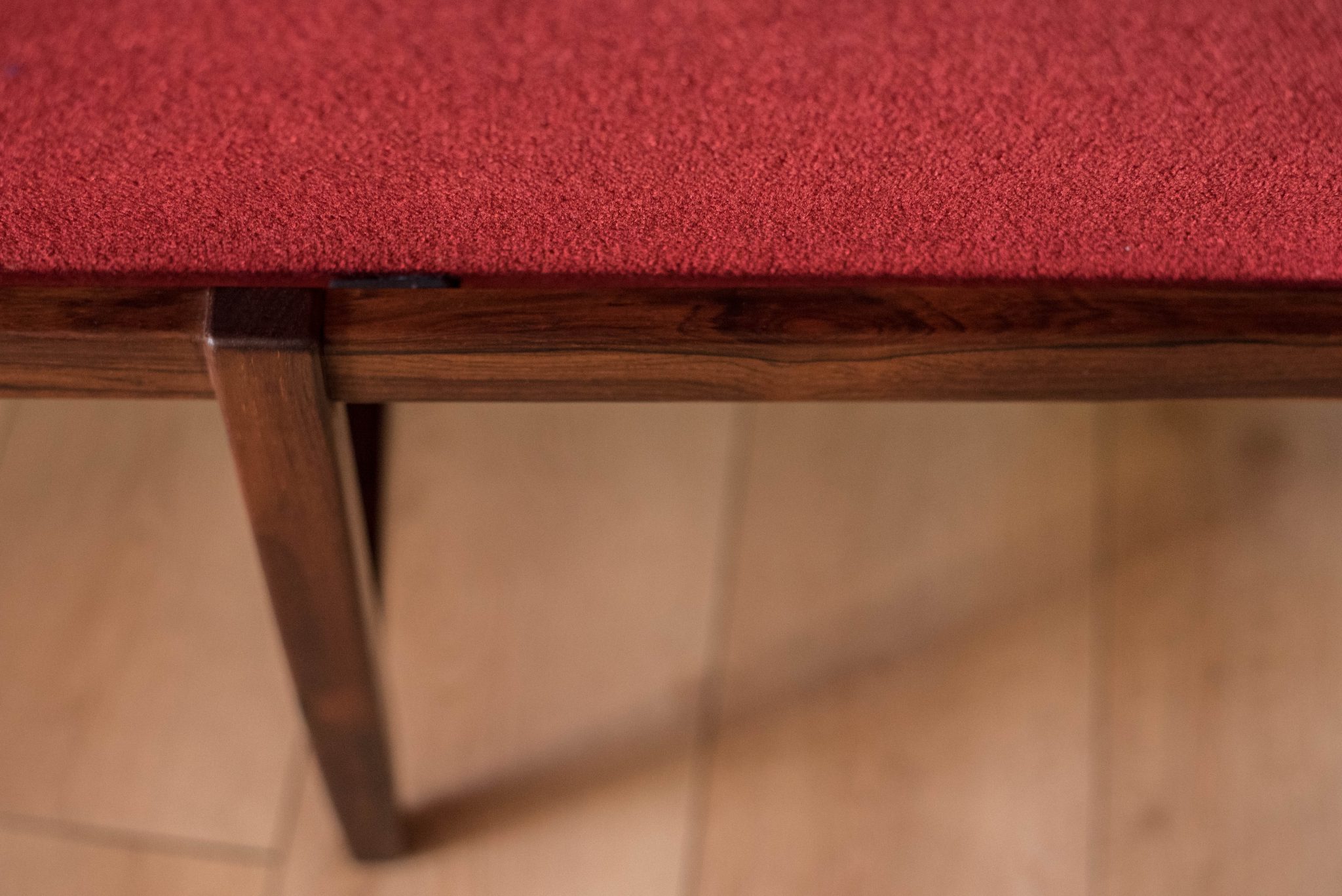 Mid-Century Modern sofa by Florence Knoll for Knoll, model 2553 RW. This piece was designed with a custom rosewood frame and original red crimson textile fabric. Seat cushions are supported by springs built to last and are hand sewn to the upholstered frame.