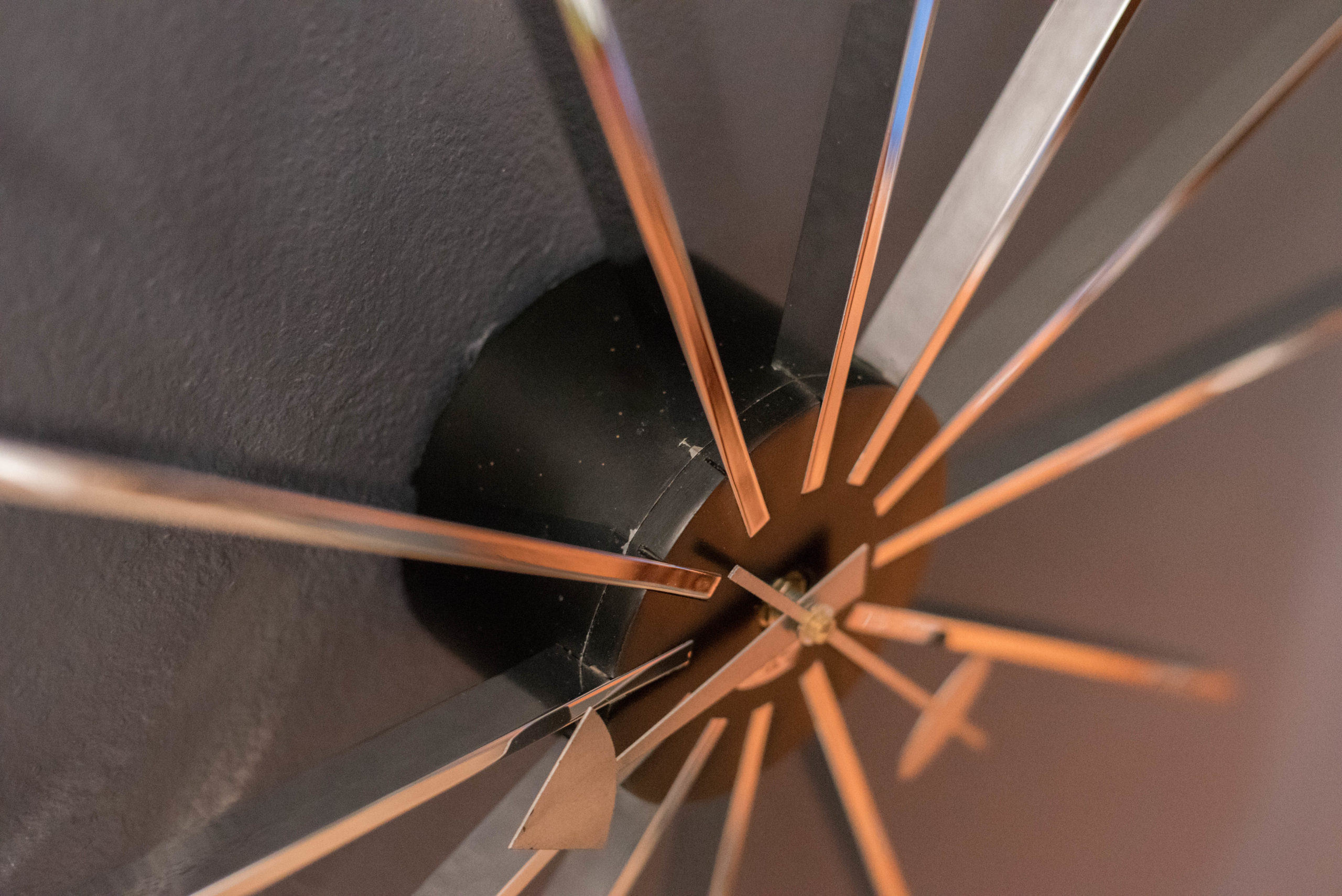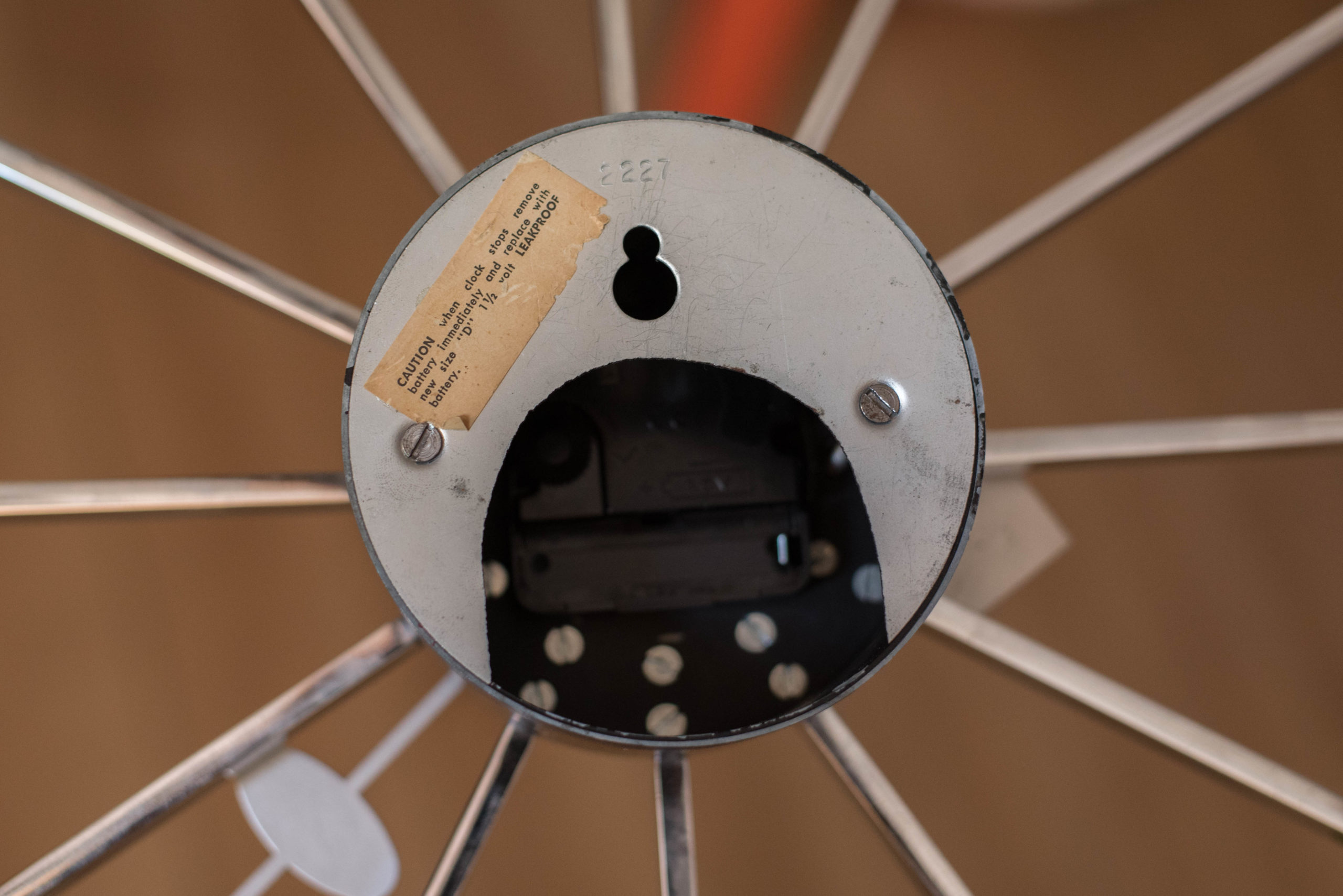 Mid-Century Modern wall clock designed by George Nelson & Associates for Howard Miller Clock Company. Produced in 1955, this piece was named the ‘Spoke’ clock model no. 2227. Operates with one AA battery.