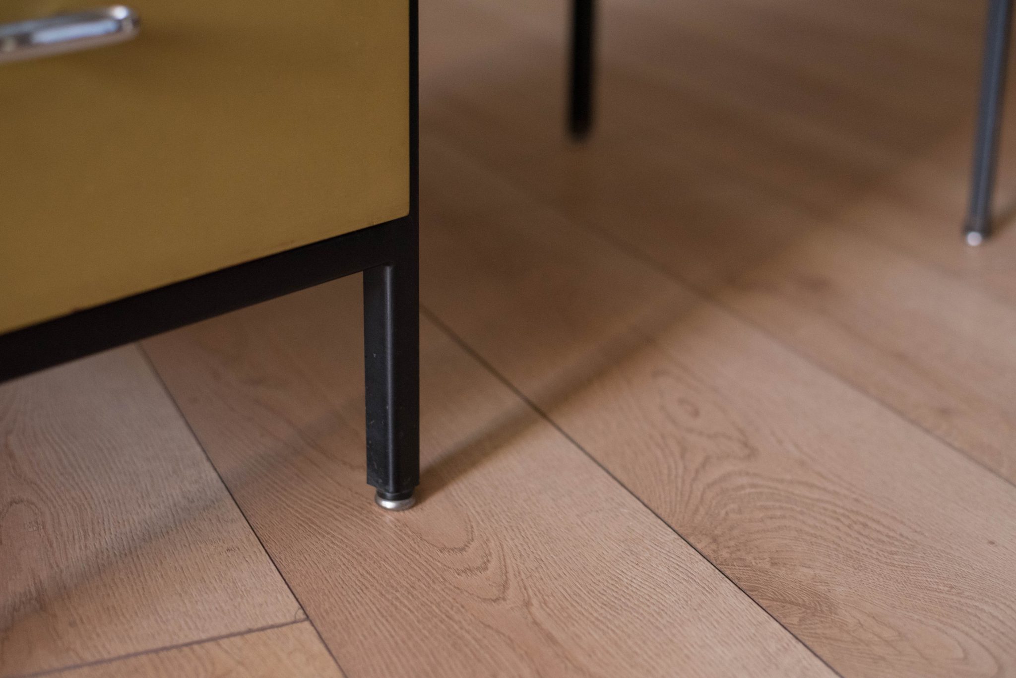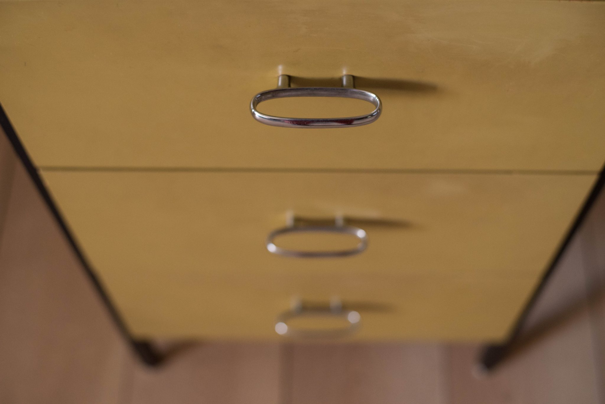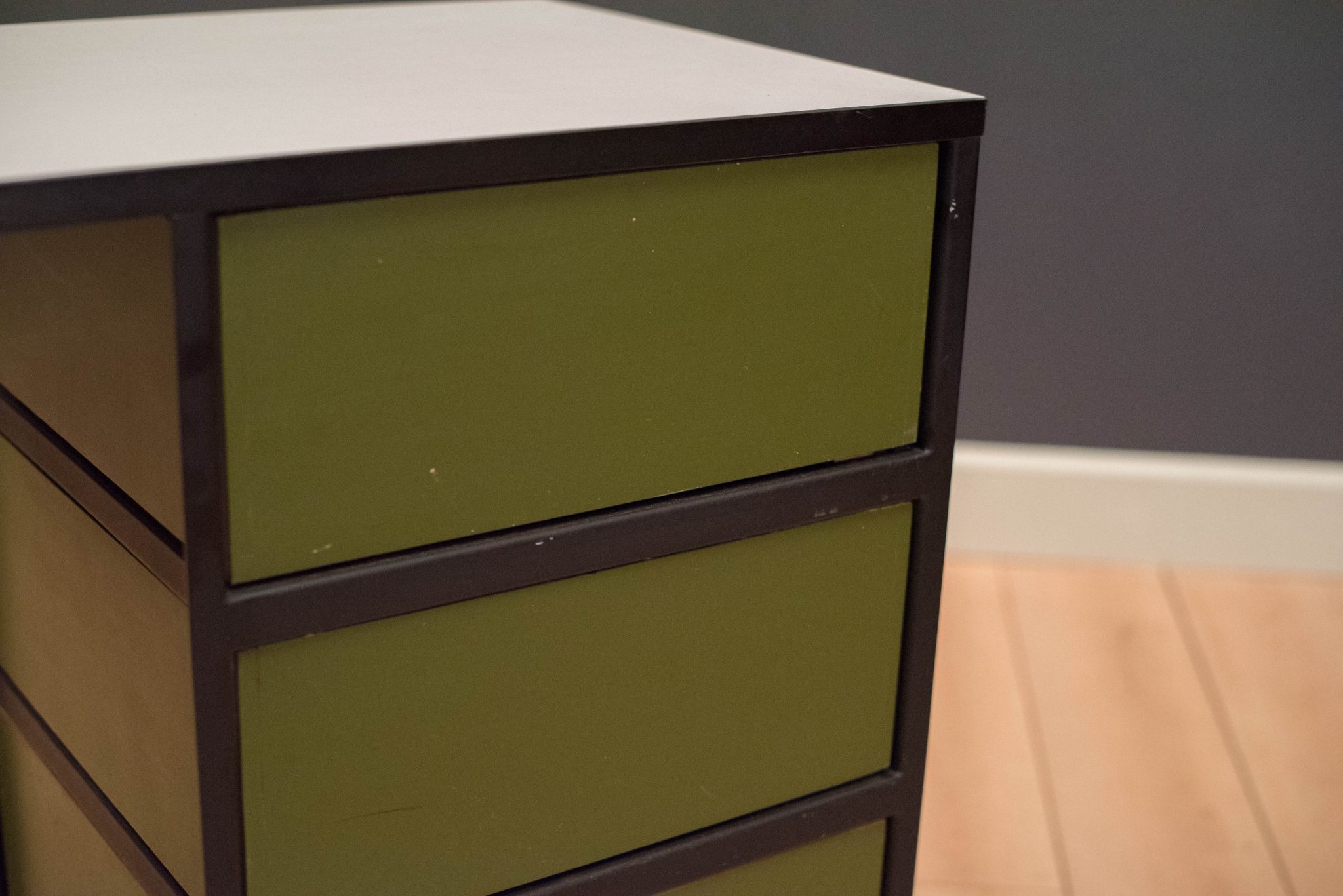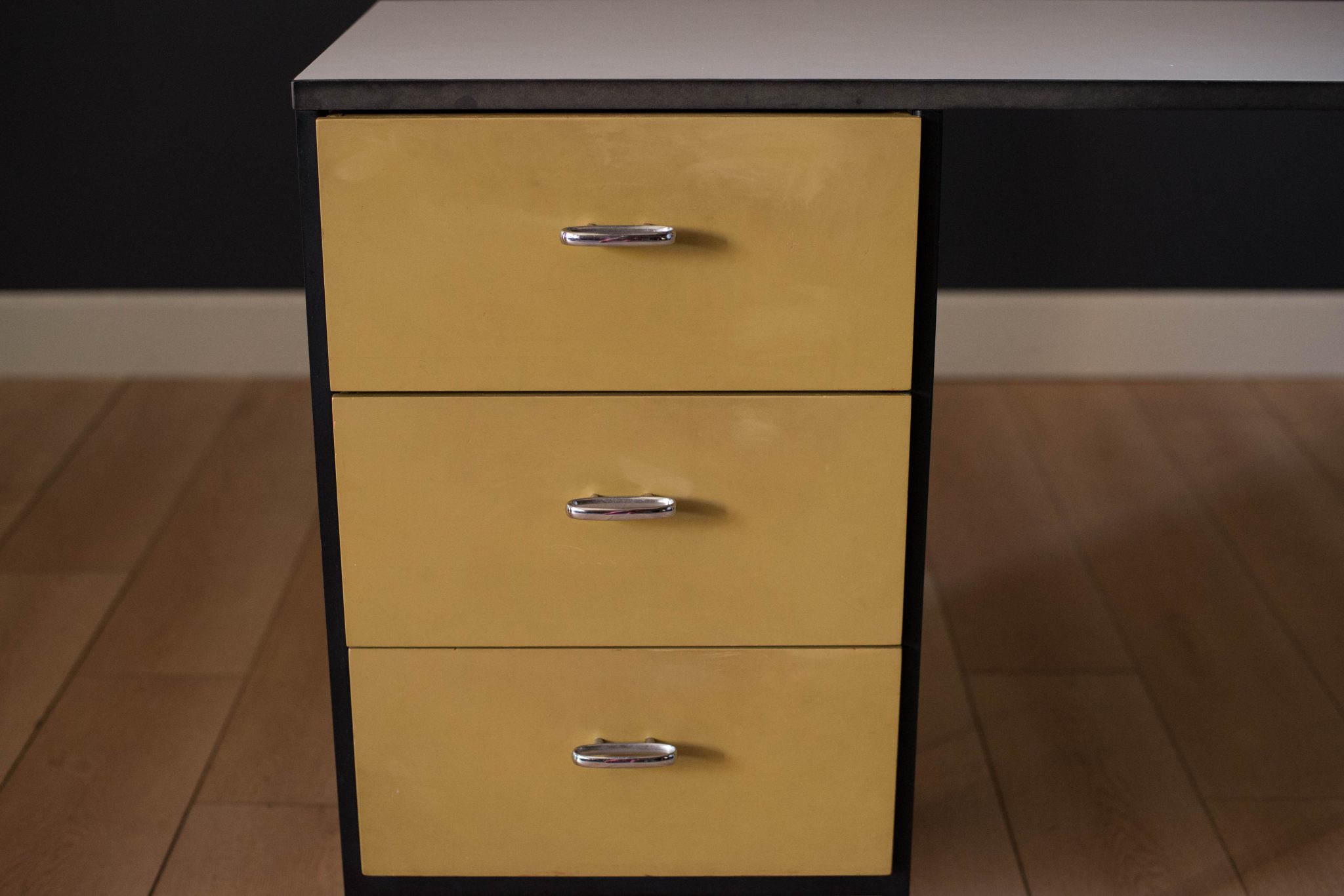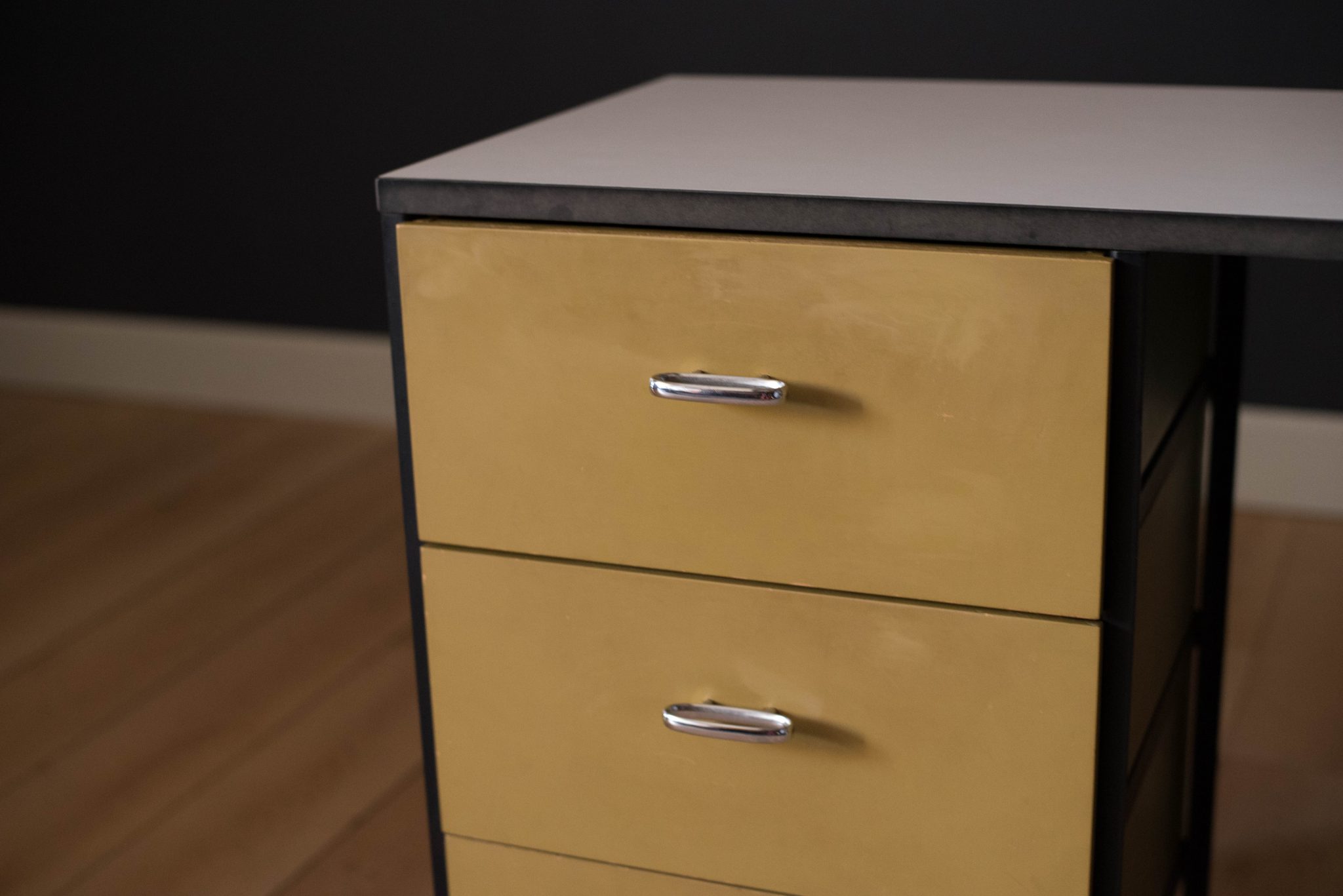 Mid-Century Modern steel frame office desk designed by George Nelson for Herman Miller. This original two-toned piece includes three drawers encased in a black steel frame accessorized by Nelson’s signature aluminum handles. White laminate top allows for easy maintenance. Desk can be displayed from any angle and is finished on the back. Knee hole measures: 20.25″ W, 11″ D, 9.5.