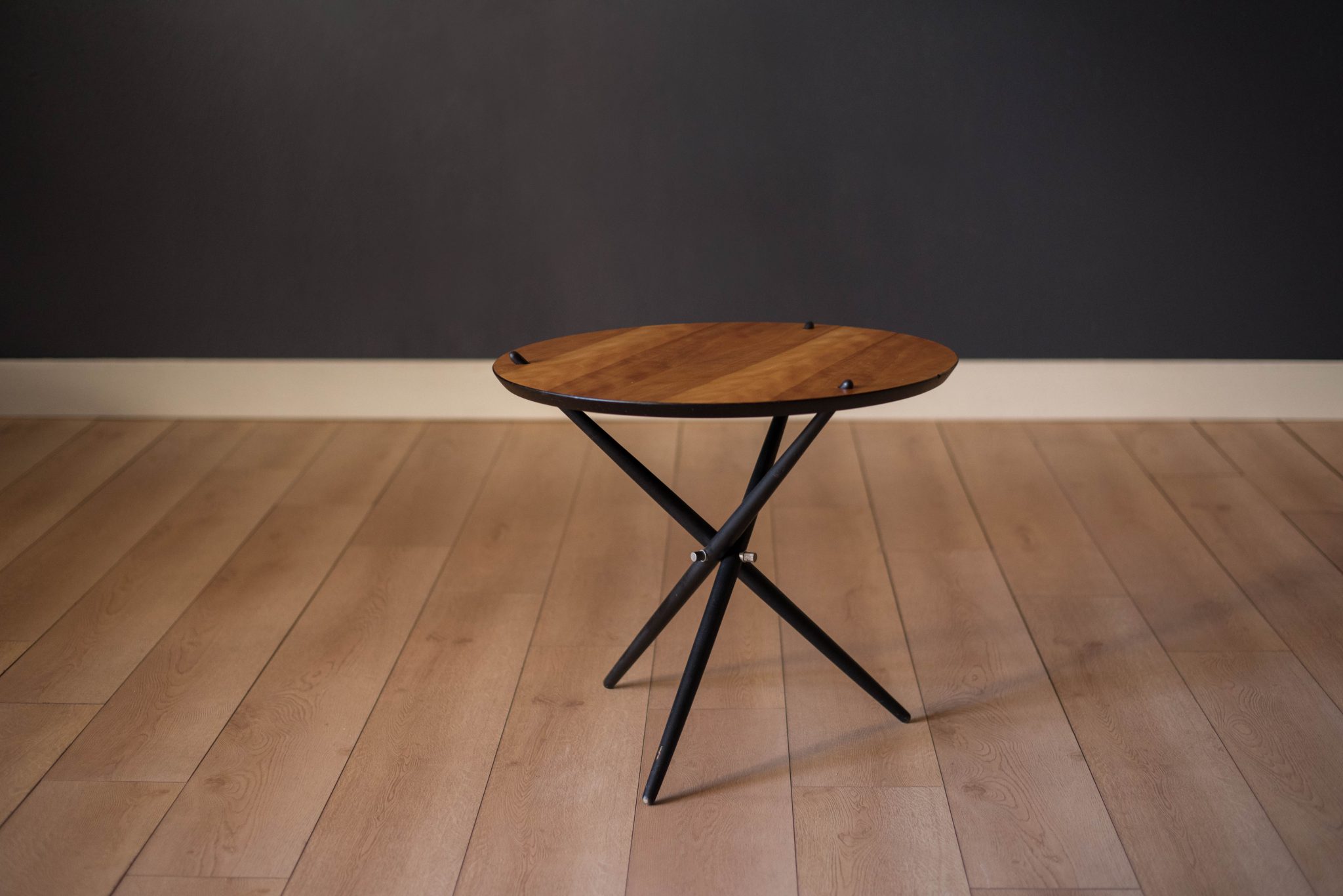 Mid-Century Modern occasional round table designed by Hans Bellmann for Knoll, circa 1948. This piece features a two-toned maple top supported by an ebonized tripod wood base.