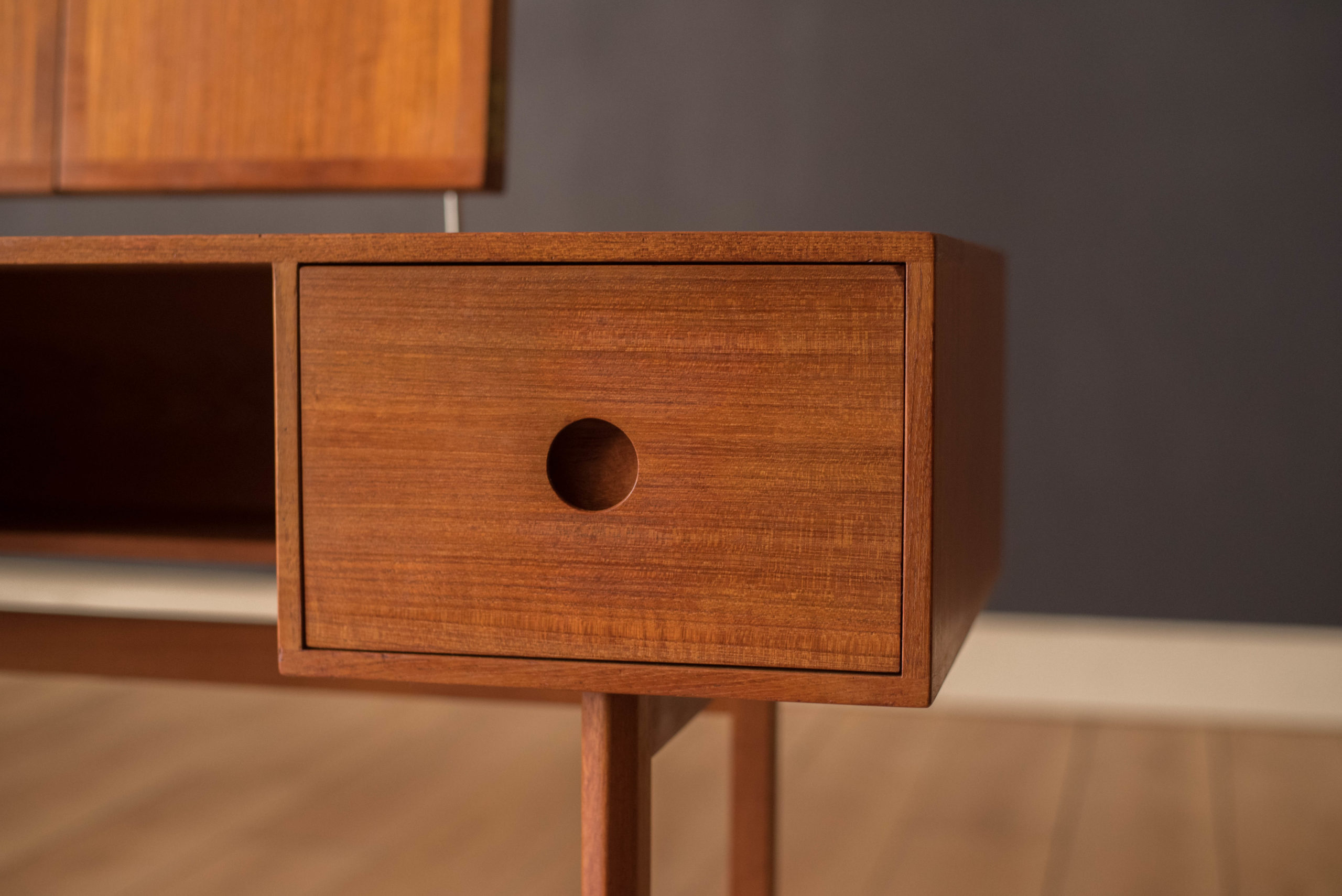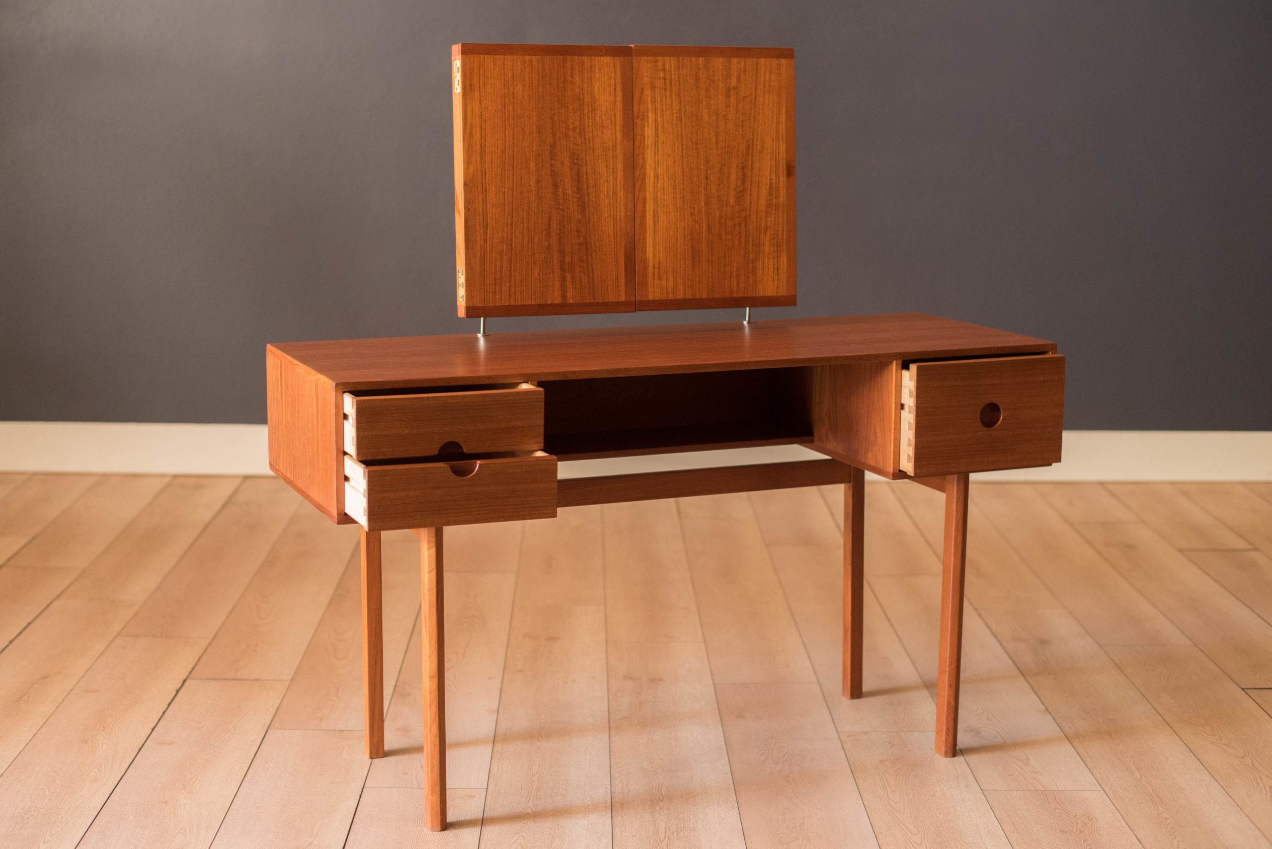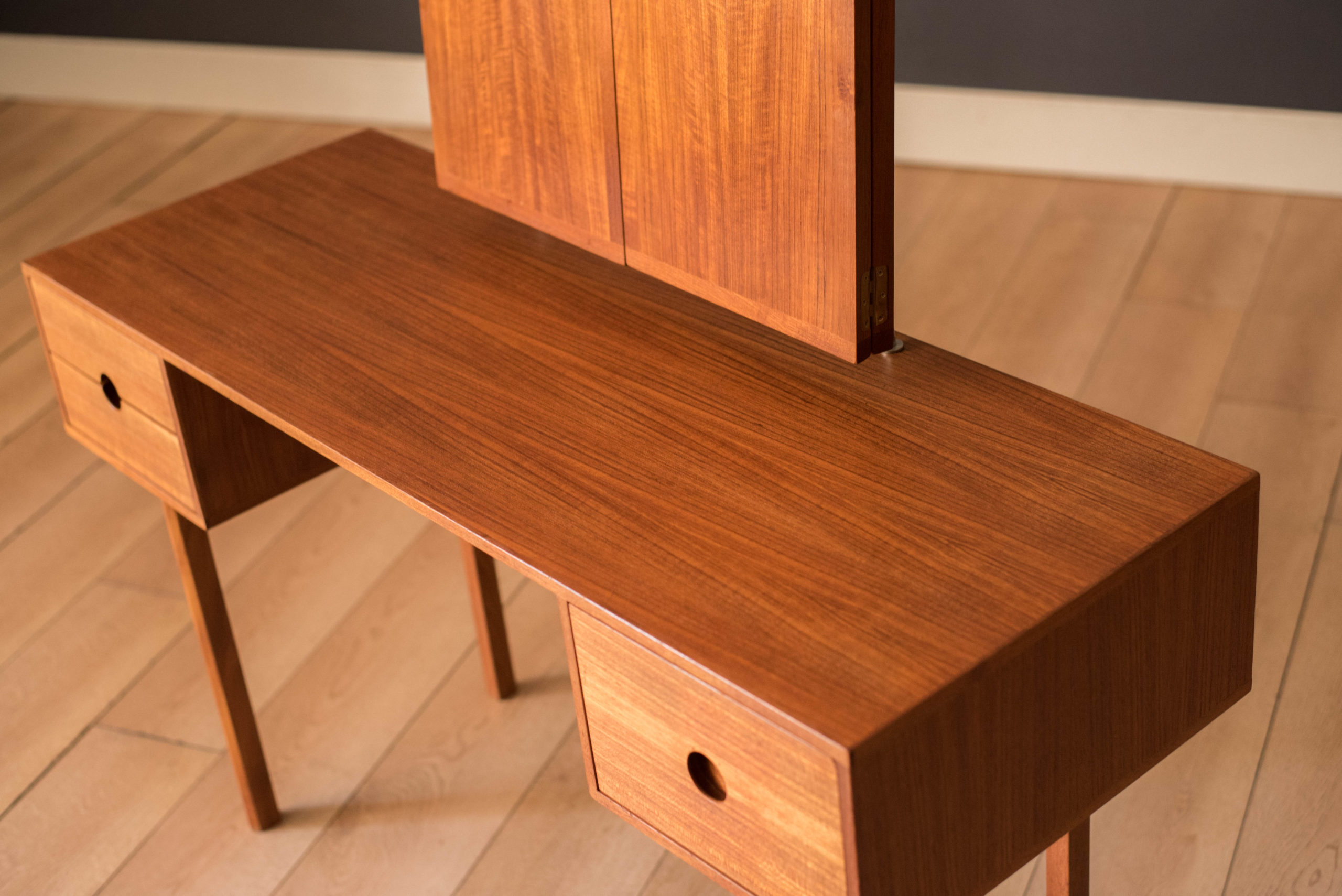 Mid Century Modern vanity dressing table in teak designed by Kai Kristiansen for Aksel Kjersgaard, Denmark. Features sleek circular recessed pulls that open three dovetail storage drawers and includes one center fixed shelf. The floating mirror is adjustable and accessorized with chrome plated steel hardware. This versatile piece fits as a bedroom vanity or small office desk.