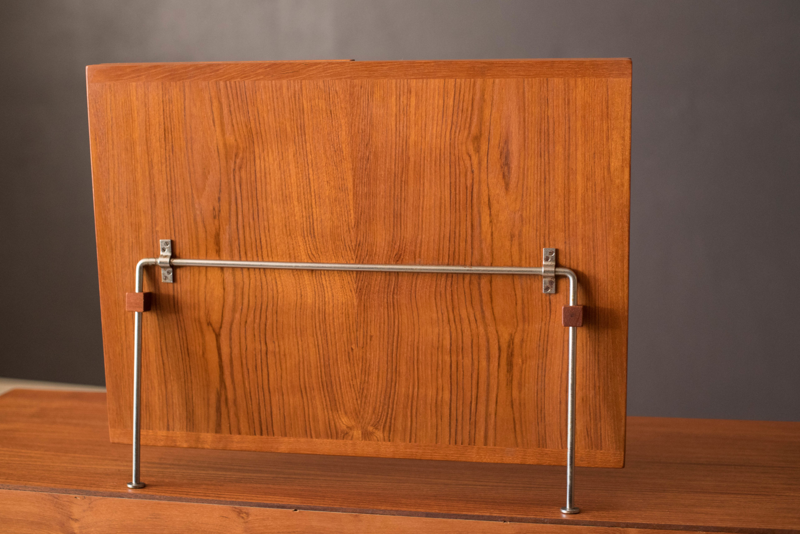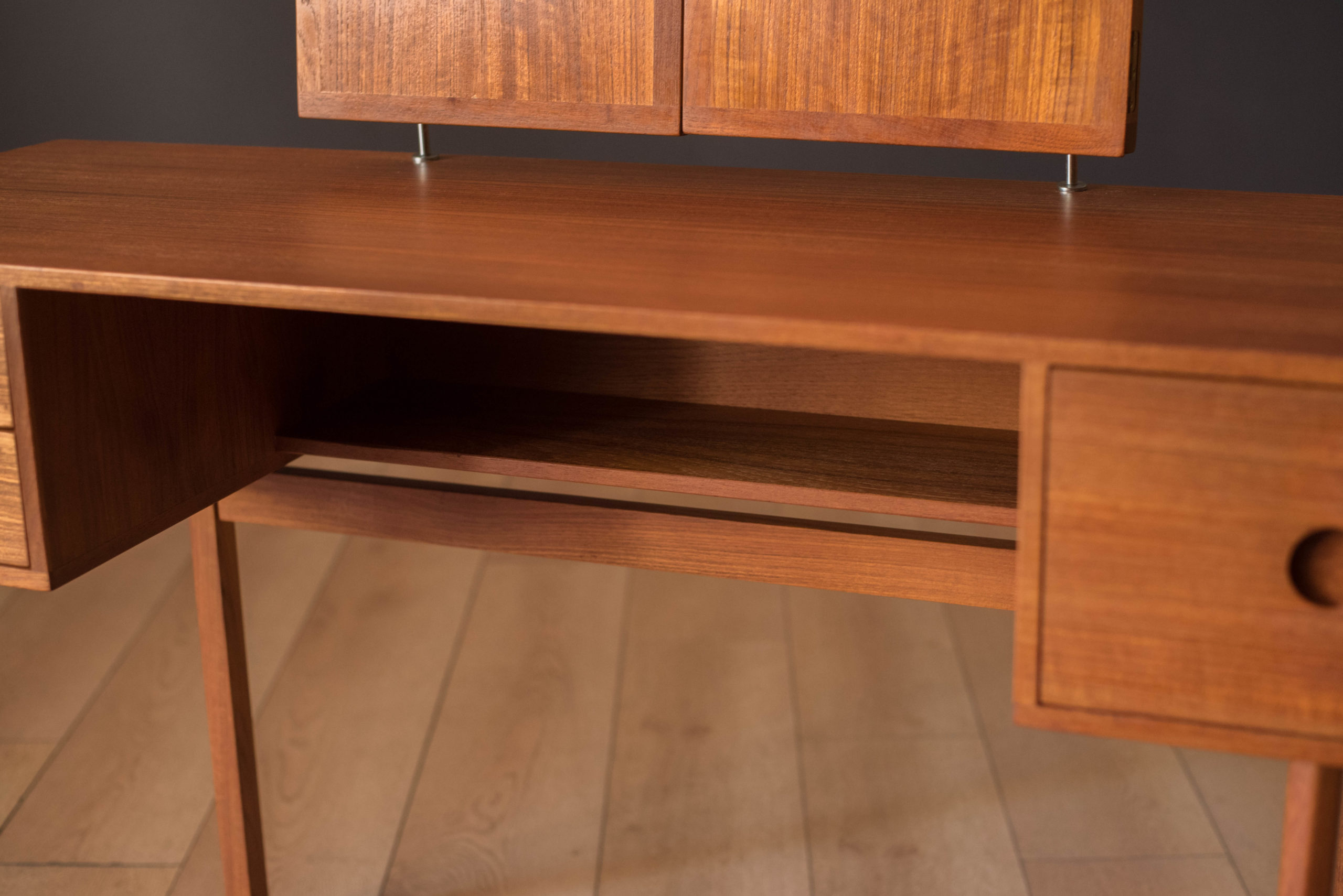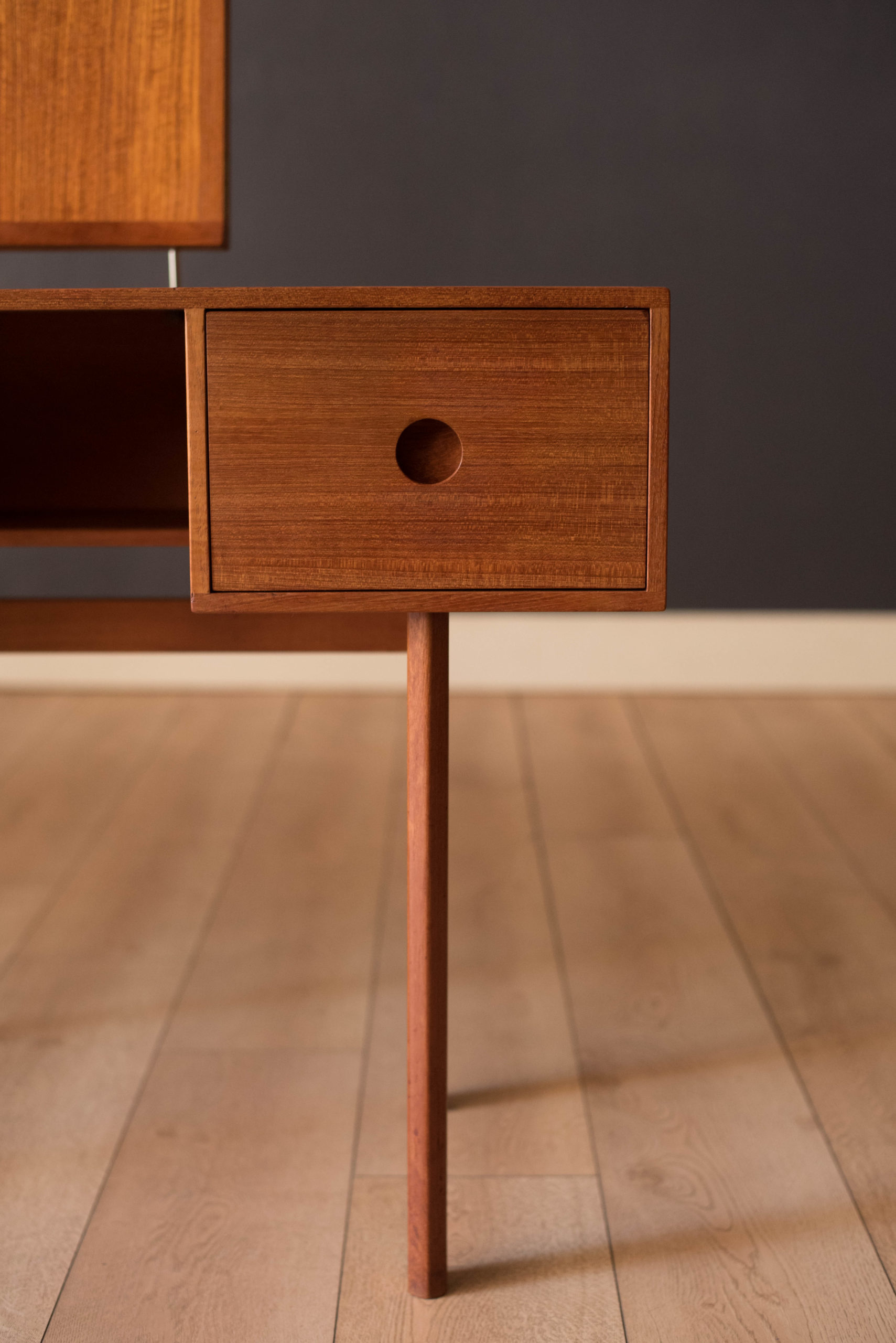 Mid Century Modern vanity dressing table in teak designed by Kai Kristiansen for Aksel Kjersgaard, Denmark. Features sleek circular recessed pulls that open three dovetail storage drawers and includes one center fixed shelf. The floating mirror is adjustable and accessorized with chrome plated steel hardware. This versatile piece fits as a bedroom vanity or small office desk.