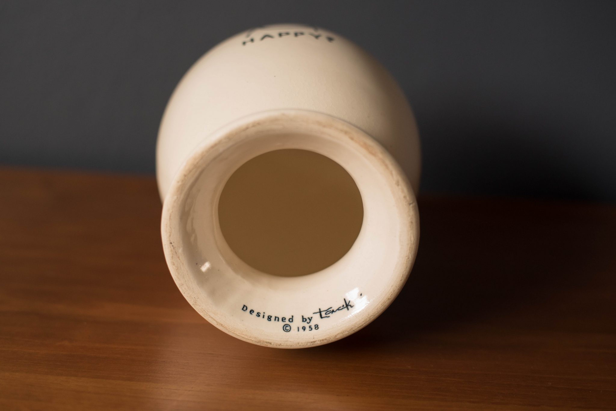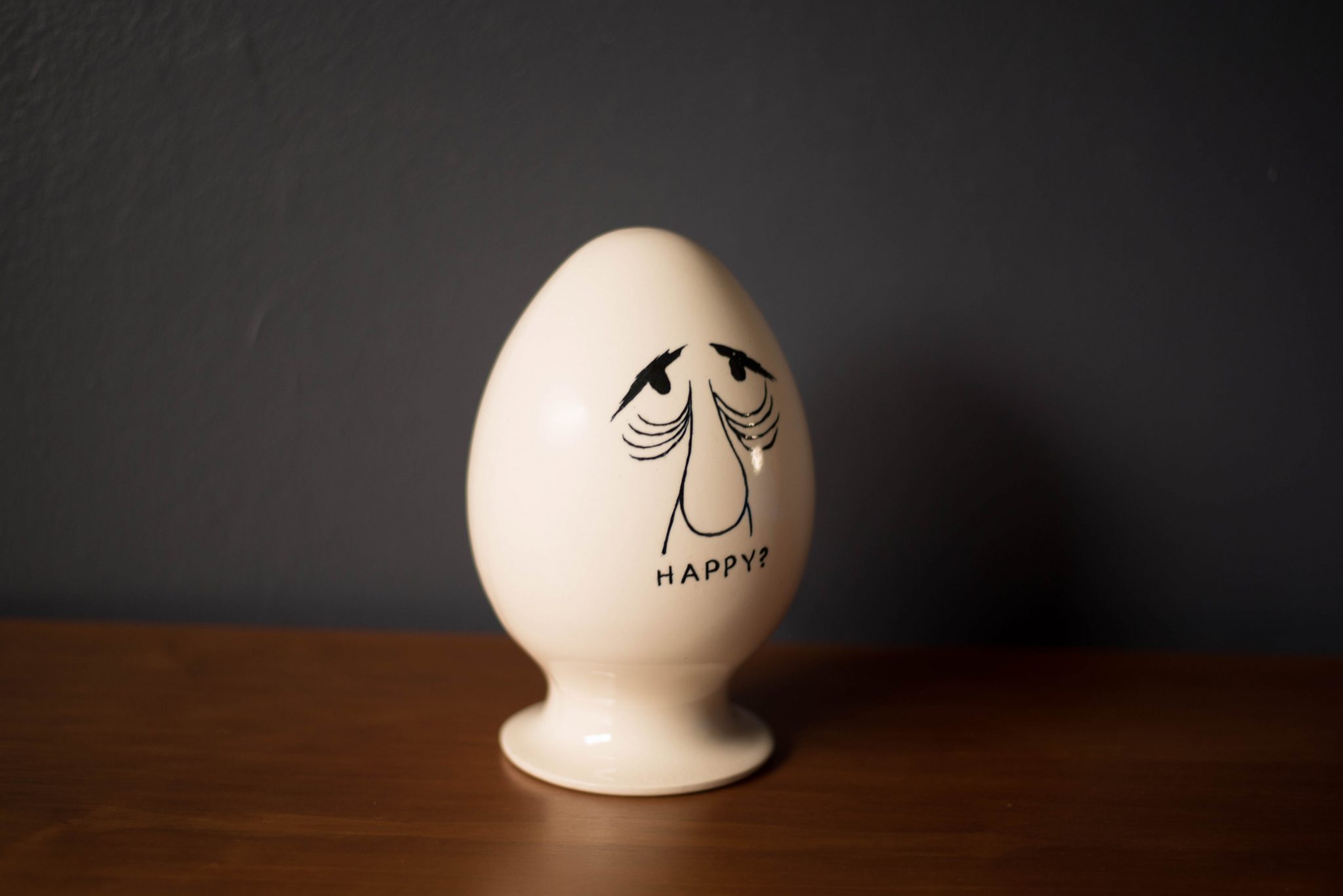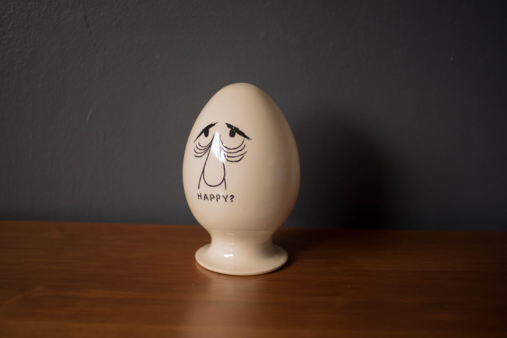 Mid-Century ceramic egghead condom holder designed by Lagardo Tackett. This collectible piece was a mail order item advertised through Playboy Magazine. Signed Tack on the bottom and made in Japan. Does not include cork bottom.