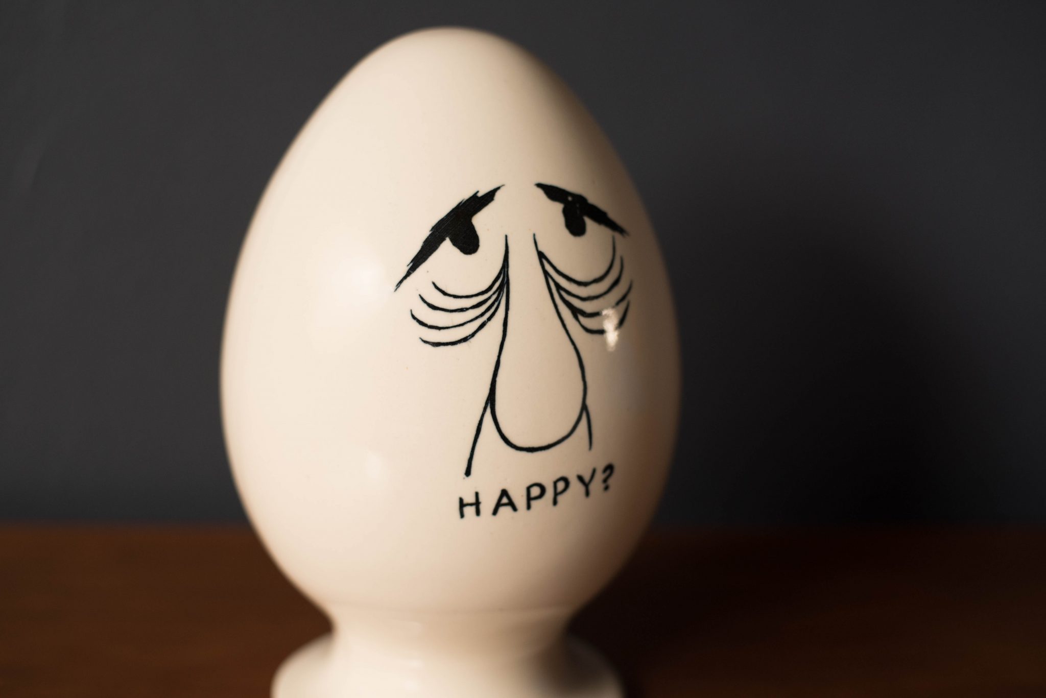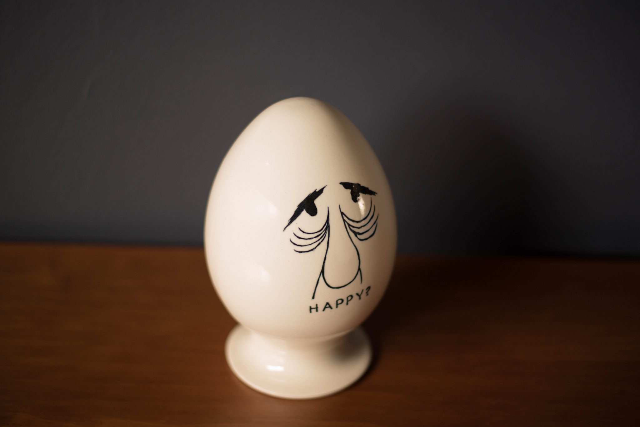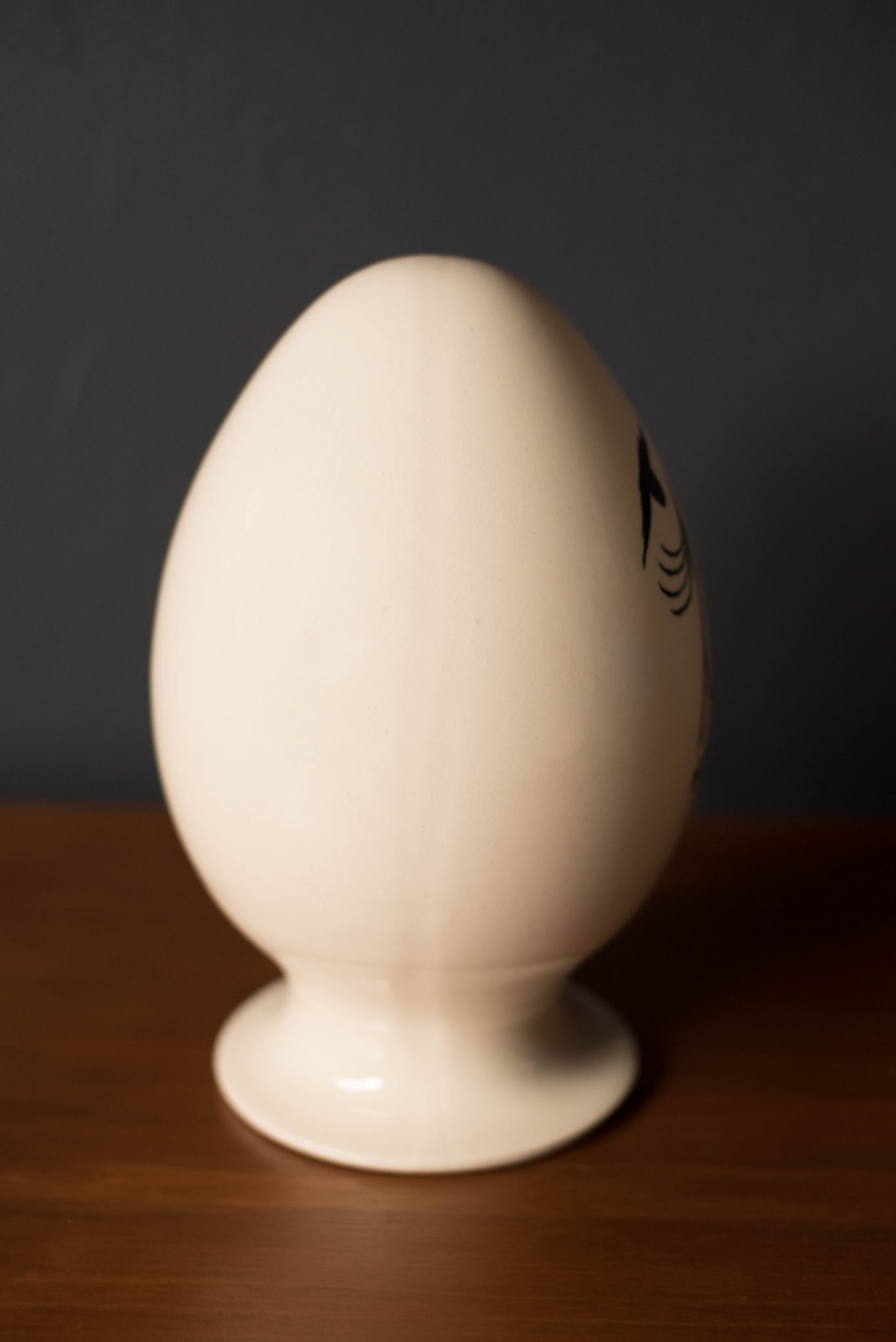 Mid-Century ceramic egghead condom holder designed by Lagardo Tackett. This collectible piece was a mail order item advertised through Playboy Magazine. Signed Tack on the bottom and made in Japan. Does not include cork bottom.