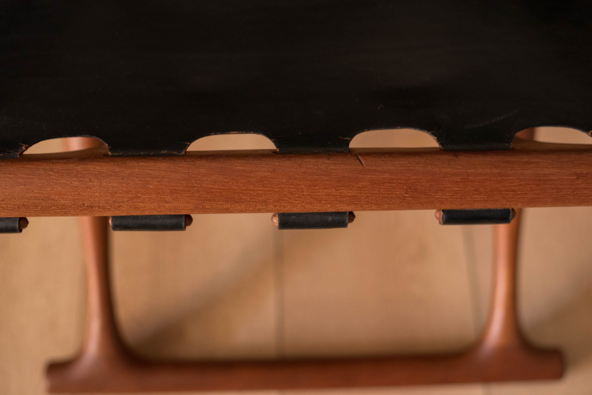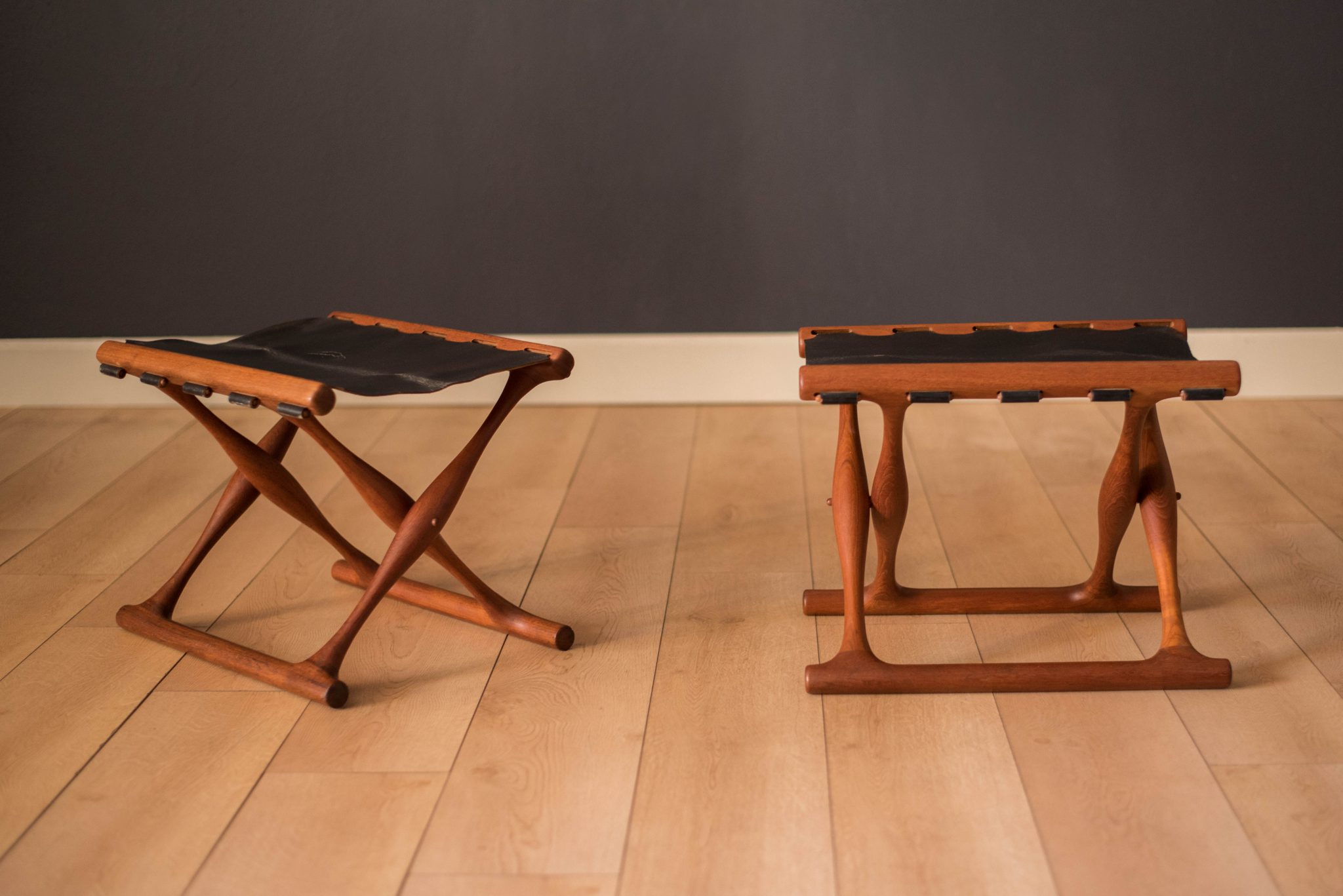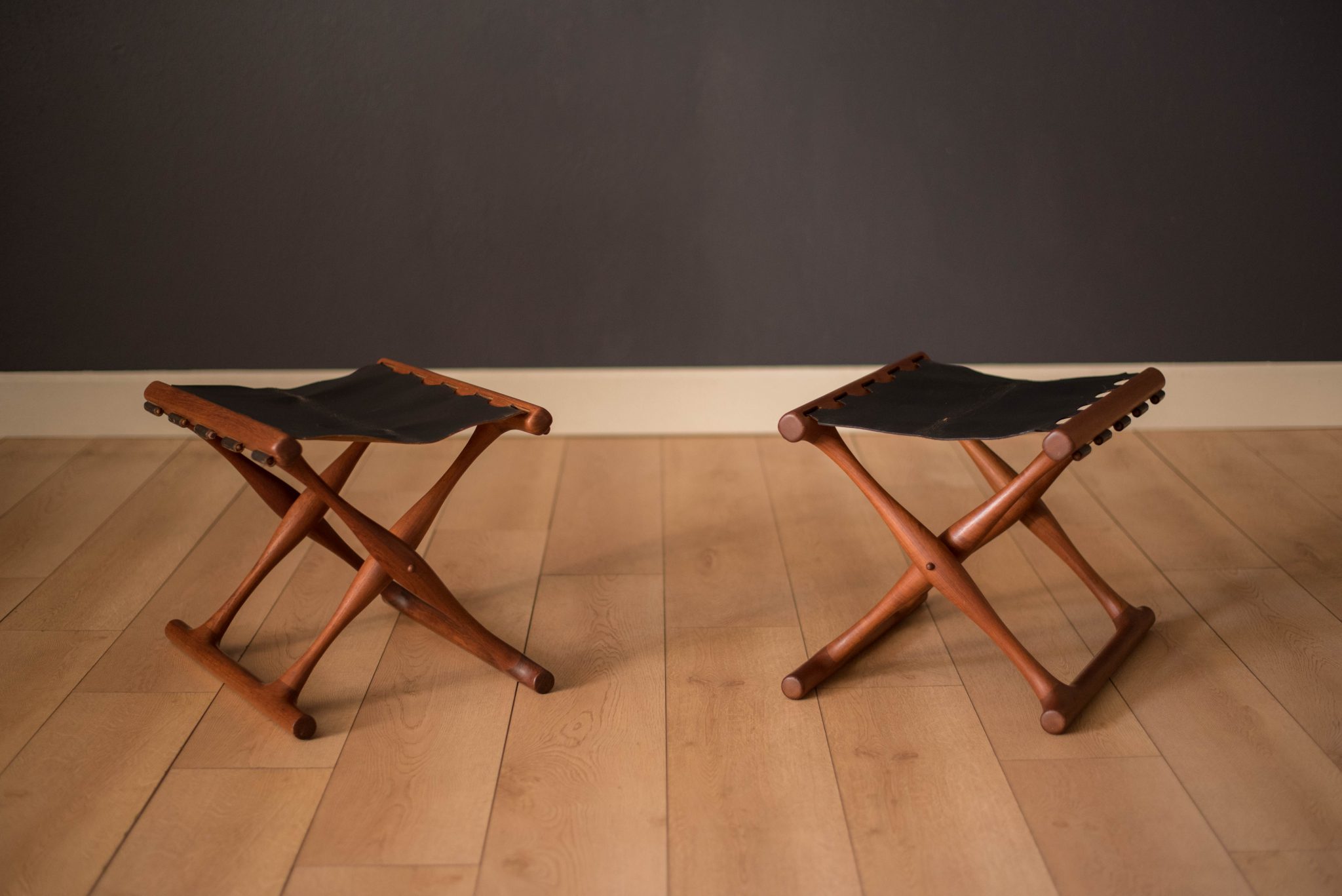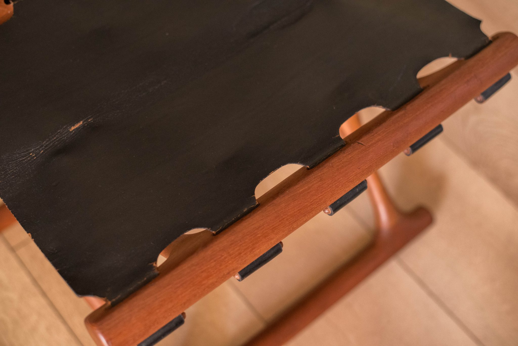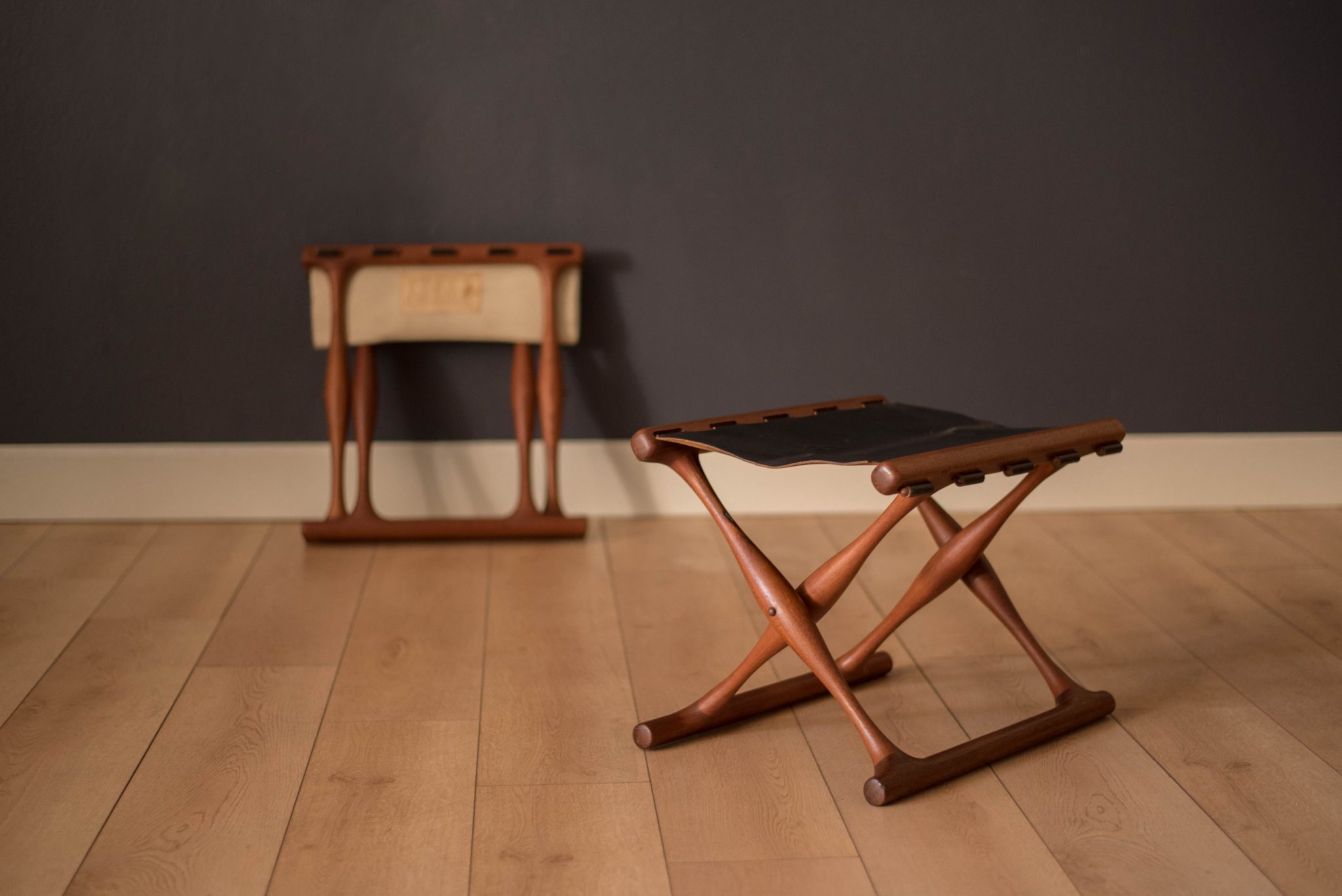 Mid century modern Gold Hill ottoman stools designed by Poul Hundevad for Vamdrup Stølefabrik. This foldable footstool is sculpted in old growth teak and displays the original black leather sling. Price is for each, one left.
