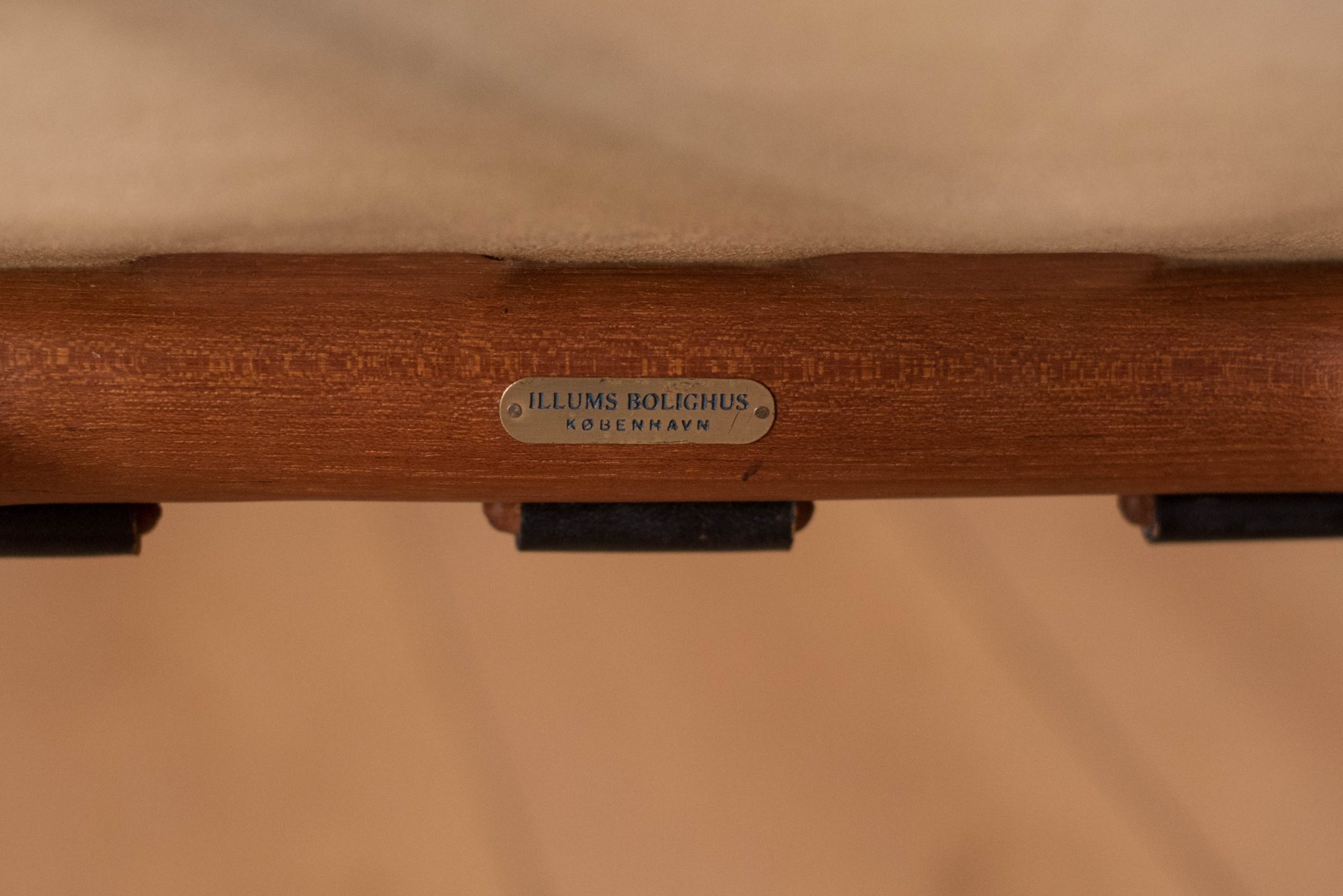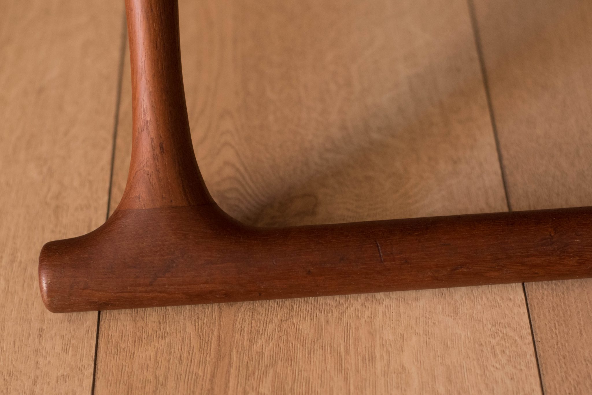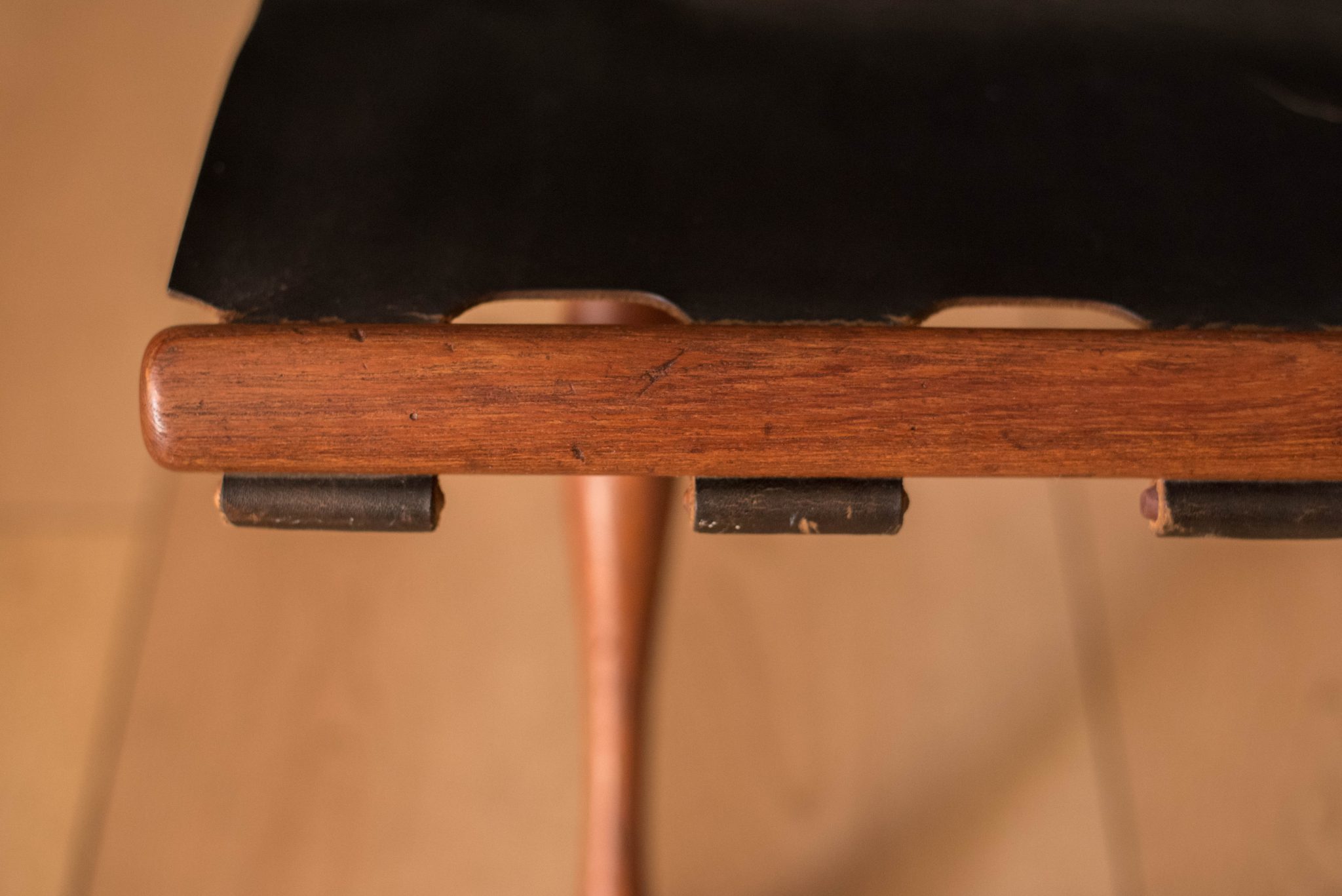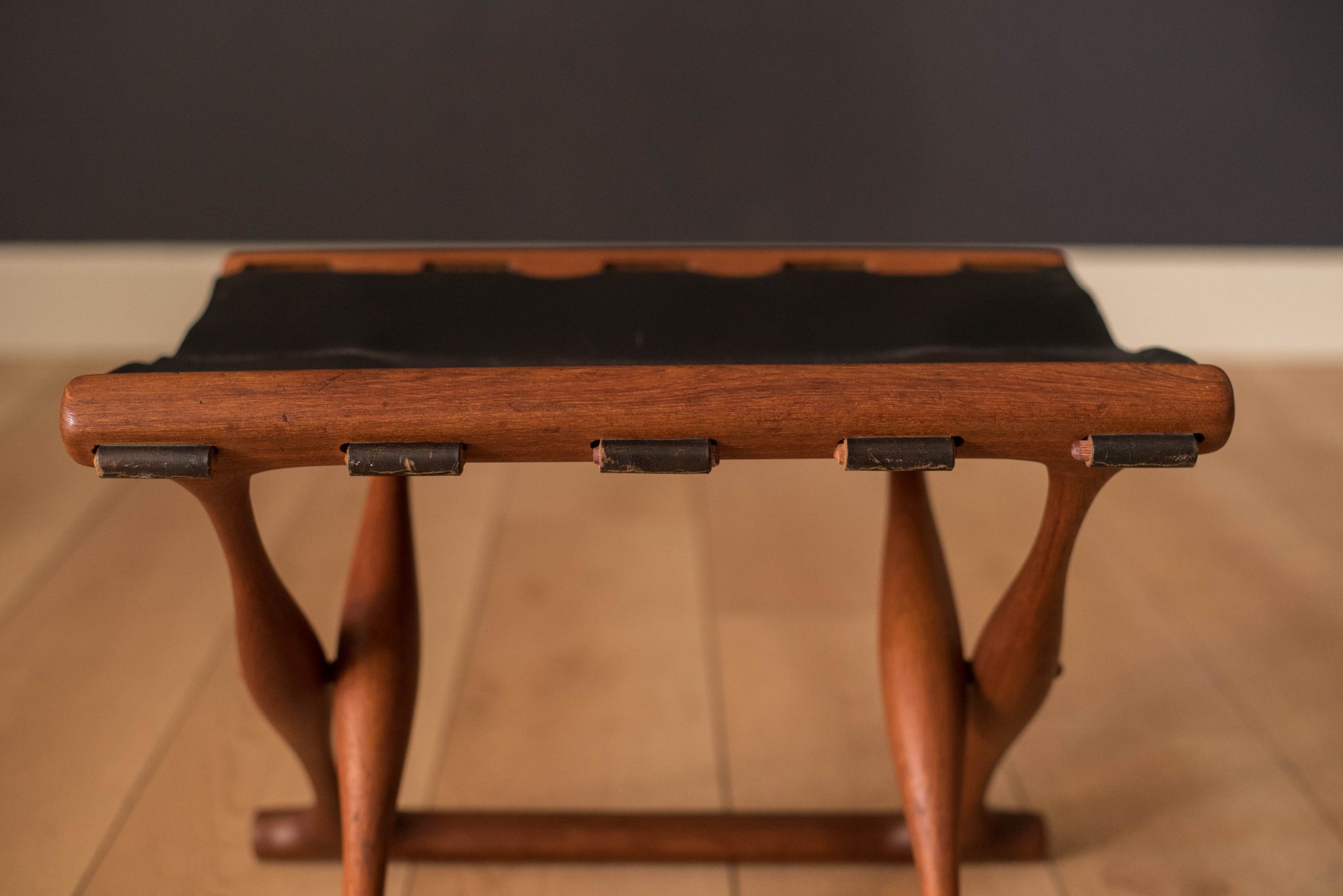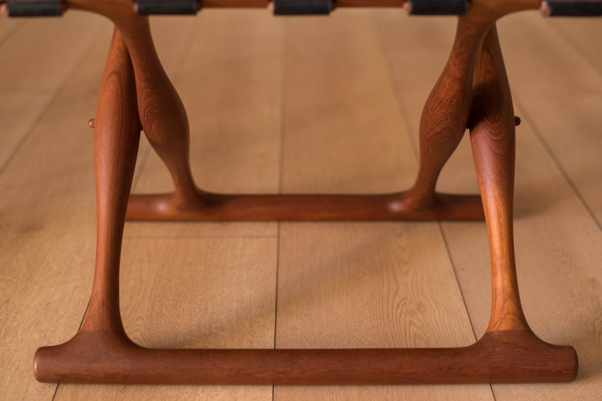 Mid century modern Gold Hill ottoman stools designed by Poul Hundevad for Vamdrup Stølefabrik. This foldable footstool is sculpted in old growth teak and displays the original black leather sling. Price is for each, one left.