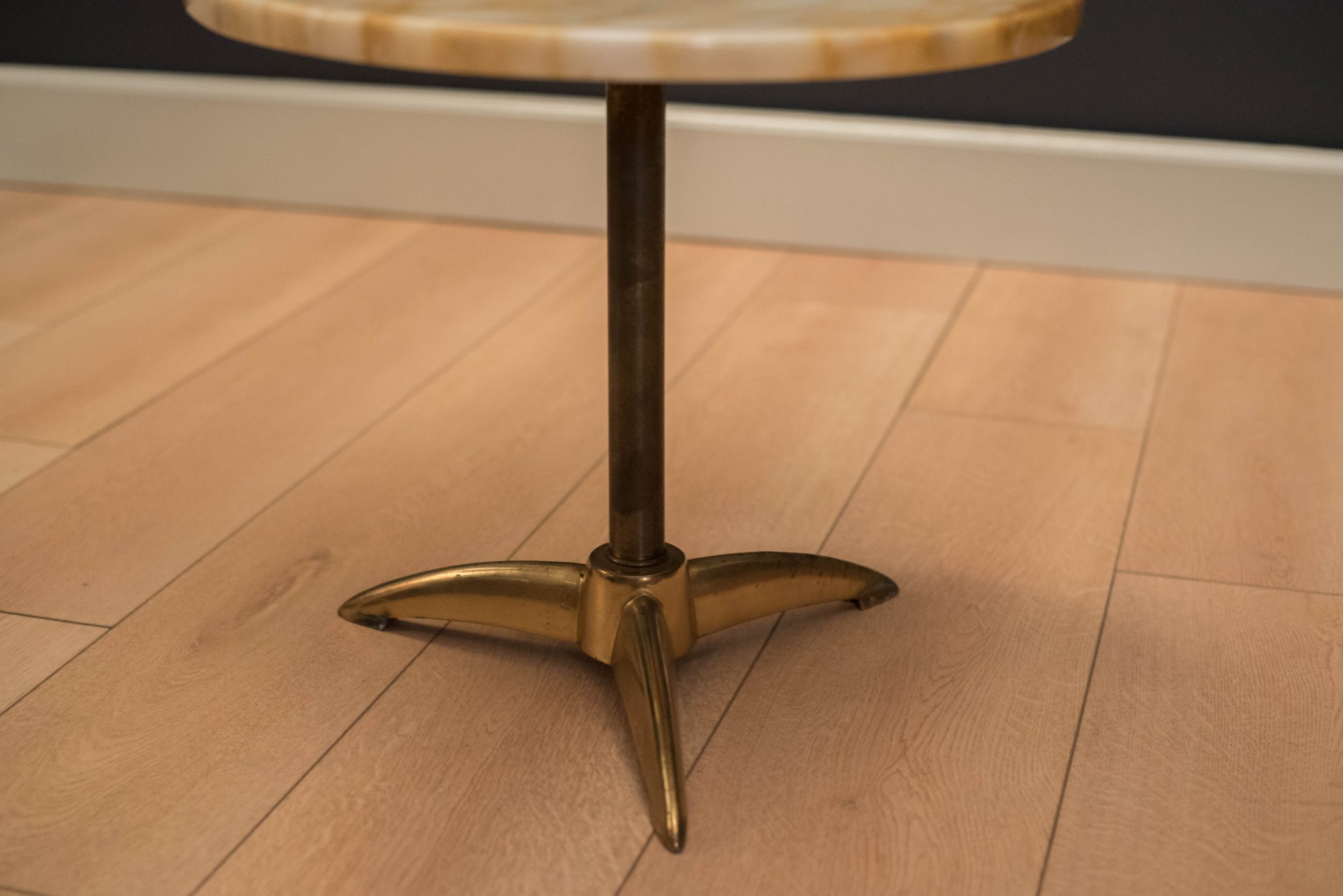 Mid-Century marble end table with brass pedestal base, circa 1960s. This piece features a round stone top with a white and neutral tone grain pattern marked made in Italy.