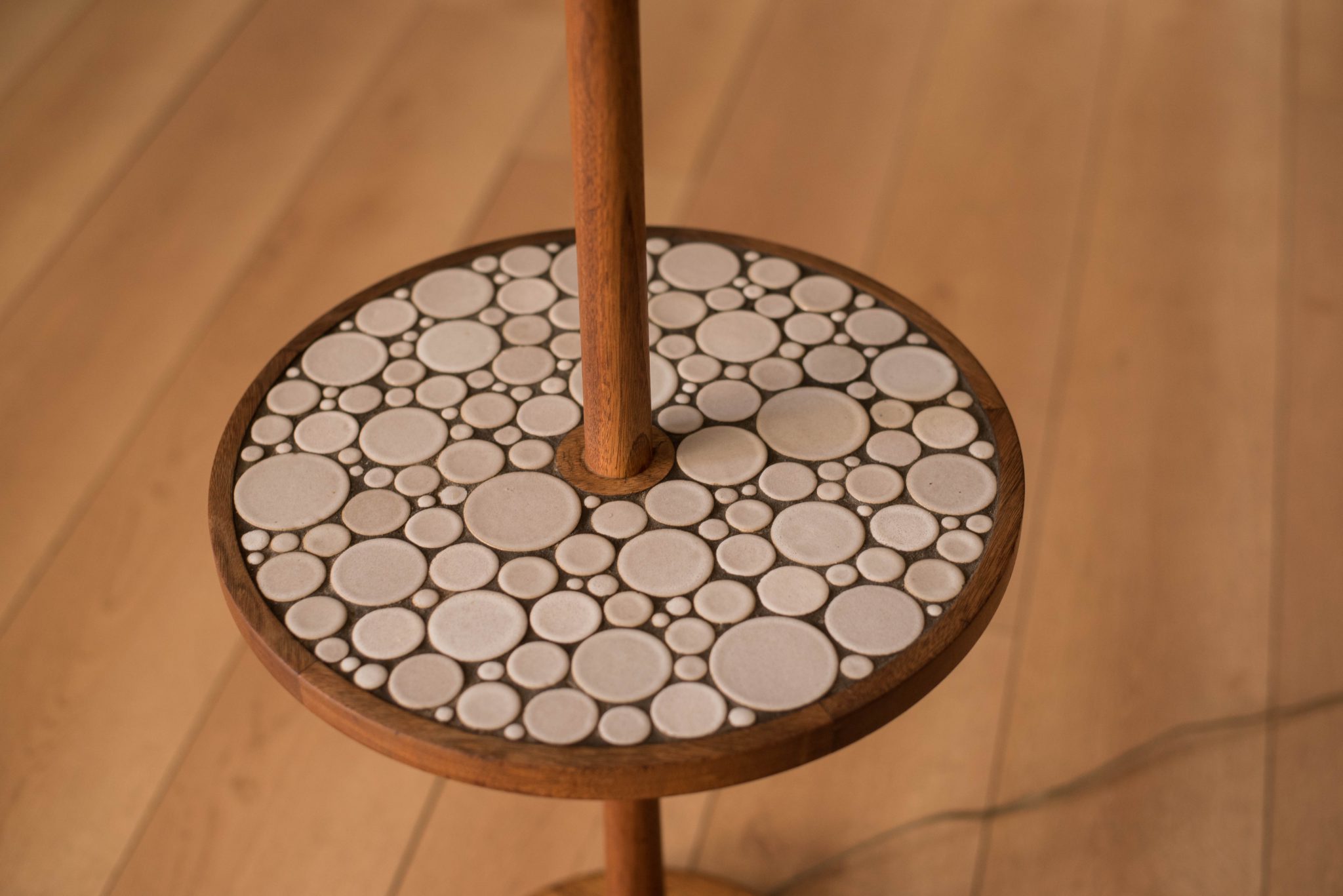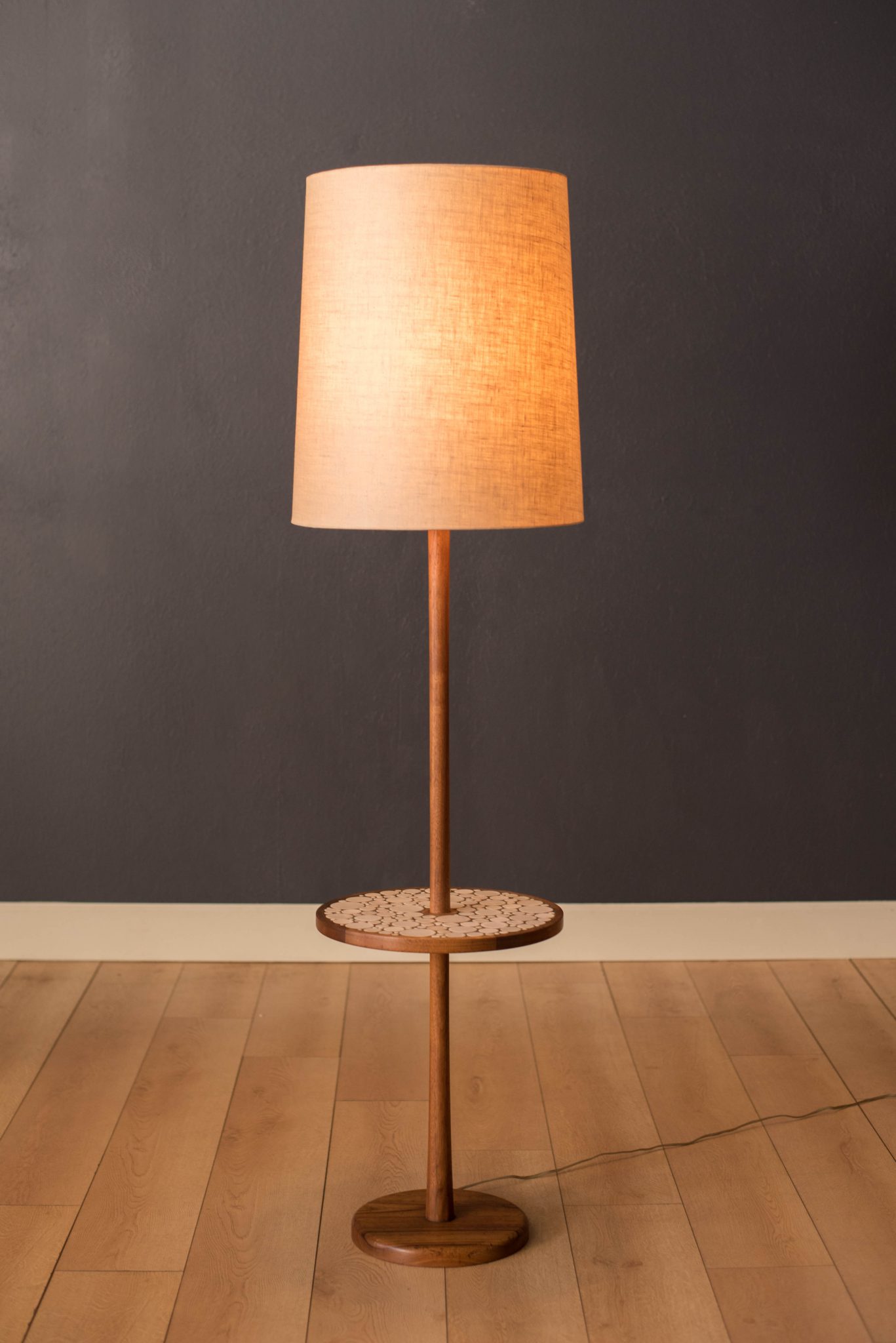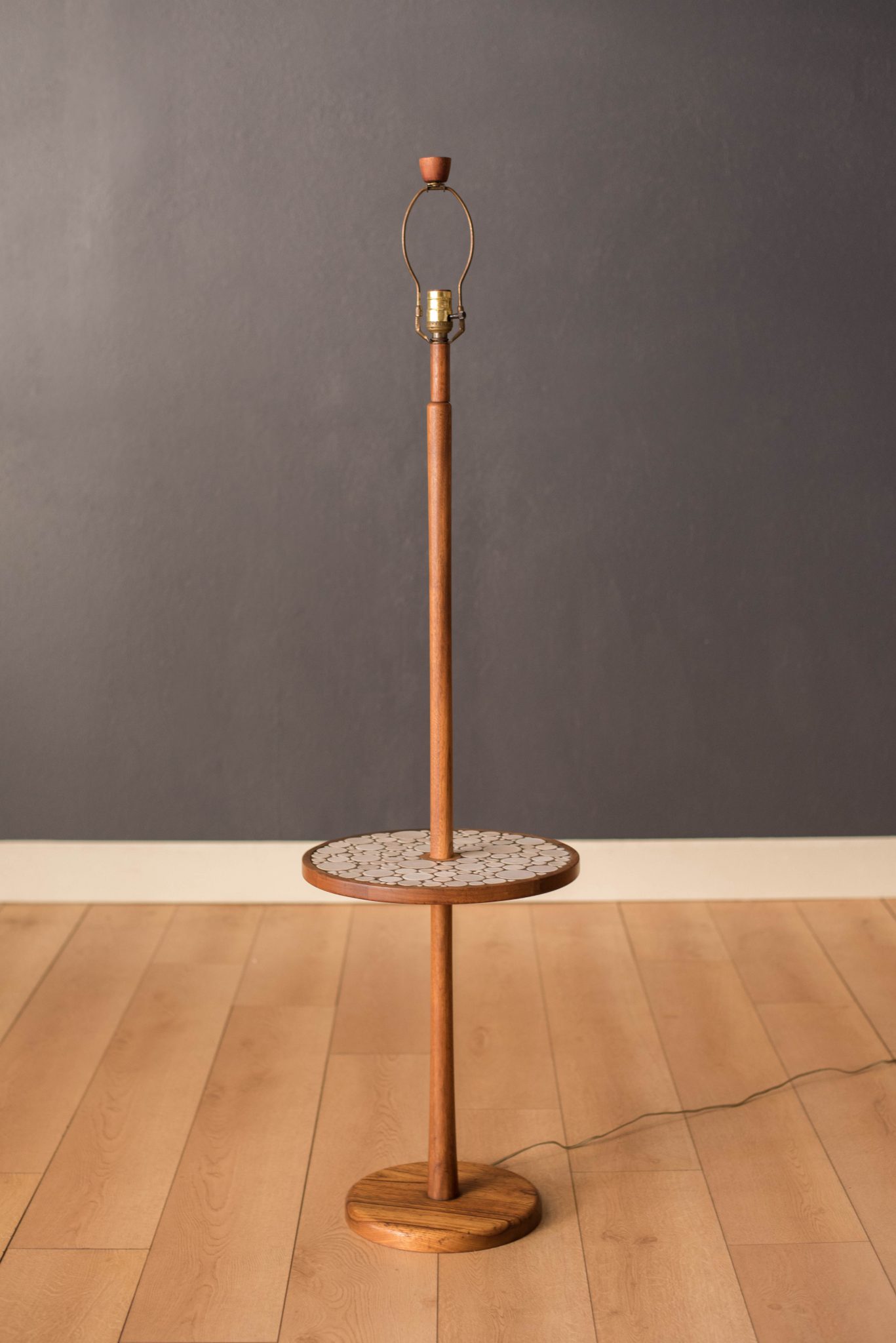 Mid century modern floor lamp with attached round side table designed by Jane and Gordon Martz for Marshall Studios. This versatile piece features a walnut base and unique inlay of ceramic tile including signature Martz details. Lamp shade is not included.