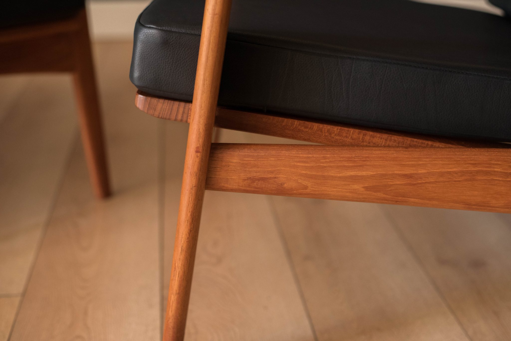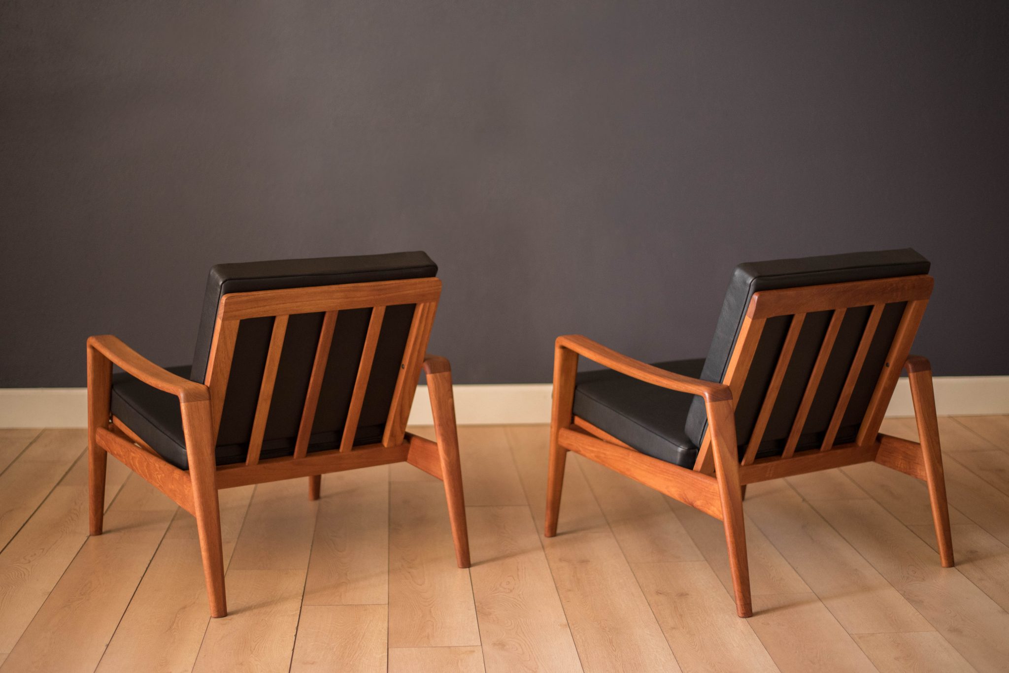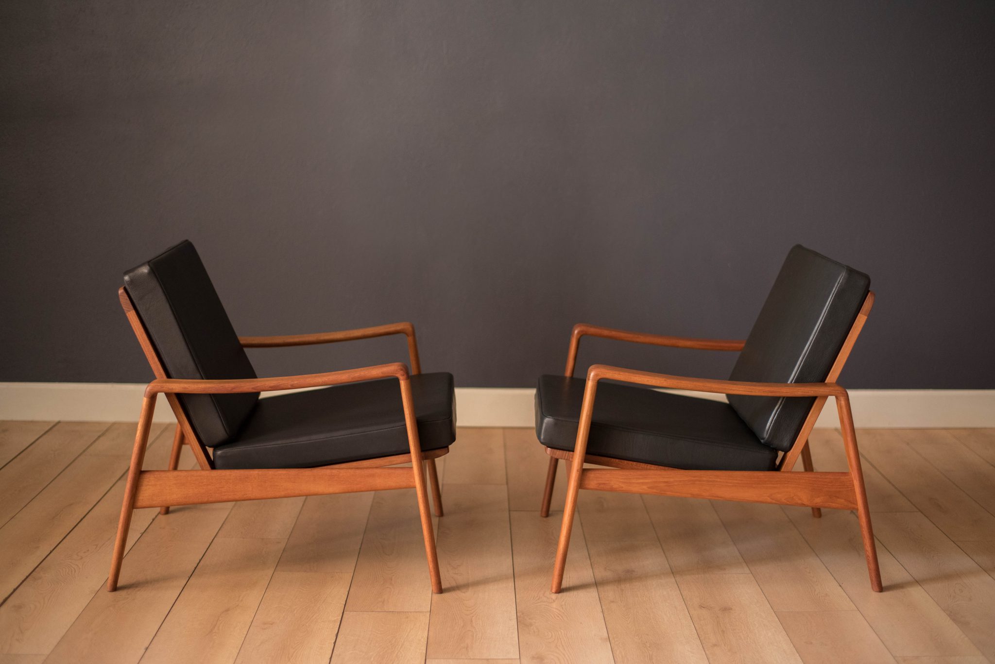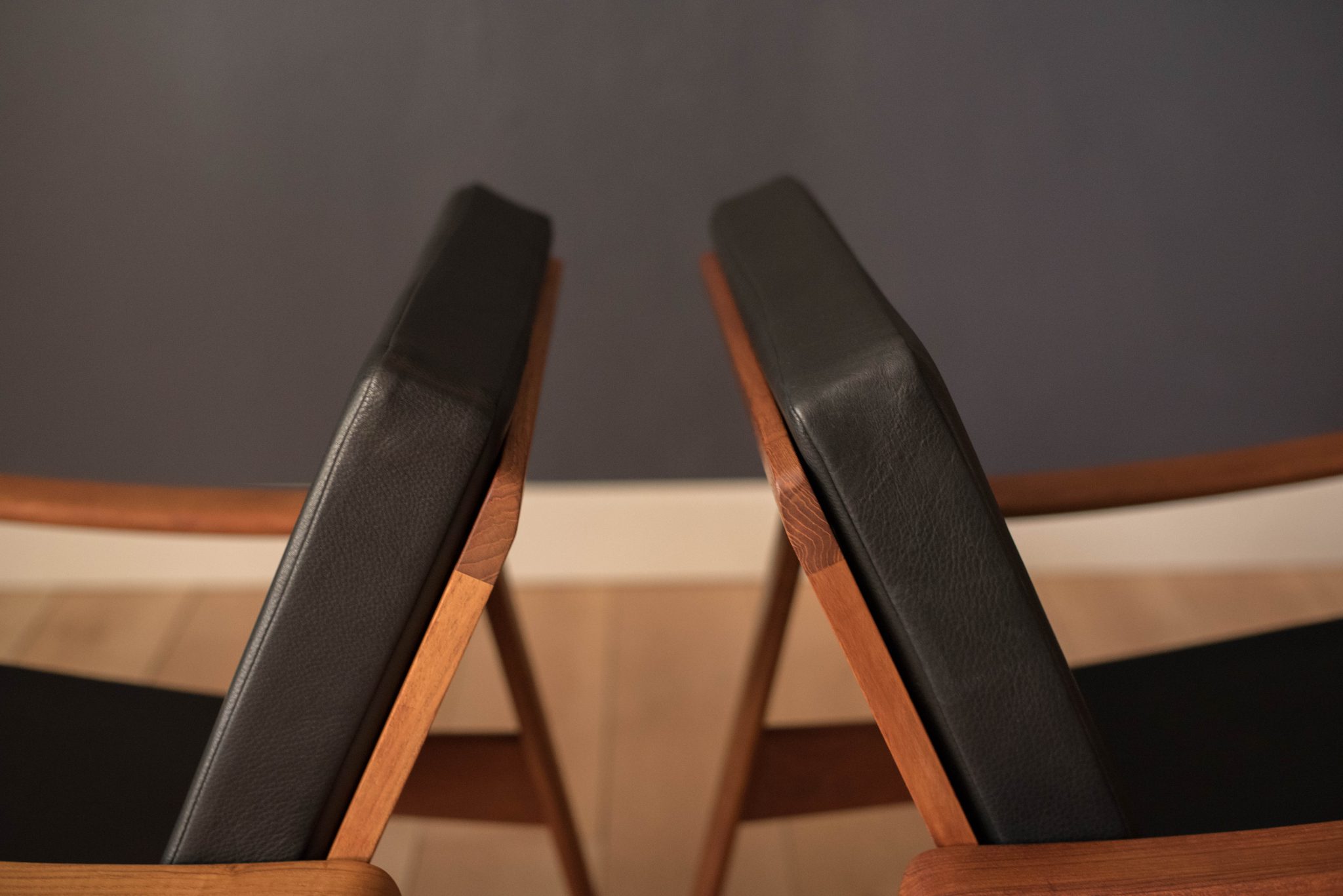 Mid-Century Modern pair of easy lounge chairs in teak designed by Arne Wahl Iversen for Komfort, Denmark. This set includes brand new foam seats and black leather. Sculptural modern teak frames can be displayed at any angle with a unique tapered angular base. Price is for the pair.