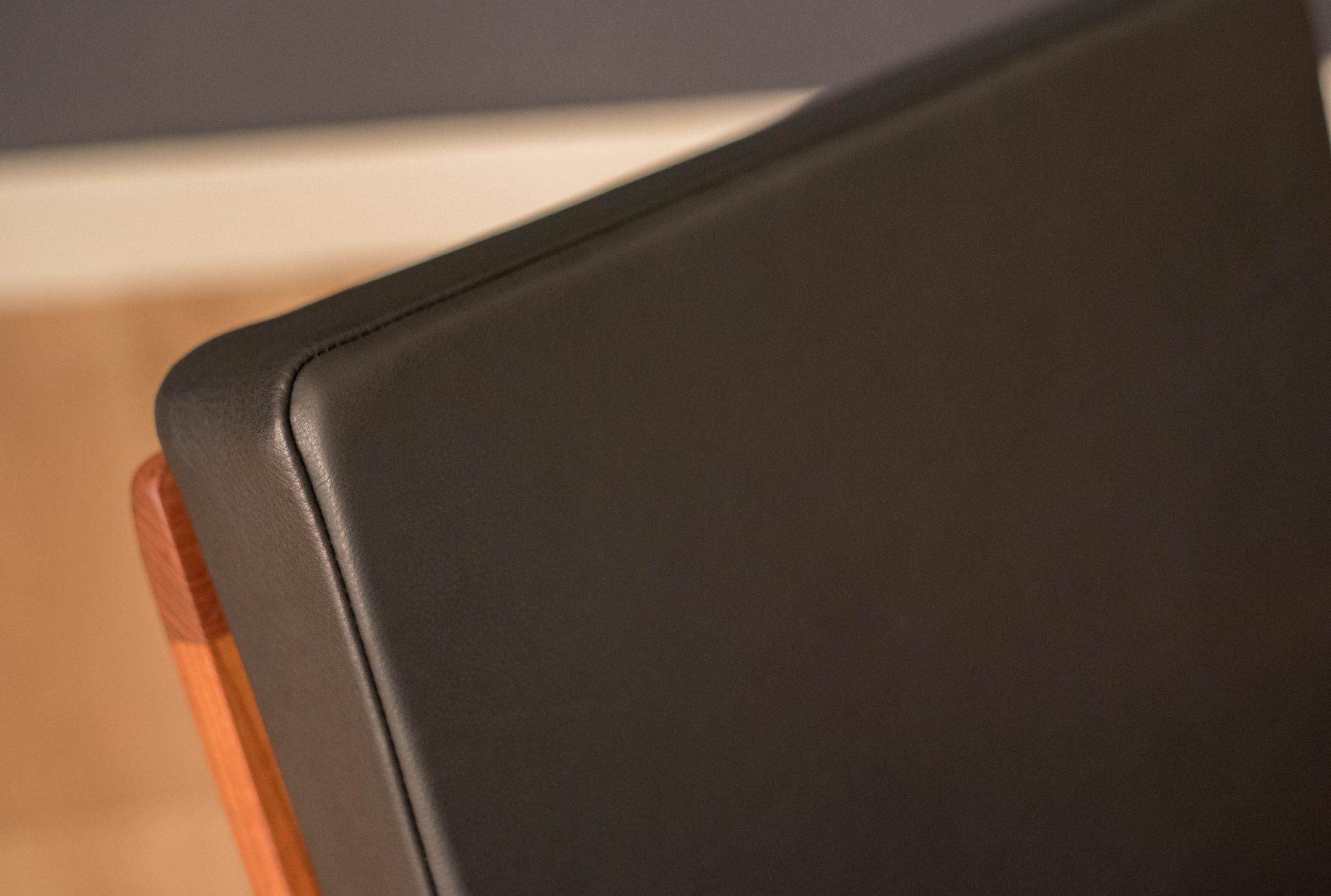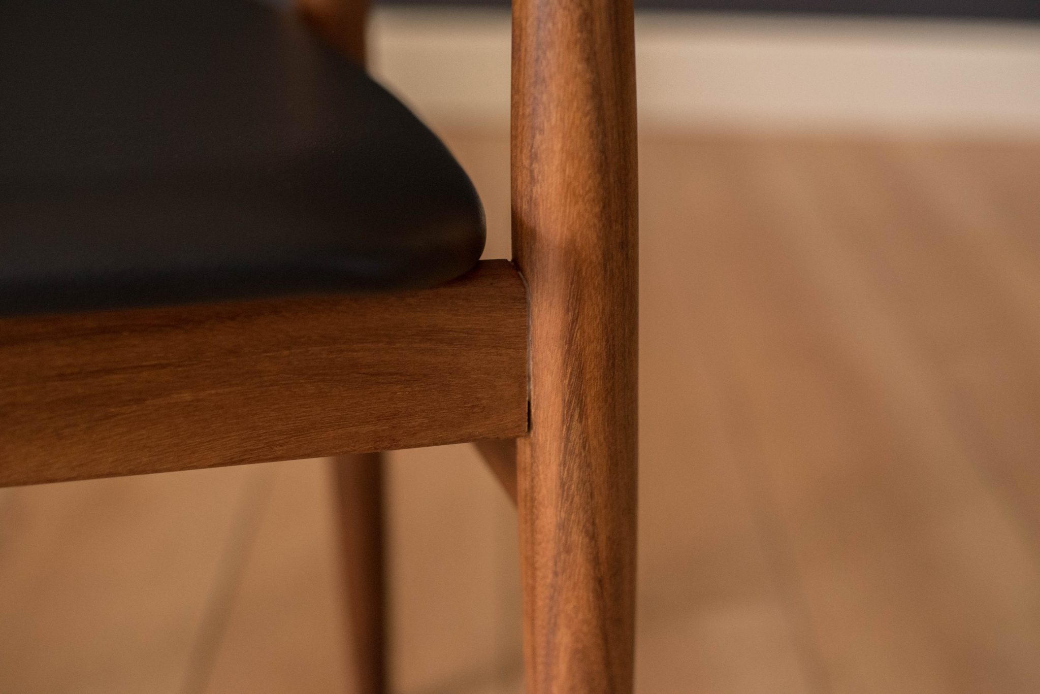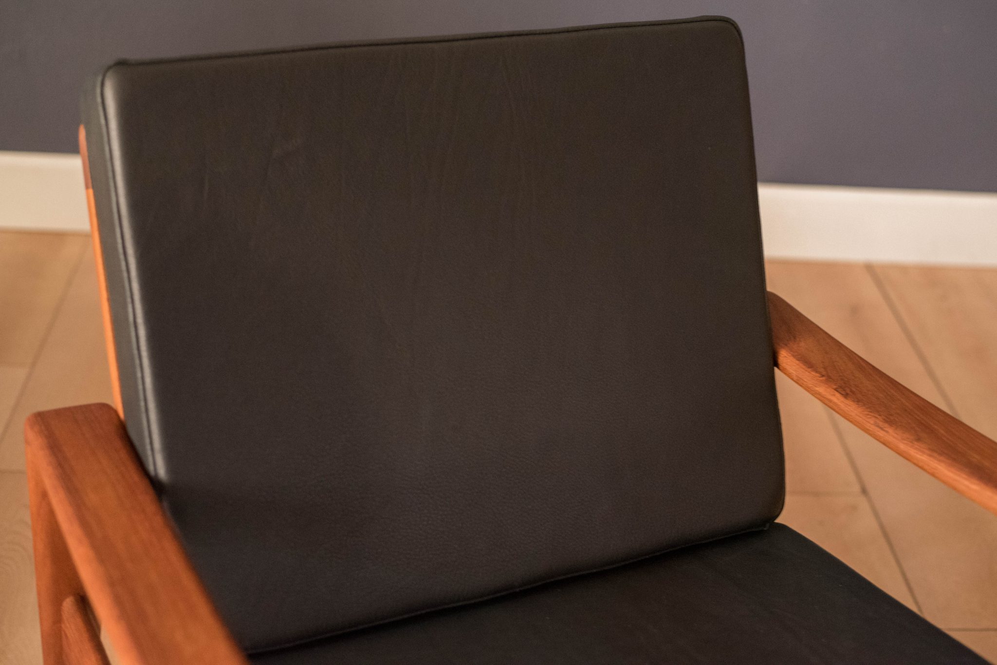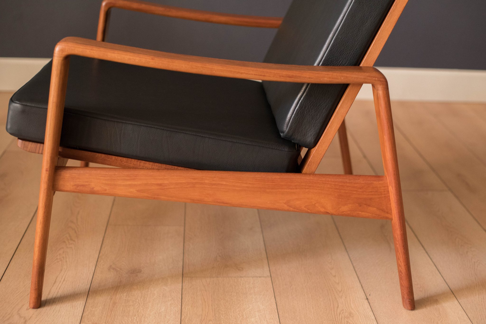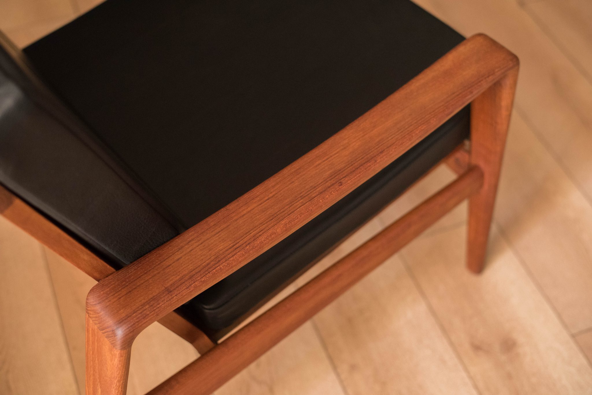 Mid-Century Modern pair of easy lounge chairs in teak designed by Arne Wahl Iversen for Komfort, Denmark. This set includes brand new foam seats and black leather. Sculptural modern teak frames can be displayed at any angle with a unique tapered angular base. Price is for the pair.