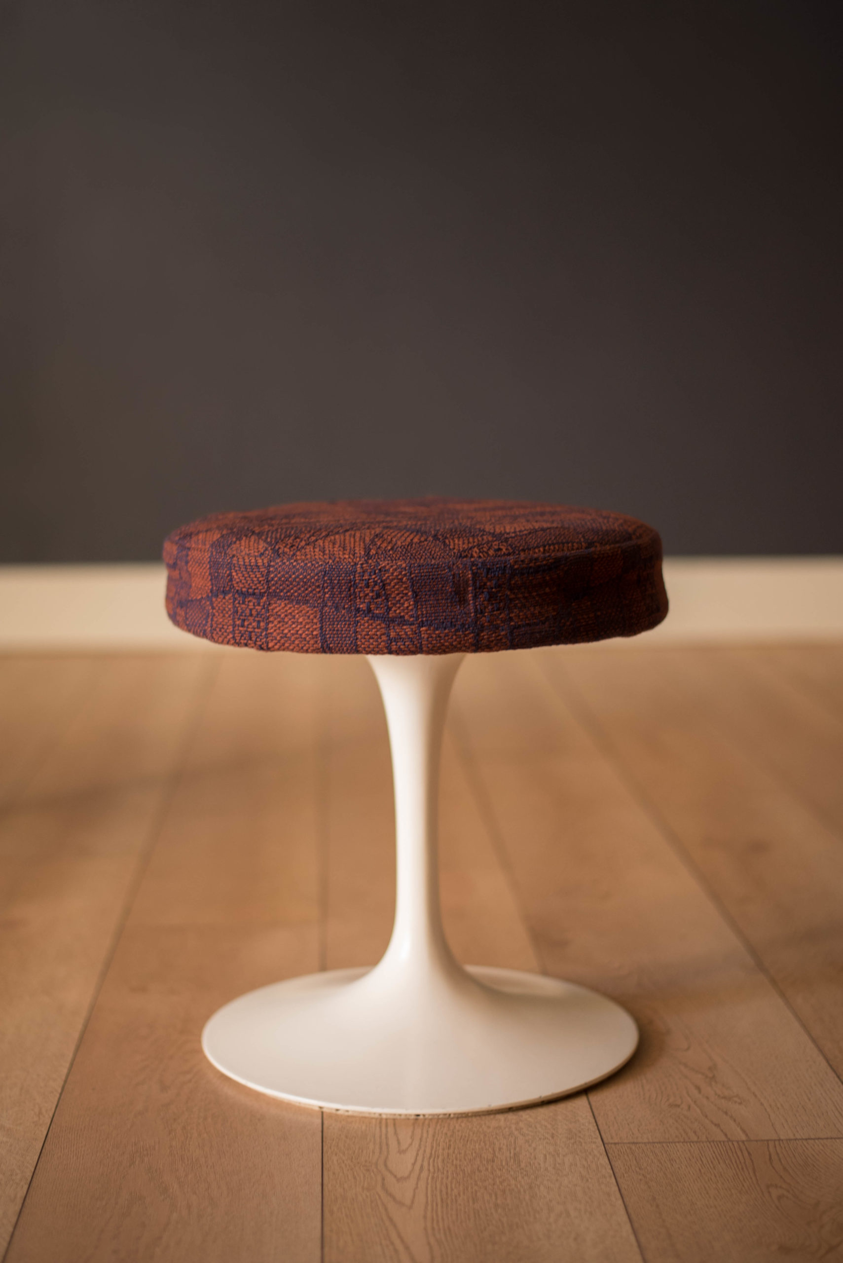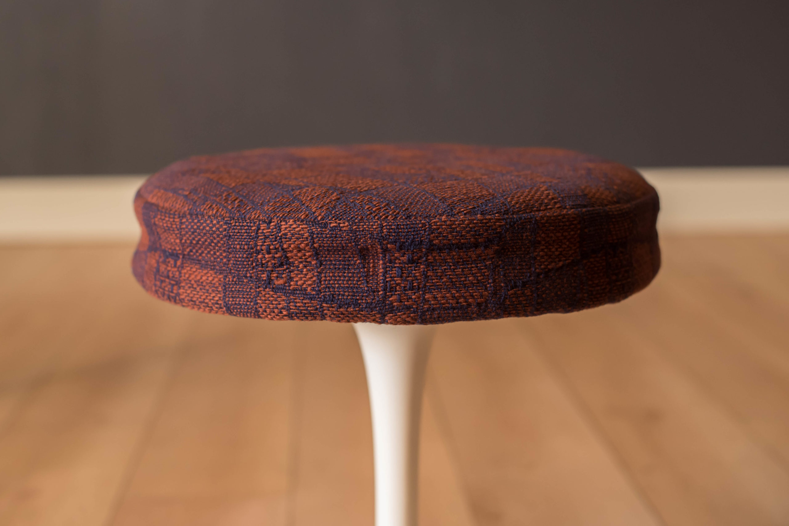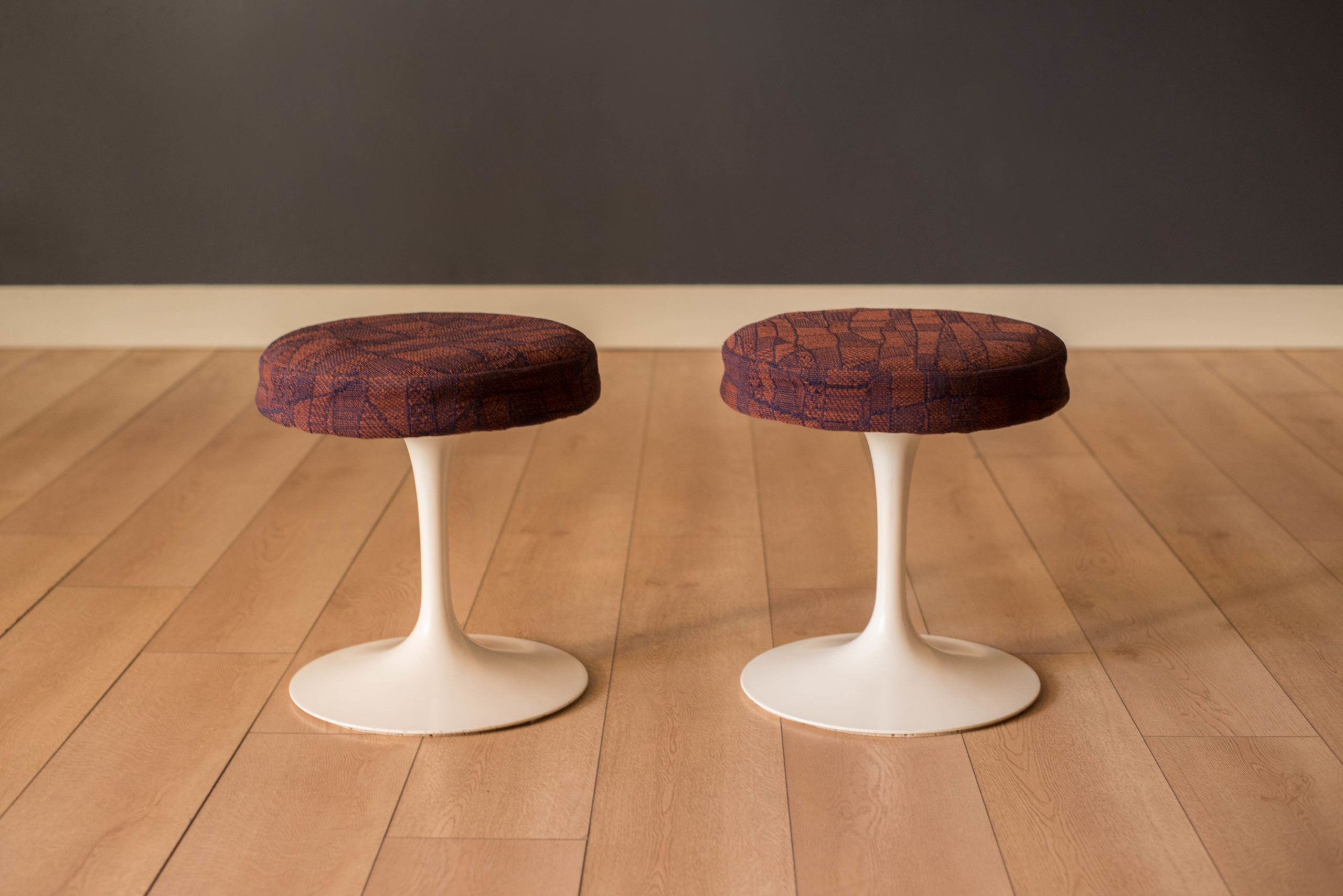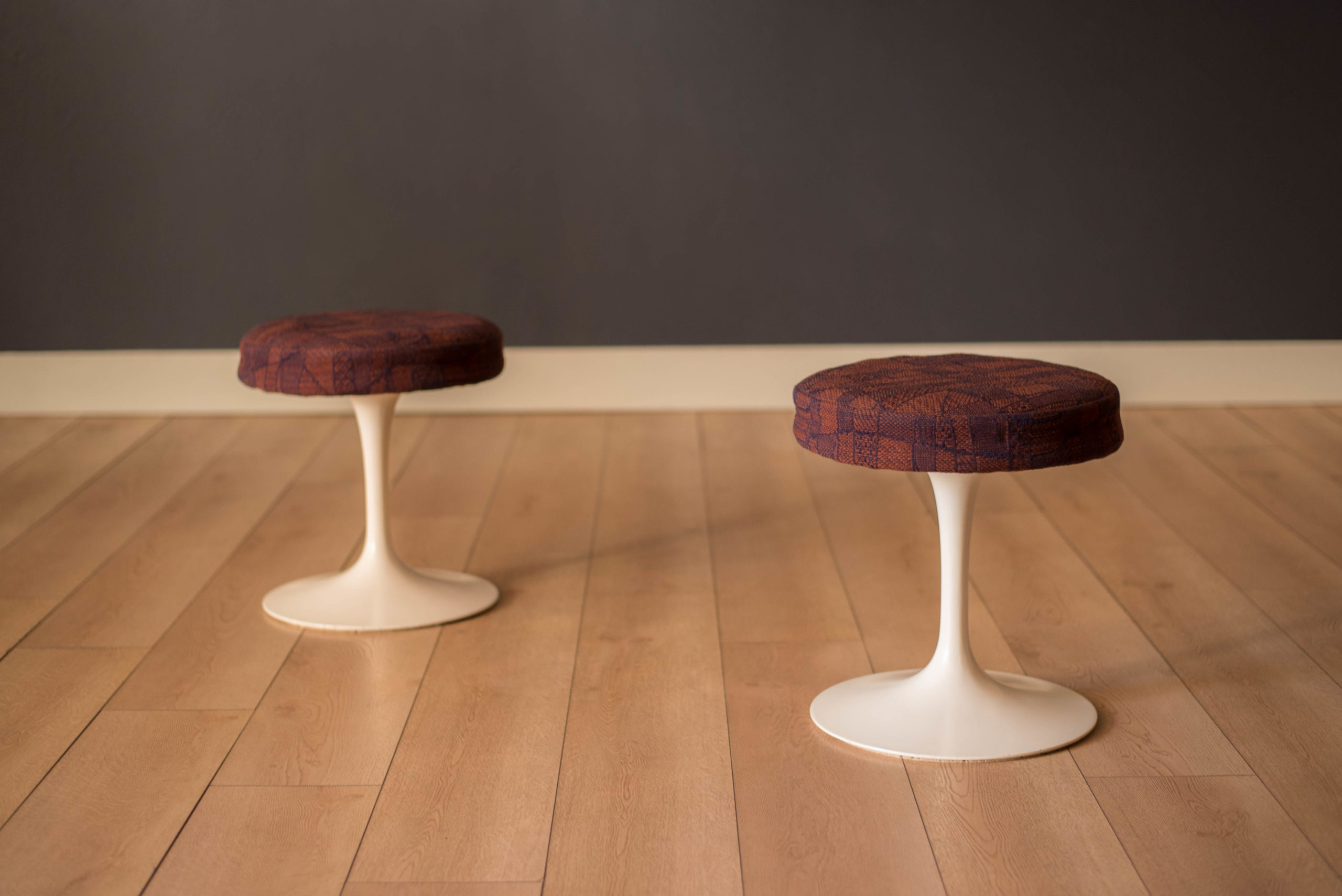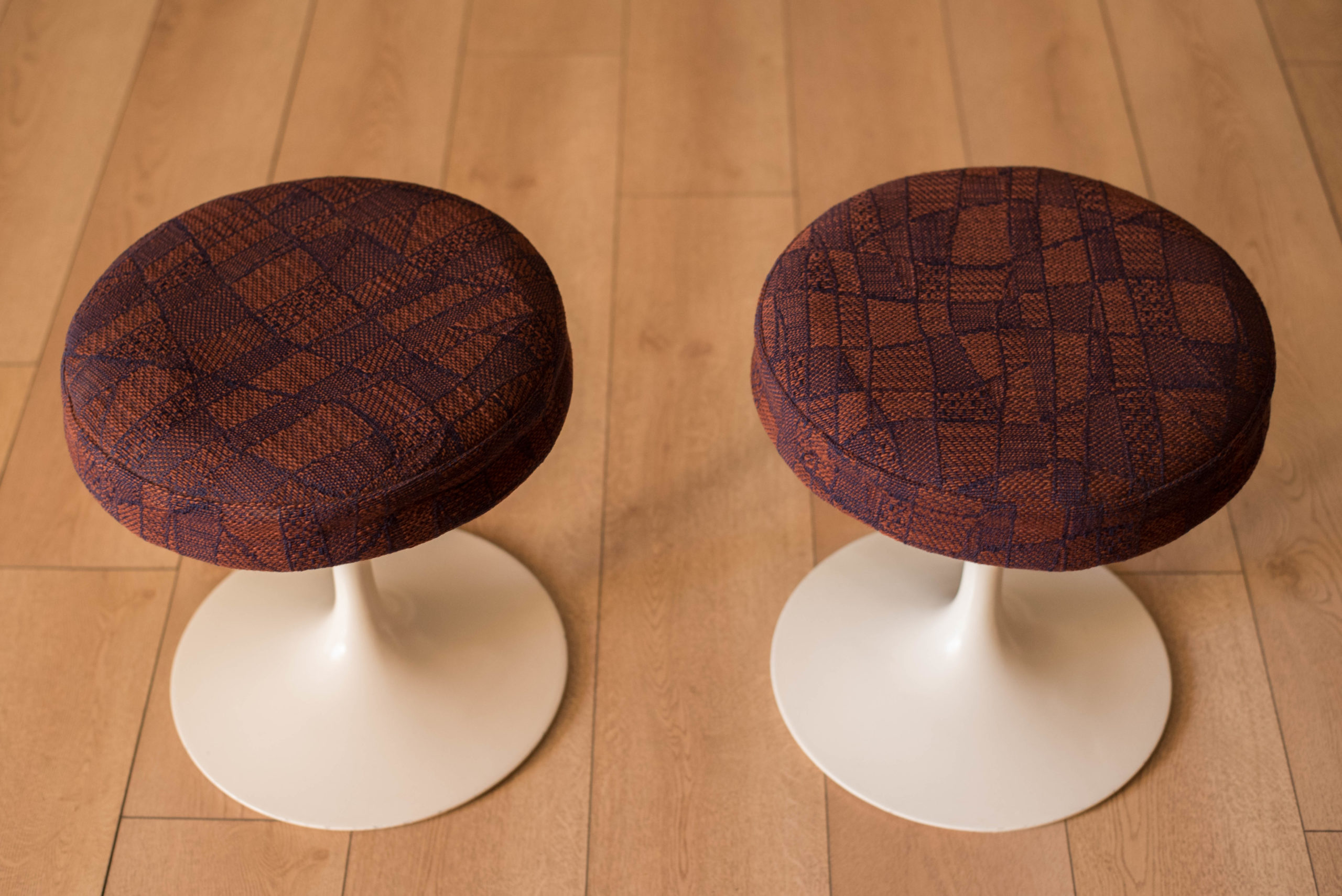 Mid-Century Modern pair of tulip stools designed by Eero Saarinen for Knoll circa 1980’s. This versatile set features heavy cast aluminum tulip bases and round swivel seats in an abstract textured fabric.