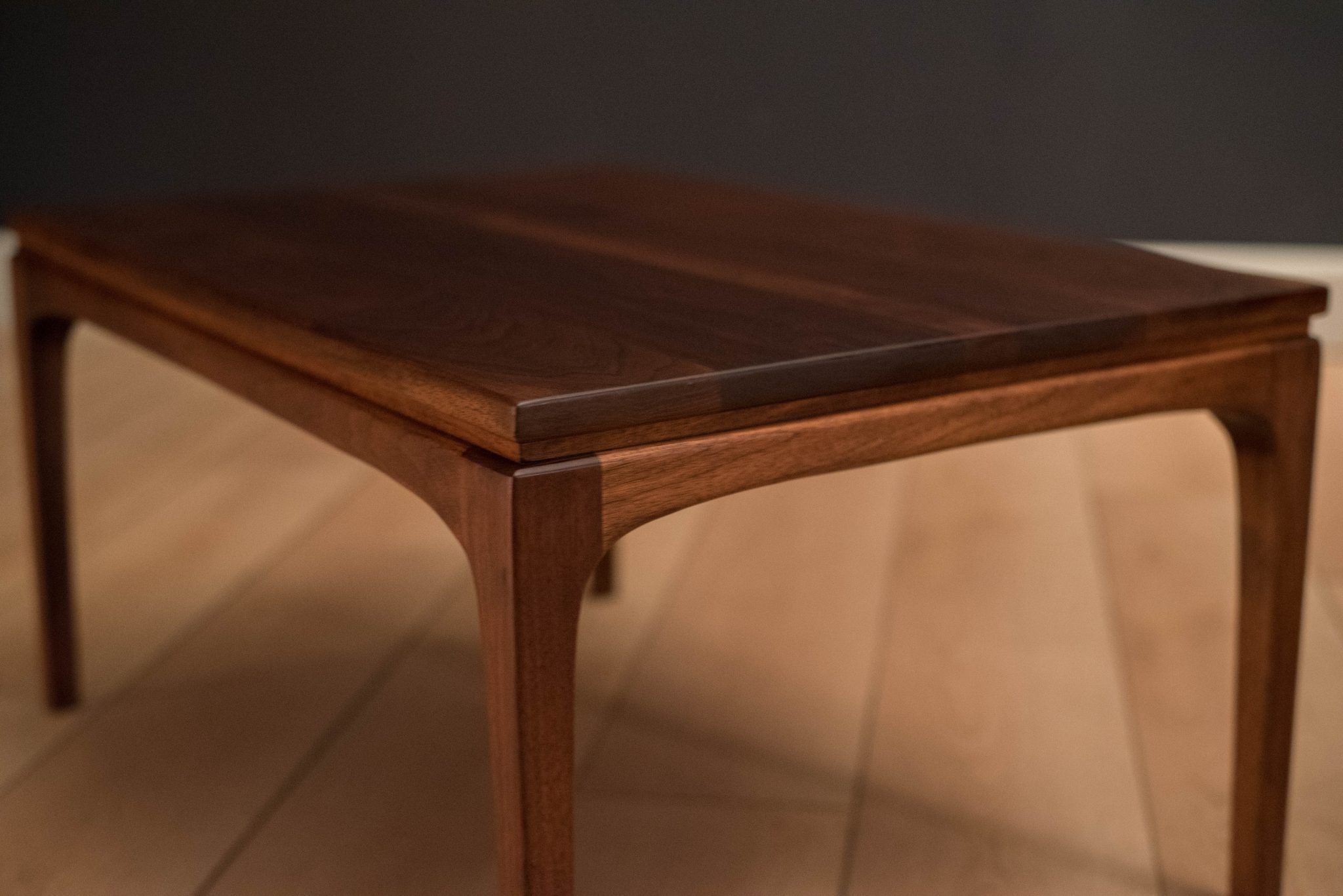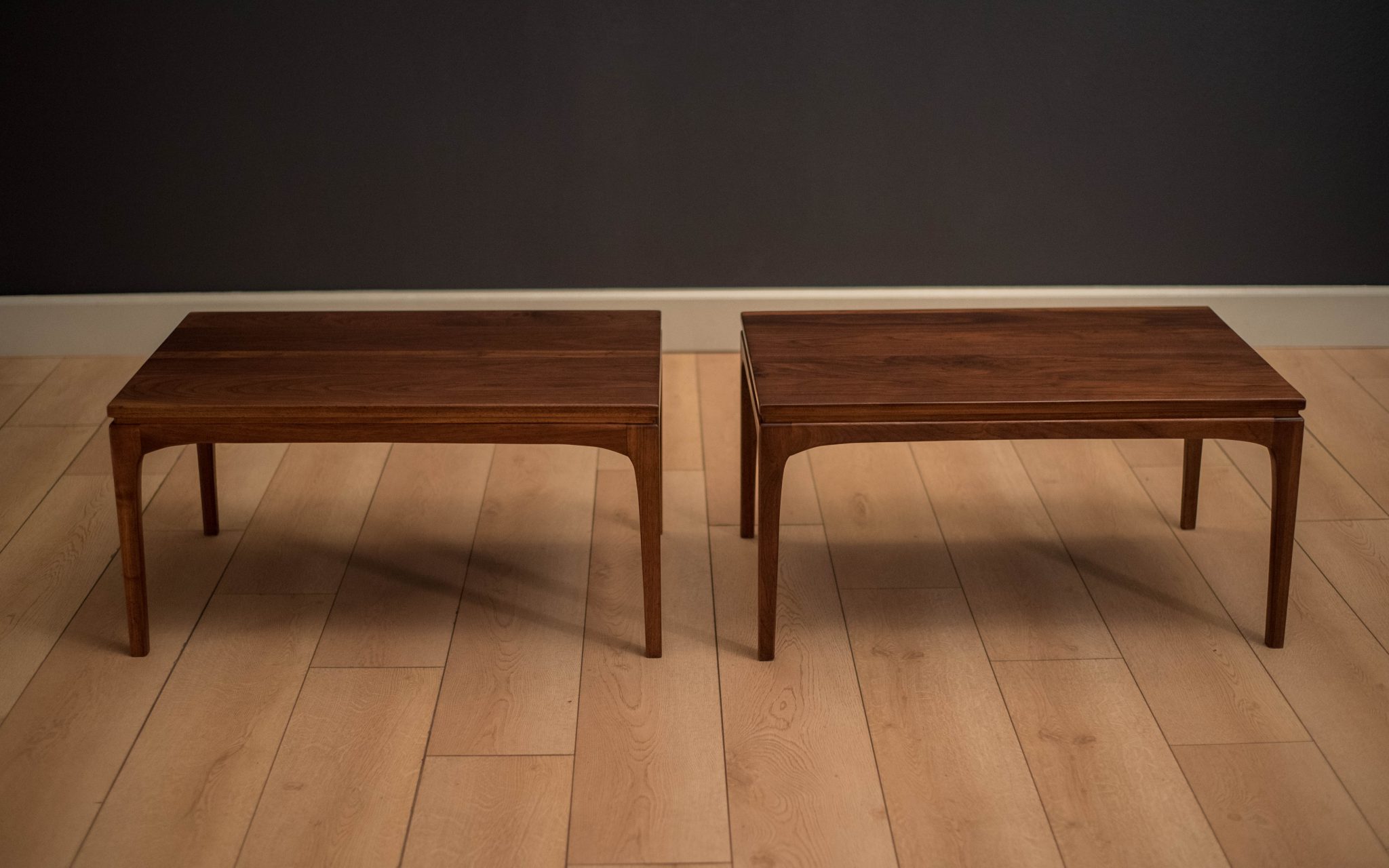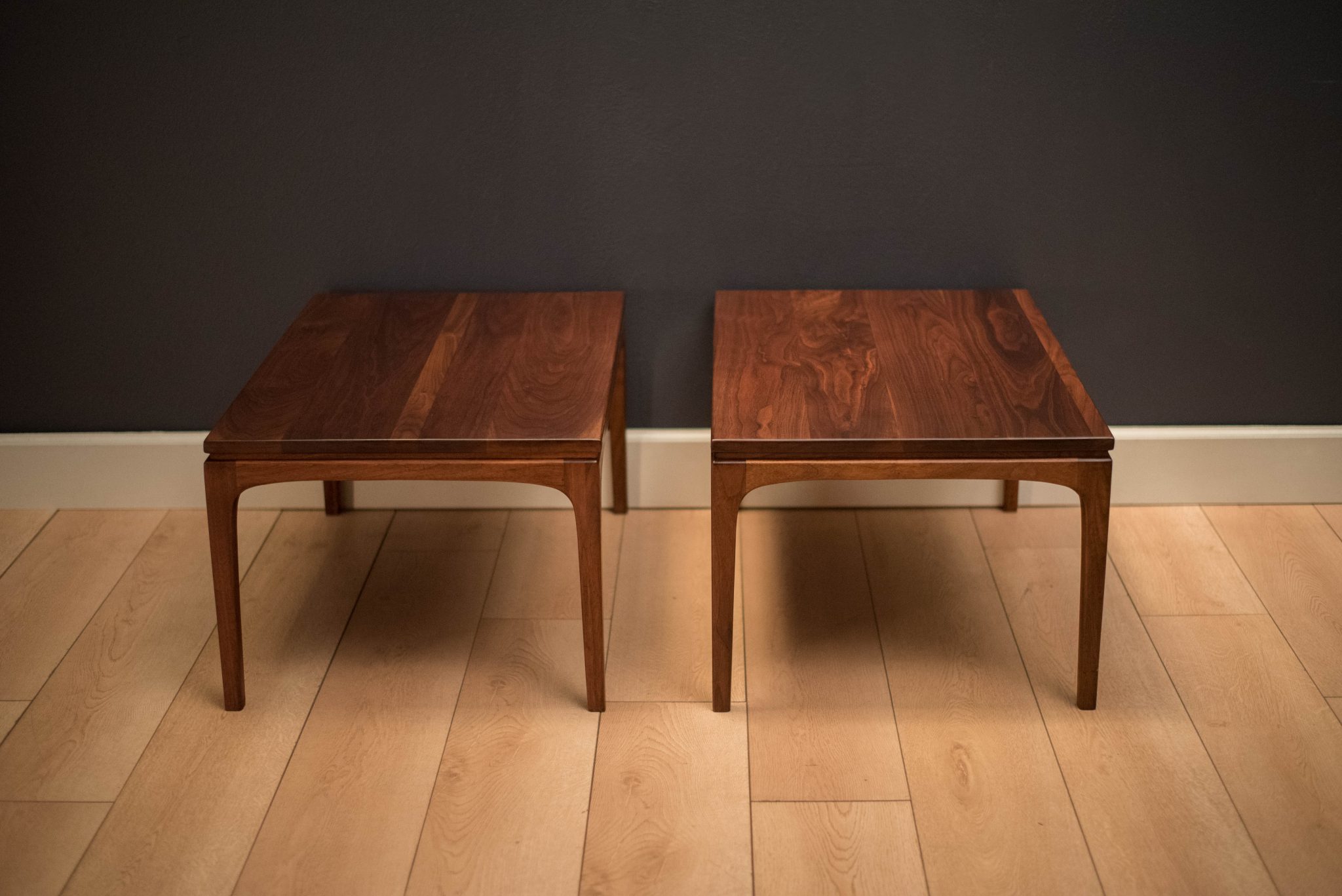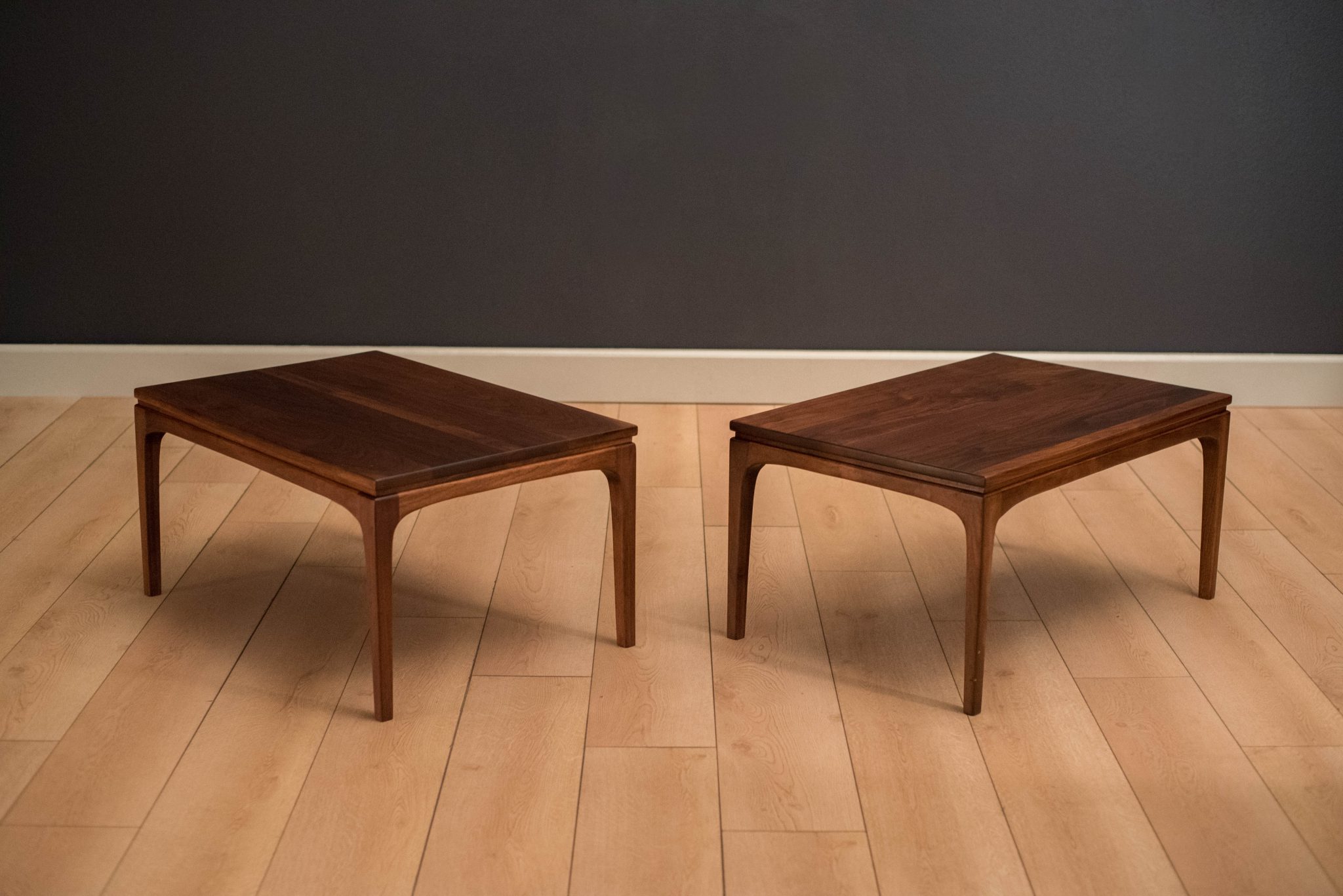 Mid-Century Modern pair of side tables by ACE-HI of California. This set features a solid planked walnut rectangular top with tapered legs. Matching coffee table also available in separate listing.