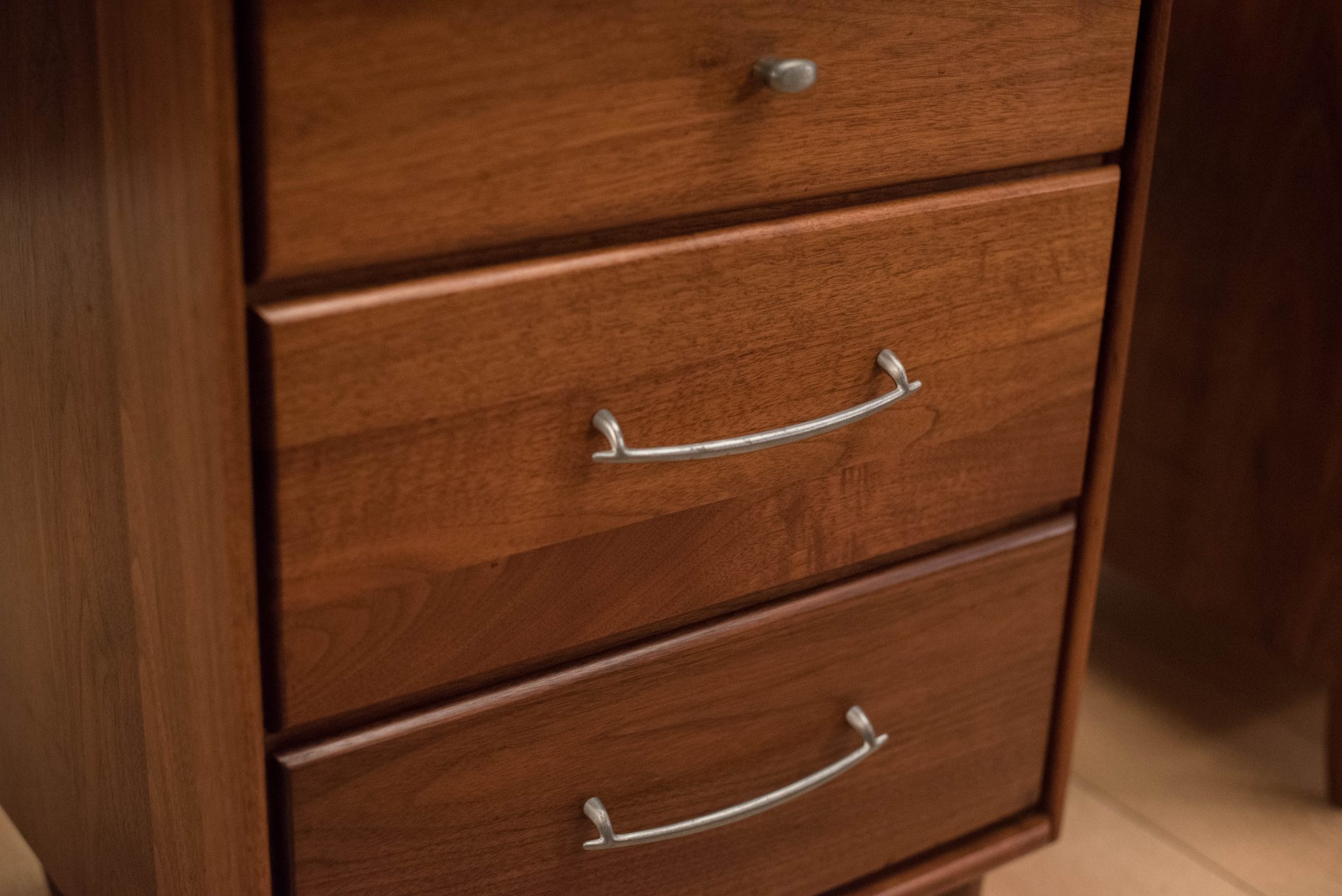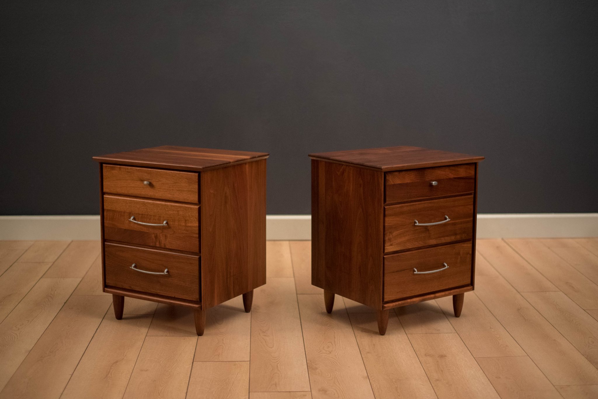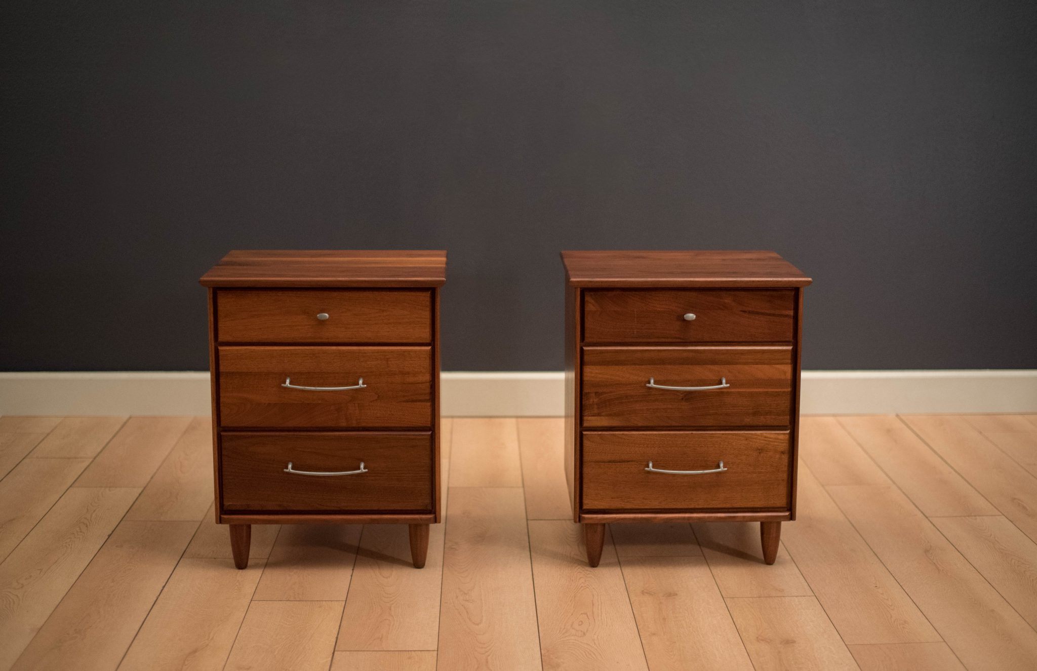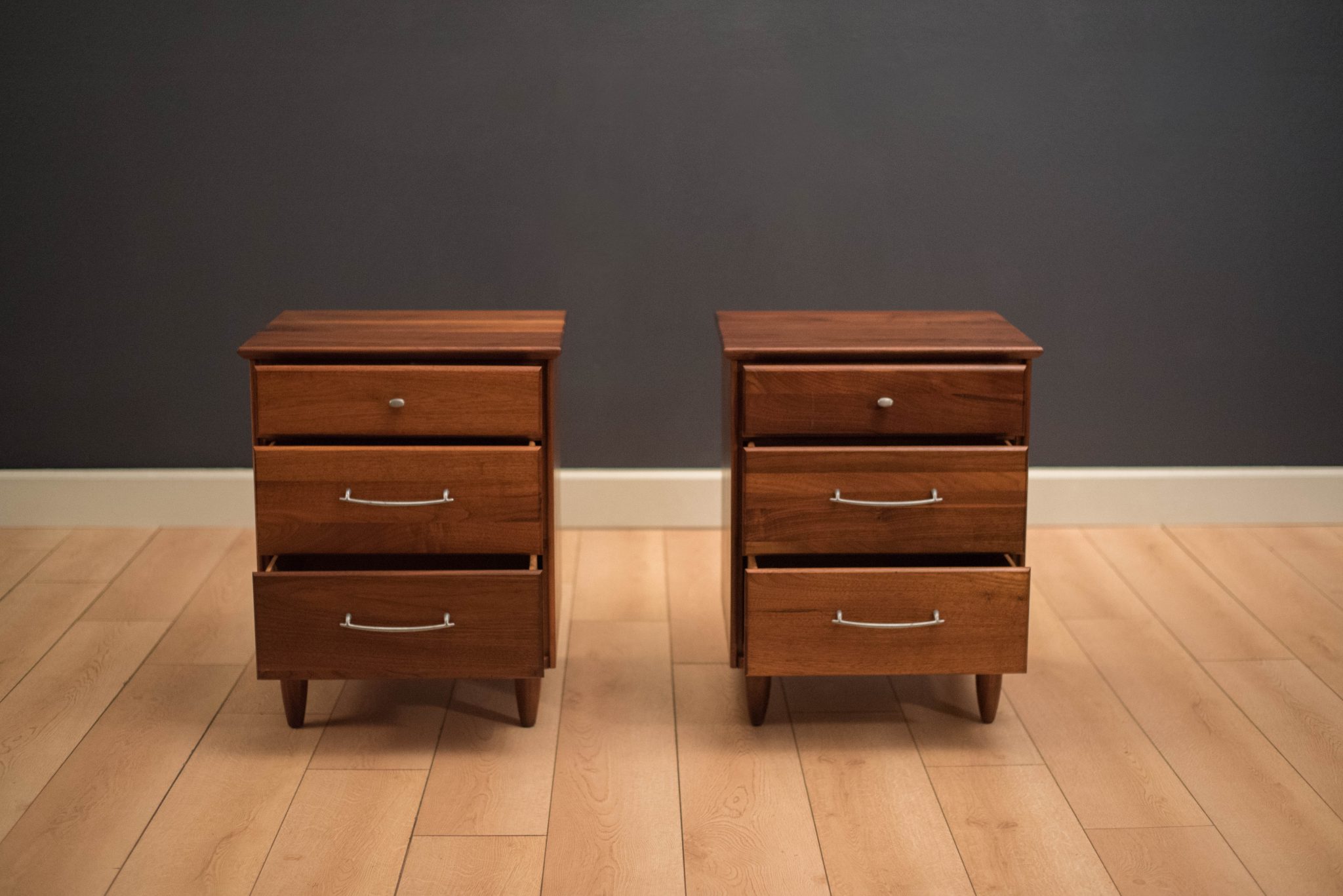 Mid-Century Modern pair of nightstands or bedside tables by ACE-HI of California. This set is made of solid planked walnut and includes three storage drawers with pewter handles. Matching coffee table and pair of end tables available in separate listings.