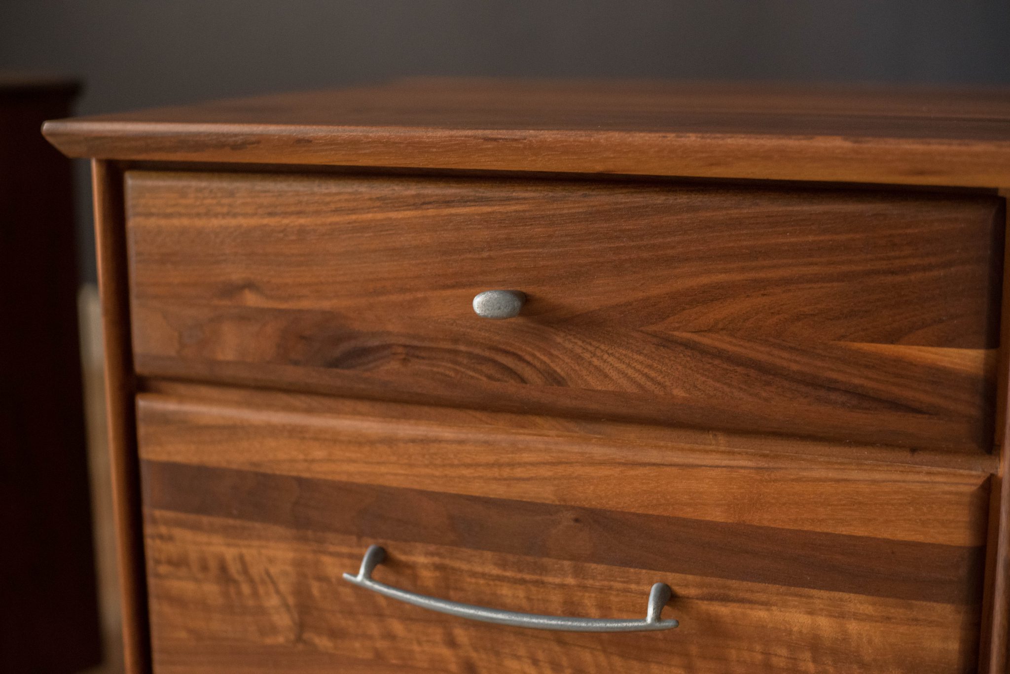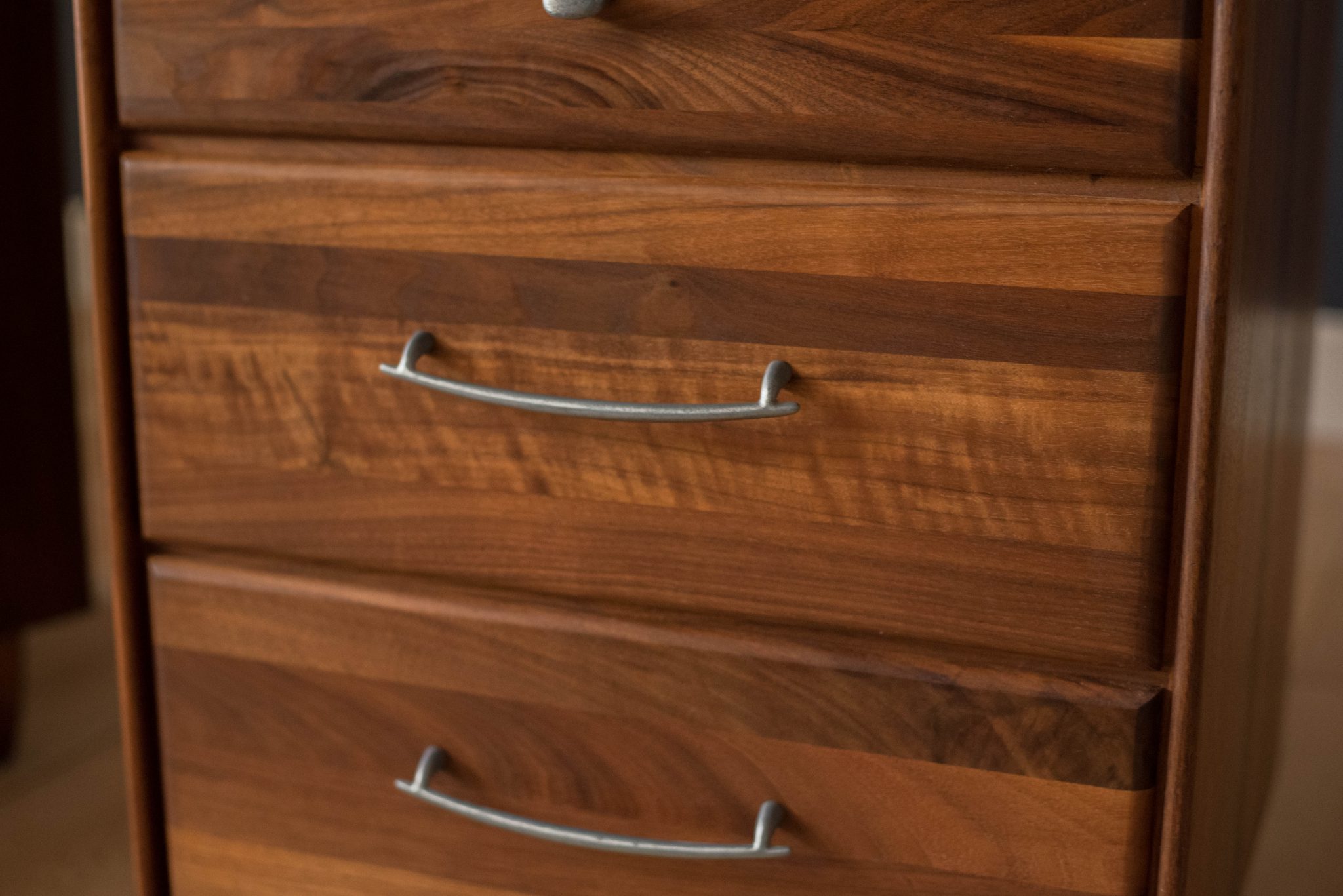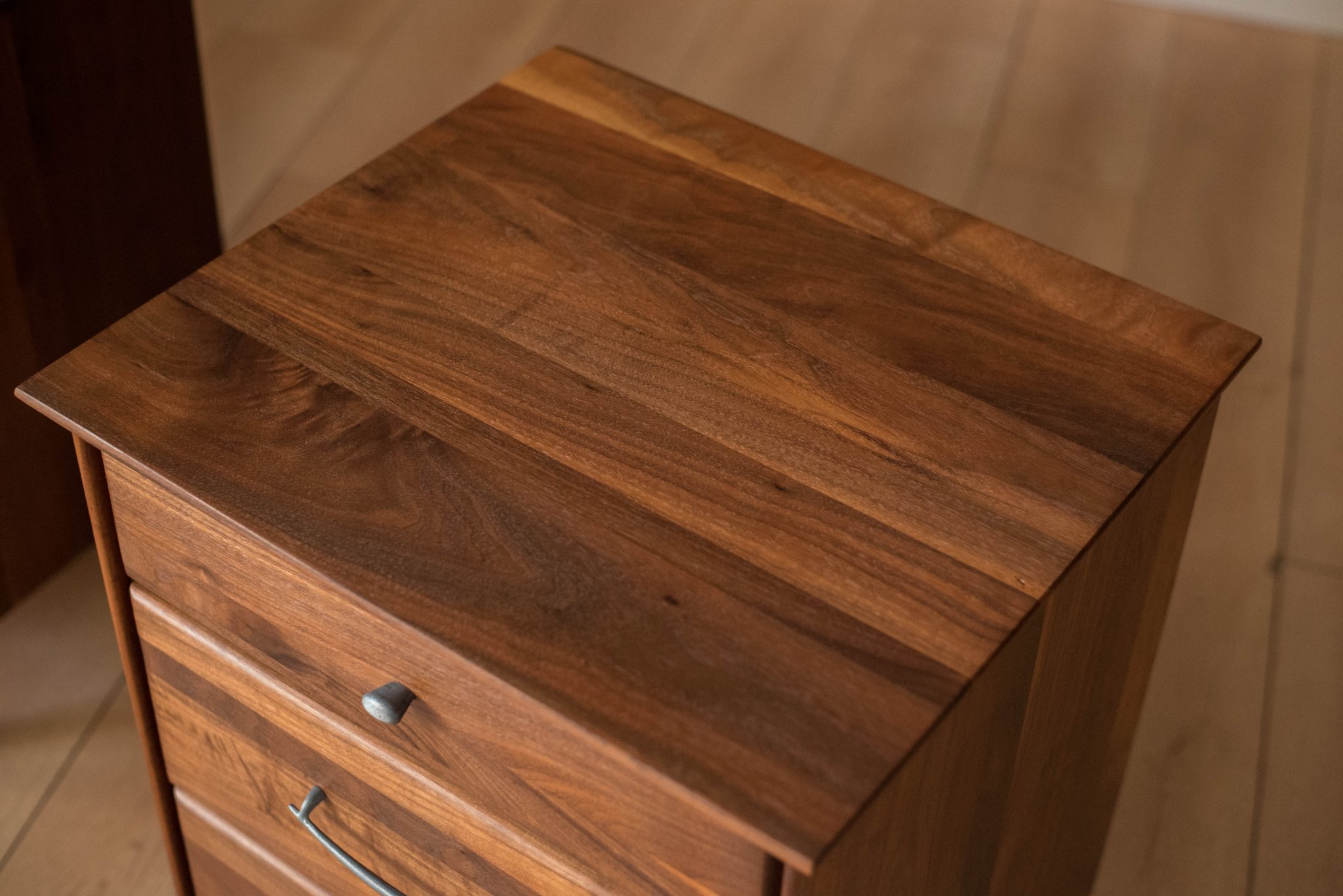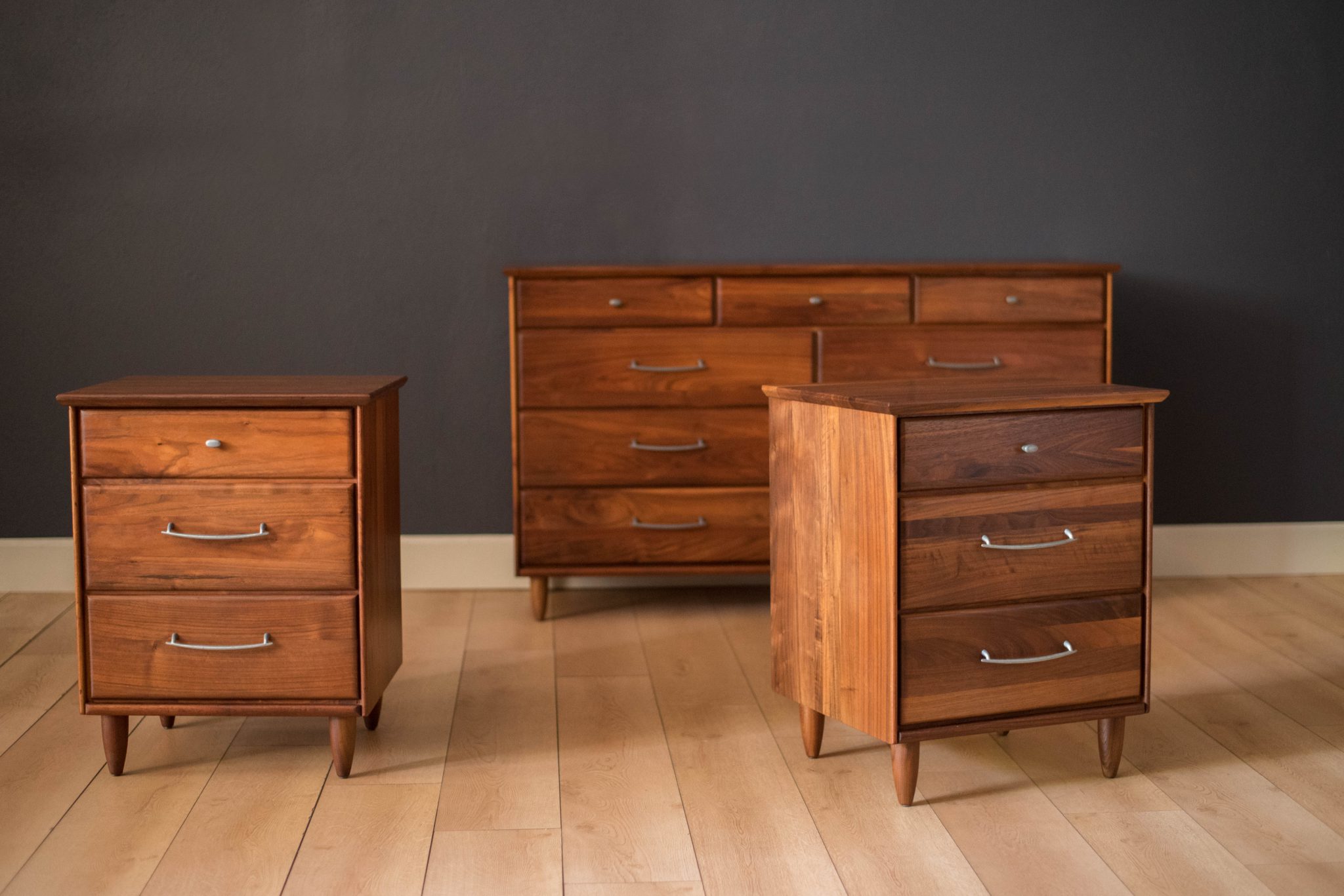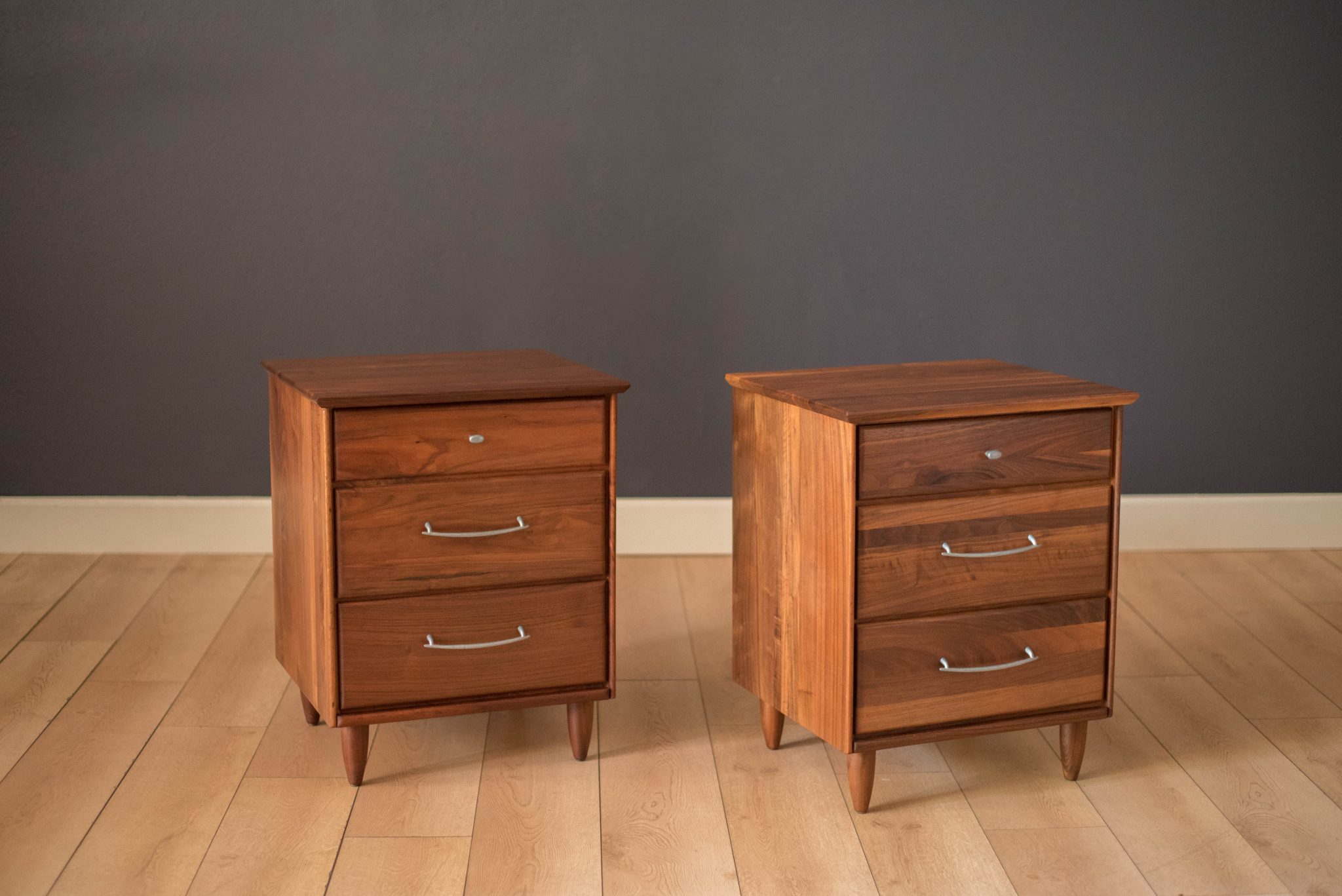 Mid-Century Modern pair of nightstands or bedside tables by ACE-HI Furniture, California. This set is made of solid planked walnut and includes three storage drawers with pewter handles. Price is for the pair.