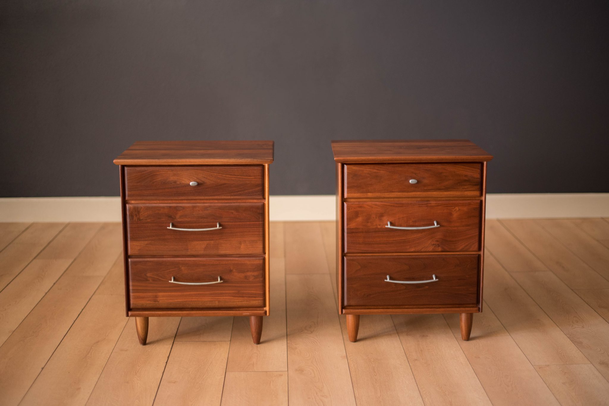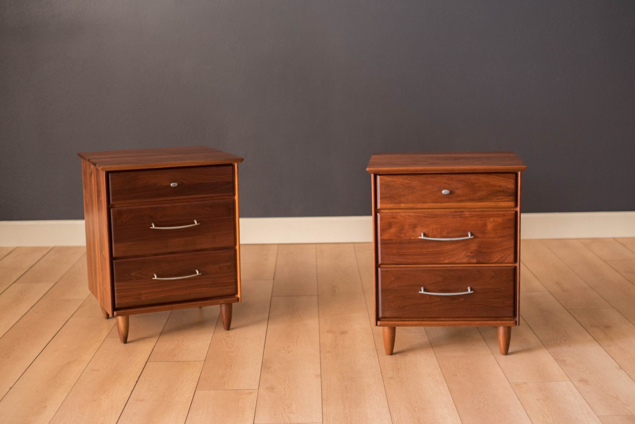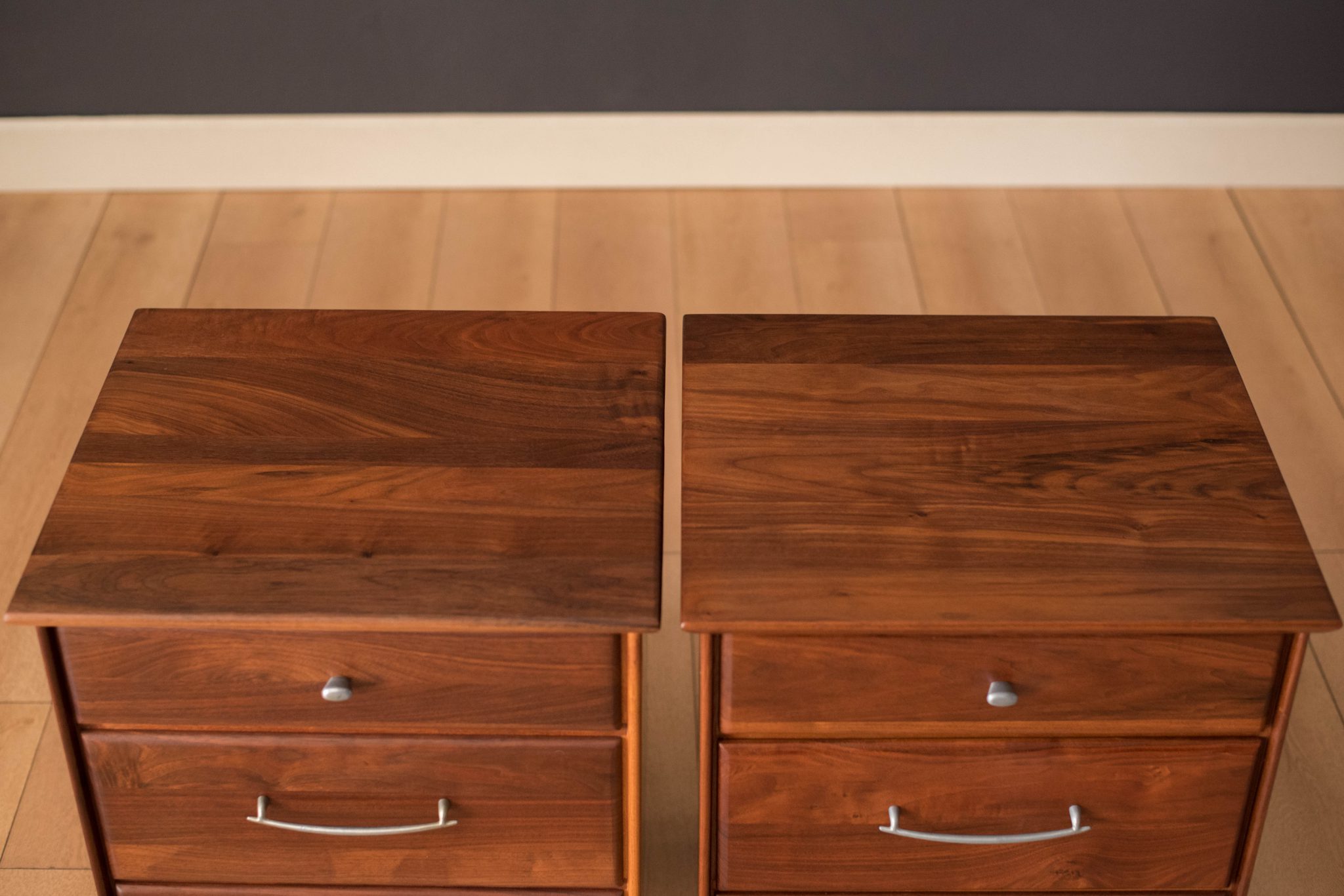 Mid-Century Modern pair of nightstands or bedside tables by ACE-HI Furniture, California. This set is made of solid planked walnut and includes three storage drawers with pewter handles. Price is for the pair.