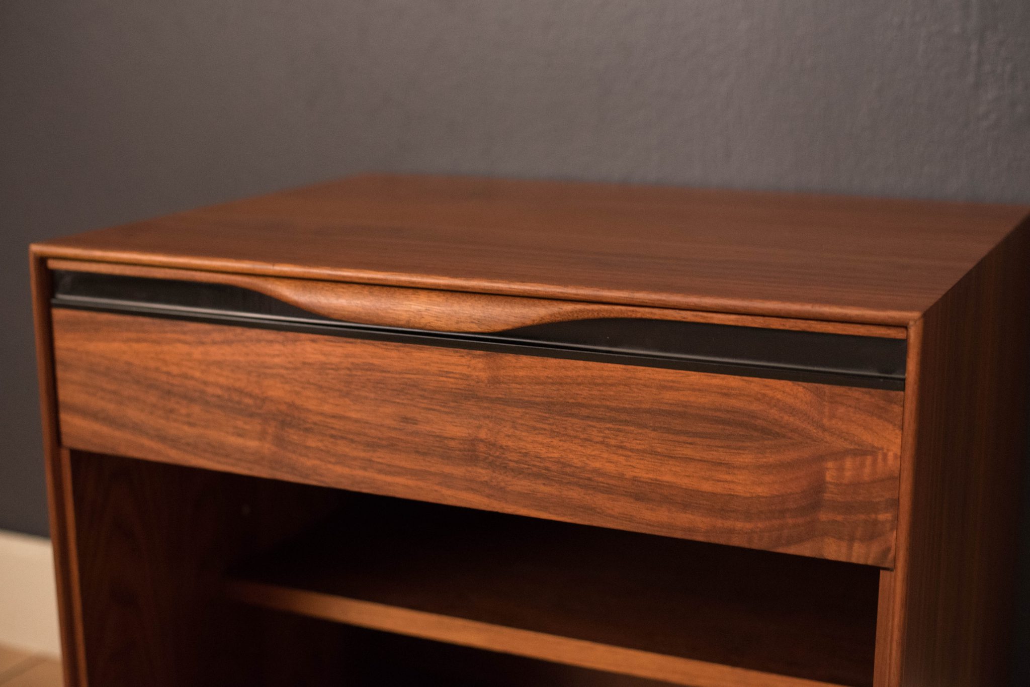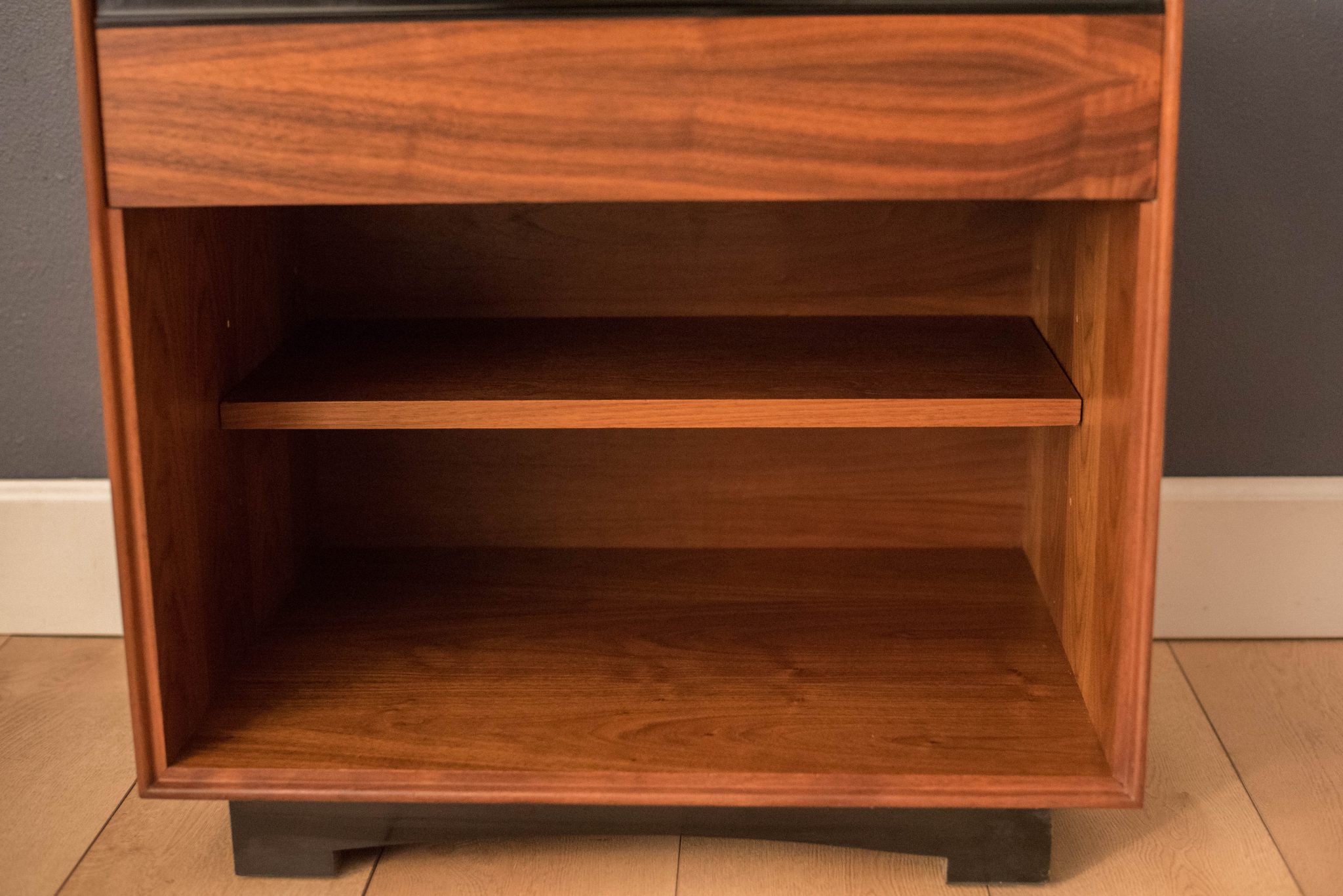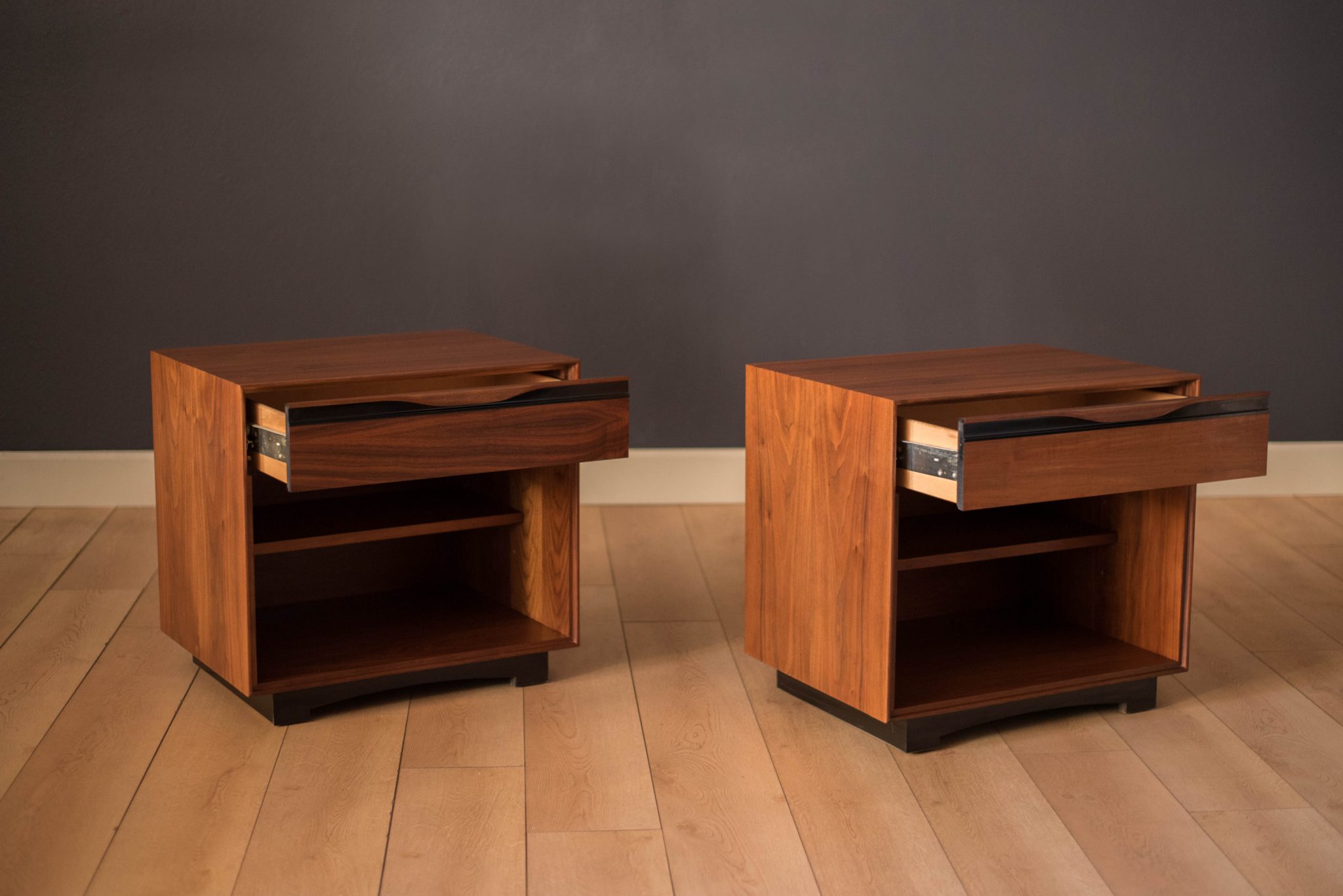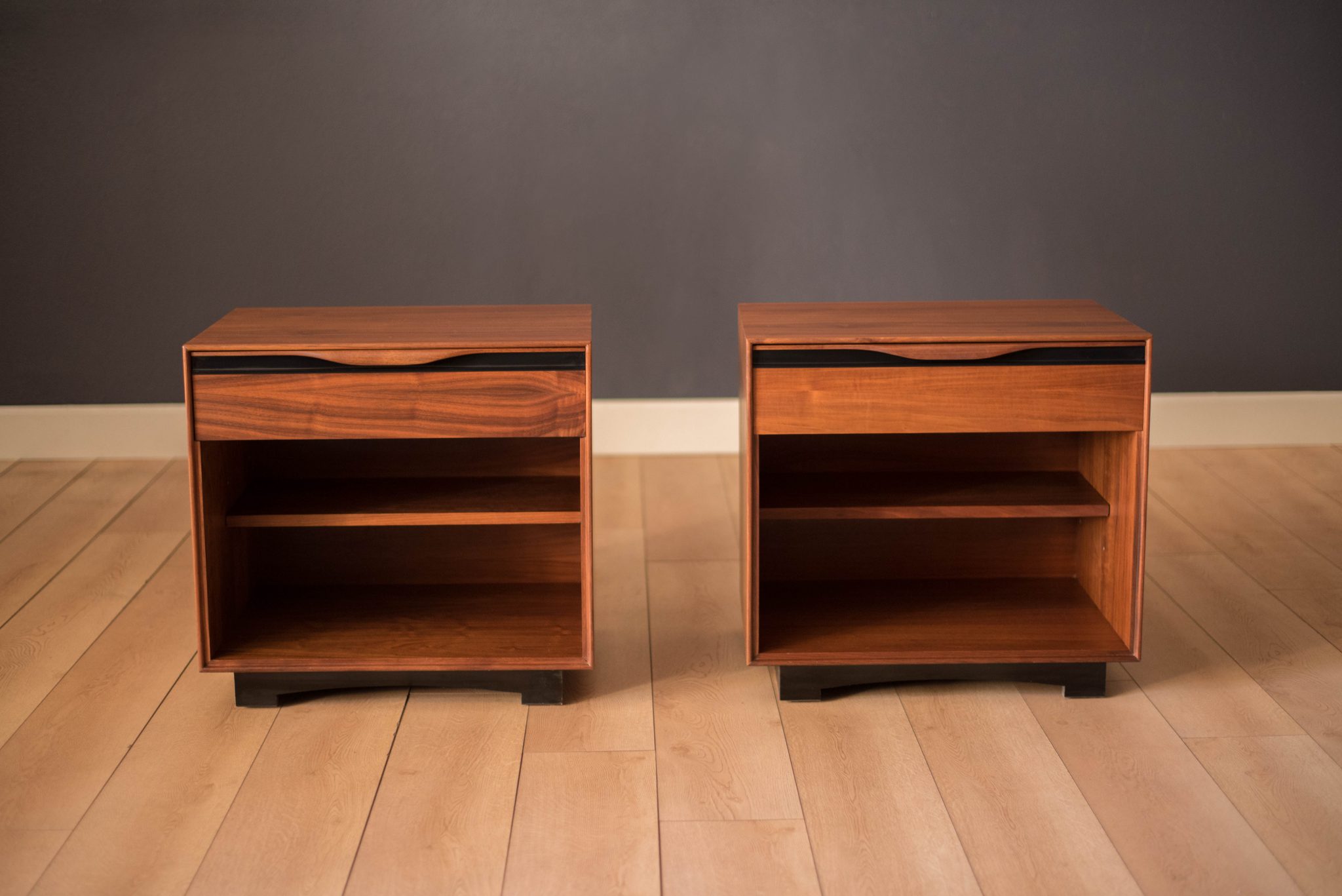 Mid-Century Modern pair of nightstands designed by John Kapel for Glenn of California in walnut. Includes one drawer and an adjustable shelf on each bedside table. Matching tall dresser chest available in separate listing.