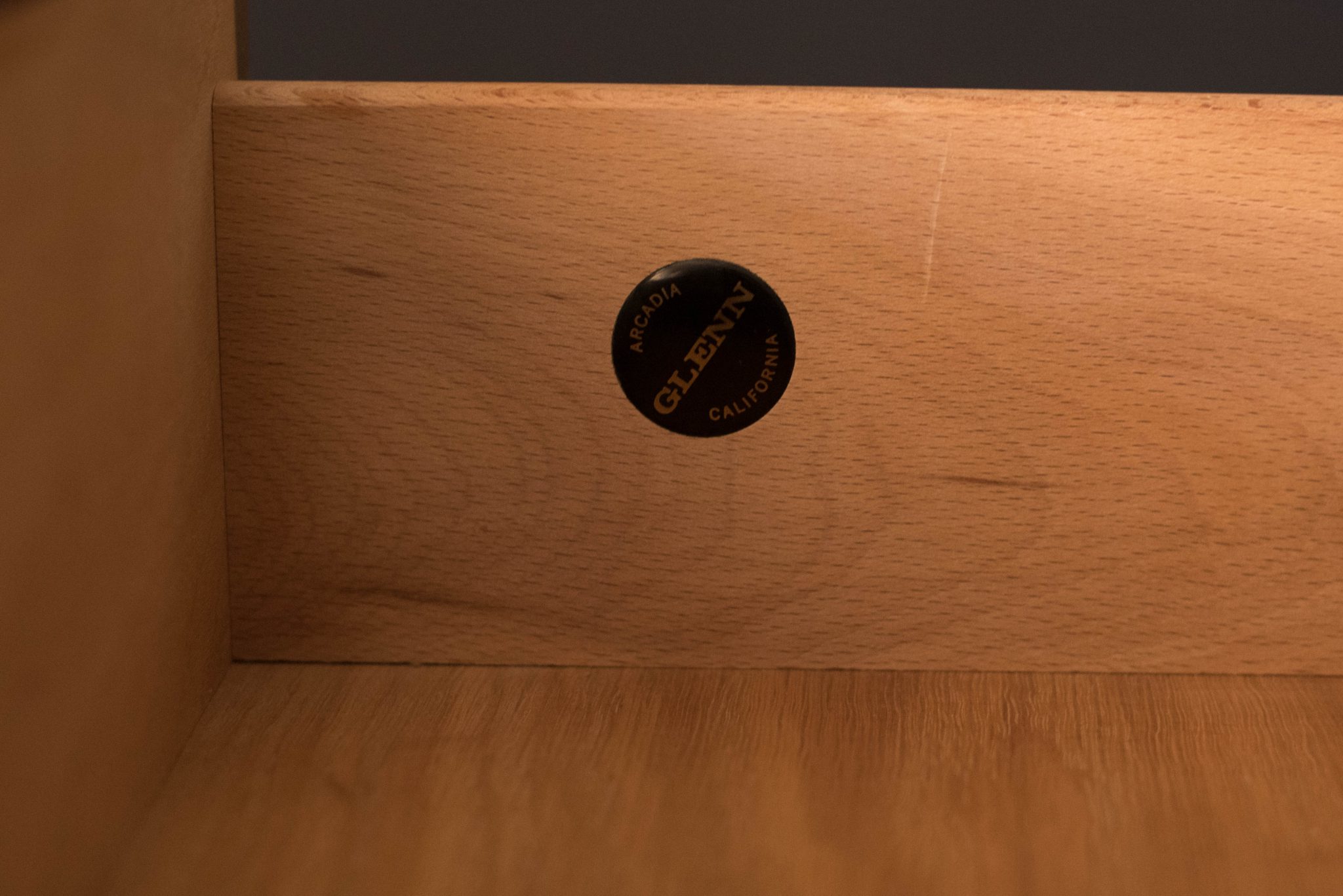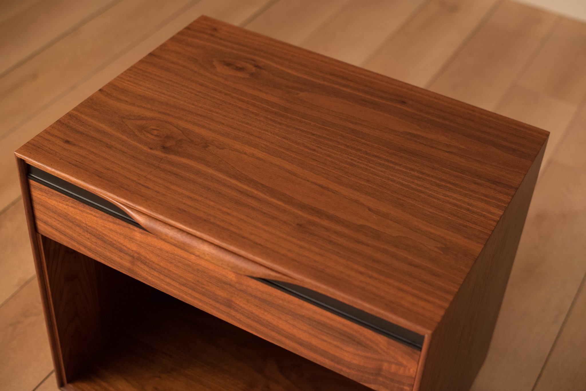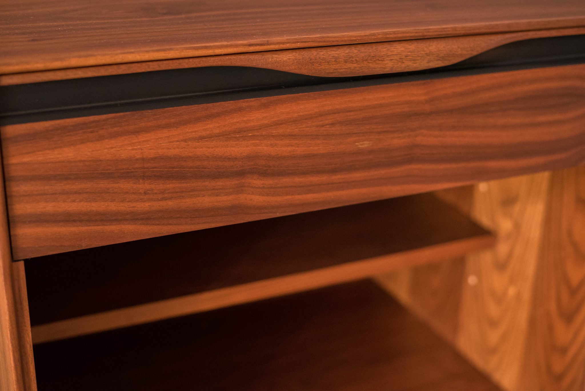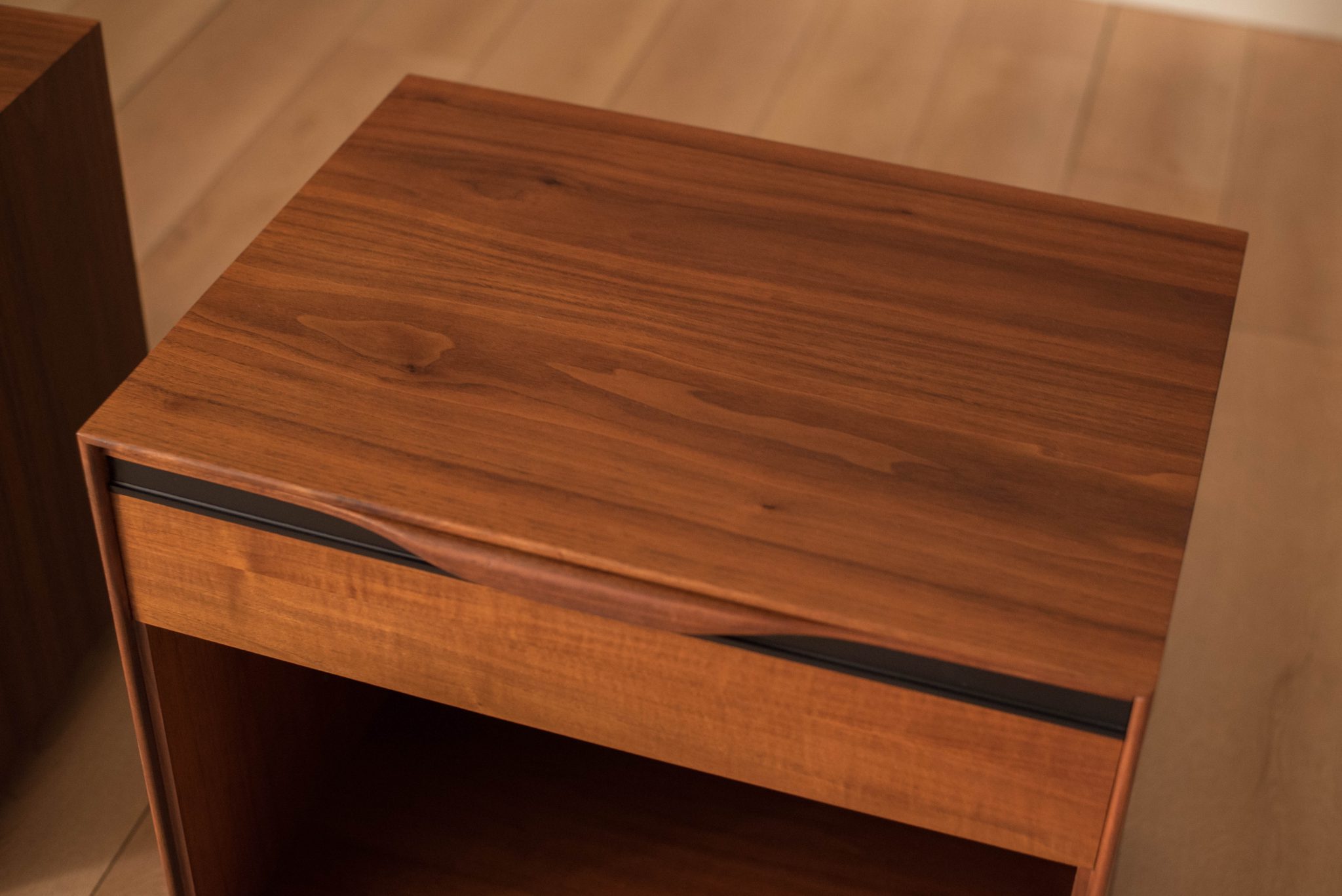 Mid-Century Modern pair of nightstands designed by John Kapel for Glenn of California in walnut. Includes one drawer and an adjustable shelf on each bedside table. Matching tall dresser chest available in separate listing.