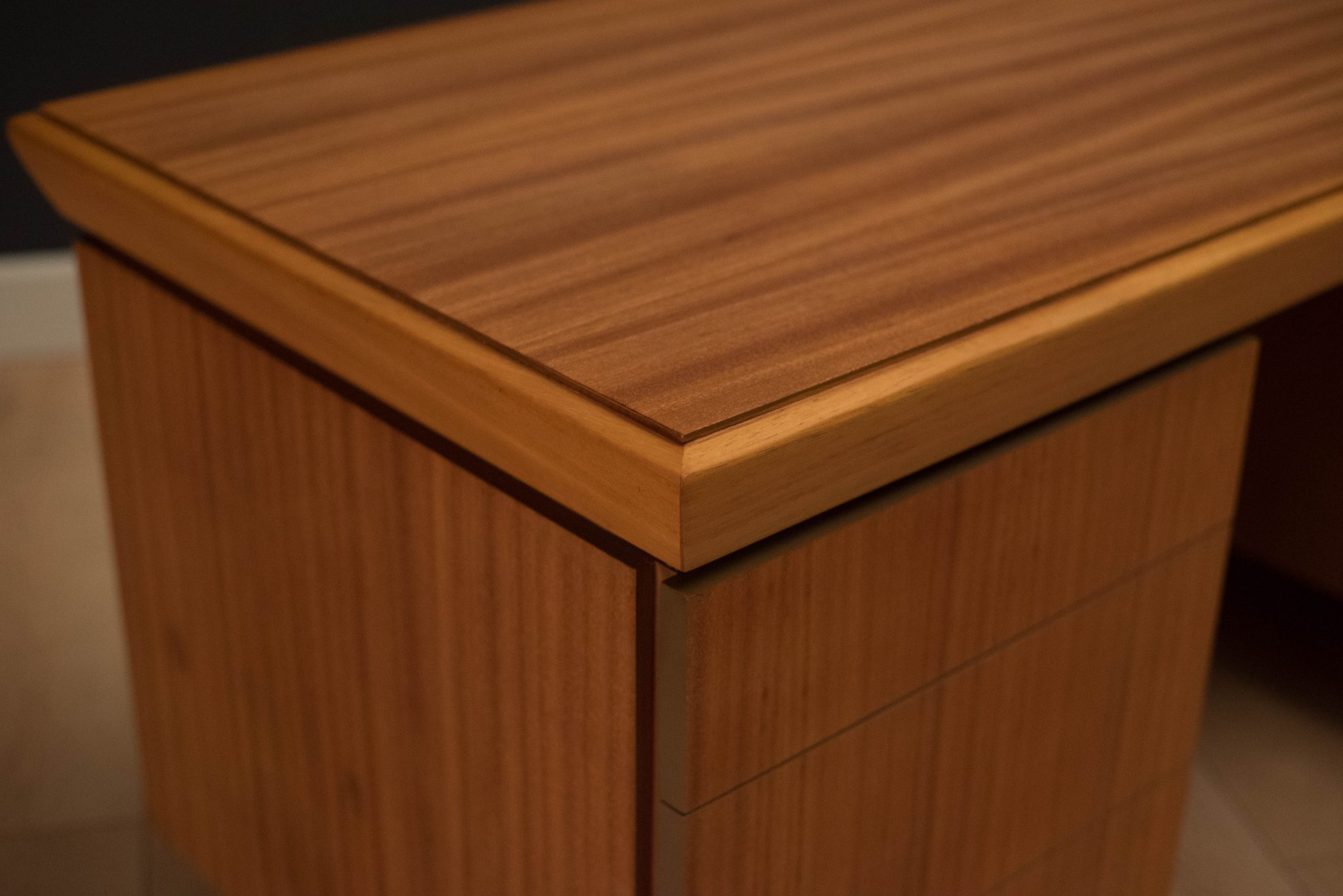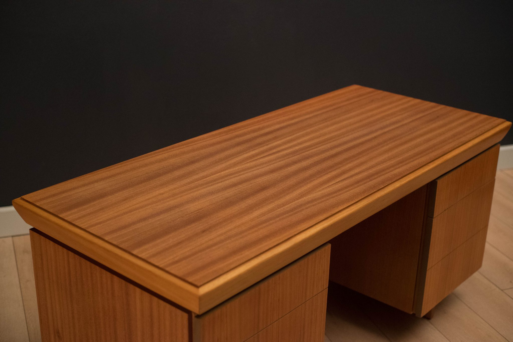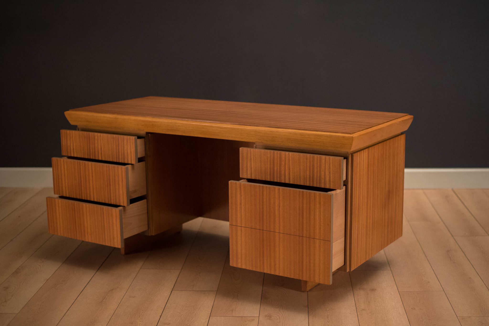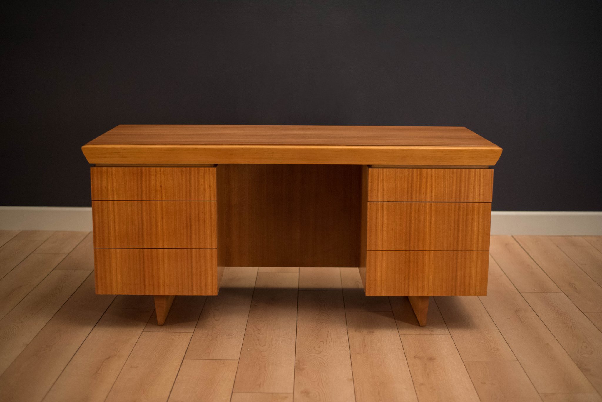 Mid century modern desk designed by Paul Laszlo for Brown Saltman in mahogany. This piece can be displayed from any angle and includes a finished backside with a bookshelf display. Equipped with four storage drawers and one filing drawer.
