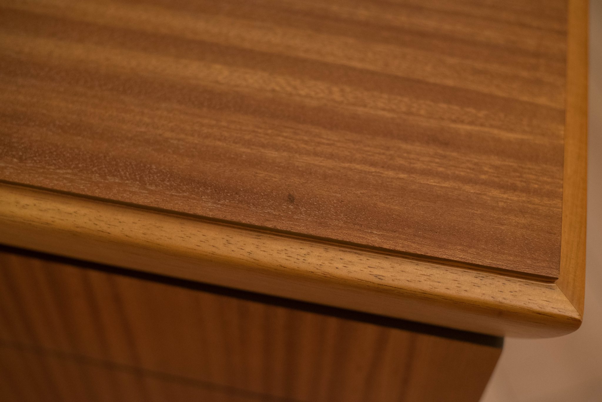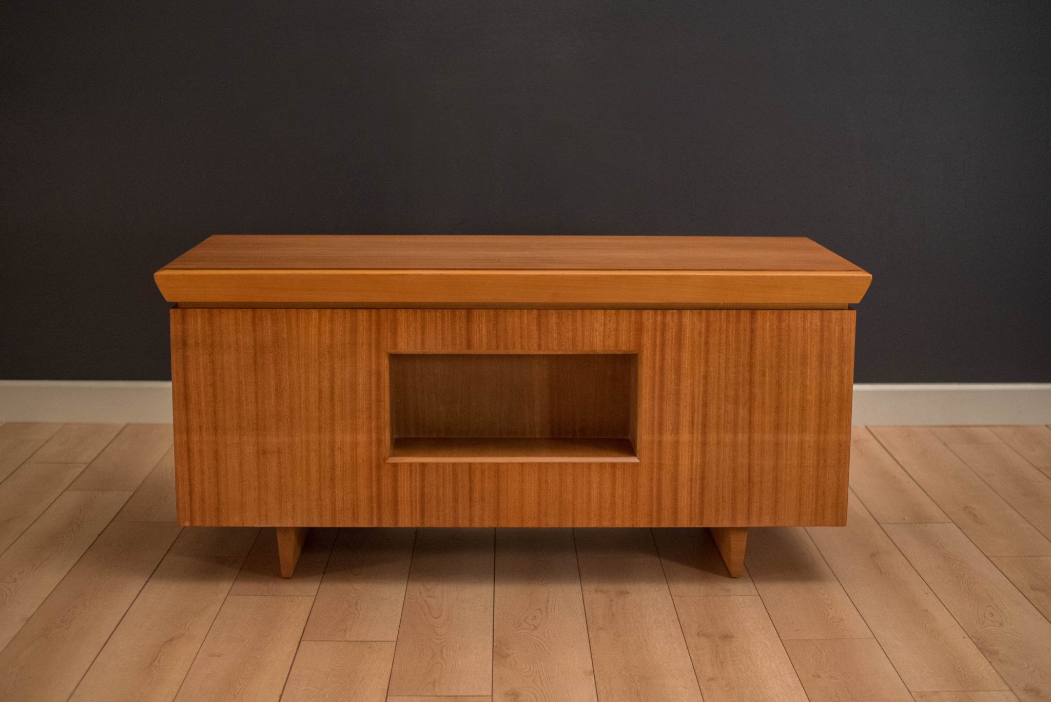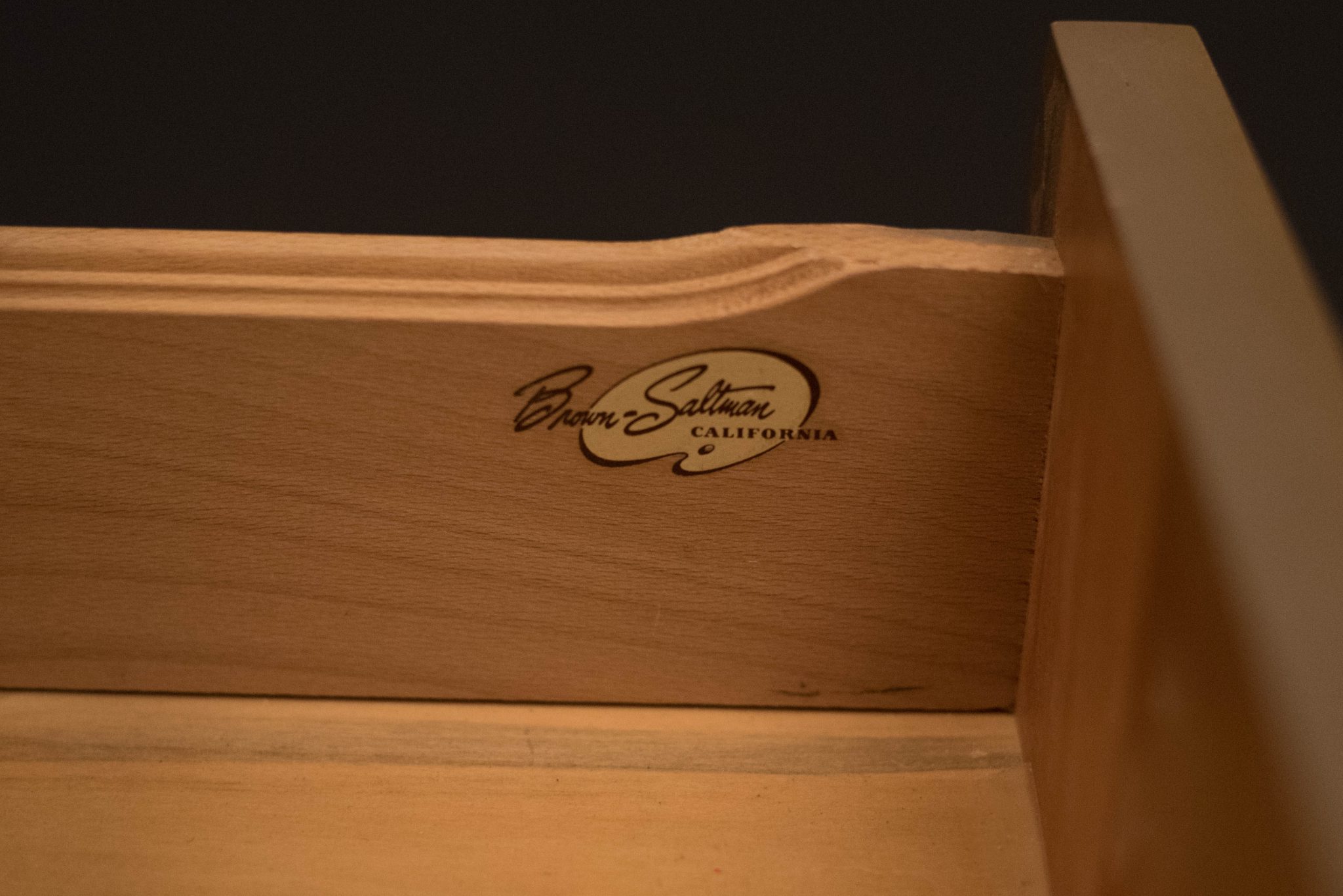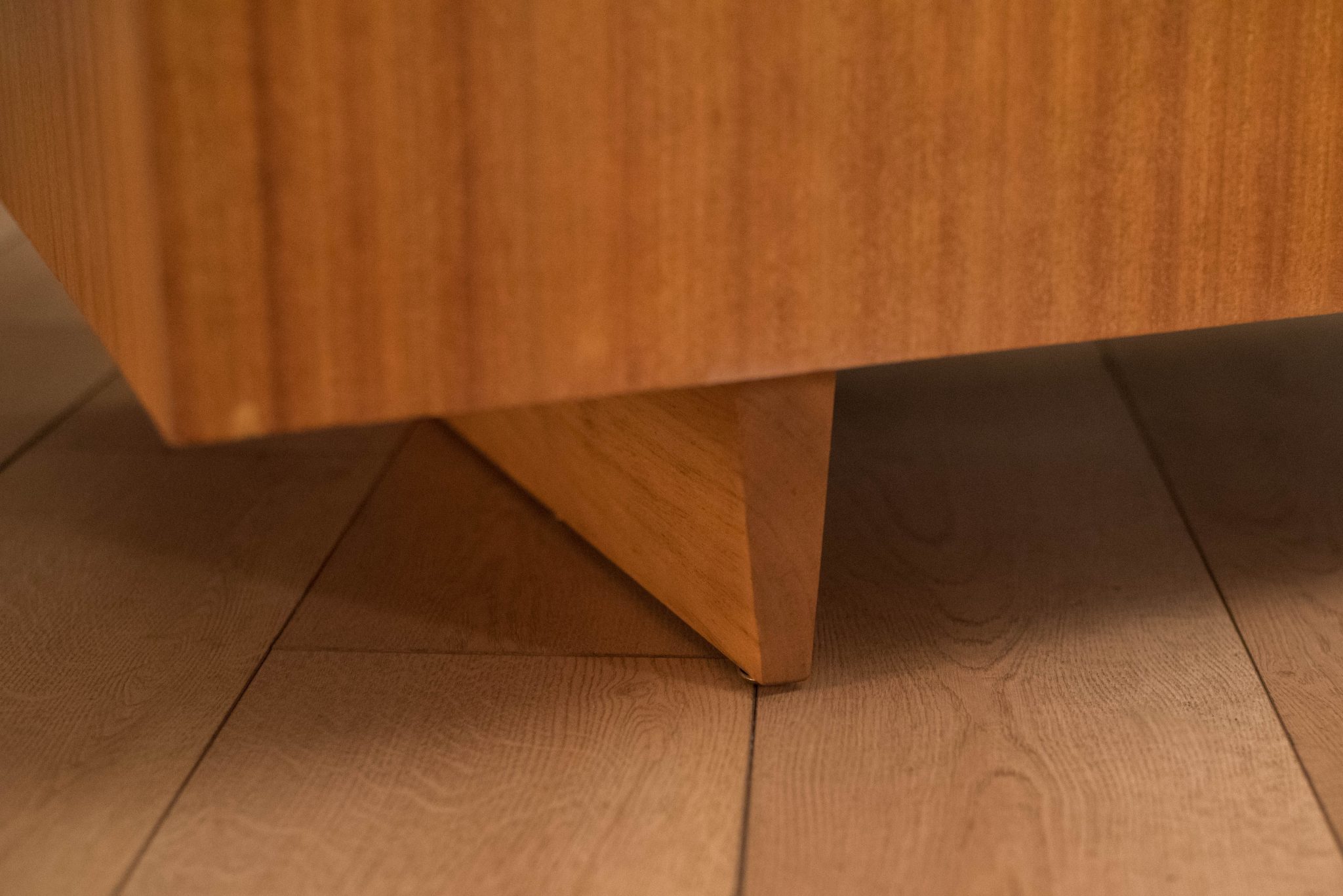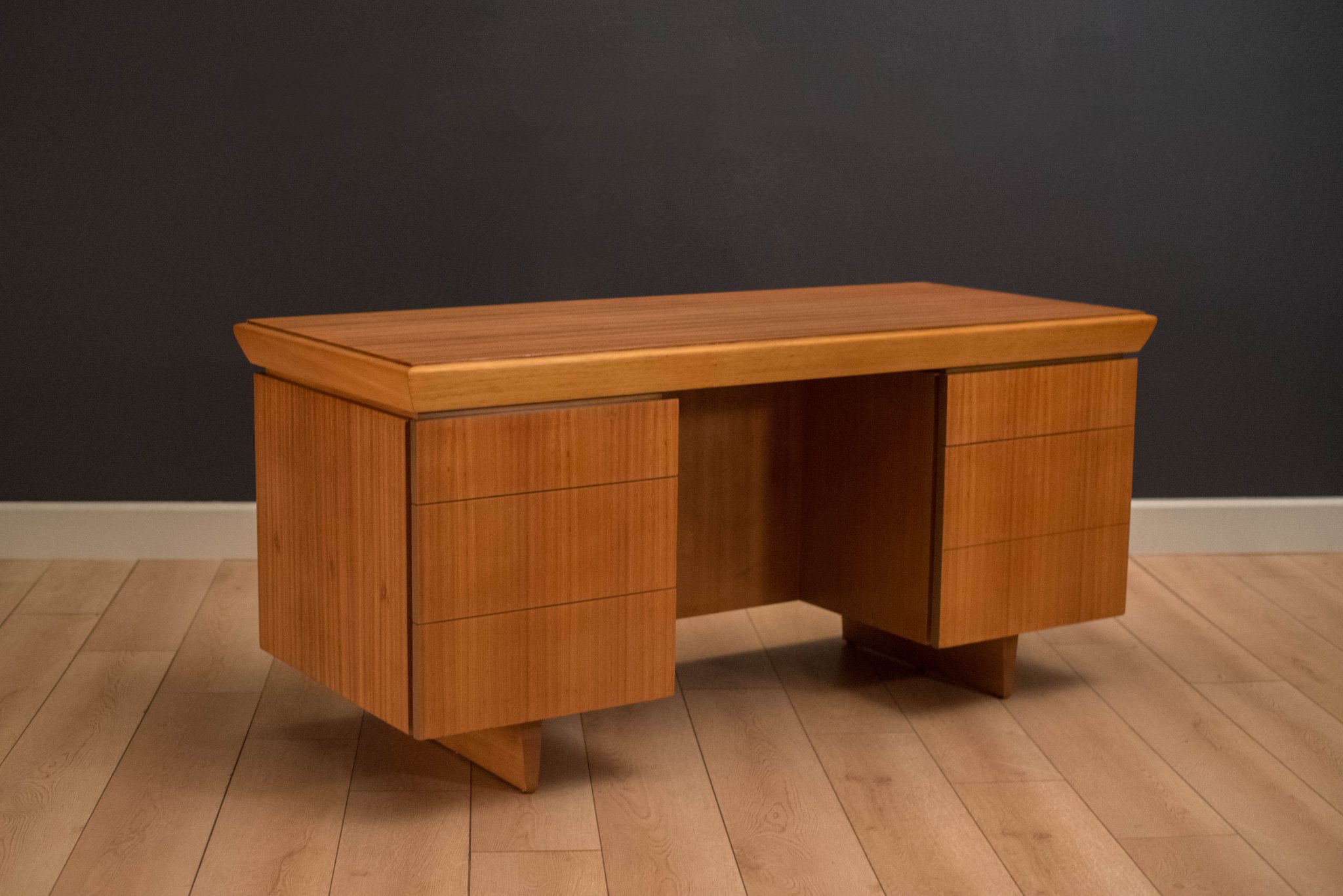 Mid century modern desk designed by Paul Laszlo for Brown Saltman in mahogany. This piece can be displayed from any angle and includes a finished backside with a bookshelf display. Equipped with four storage drawers and one filing drawer.
