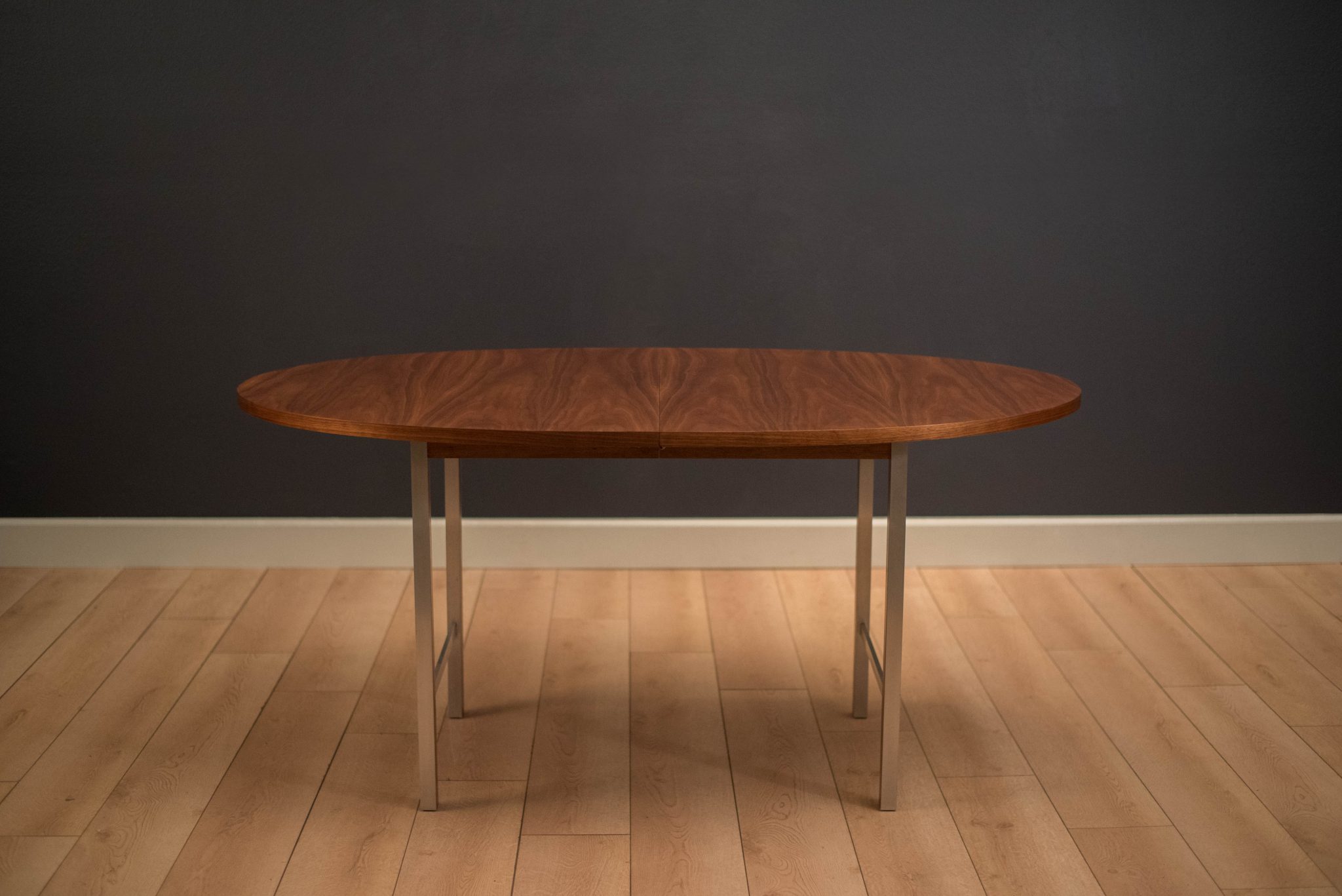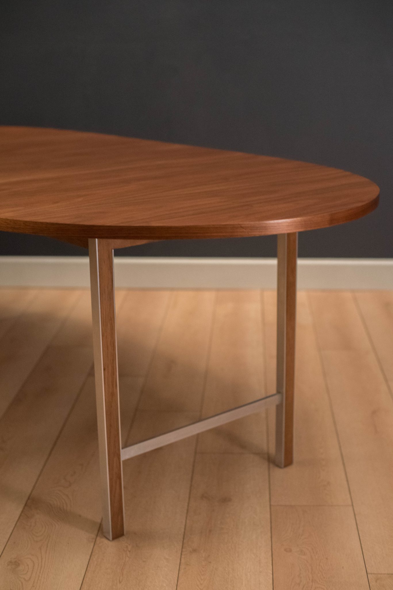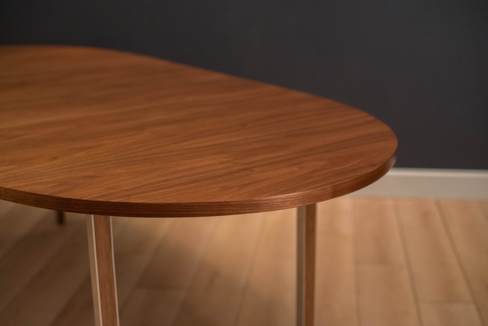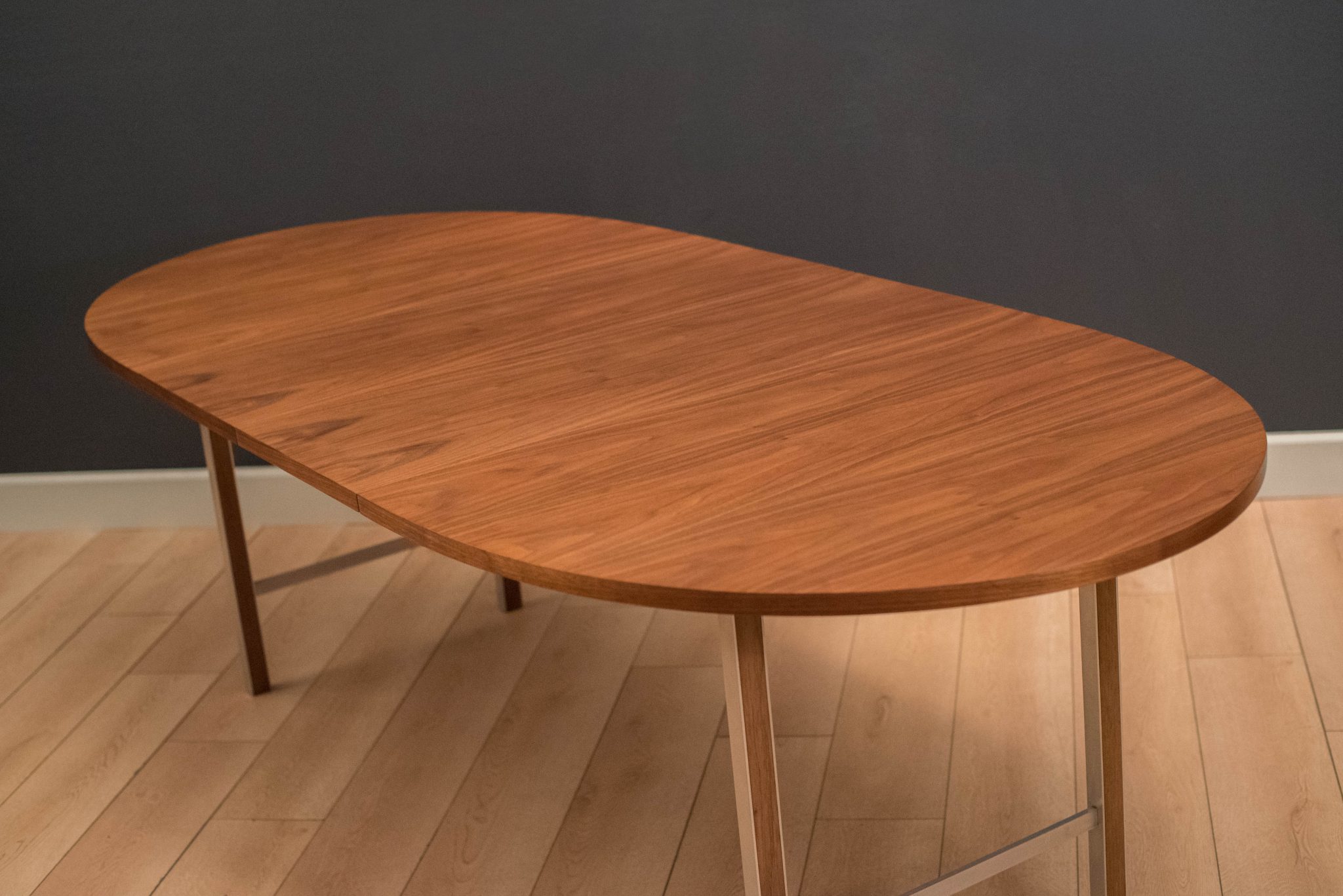 Mid-Century Modern walnut dining table designed by Paul McCobb for the Linear collection of Calvin Furniture. This table has an expansive oval table top and includes two removable leaves. Supporting H-base legs are made of oak and trimmed with aluminum. Seats up to eight.