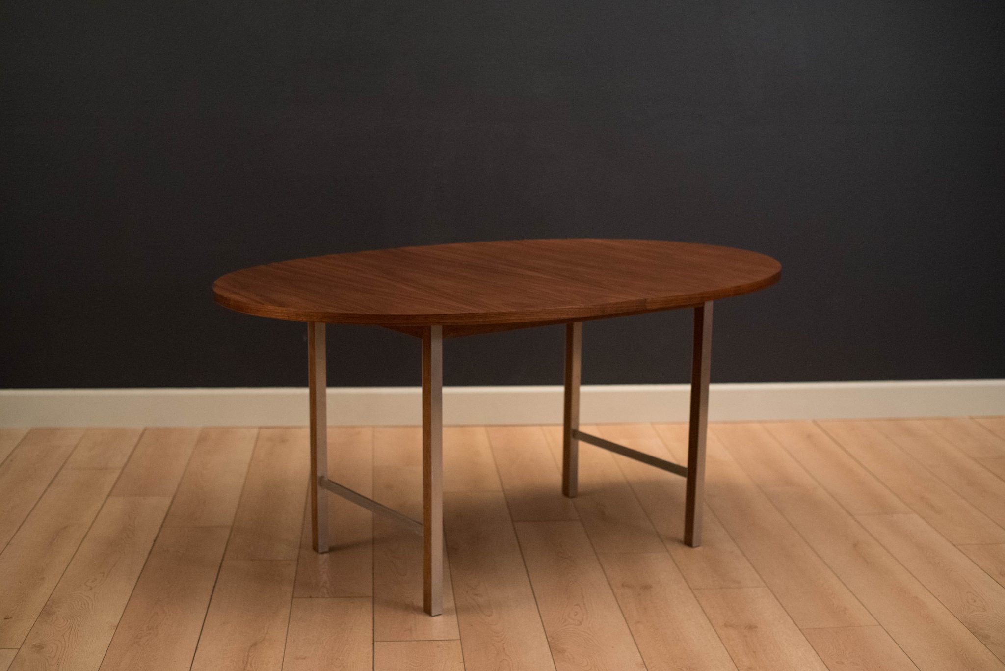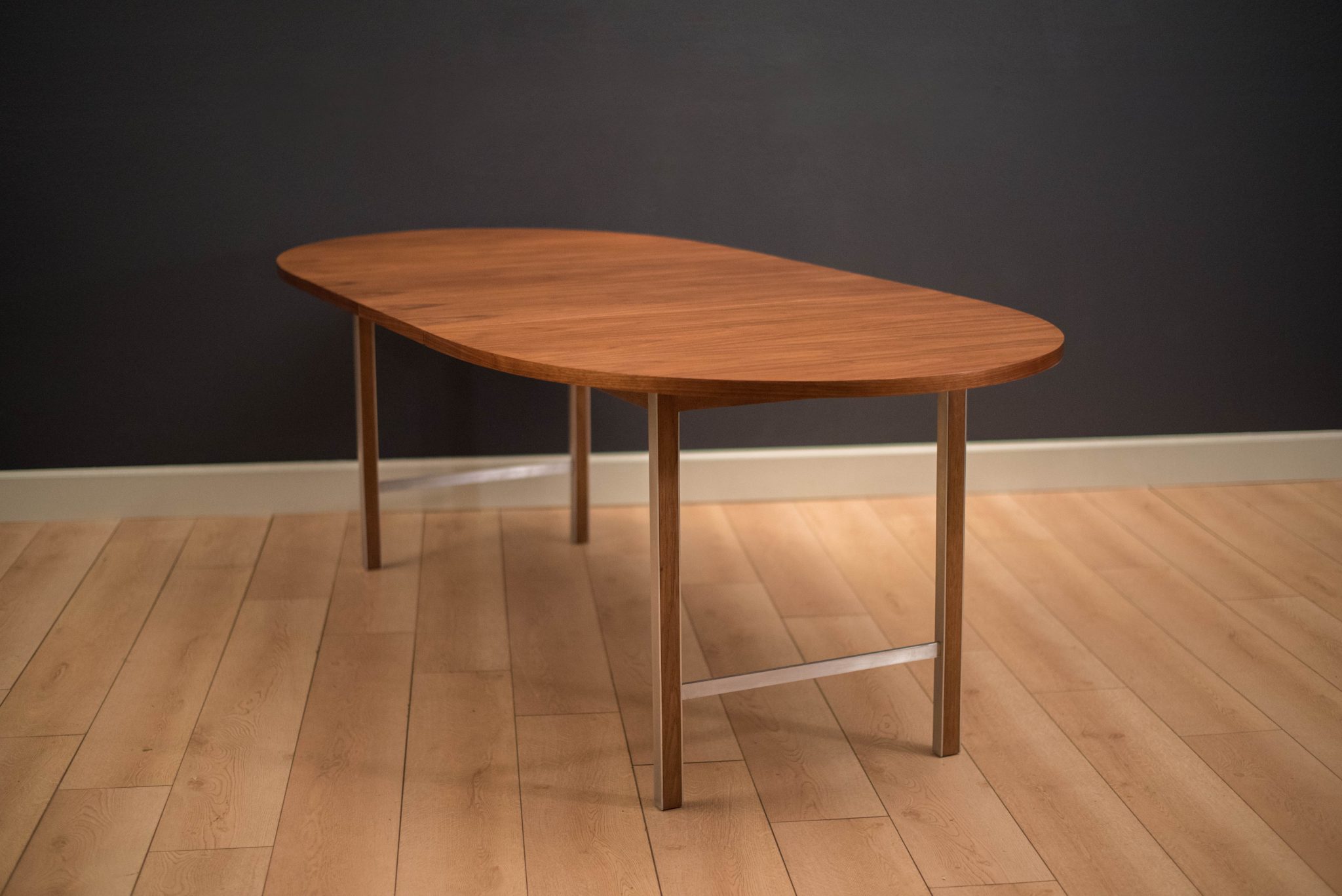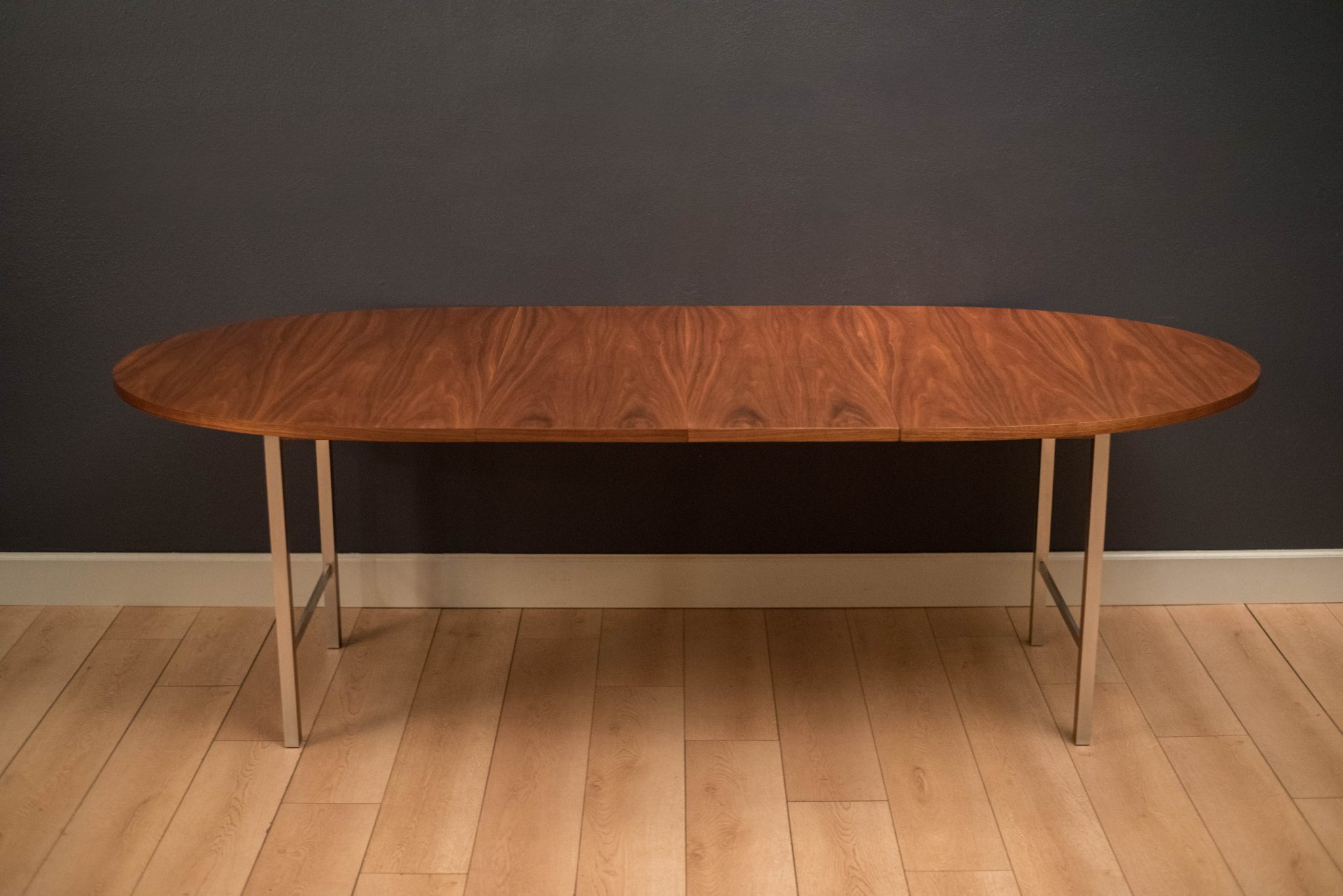 Mid-Century Modern walnut dining table designed by Paul McCobb for the Linear collection of Calvin Furniture. This table has an expansive oval table top and includes two removable leaves. Supporting H-base legs are made of oak and trimmed with aluminum. Seats up to eight.