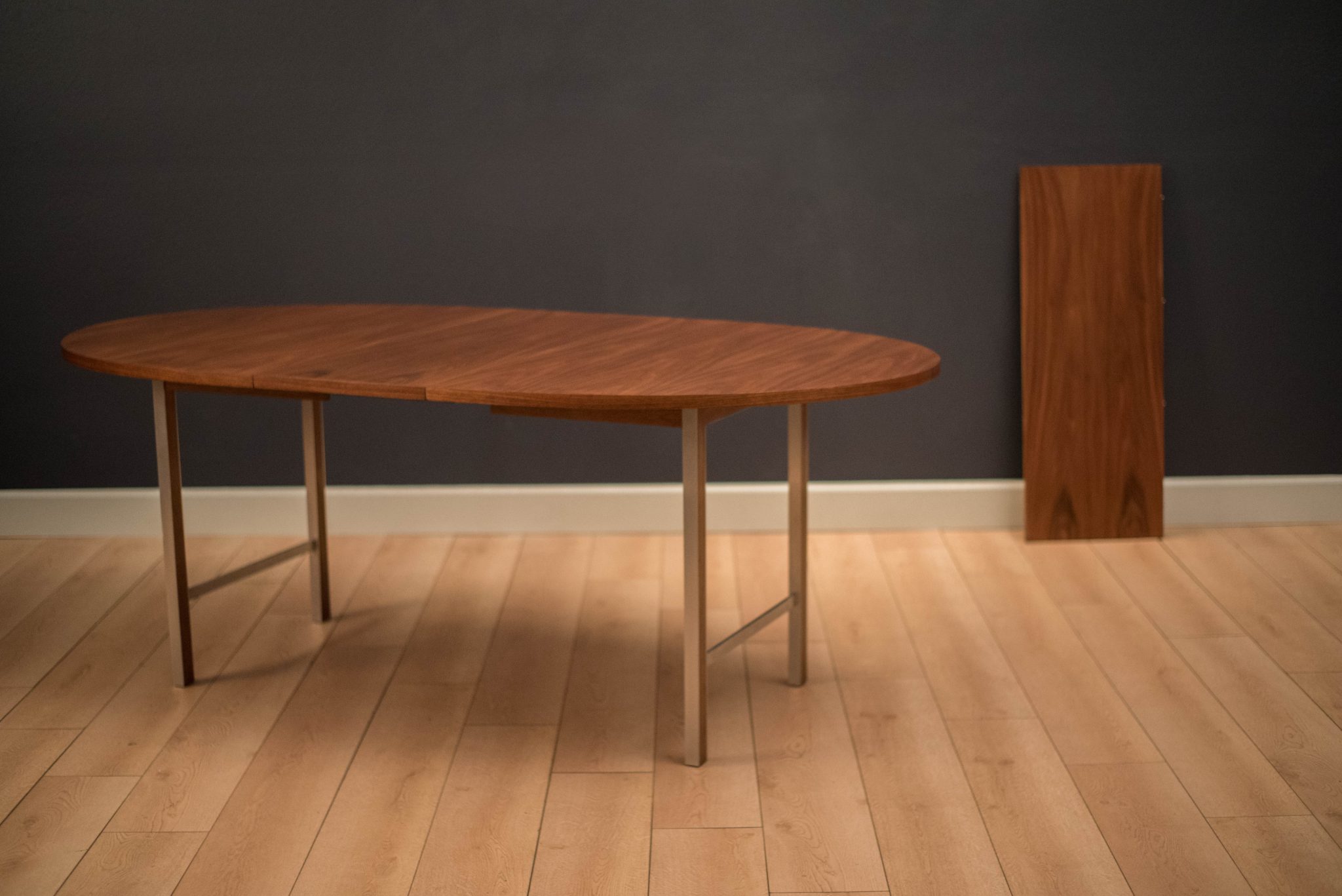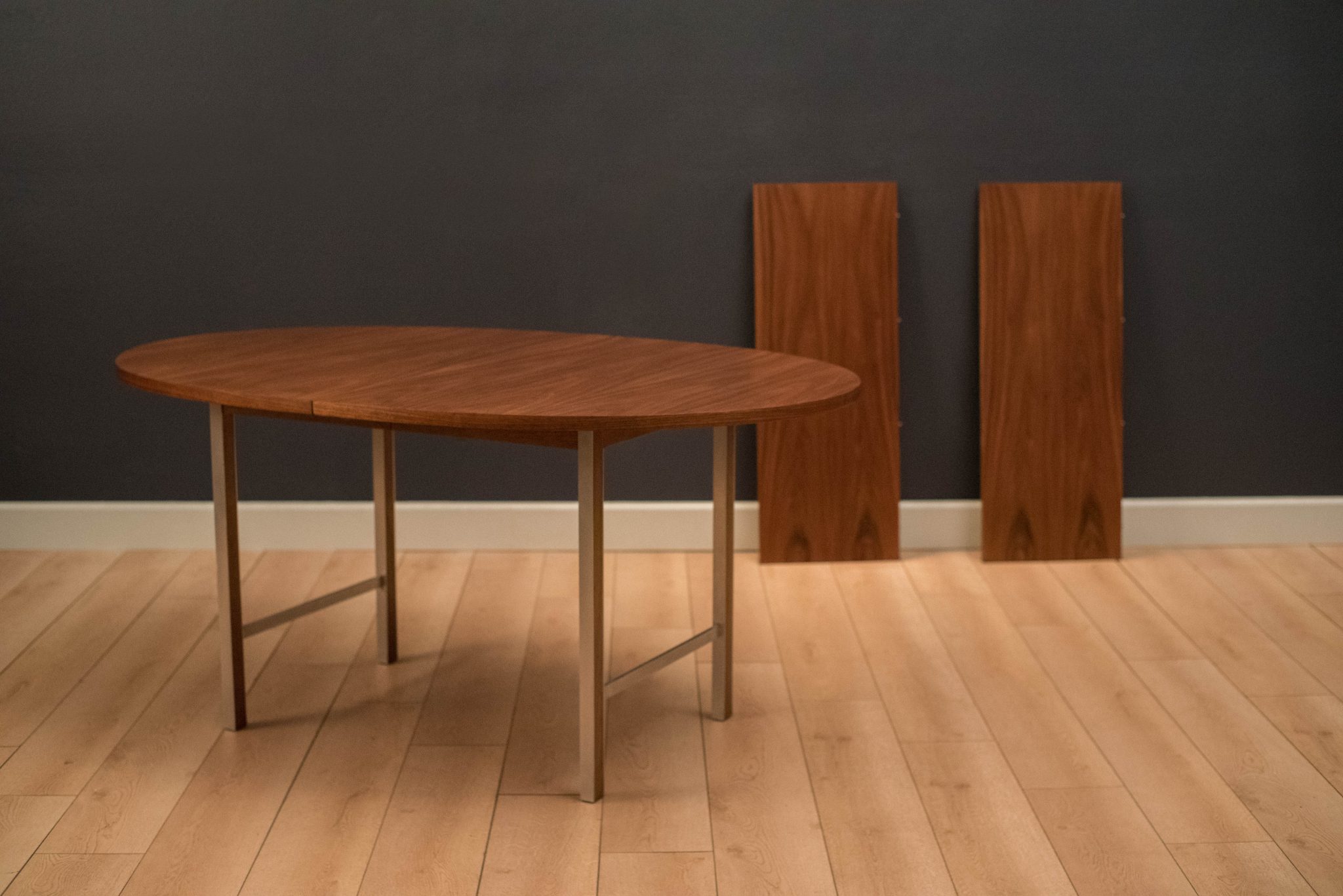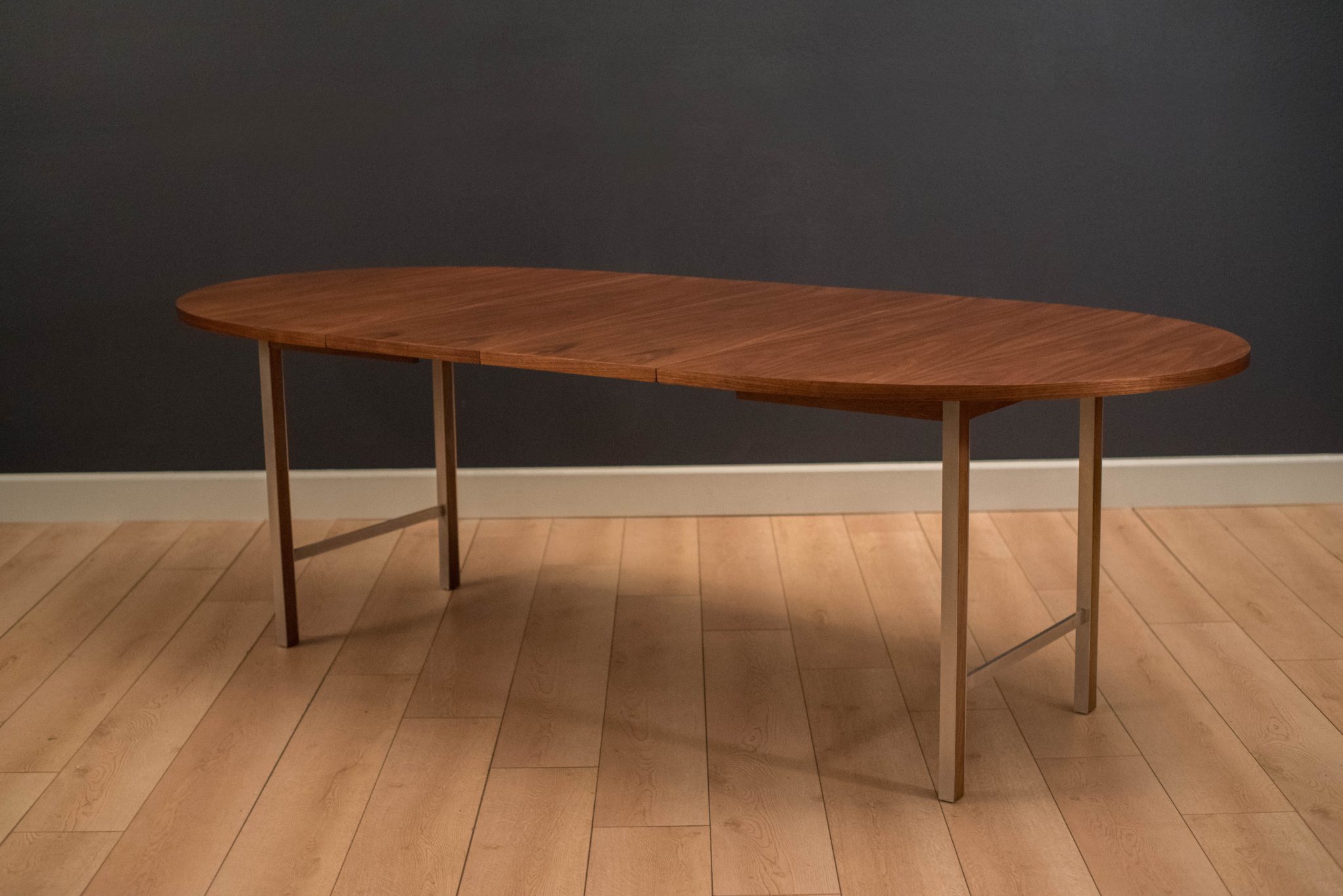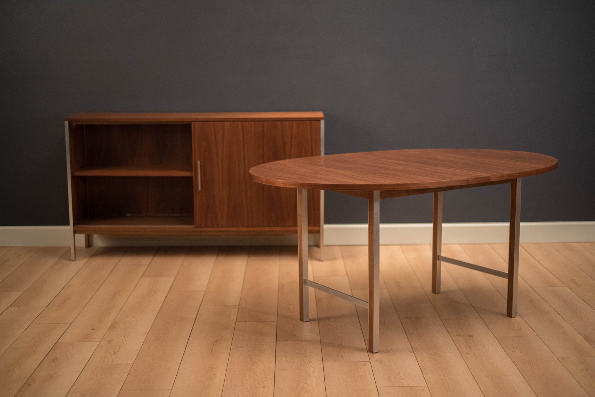 Mid-Century Modern walnut dining table designed by Paul McCobb for the Linear collection of Calvin Furniture. This table has an expansive oval table top and includes two removable leaves. Supporting H-base legs are made of oak and trimmed with aluminum. Seats up to eight.