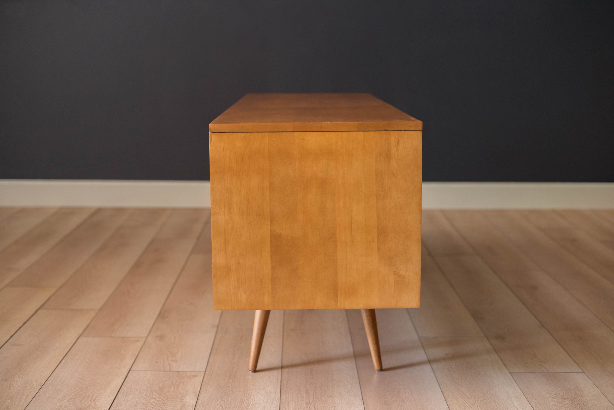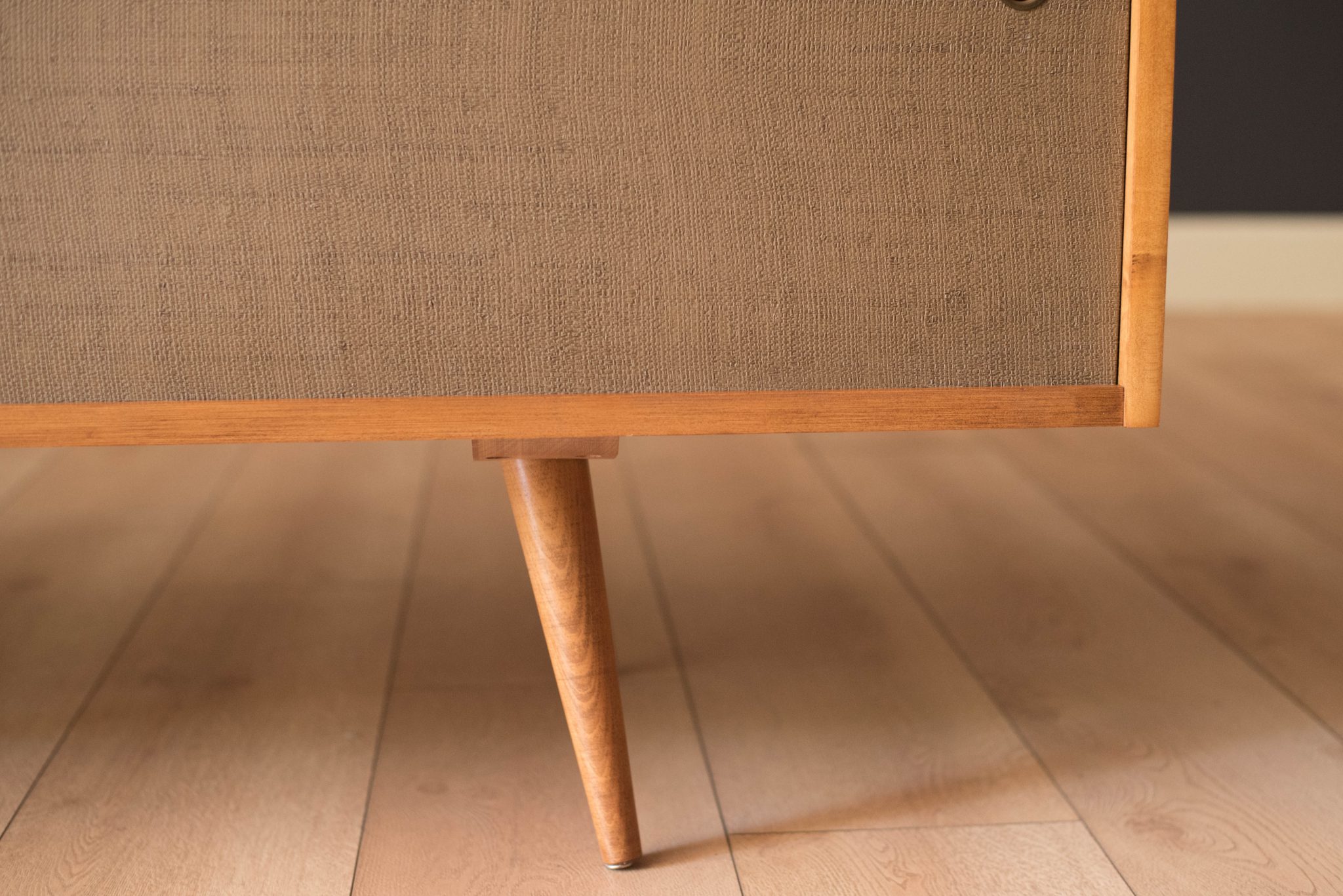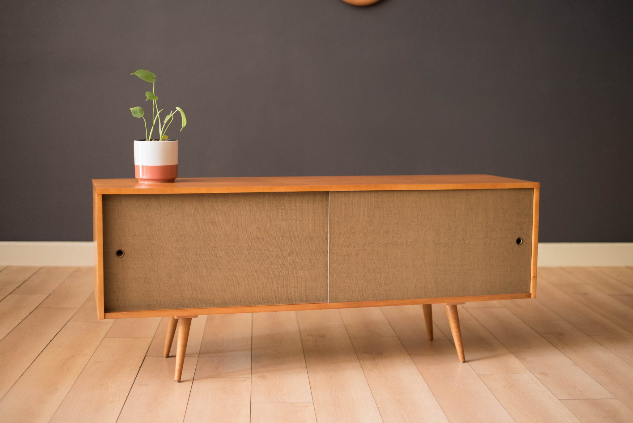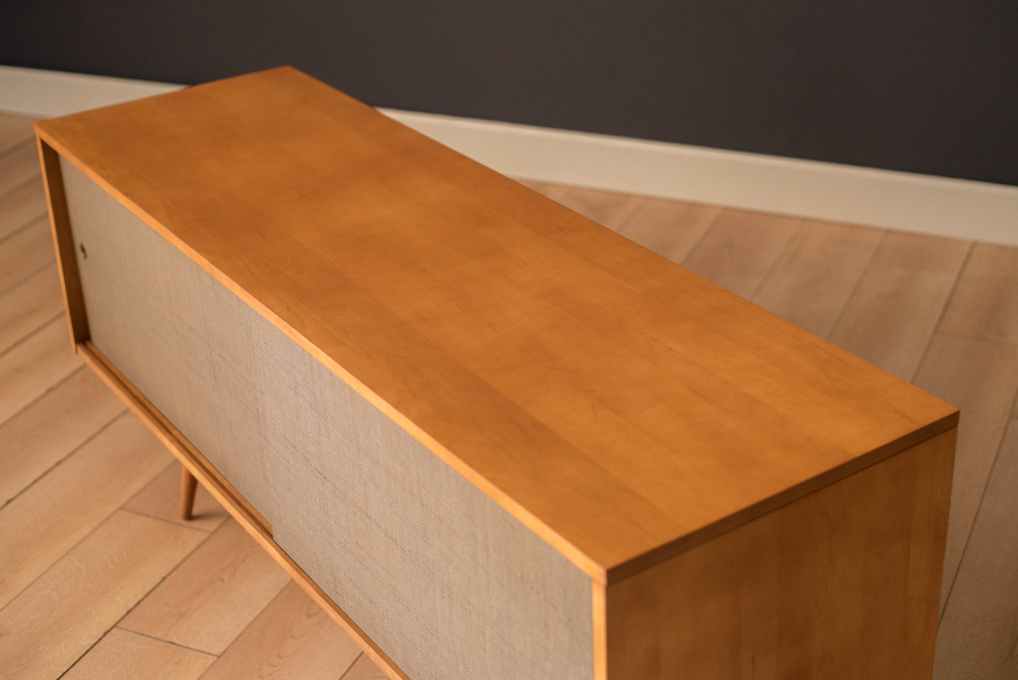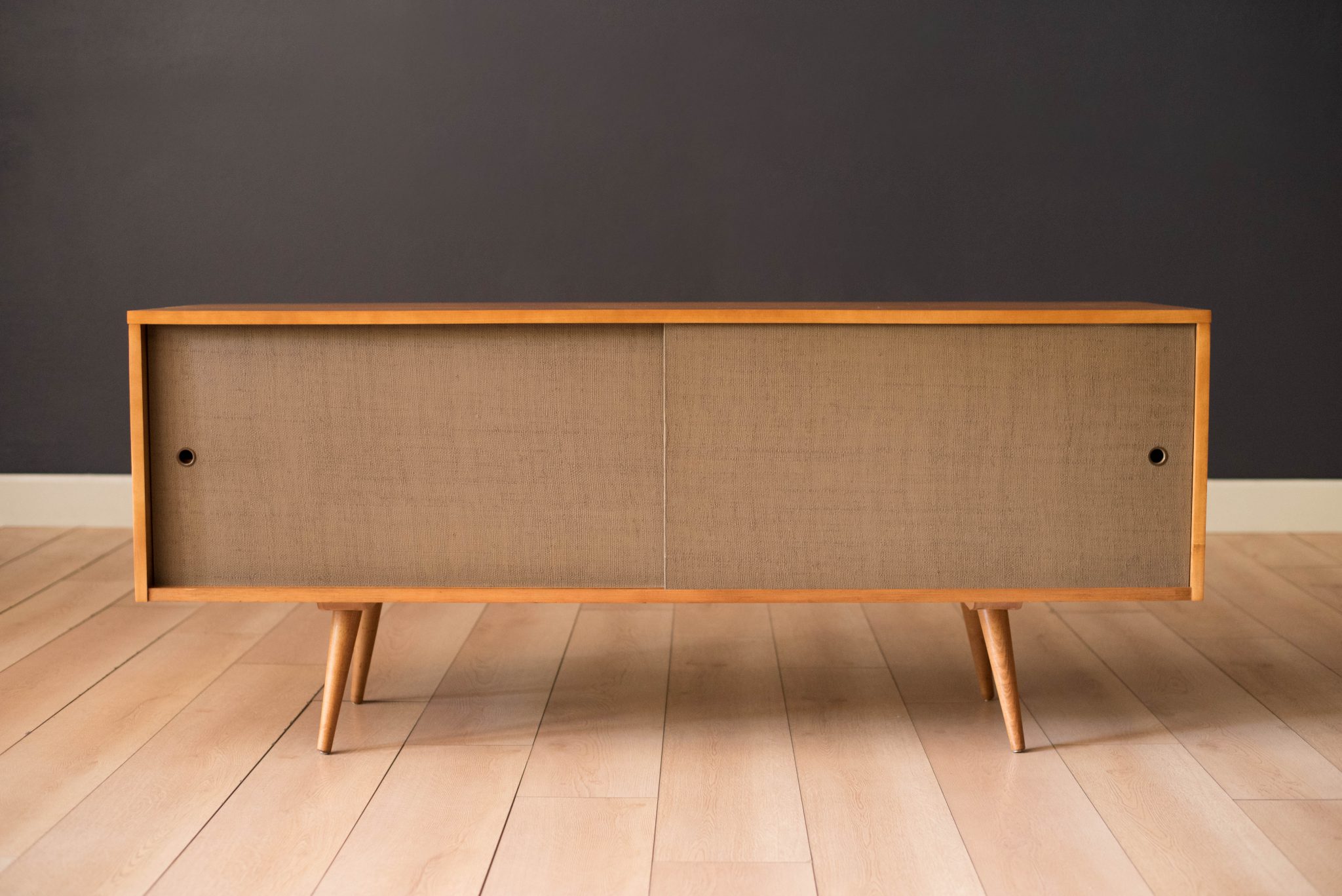 Mid-Century Modern sideboard credenza in solid planked maple designed by Paul McCobb for Winchendon Furniture Co. circa 1950’s. This piece features the original grasscloth sliding doors that reveals open storage space with adjustable shelving. Supported by splayed pencil legs, this piece is perfect to use as a low media console or record cabinet.