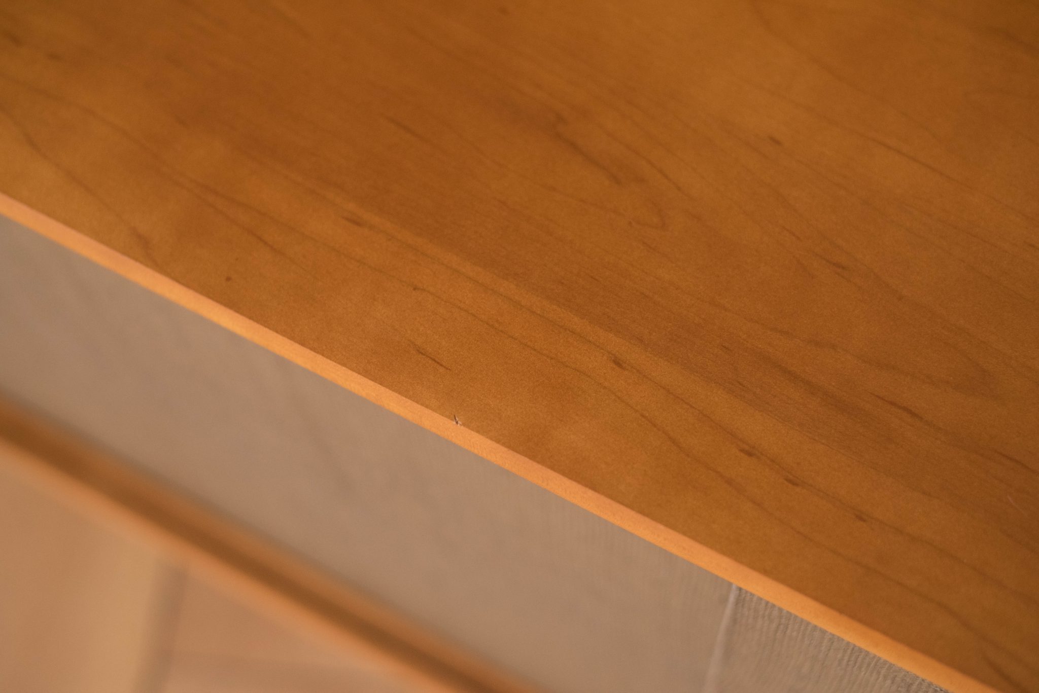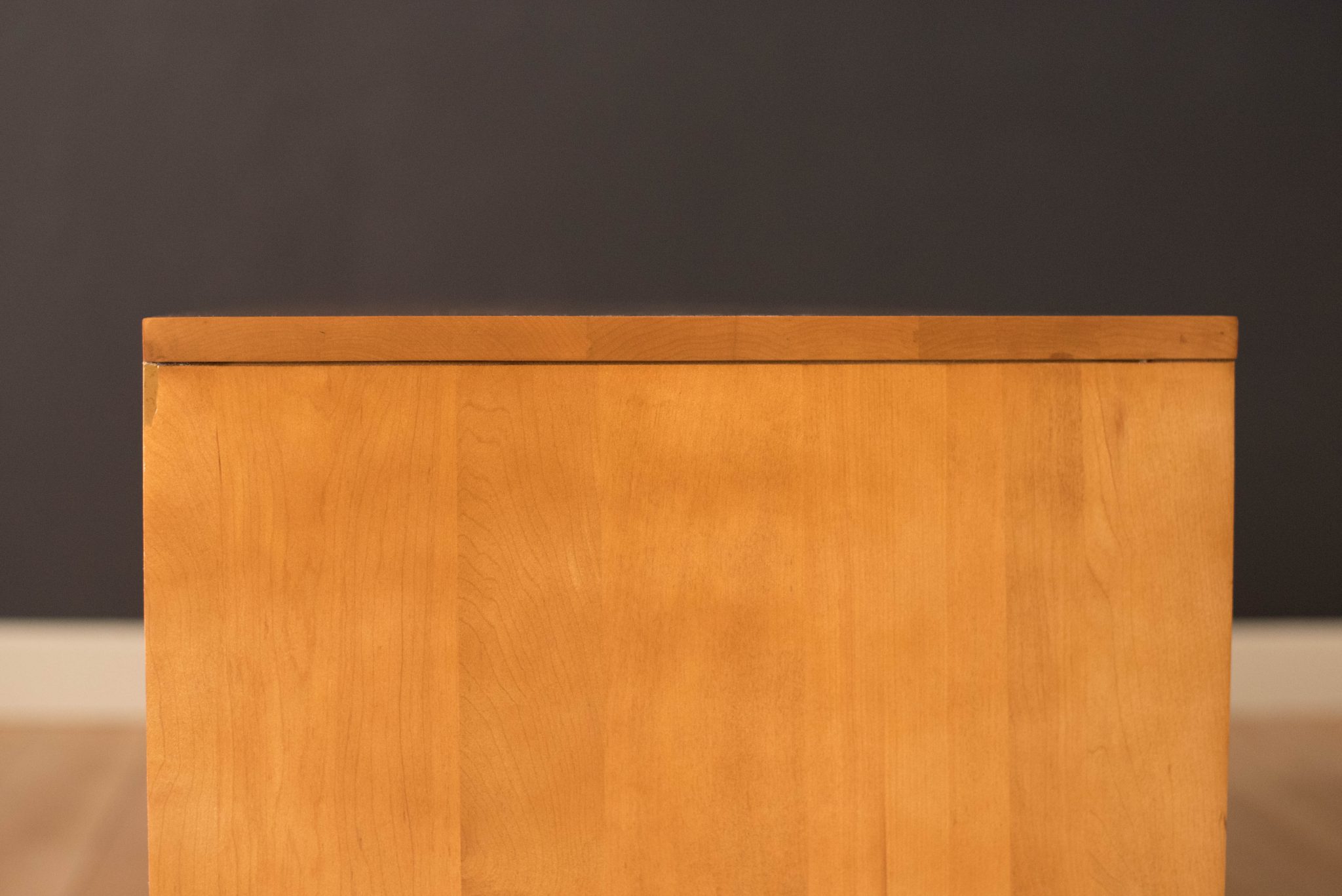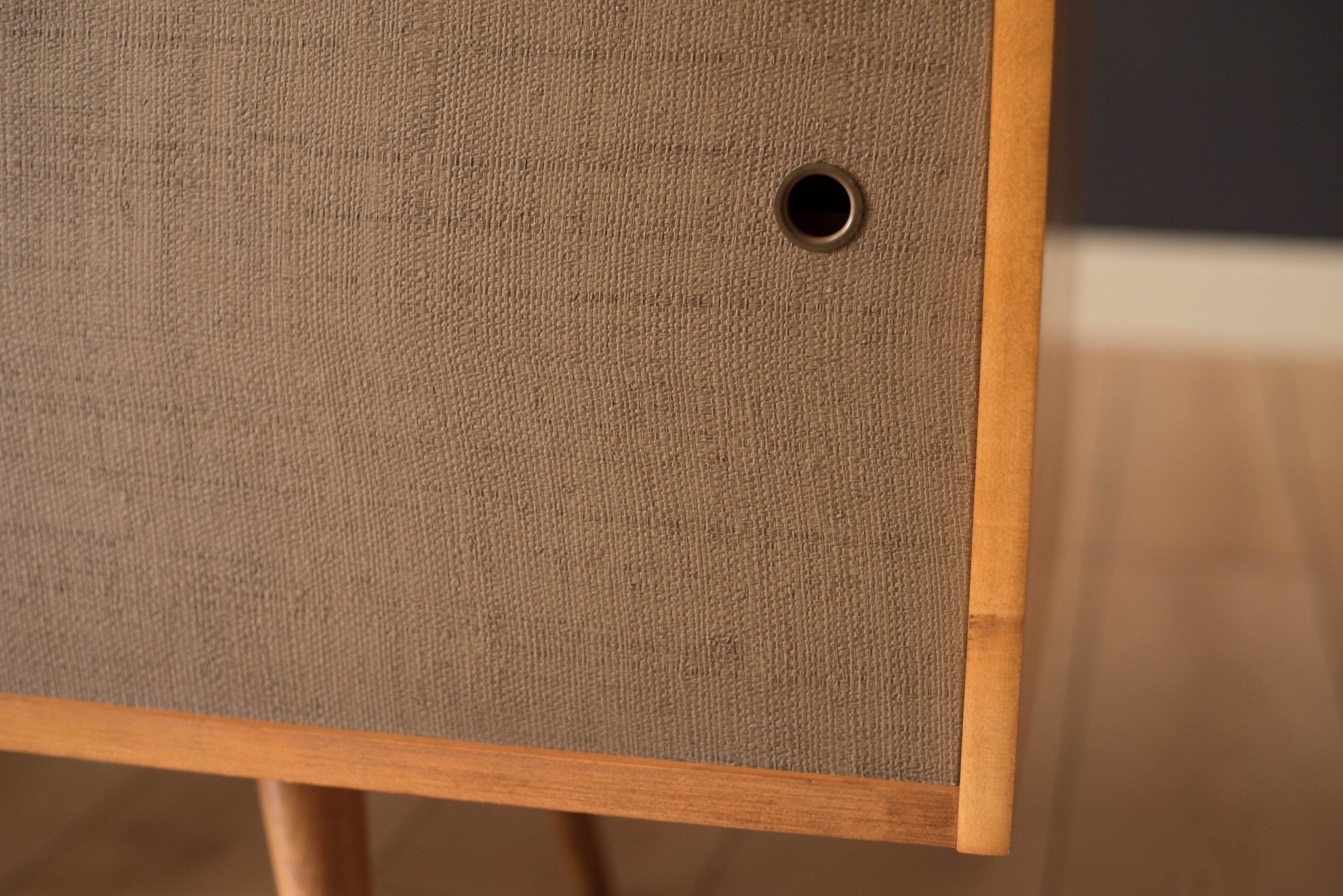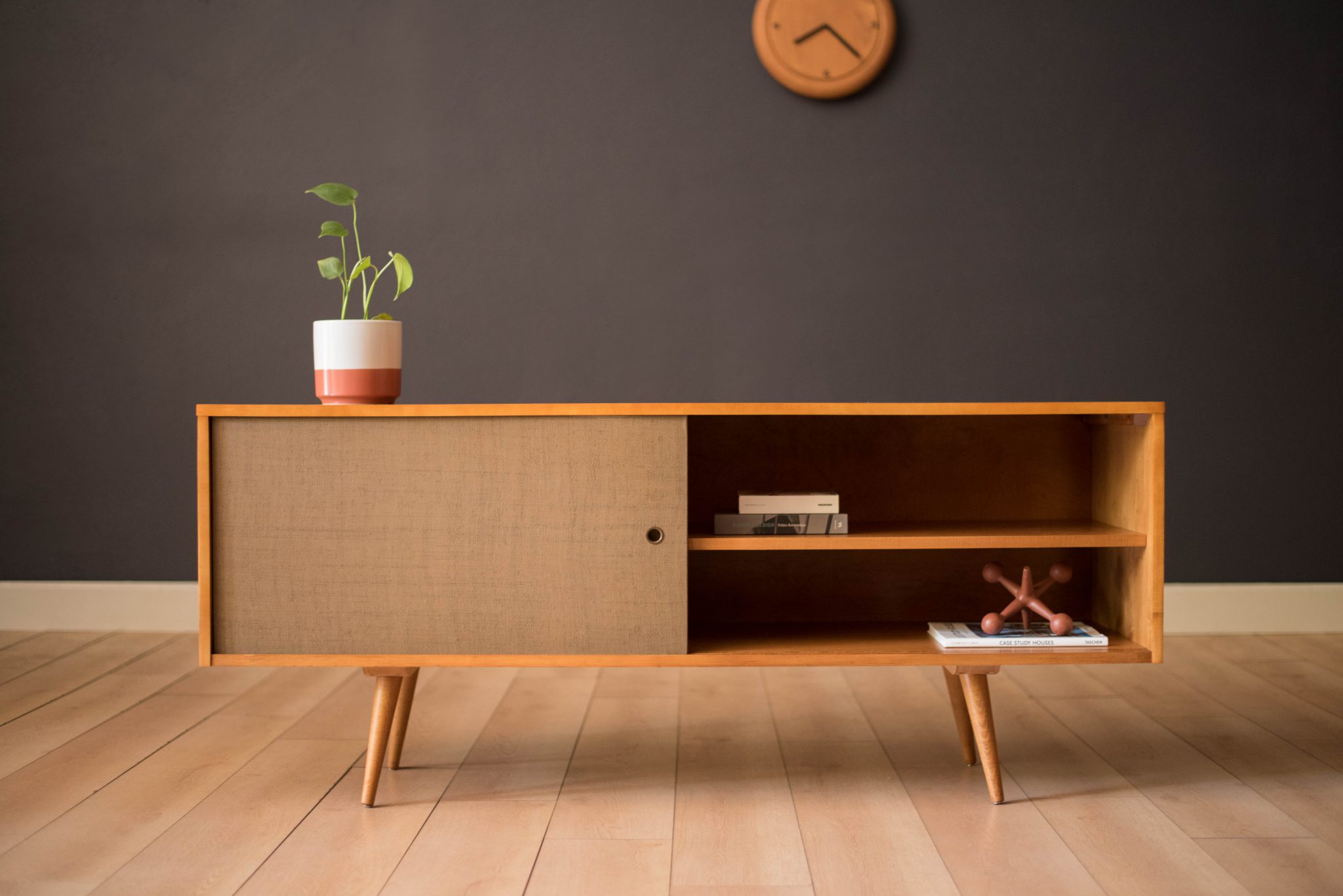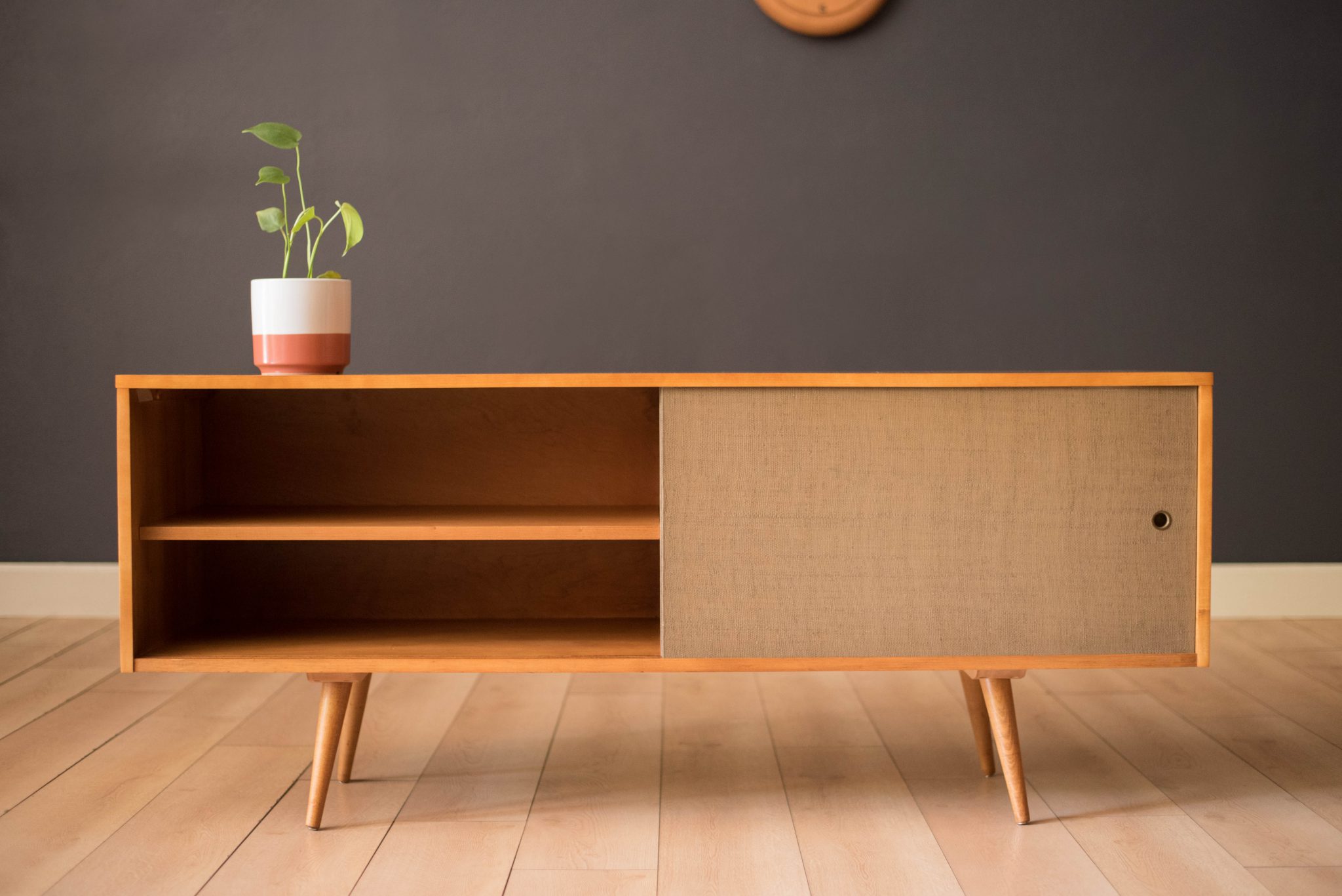 Mid-Century Modern sideboard credenza in solid planked maple designed by Paul McCobb for Winchendon Furniture Co. circa 1950’s. This piece features the original grasscloth sliding doors that reveals open storage space with adjustable shelving. Supported by splayed pencil legs, this piece is perfect to use as a low media console or record cabinet.