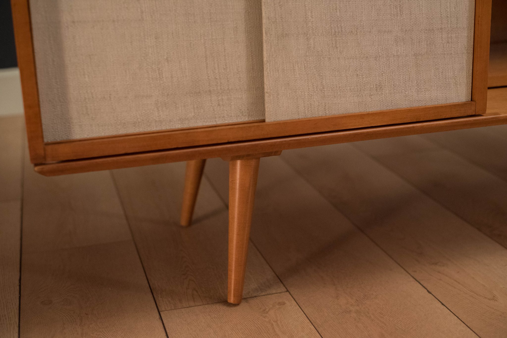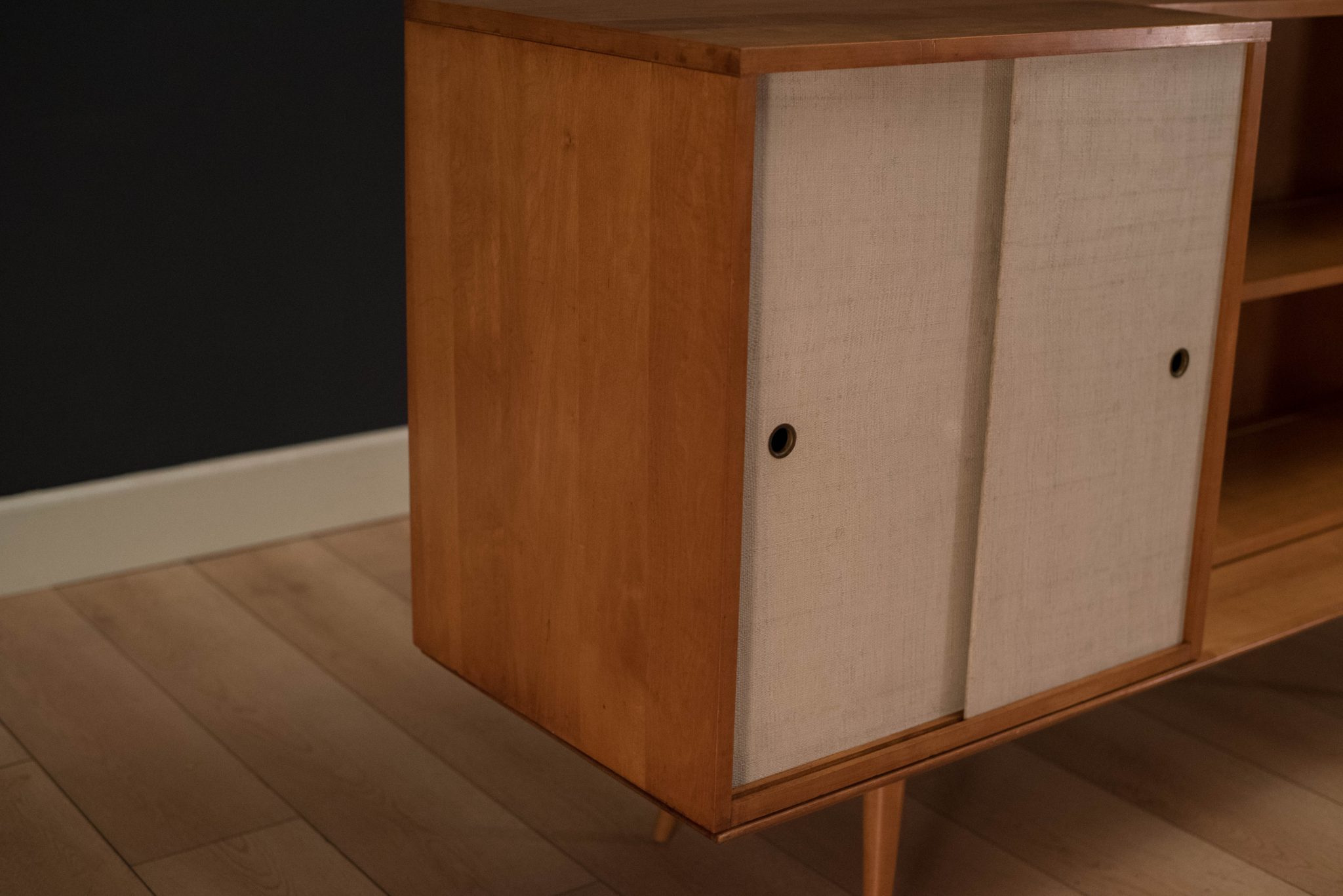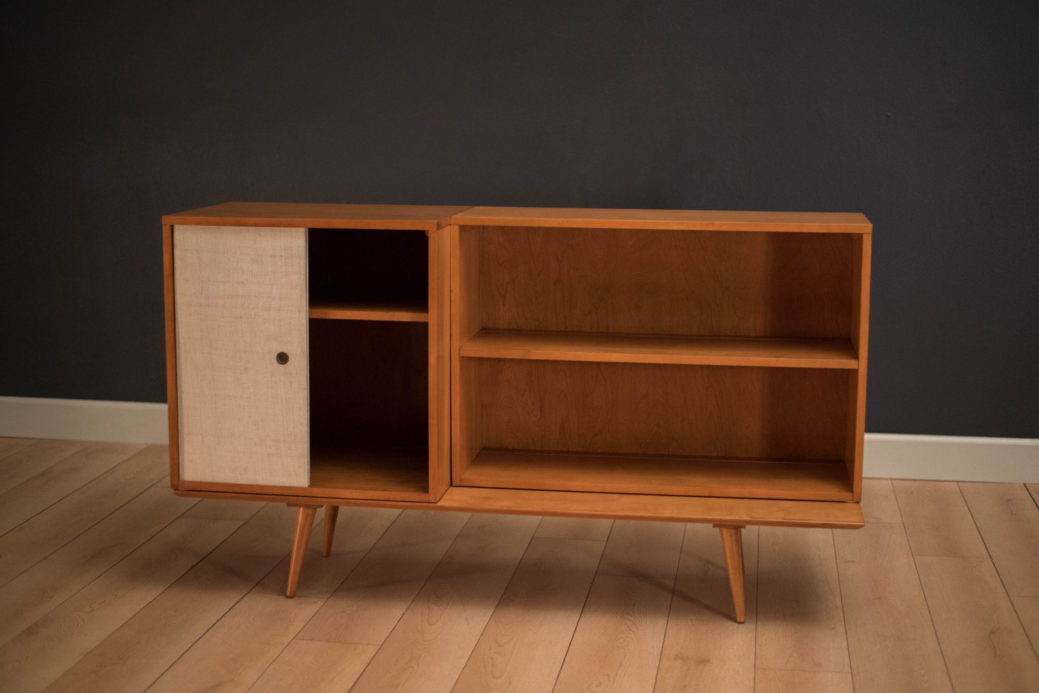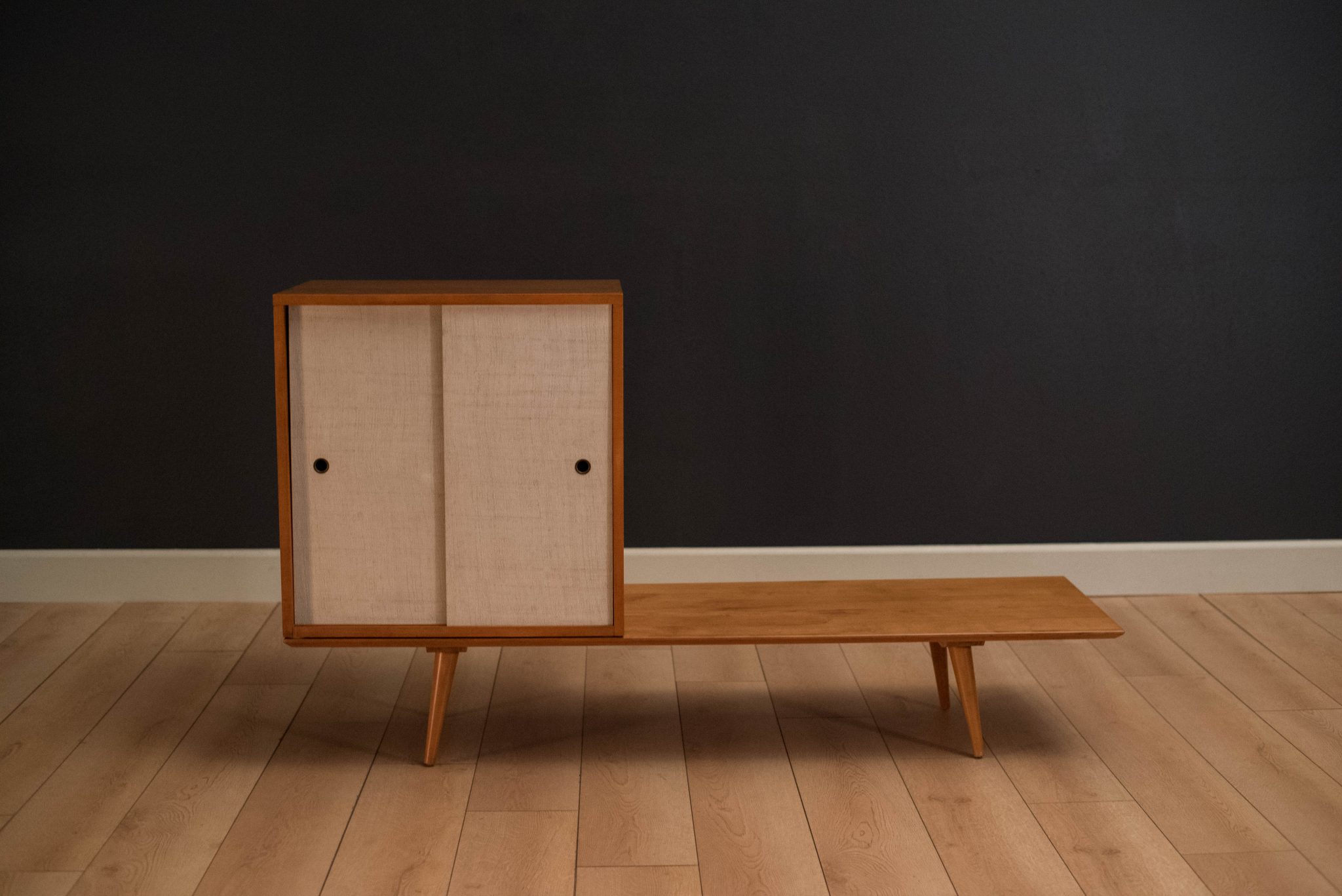 Mid Century Planner Group Modular Credenza by Paul McCobb for Winchedon Furniture. This set comes in three separate pieces and can be configured in any arrangement. Includes a fixed shelf cabinet with the original white grass cloth sliding doors, table bench and open bookcase with fixed shelving.