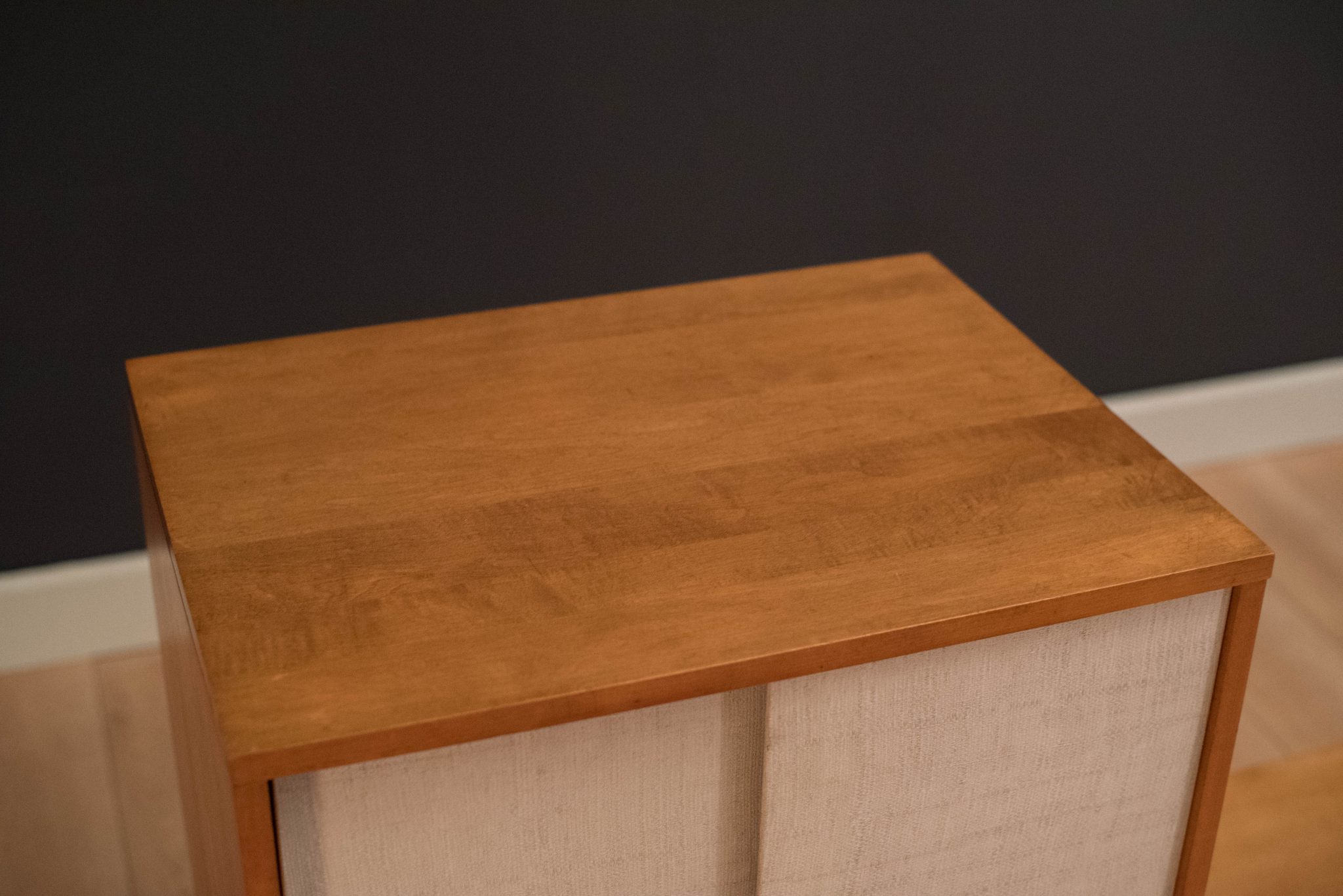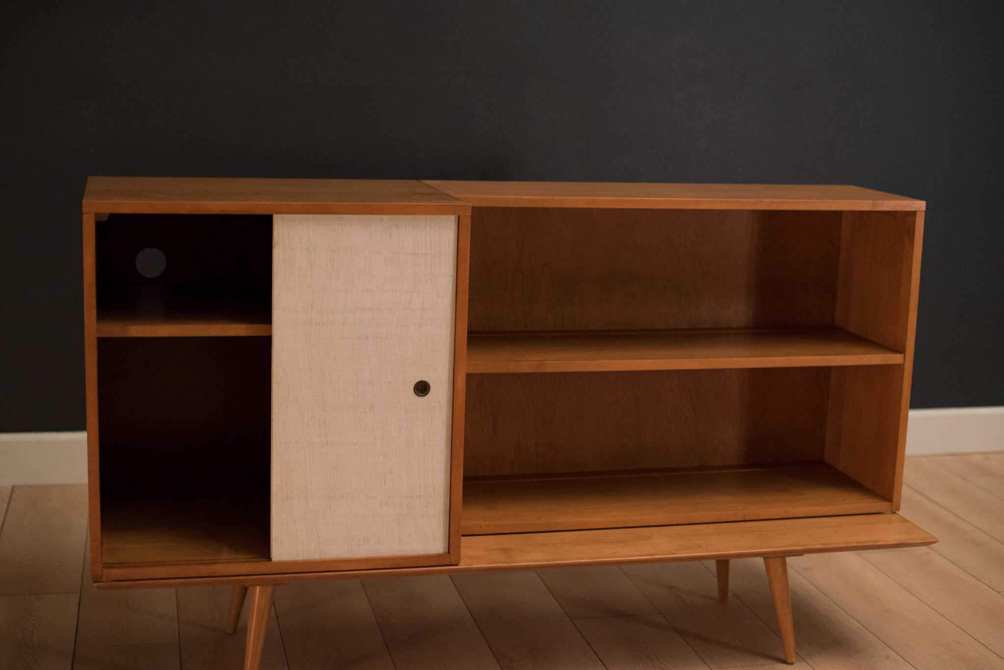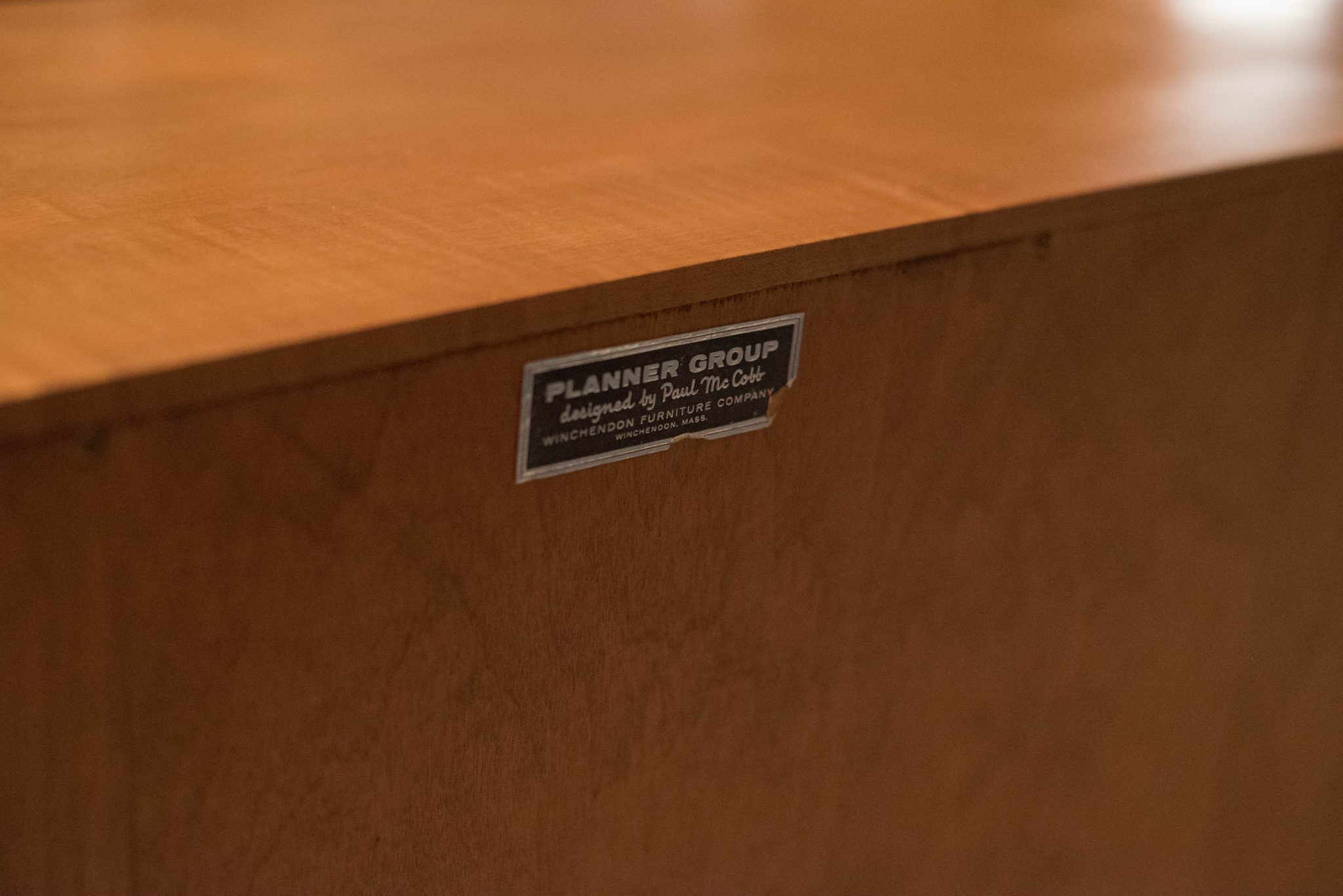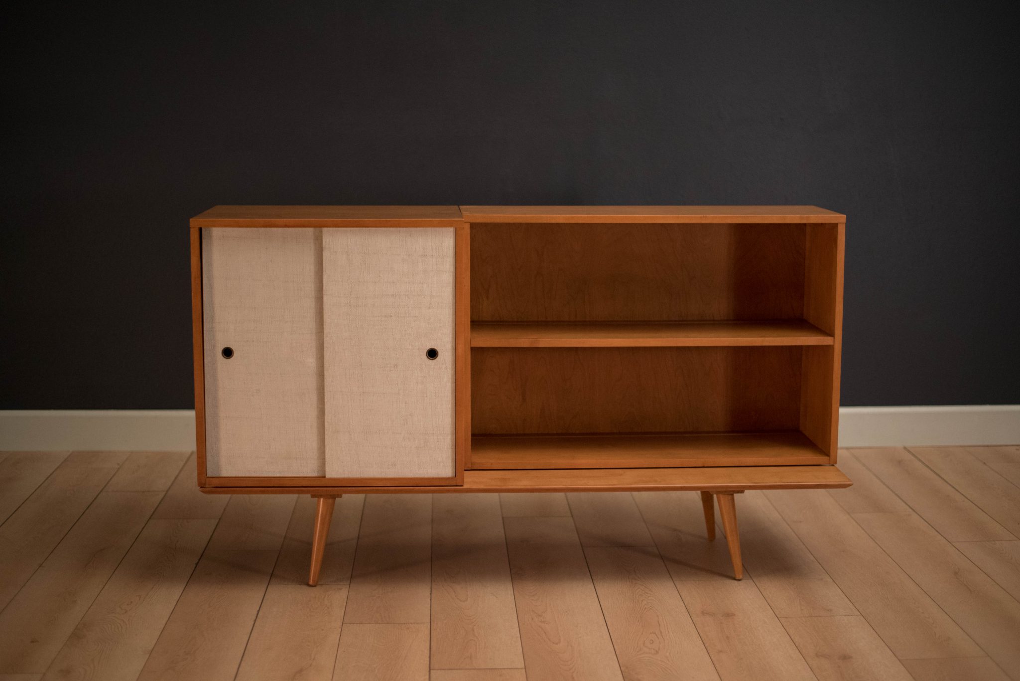 Mid Century Planner Group Modular Credenza by Paul McCobb for Winchedon Furniture. This set comes in three separate pieces and can be configured in any arrangement. Includes a fixed shelf cabinet with the original white grass cloth sliding doors, table bench and open bookcase with fixed shelving.