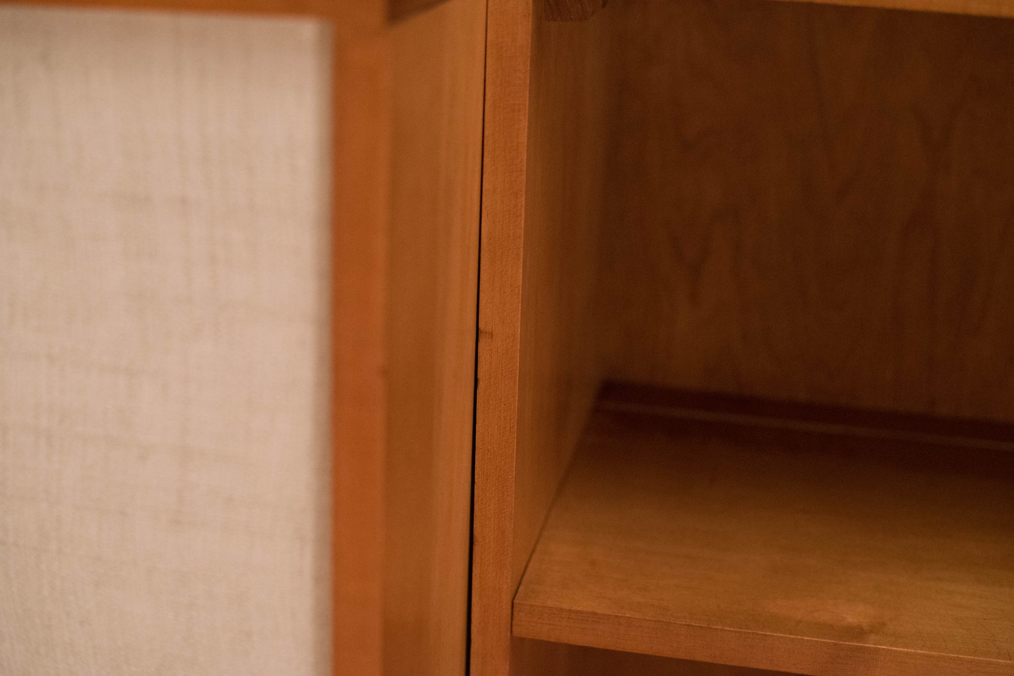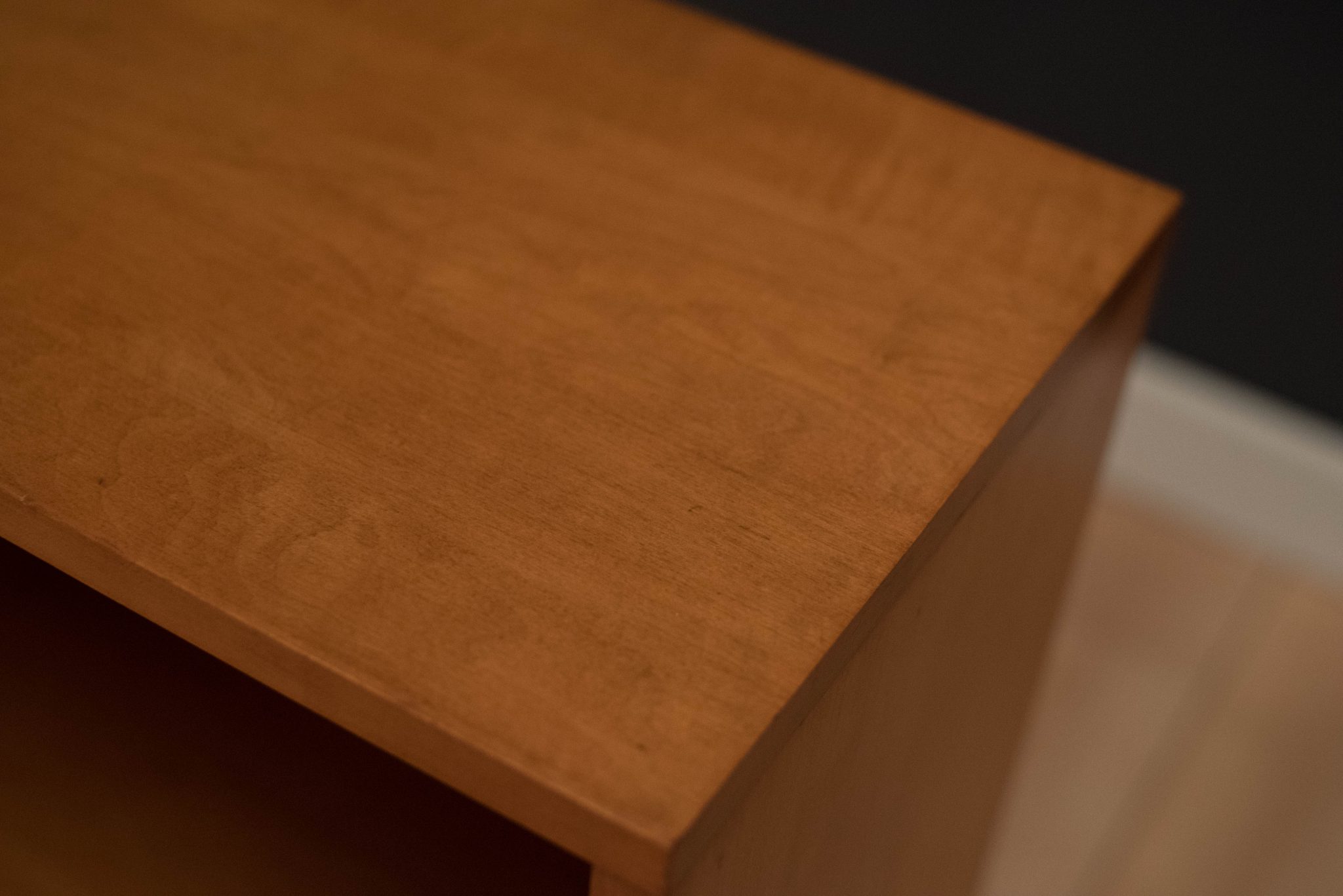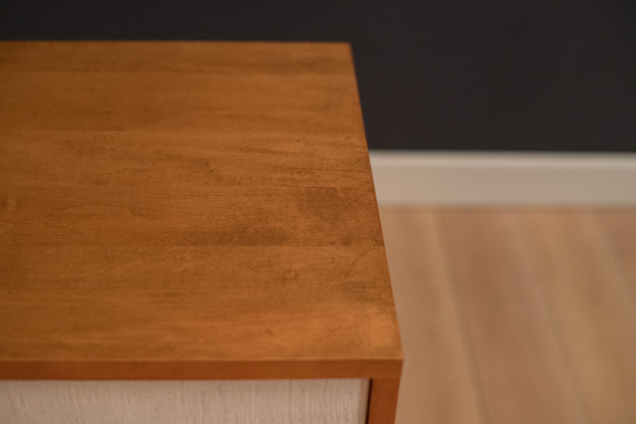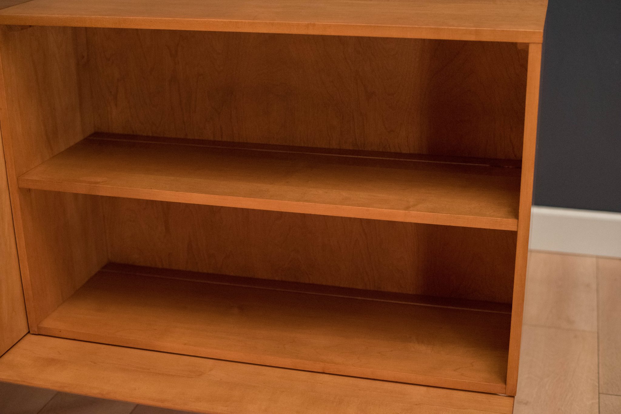 Mid Century Planner Group Modular Credenza by Paul McCobb for Winchedon Furniture. This set comes in three separate pieces and can be configured in any arrangement. Includes a fixed shelf cabinet with the original white grass cloth sliding doors, table bench and open bookcase with fixed shelving.