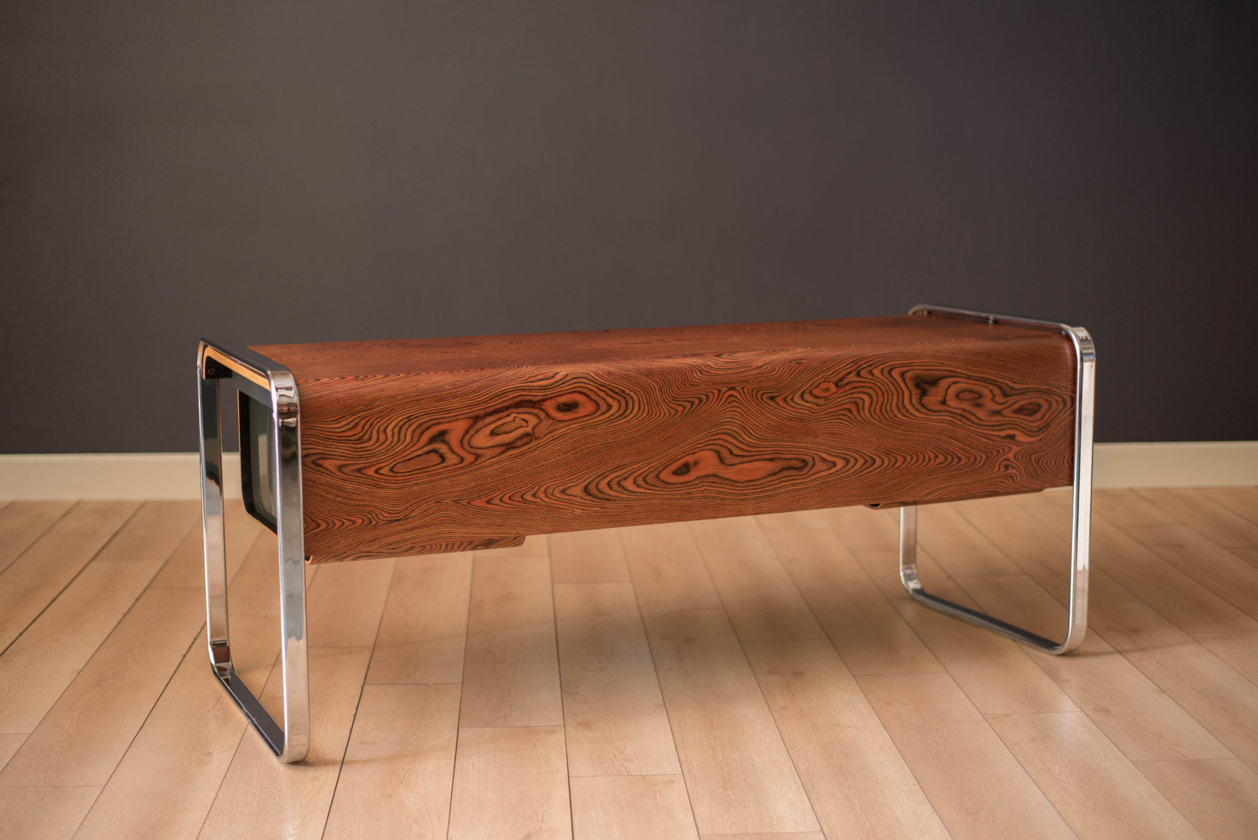Mid century floating executive desk designed by Peter Protzman for Herman Miller, circa 1970-1971. This piece features stunning African zebrawood grains with curved stacked laminated plywood supported by chrome-plated steel legs. Includes two extension filing drawers in smoked lucite and one organizing drawer. Showcases from any angle with a finished grain backside.