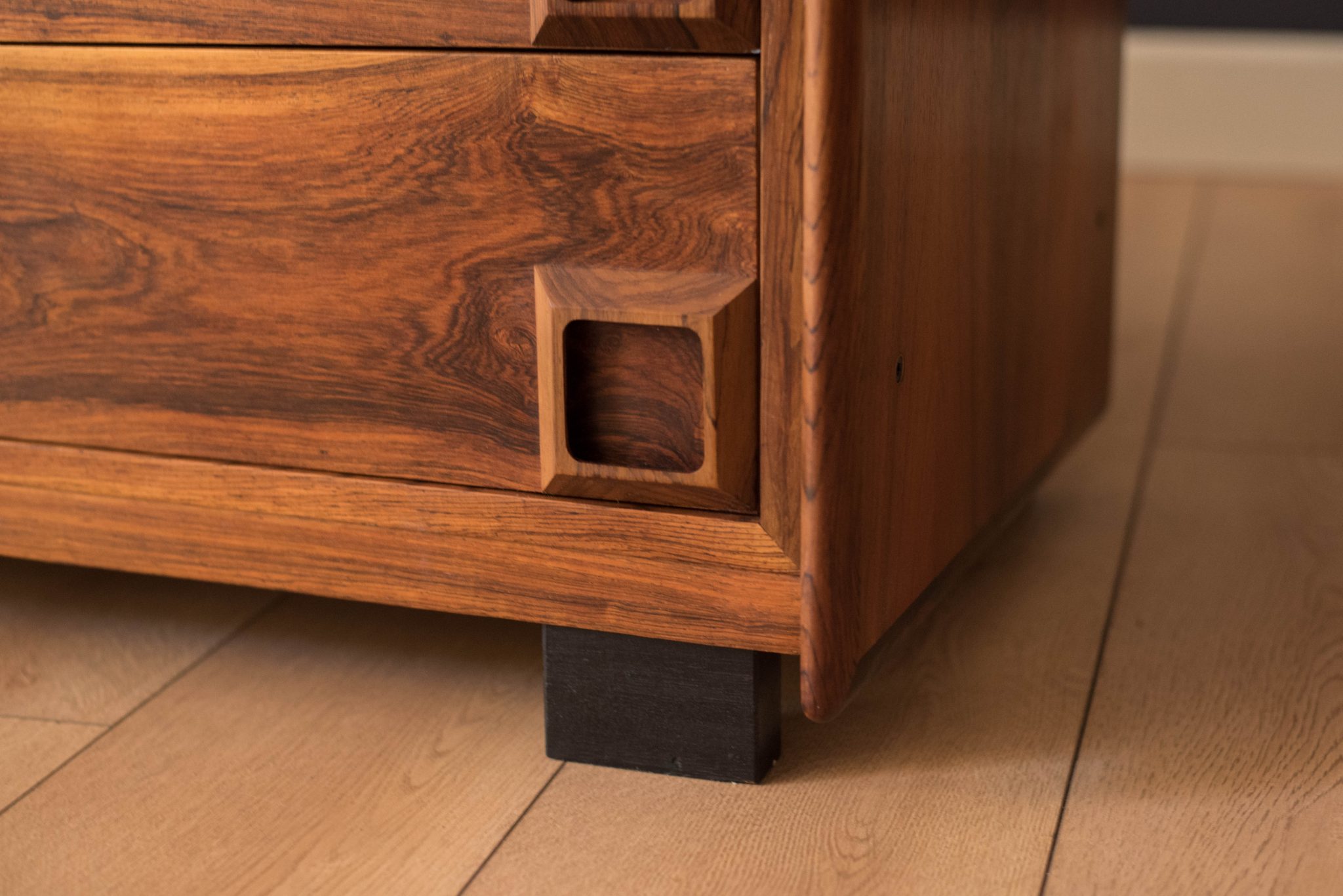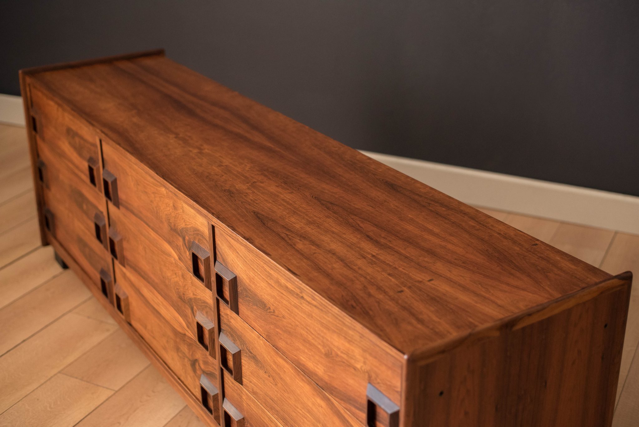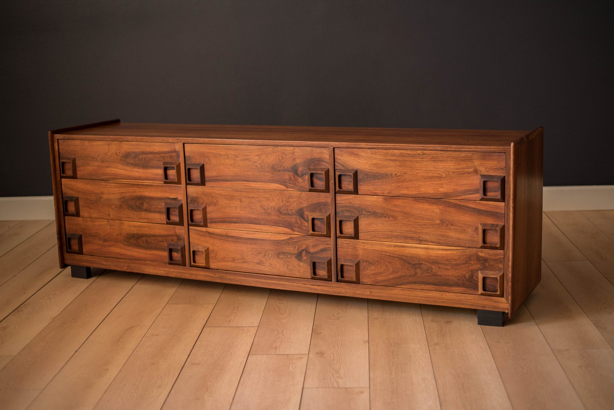 Mid-Century Modern rosewood dresser manufactured by Inter-Continental Design Limited, Canada. This piece features nine dovetailed drawers with sculpted modernist handles. Displays a low profile with external raised edges. Matching pair of nightstands available in separate listing.