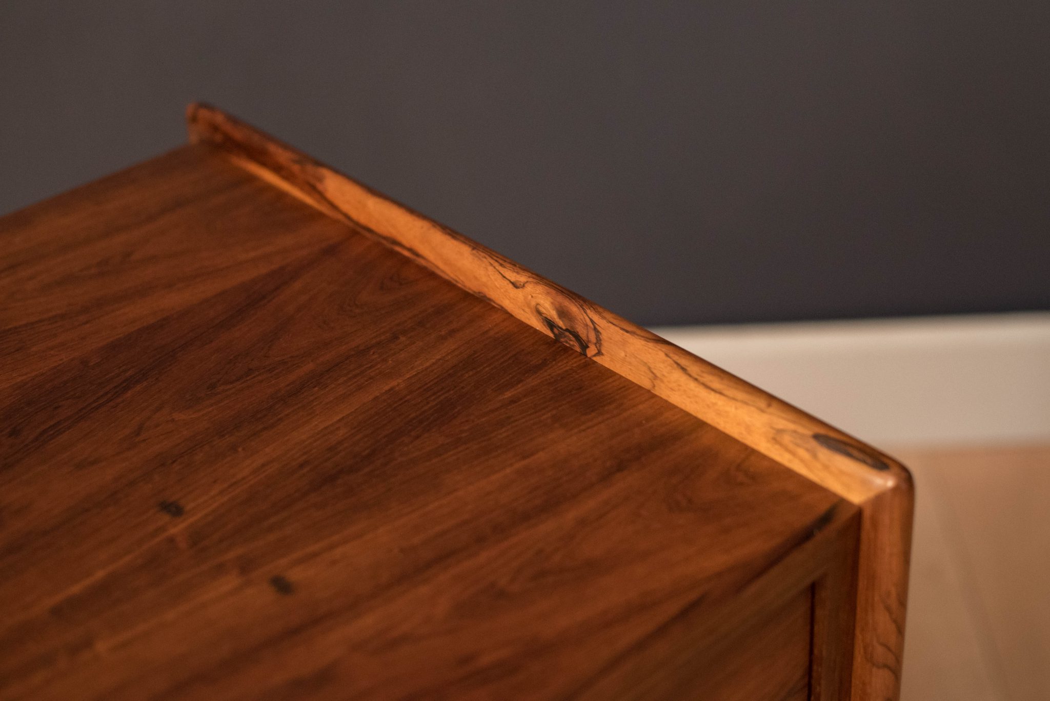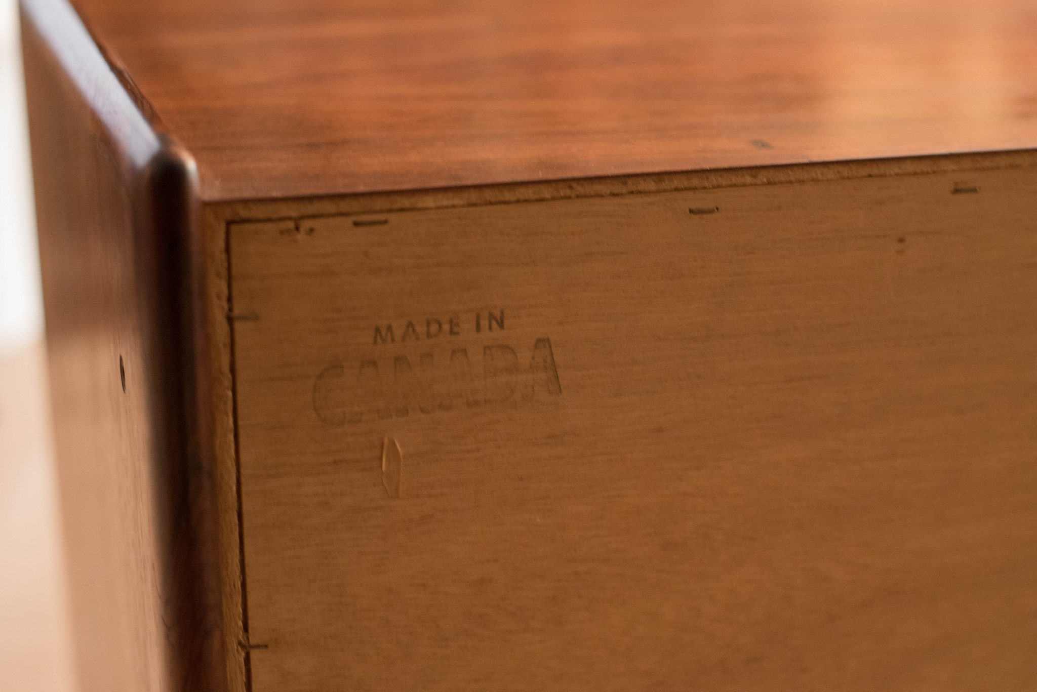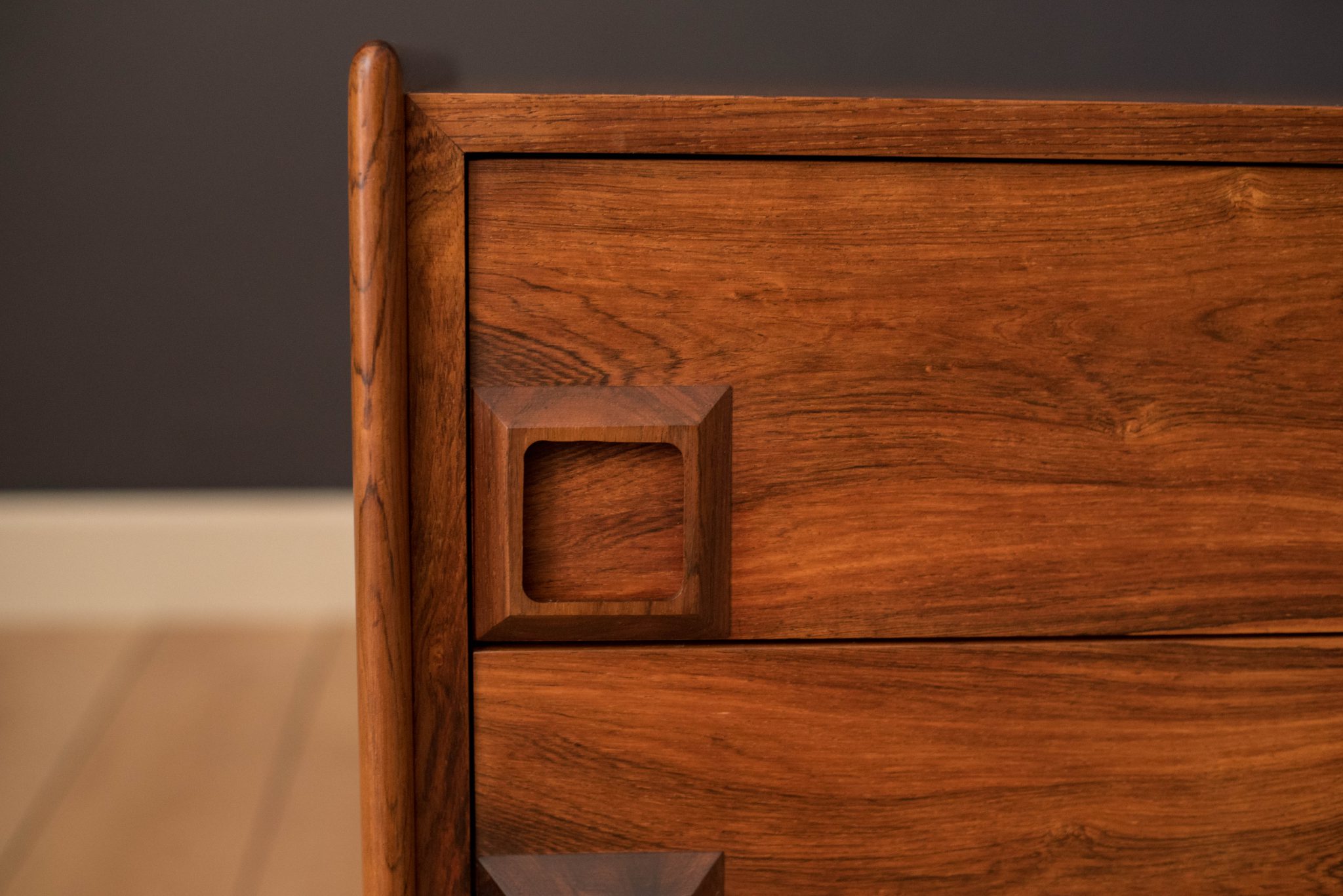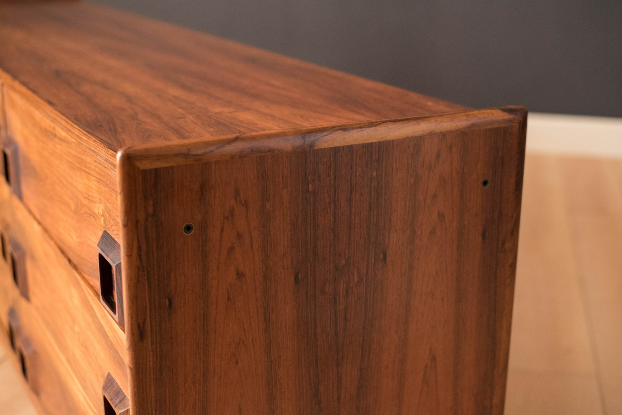 Mid-Century Modern rosewood dresser manufactured by Inter-Continental Design Limited, Canada. This piece features nine dovetailed drawers with sculpted modernist handles. Displays a low profile with external raised edges. Matching pair of nightstands available in separate listing.