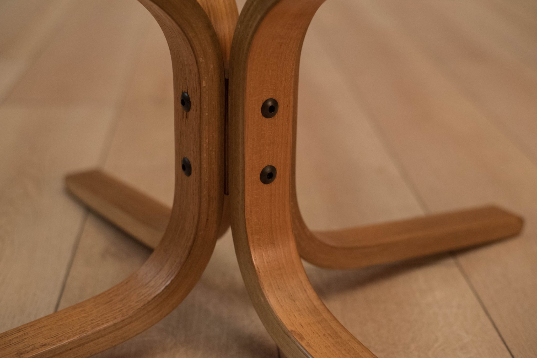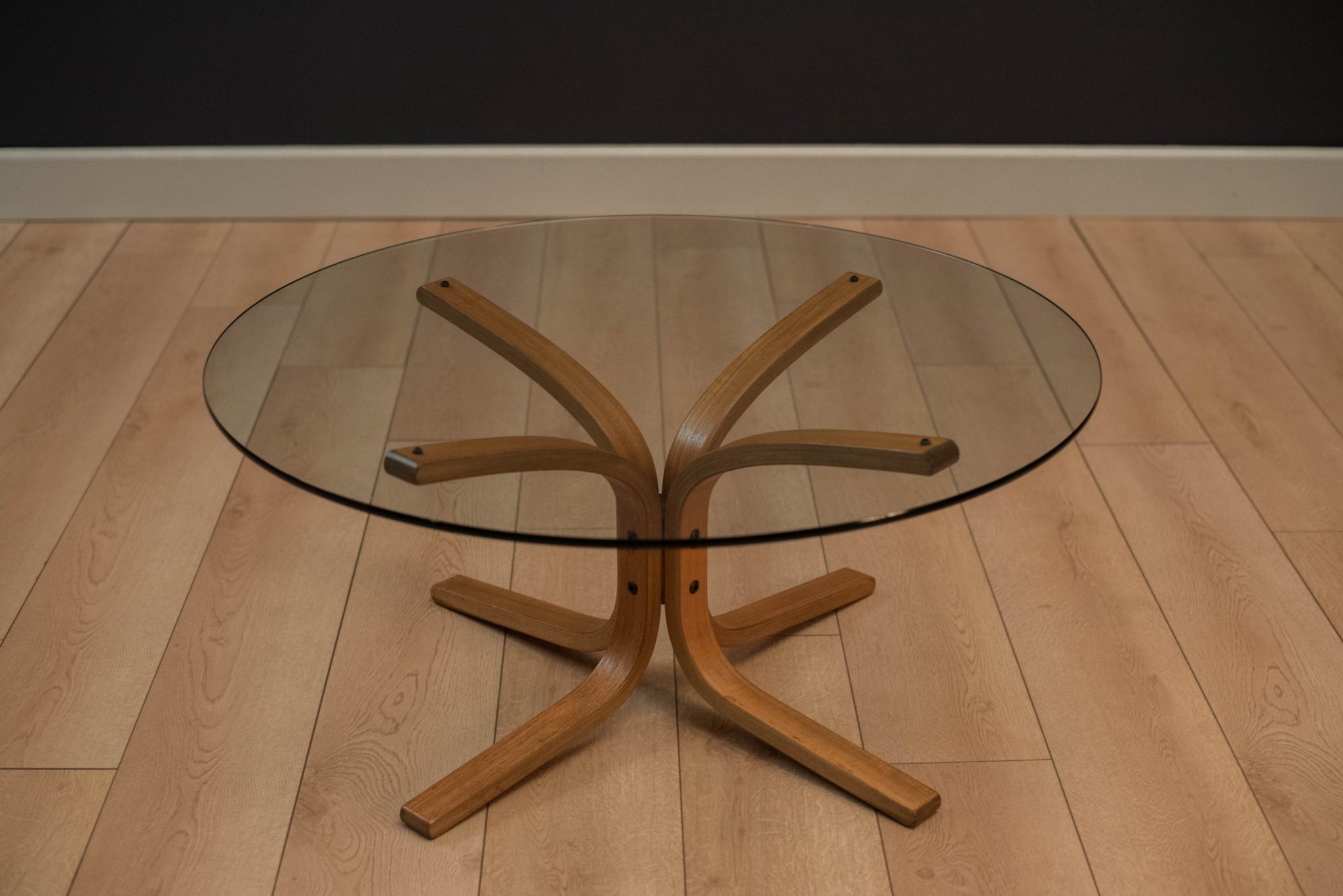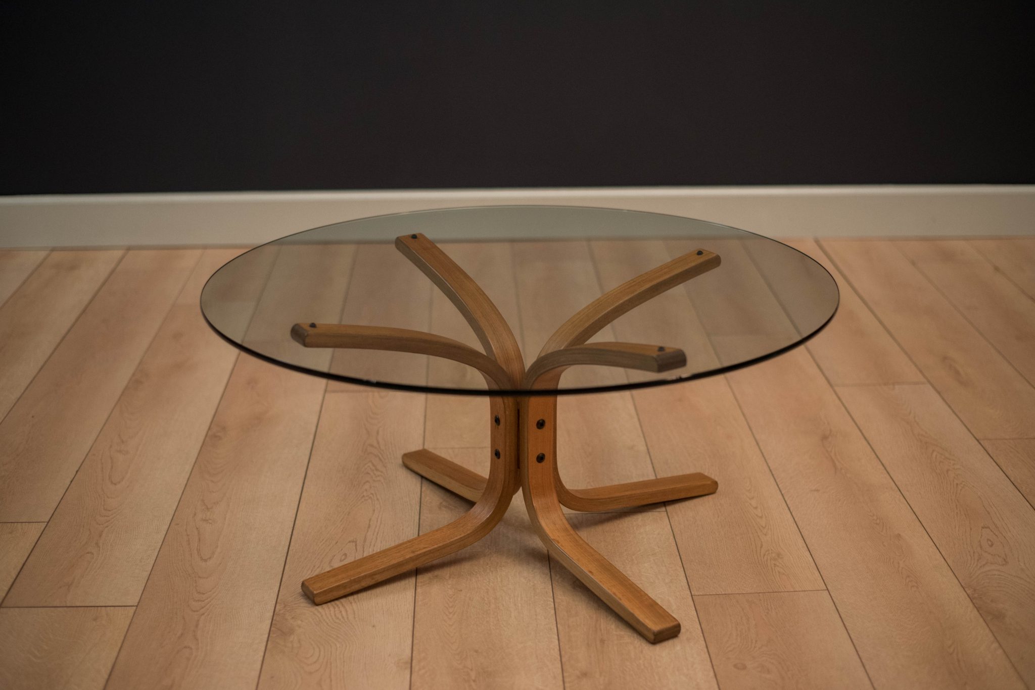 Mid-century glass and teak coffee table designed by Ingmar Relling for Westnofa. This piece features a unique teak bent plywood base and includes a 3/8″ thick glass top.