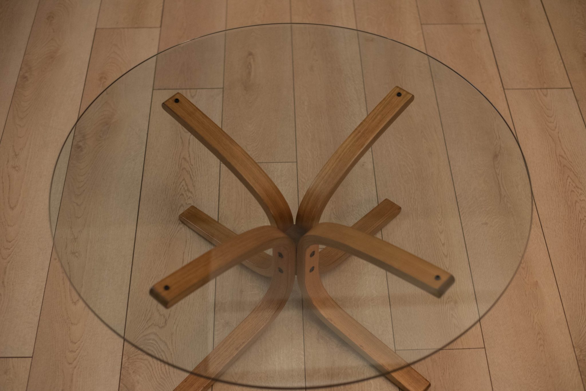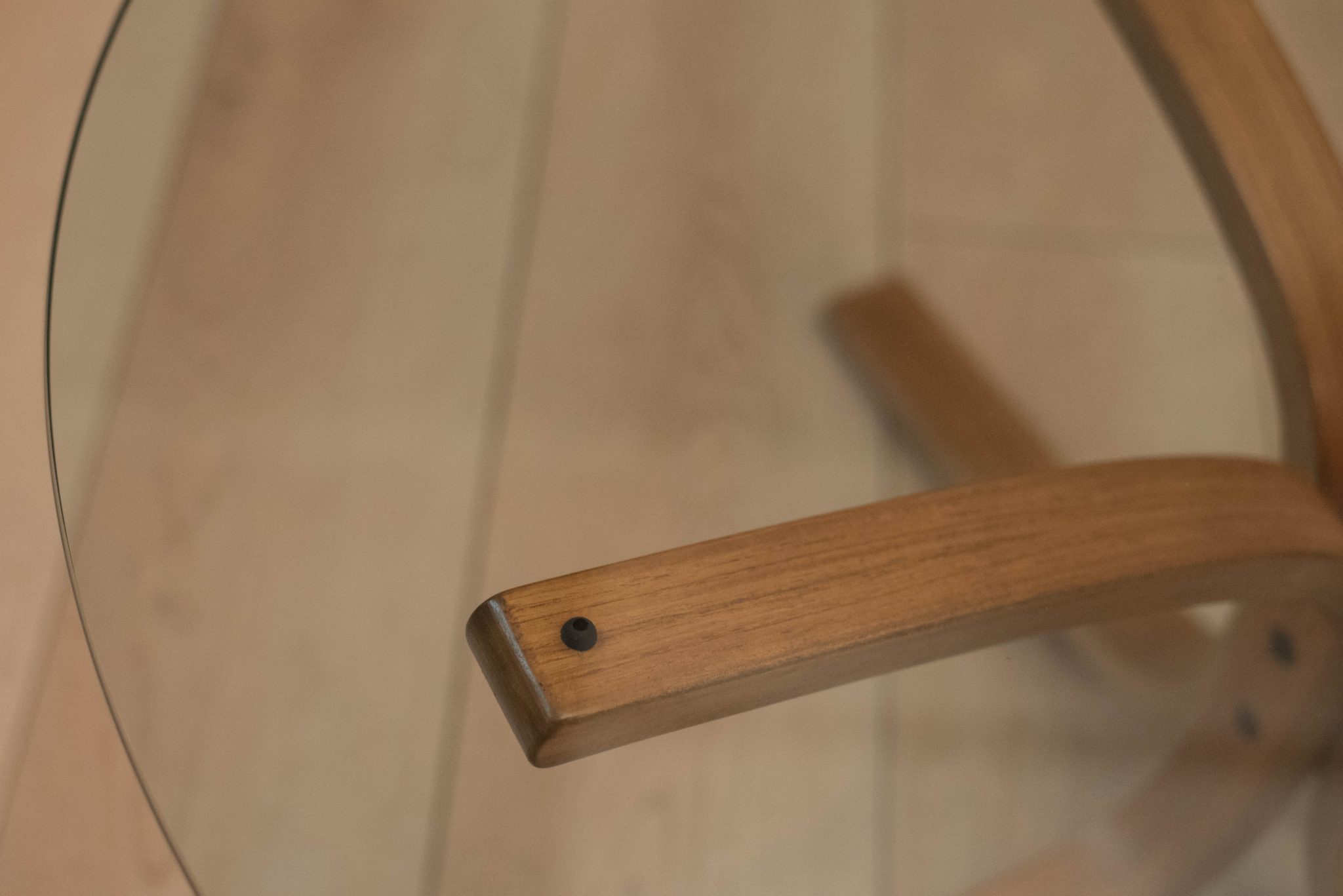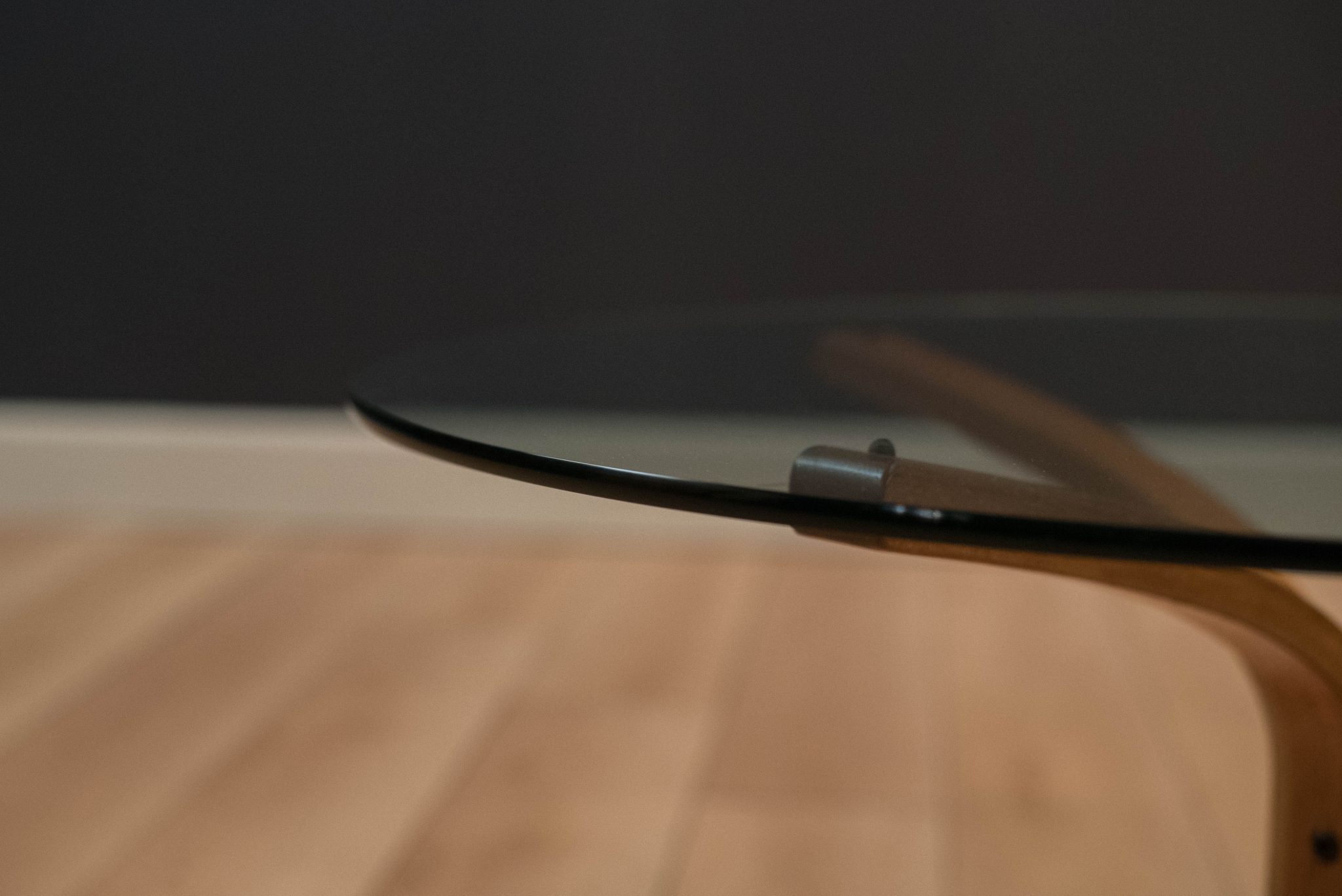 Mid-century glass and teak coffee table designed by Ingmar Relling for Westnofa. This piece features a unique teak bent plywood base and includes a 3/8″ thick glass top.