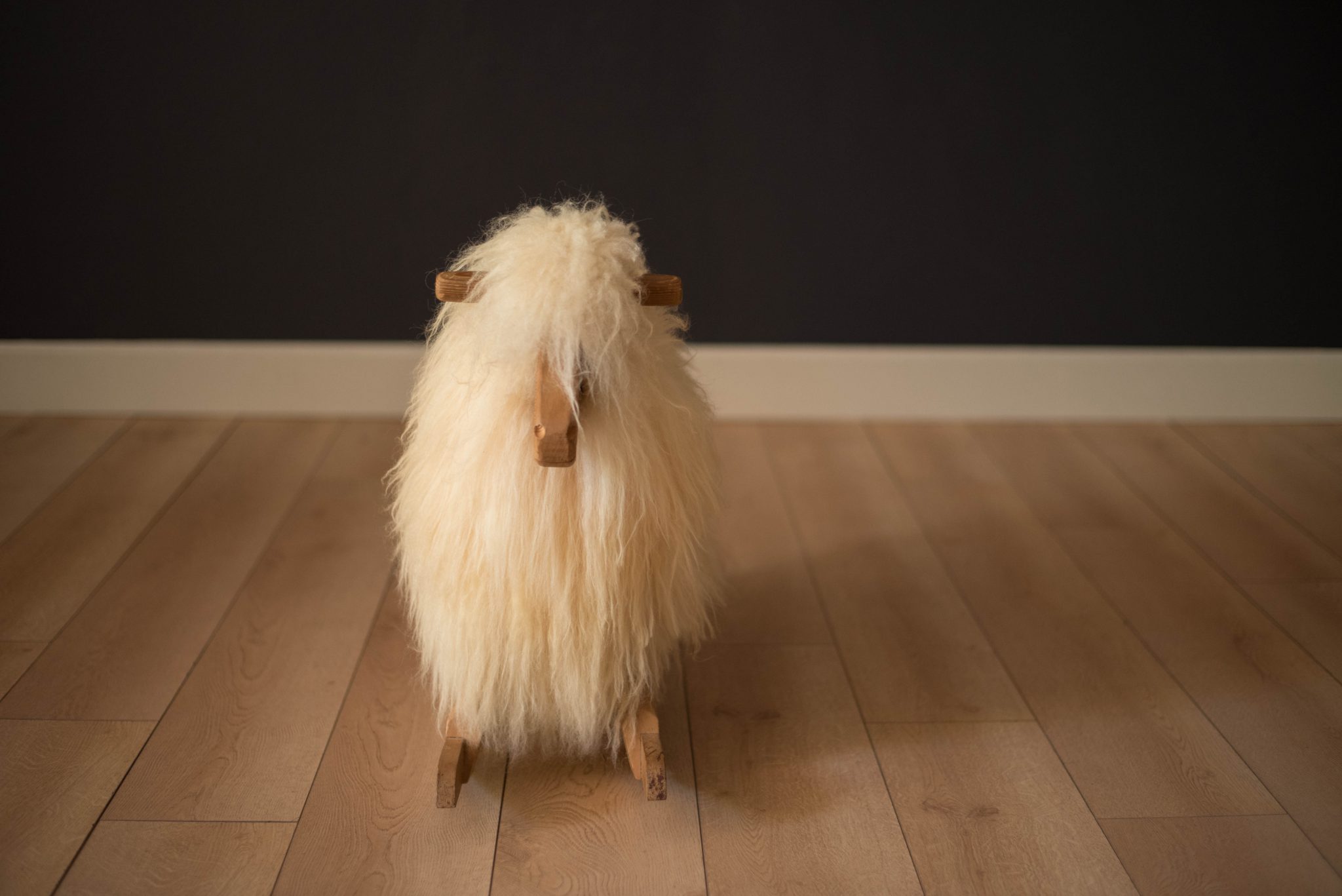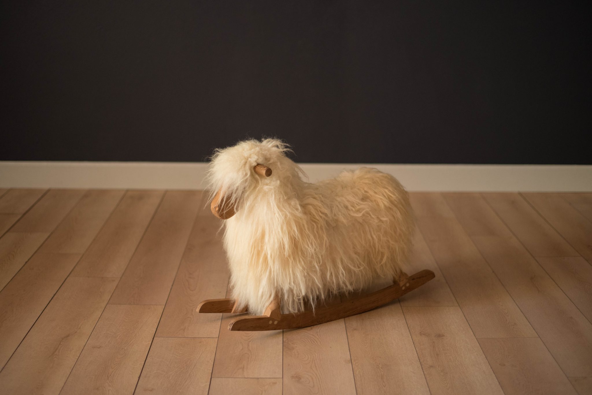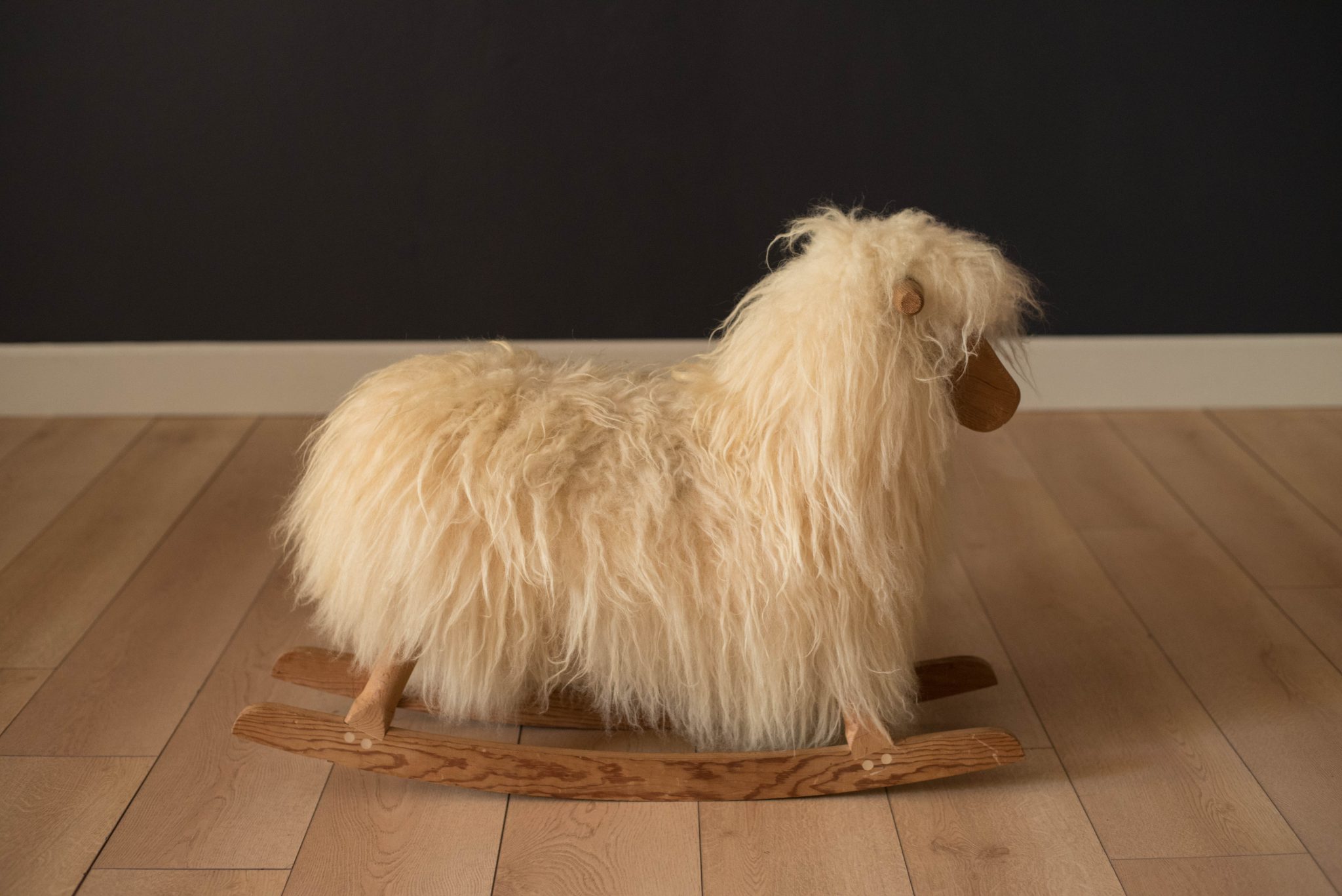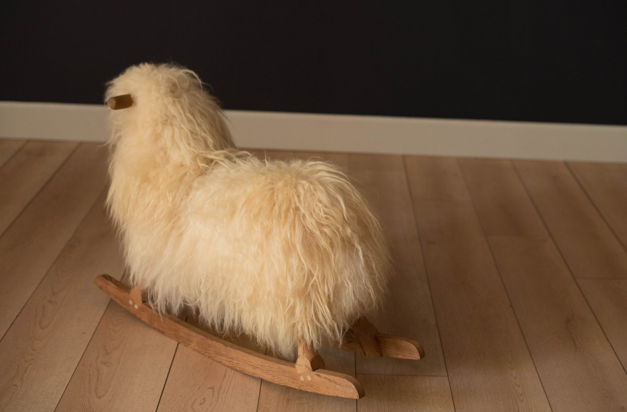 Vintage children’s rocker sheep designed by Povl Kjer. This decorative animal sculpture is a playful conversation for any space. Handcrafted in genuine wool and solid pine.