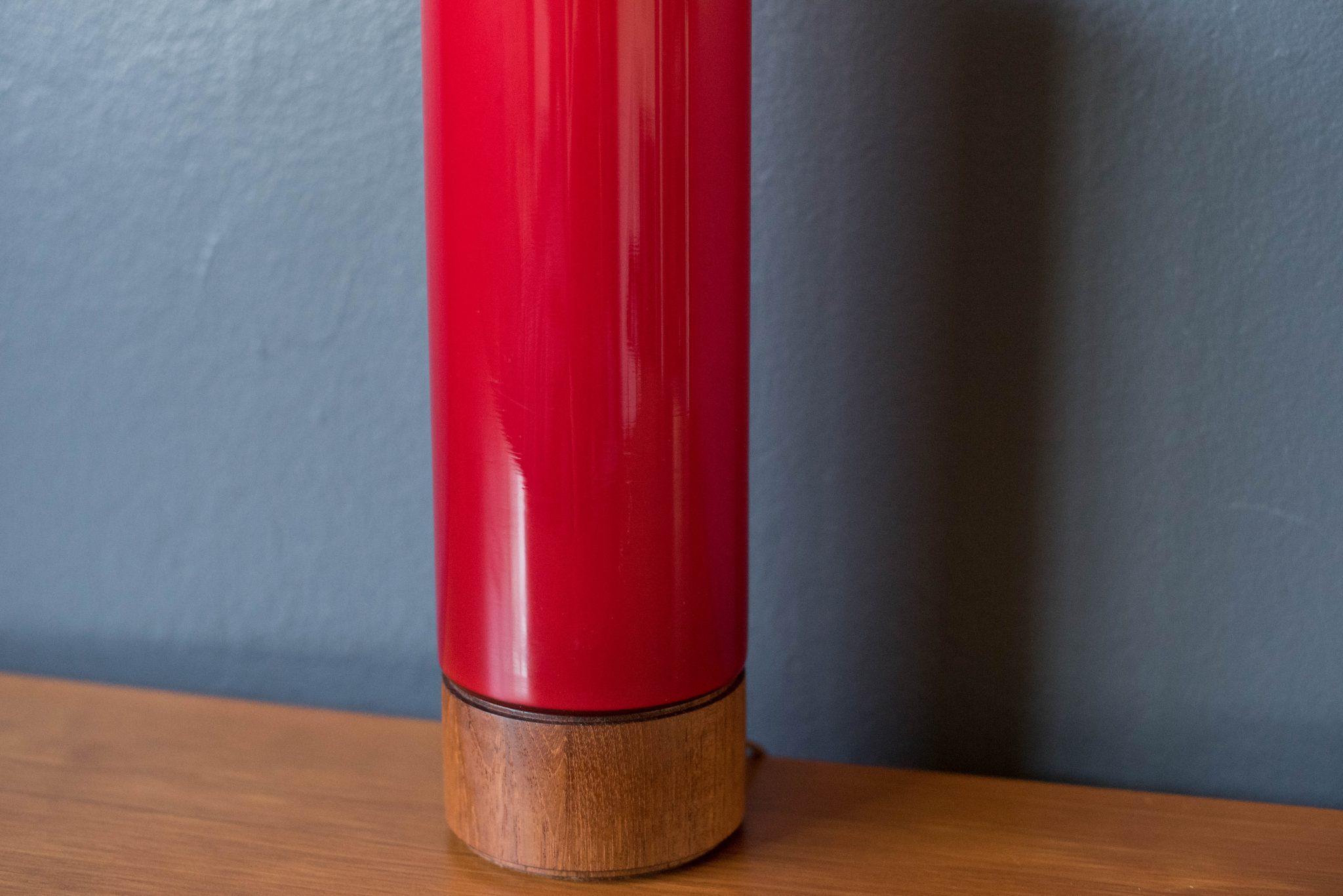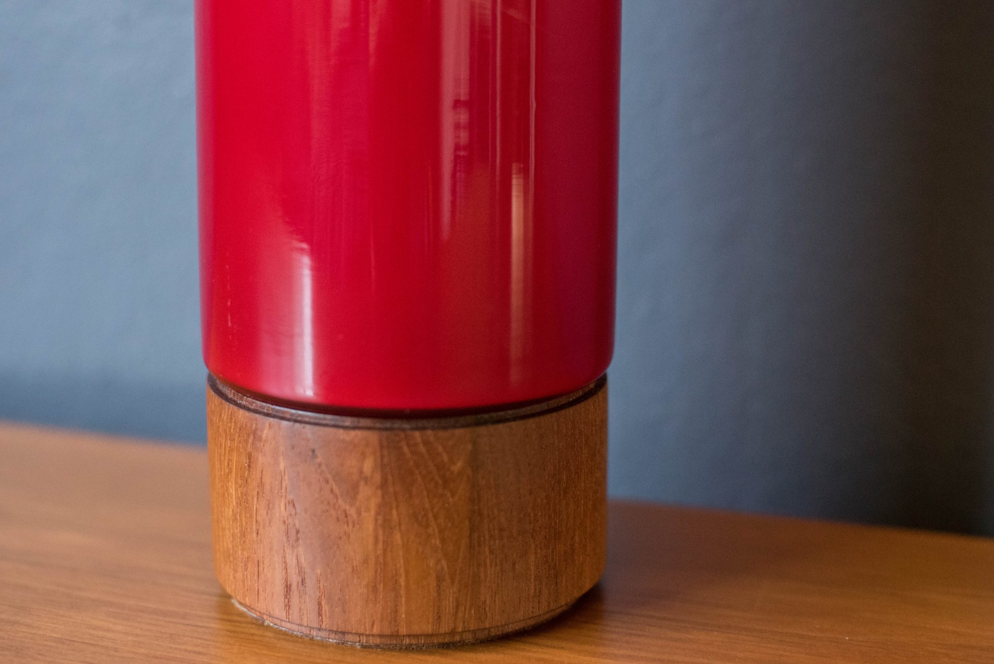 Mid century Scandinavian handblown glass lamp, circa 1960s. This piece has a deep red cylinder shade accented with frosted white interior and a supporting teak base.