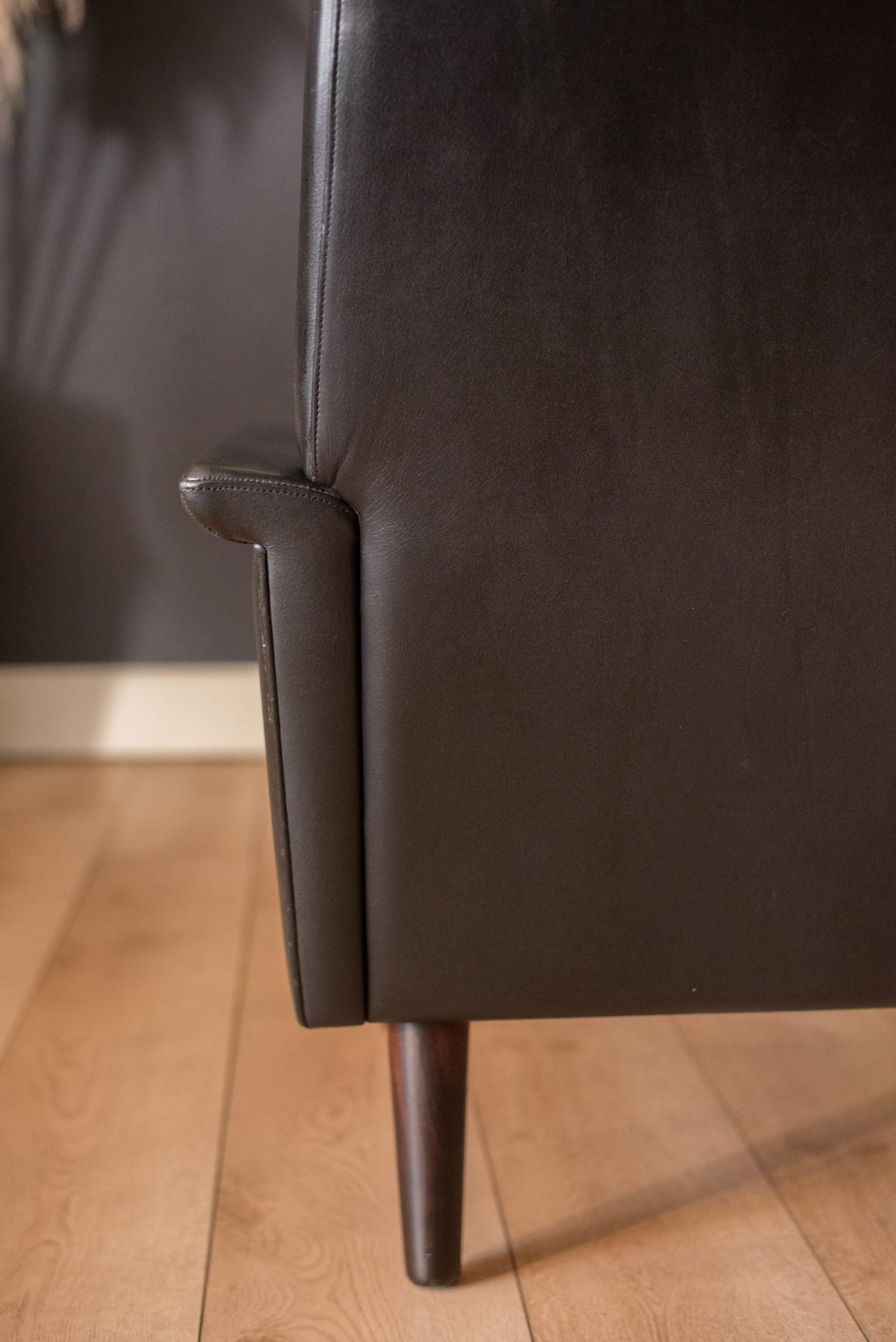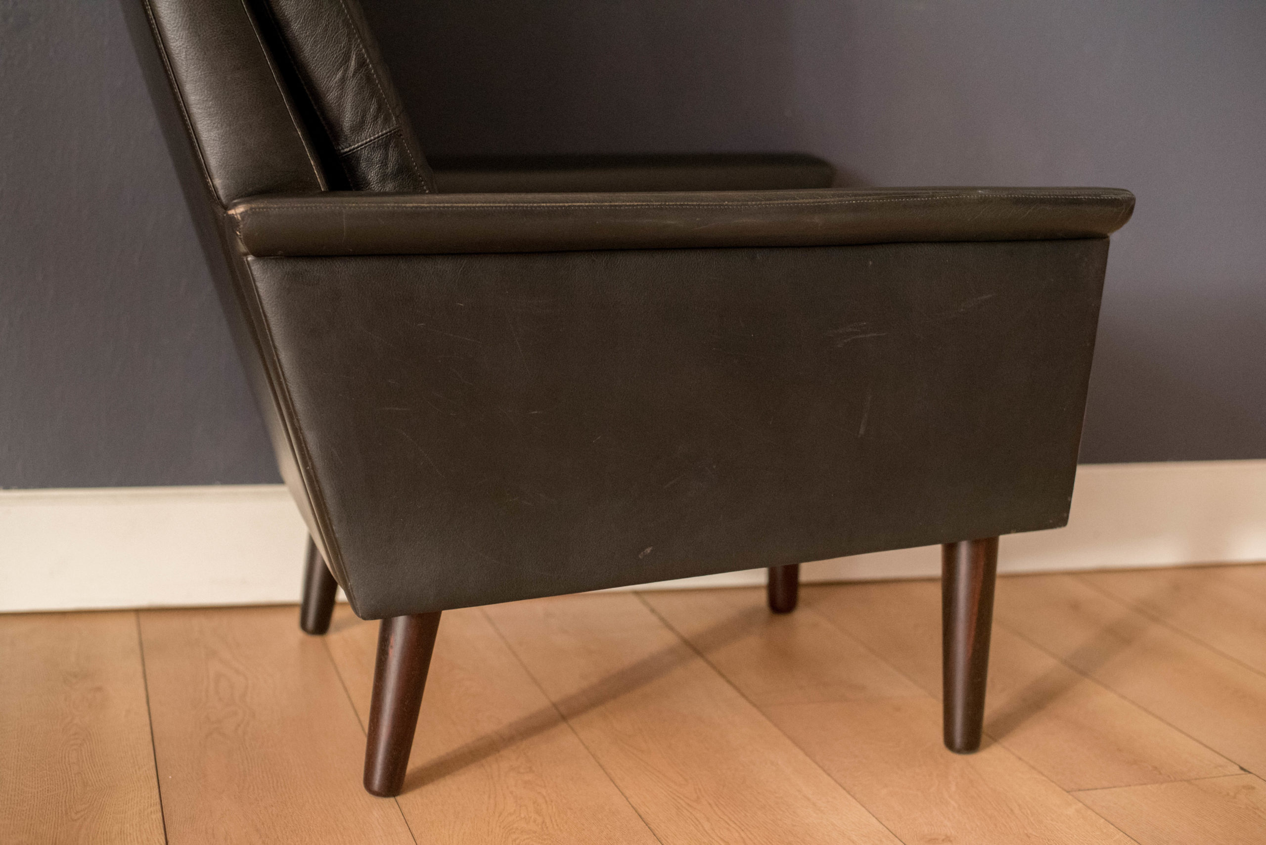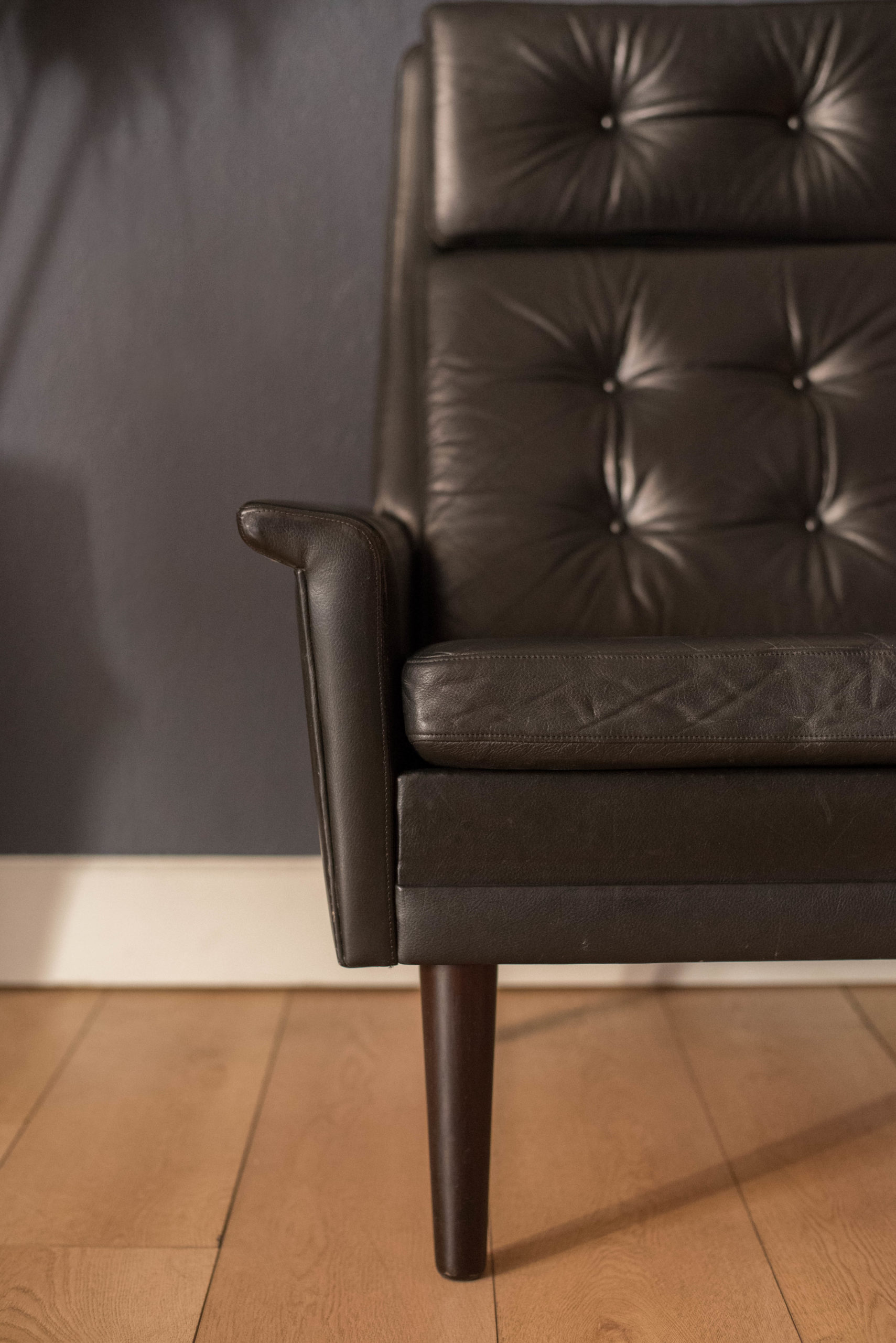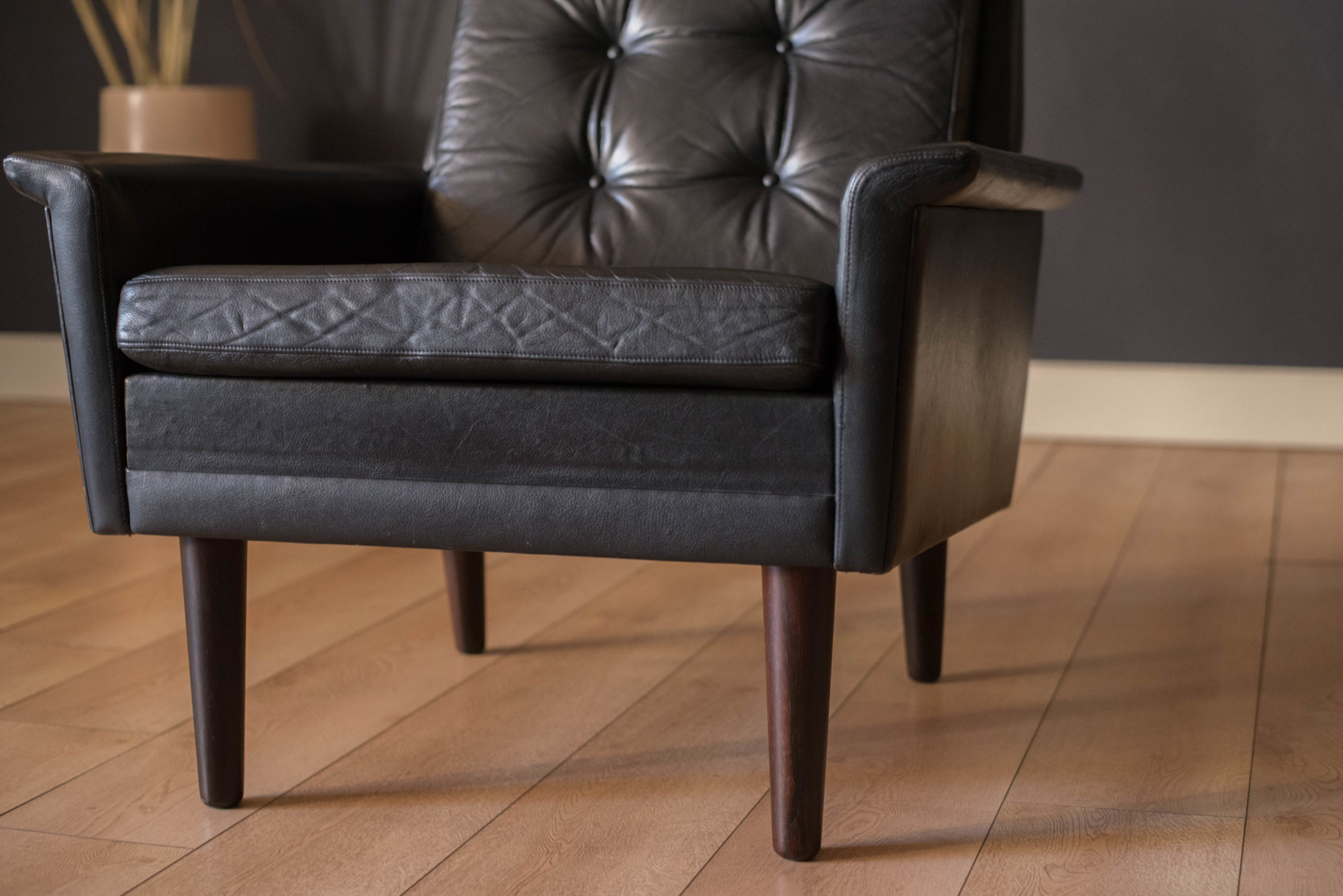 Mid century modern highback lounge chair in rosewood and leather circa 1960’s, Denmark. Features the original patinated black leather and sculptural curved armrests supported by rosewood angled tapered legs. This relaxing lounge chair includes three removable cushions with brand new foam and a tufted seat design. Matching sofa available in separate listing.