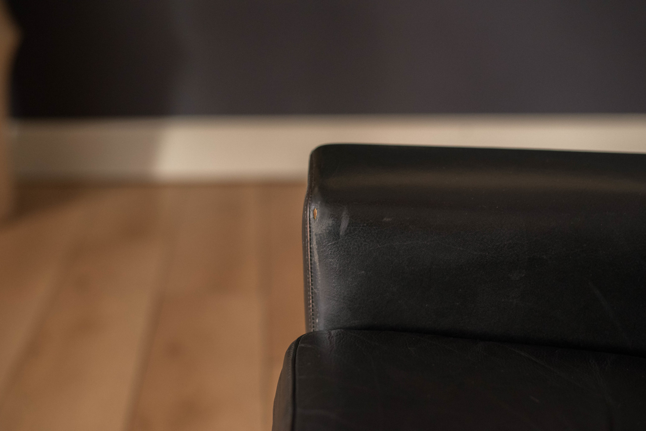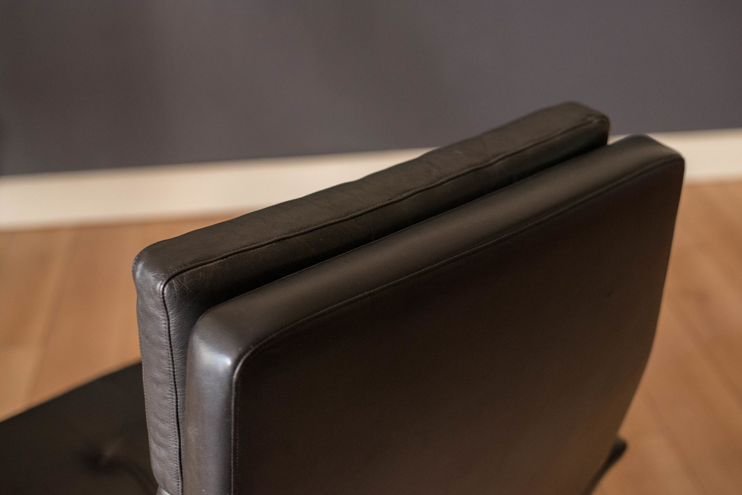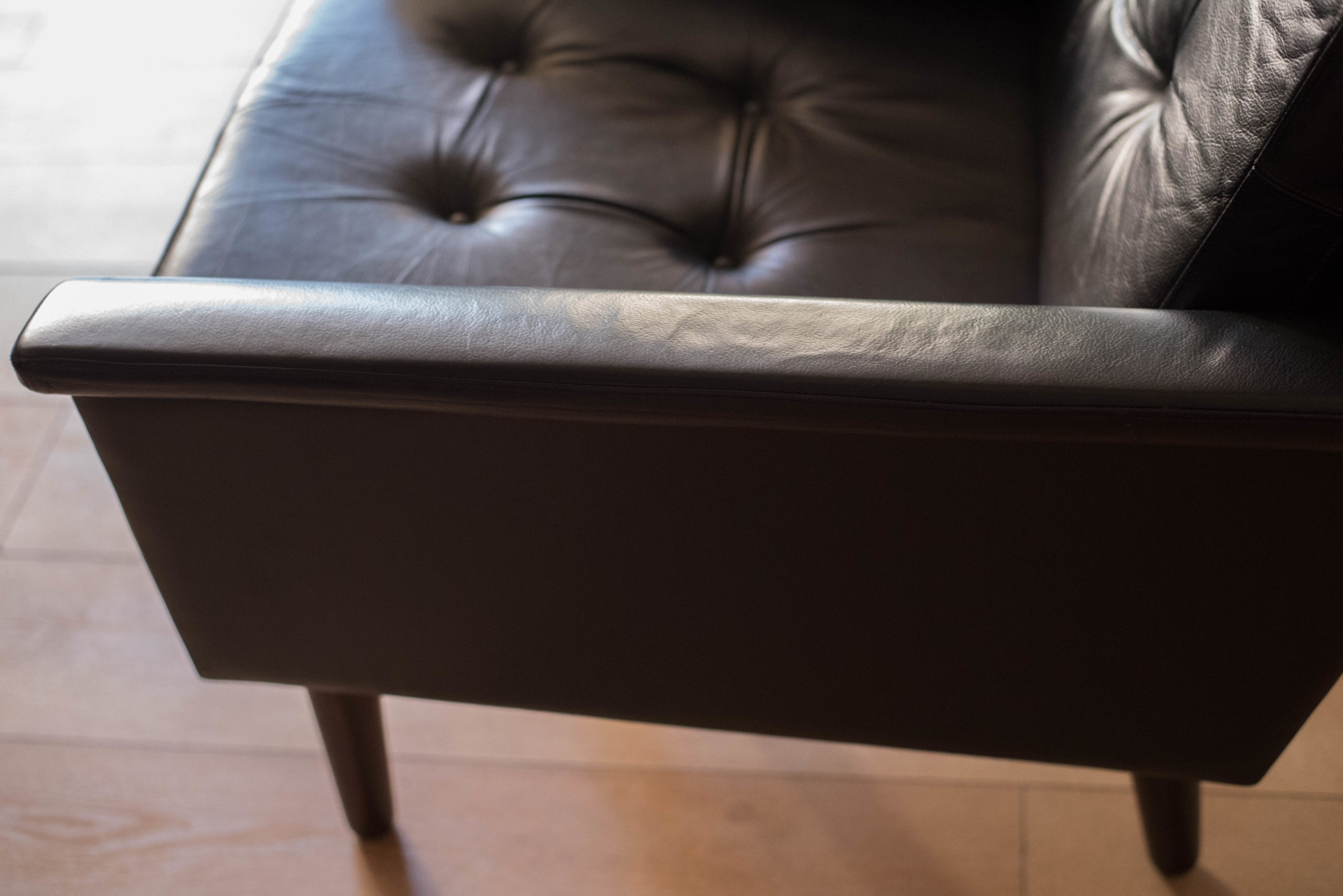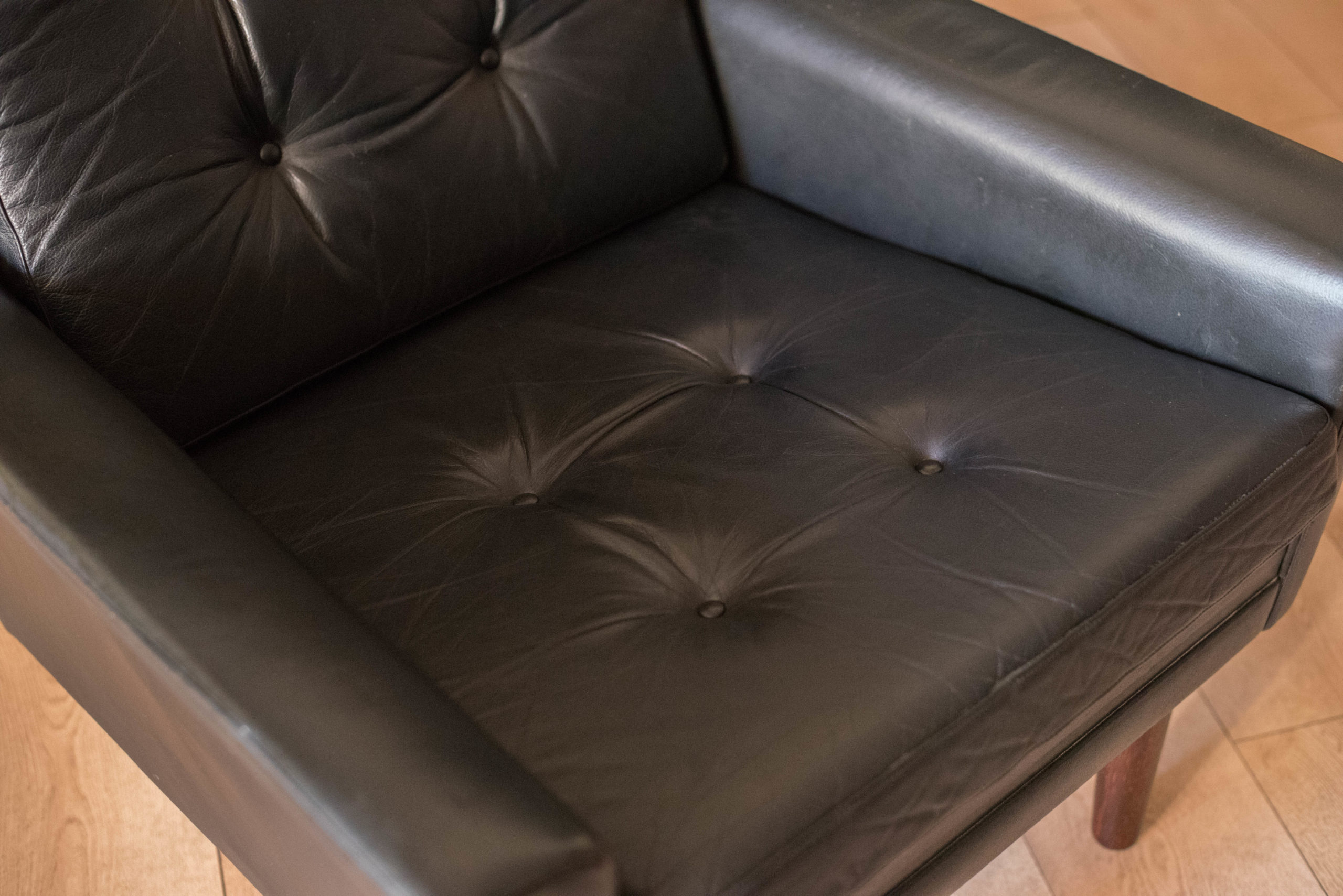 Mid century modern highback lounge chair in rosewood and leather circa 1960’s, Denmark. Features the original patinated black leather and sculptural curved armrests supported by rosewood angled tapered legs. This relaxing lounge chair includes three removable cushions with brand new foam and a tufted seat design. Matching sofa available in separate listing.