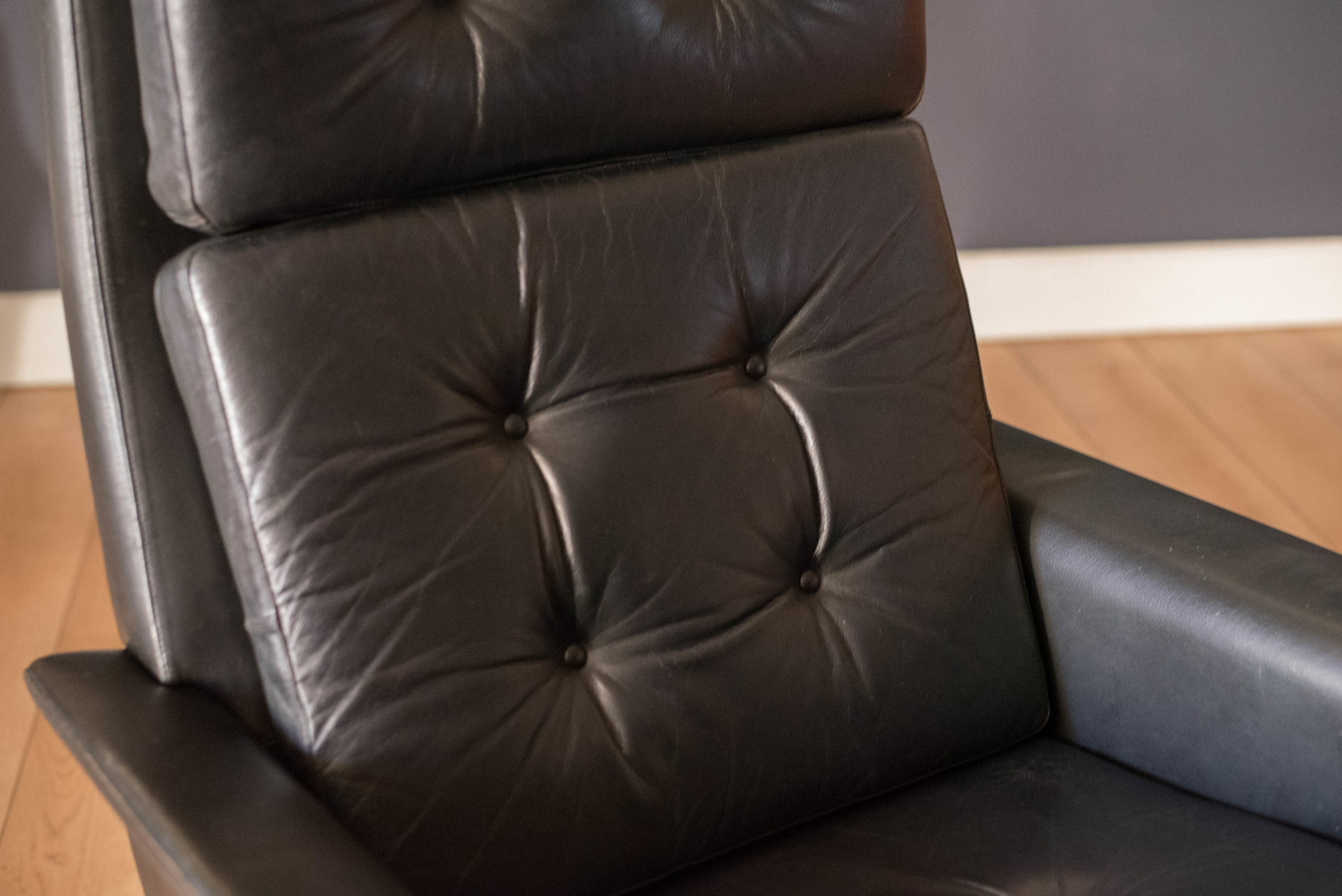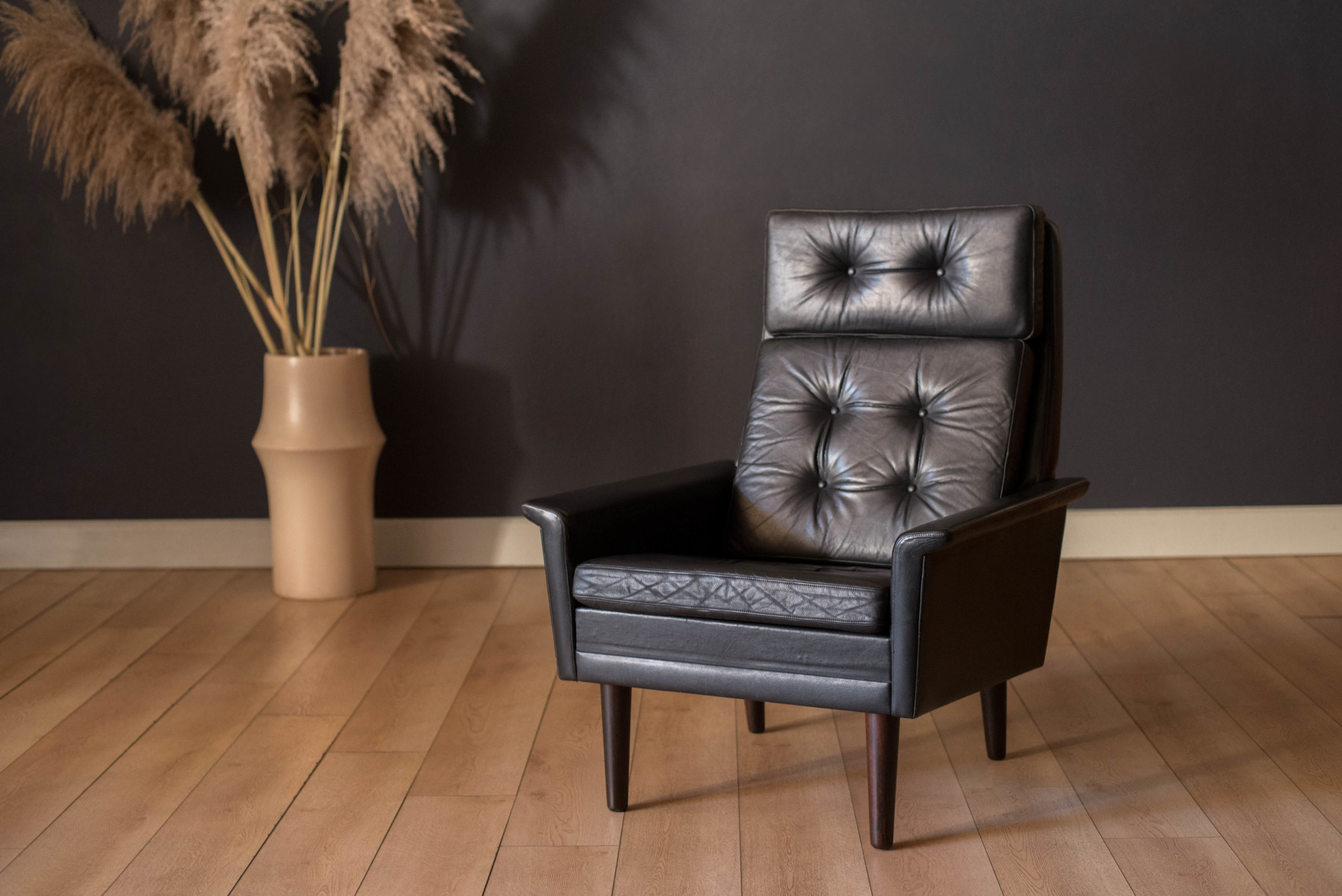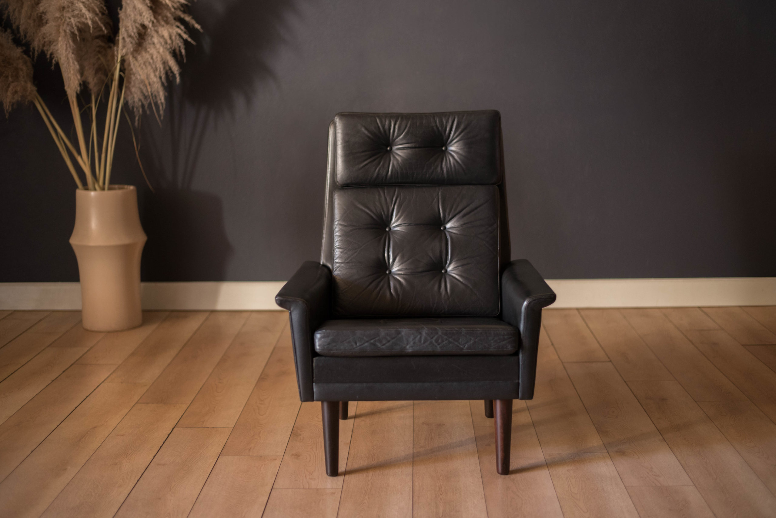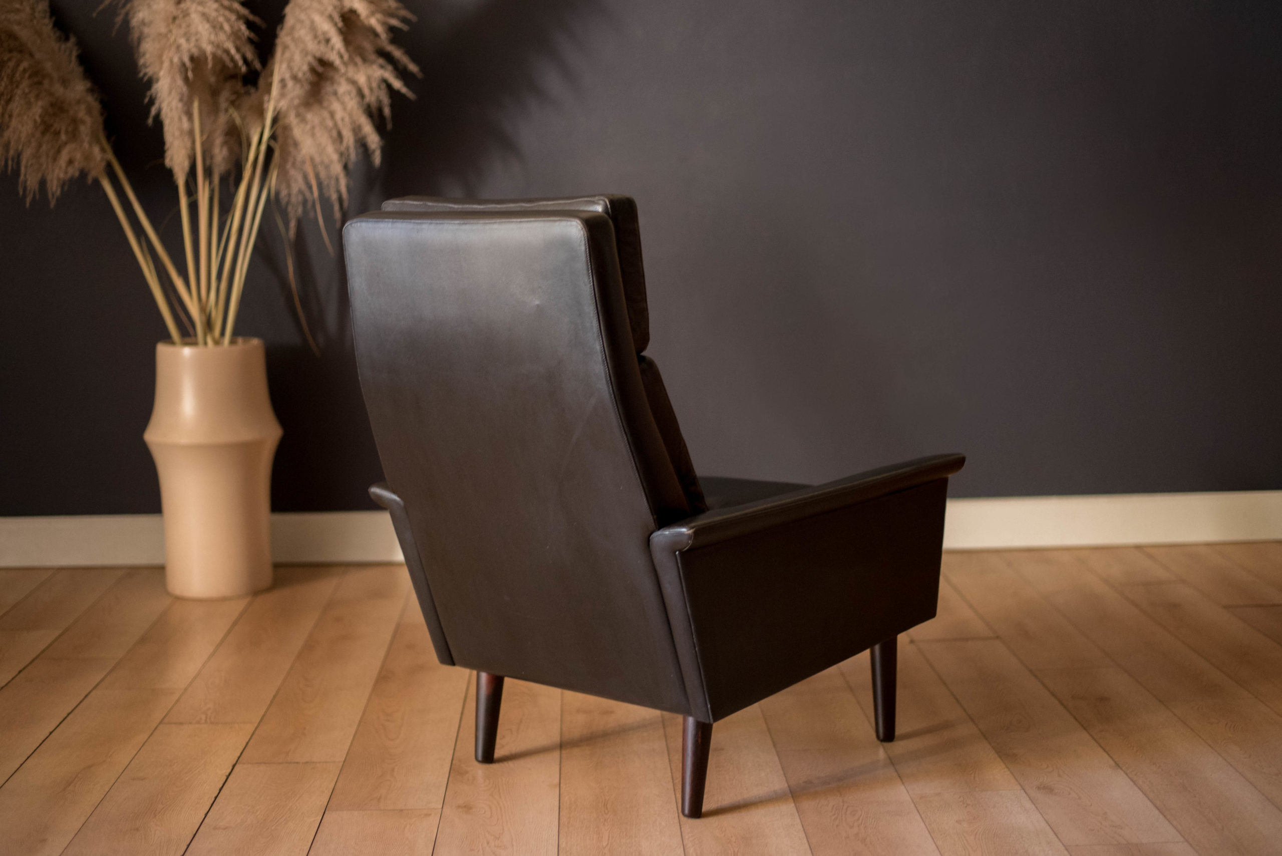 Vintage Scandinavian Rosewood and Black Leather High Back Lounge Chair