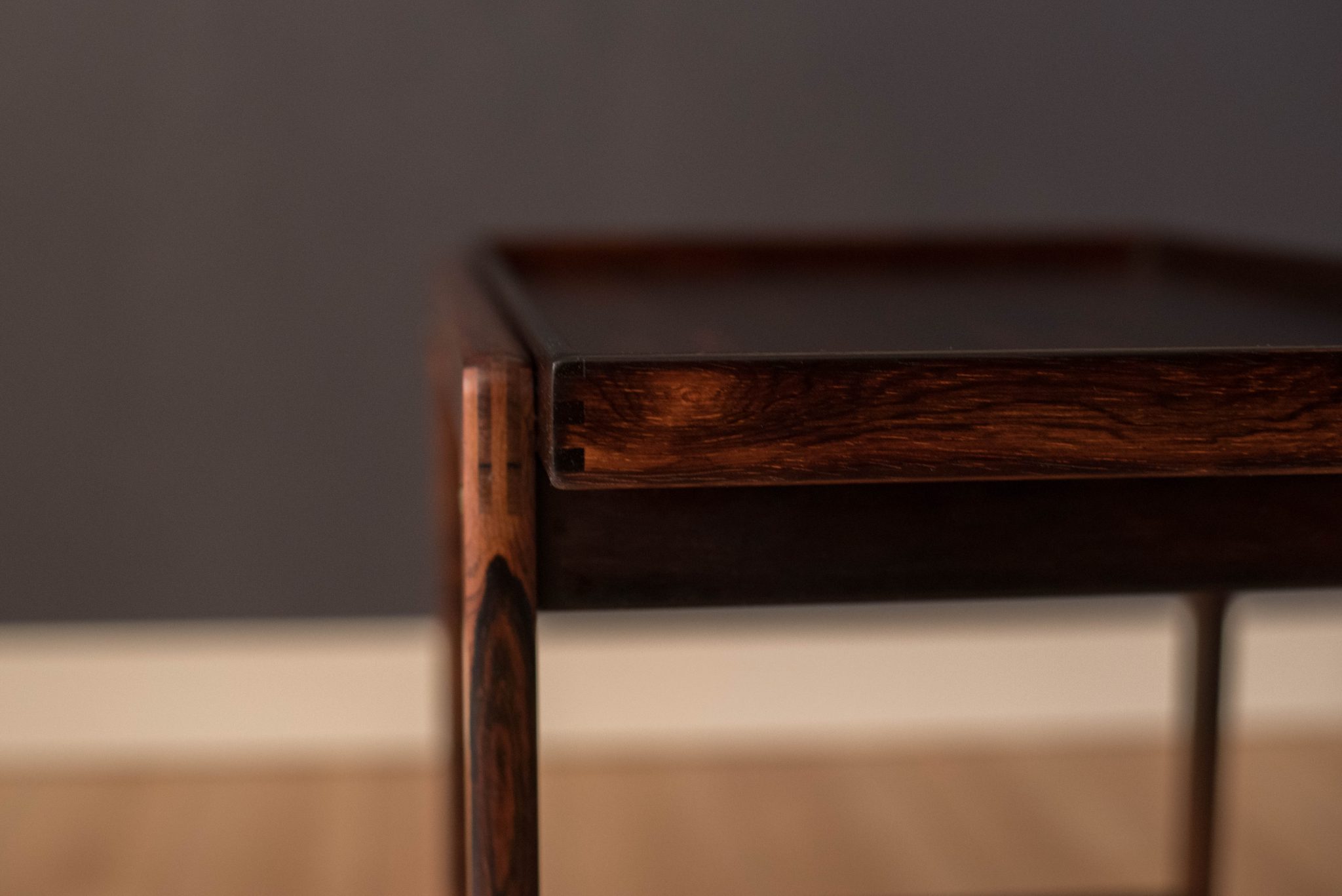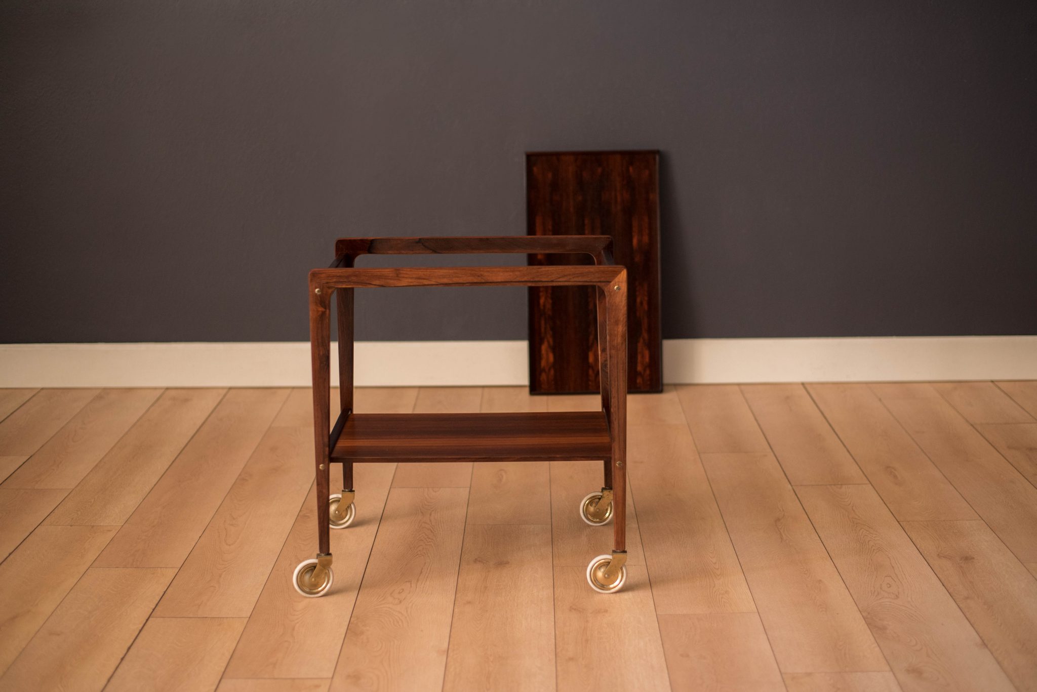 Mid-Century Modern bar cart in rosewood, circa 1960s. Features a removable tray top with dovetail construction supported by a sculptural frame with exposed bridal joints. This piece includes two-tier storage and rolls on original casters for easy serving.