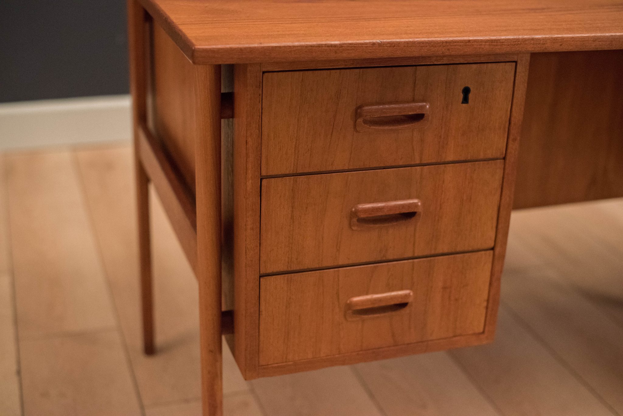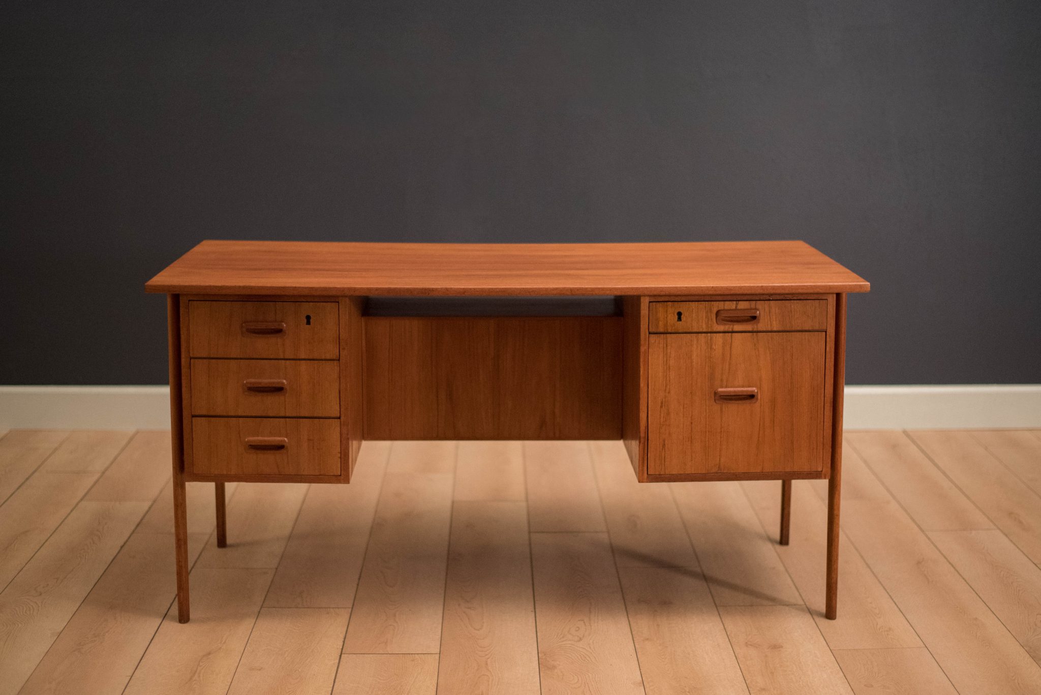 Mid-Century Modern office desk in teak, circa 1960s. This piece features external splayed legs and a floating bookshelf that can be displayed from any angle. Equipped with five dovetailed drawers with sculpted handles, including one file drawer. Skeleton key is also included.