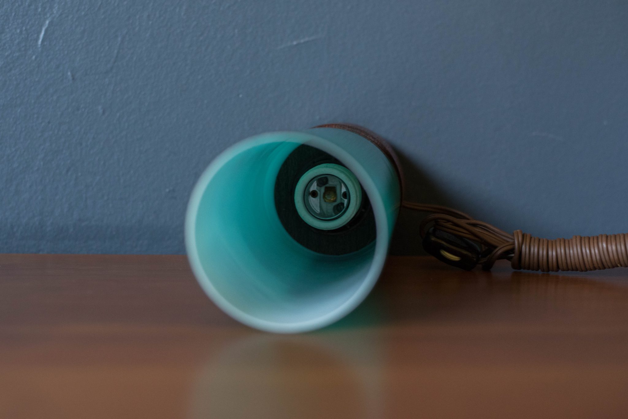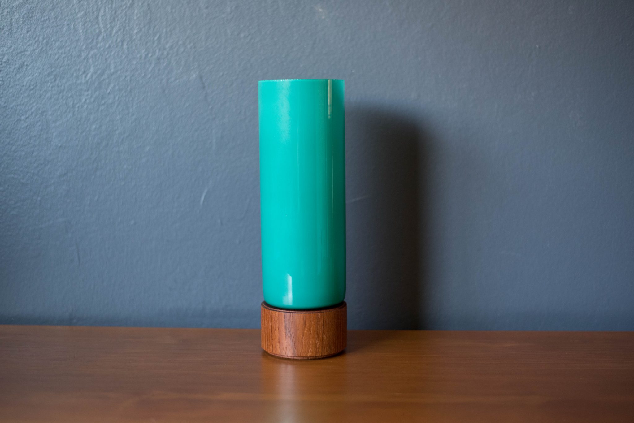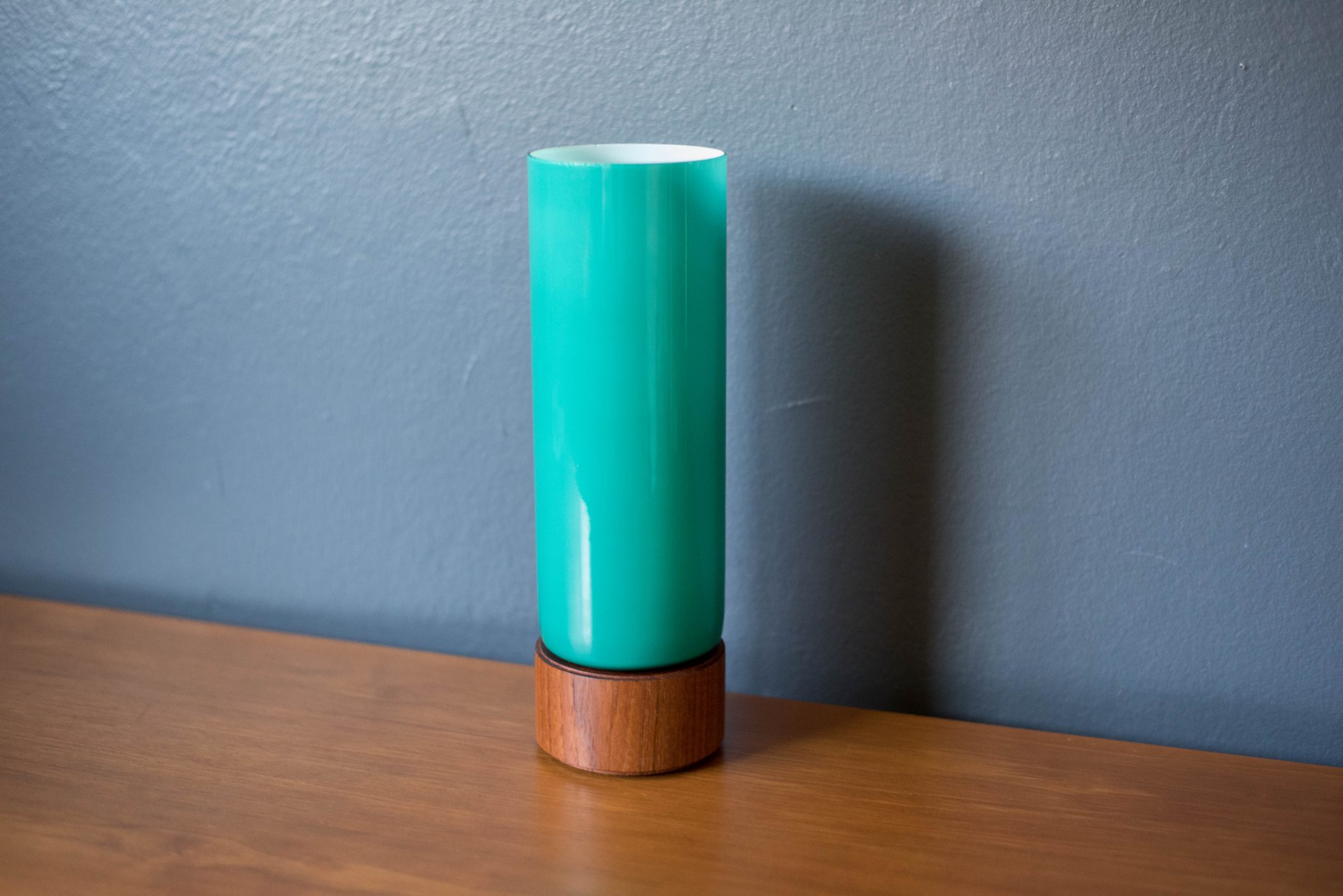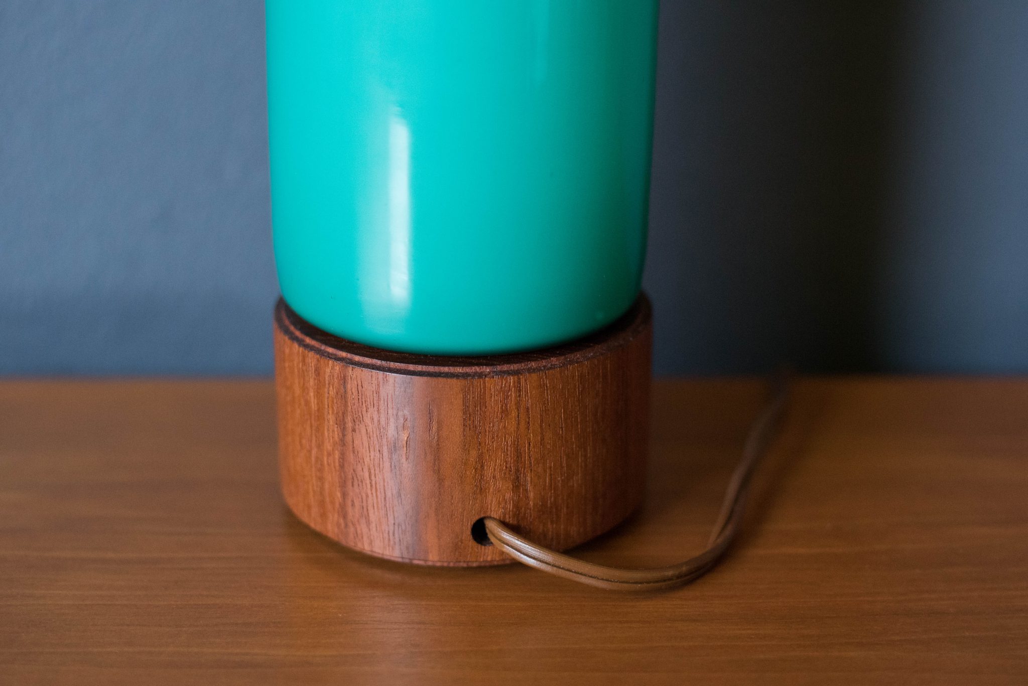 Mid-century Scandinavian hand blown glass lamp, circa 1960s. This piece displays a vibrant blue green teal shade accented with a frosted white interior and supporting teak cylinder base.
