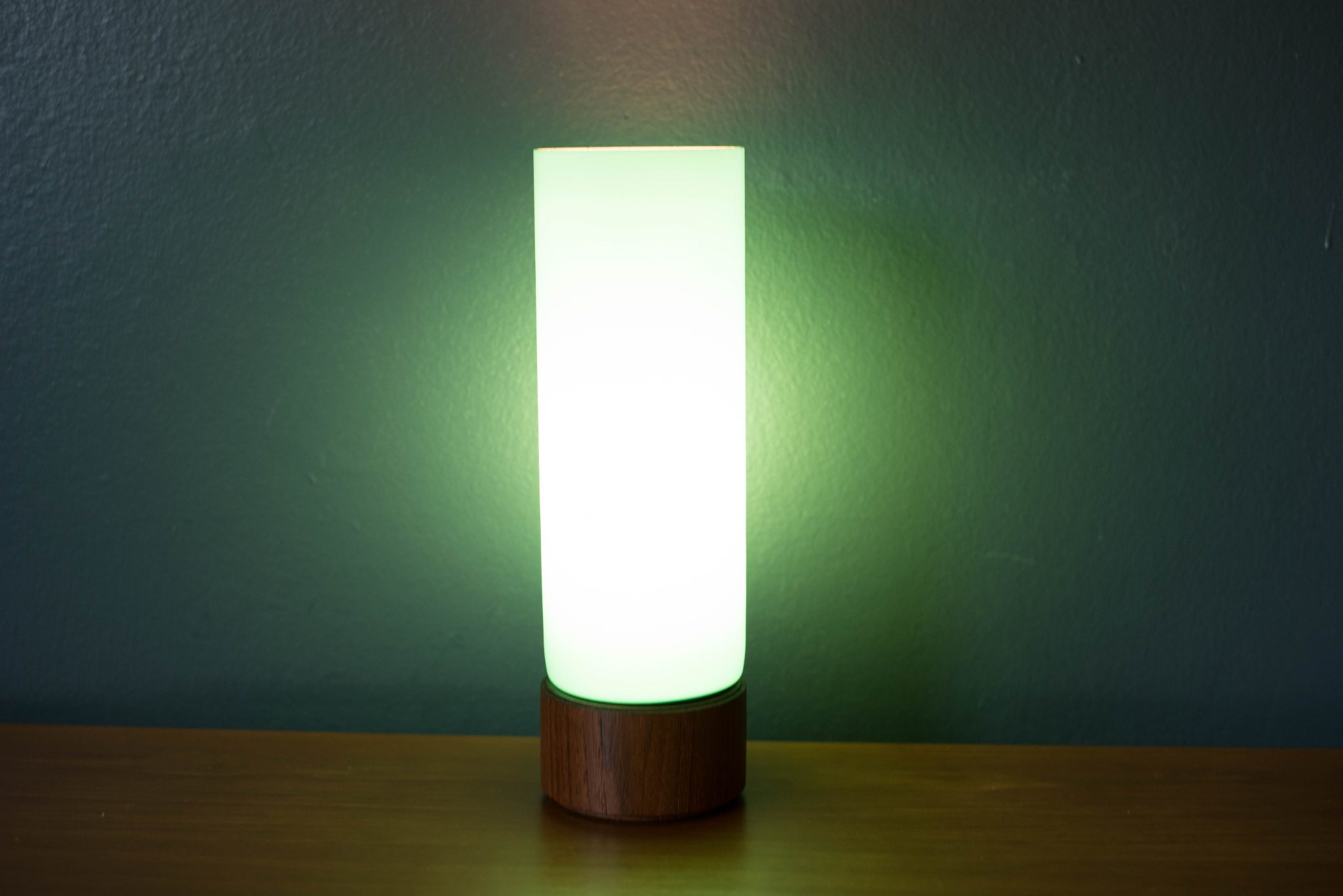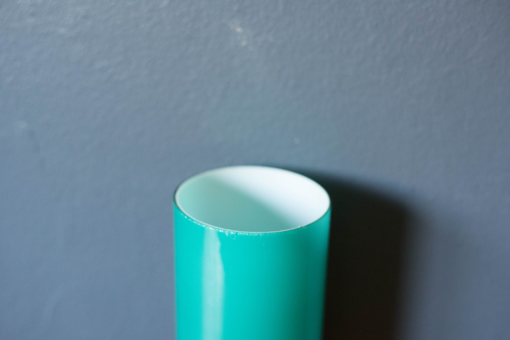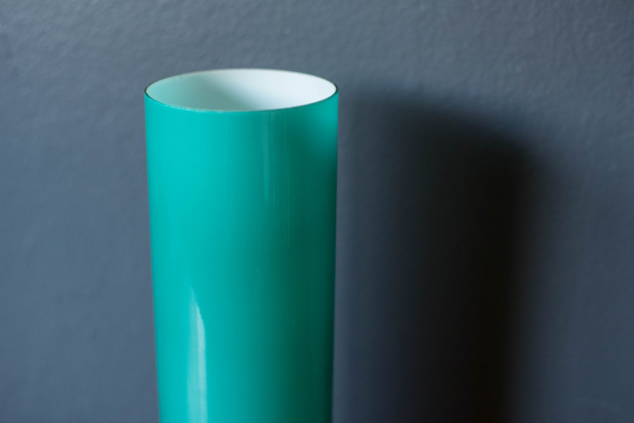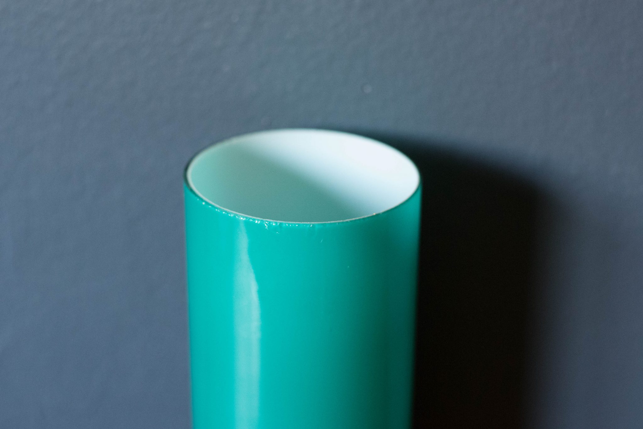 Mid-century Scandinavian hand blown glass lamp, circa 1960s. This piece displays a vibrant blue green teal shade accented with a frosted white interior and supporting teak cylinder base.