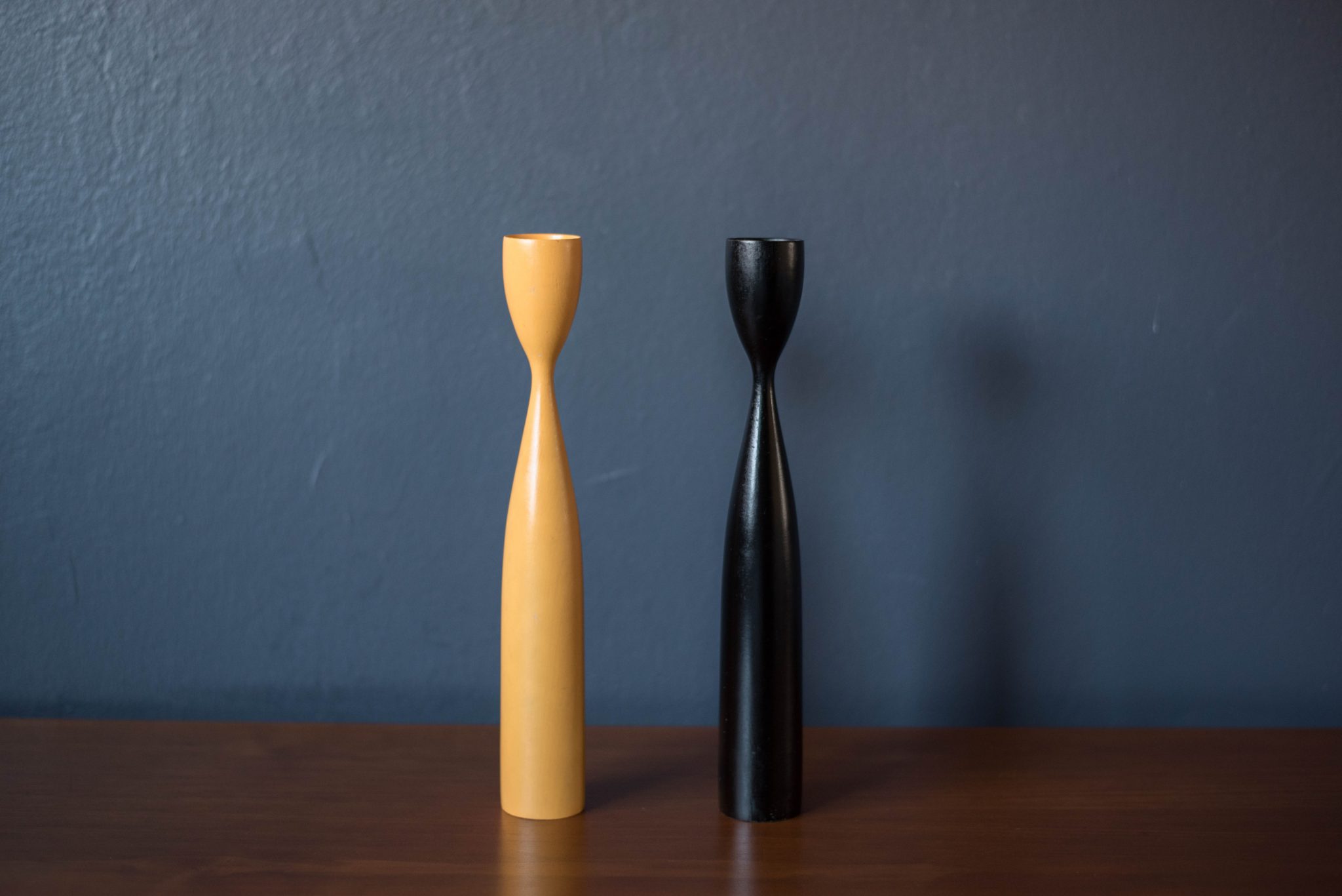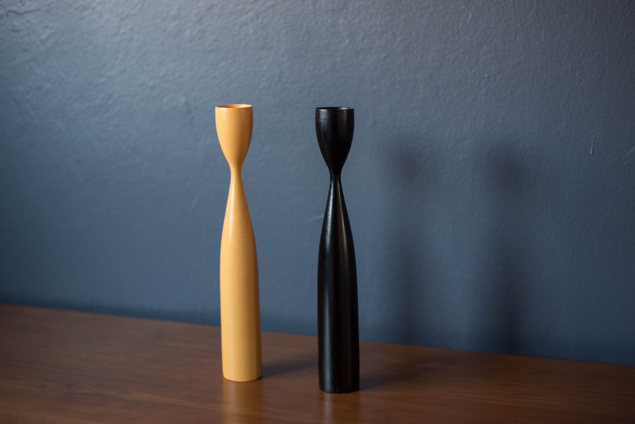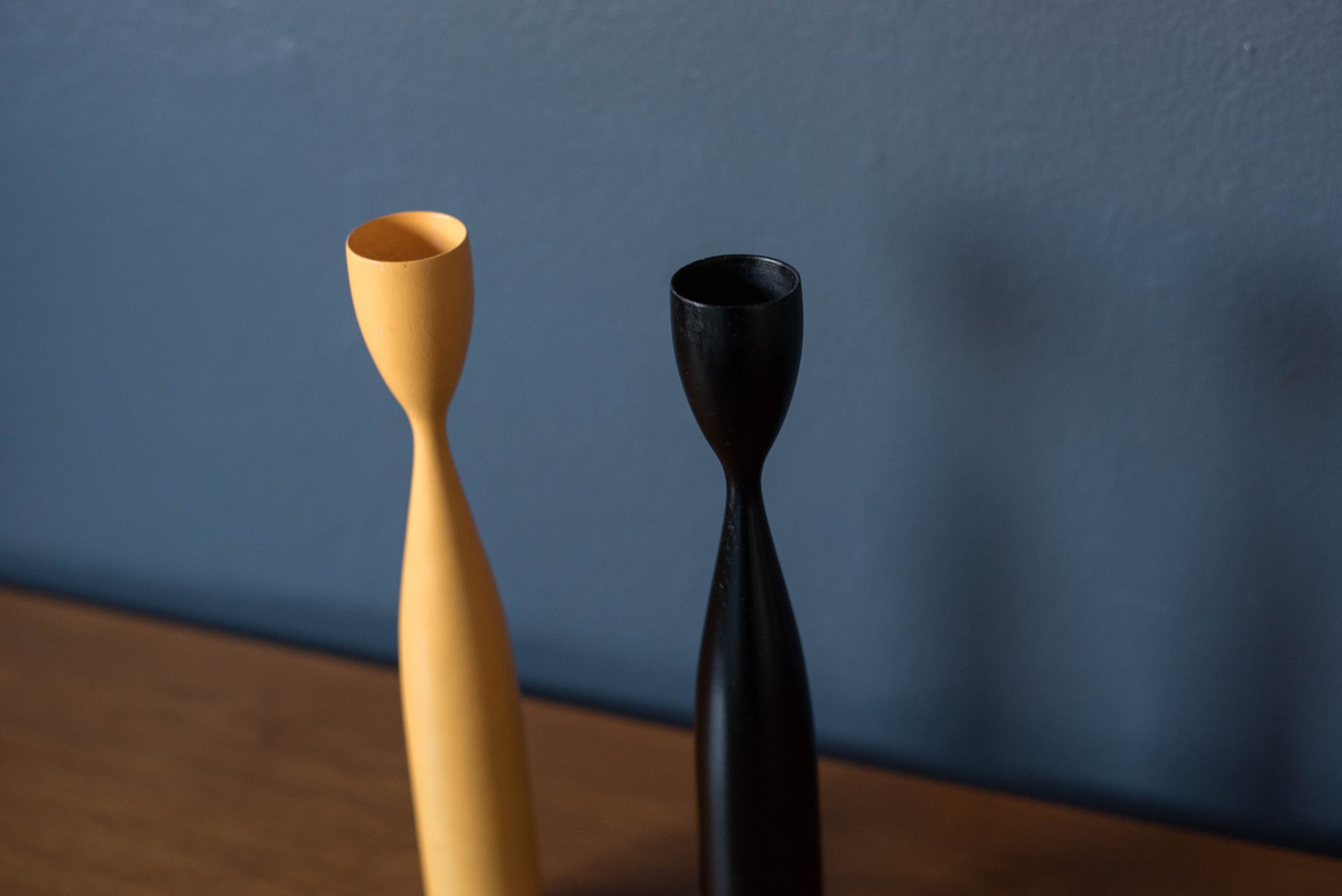 Mid-Century Modern pair of tall sculptural wood candleholders made in Denmark. This set displays well with any modern decor and fits 3/4″ candles. Price is for the pair.